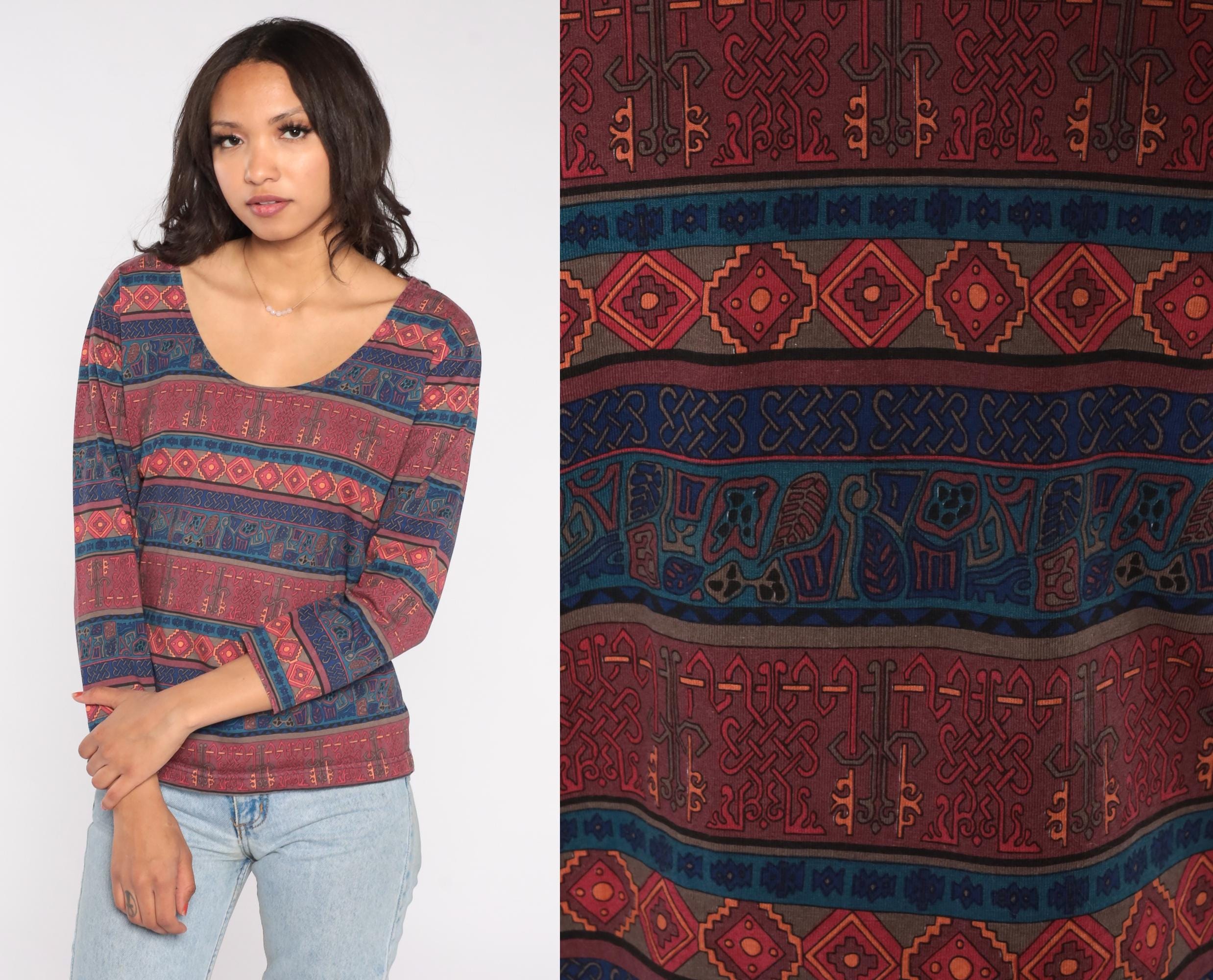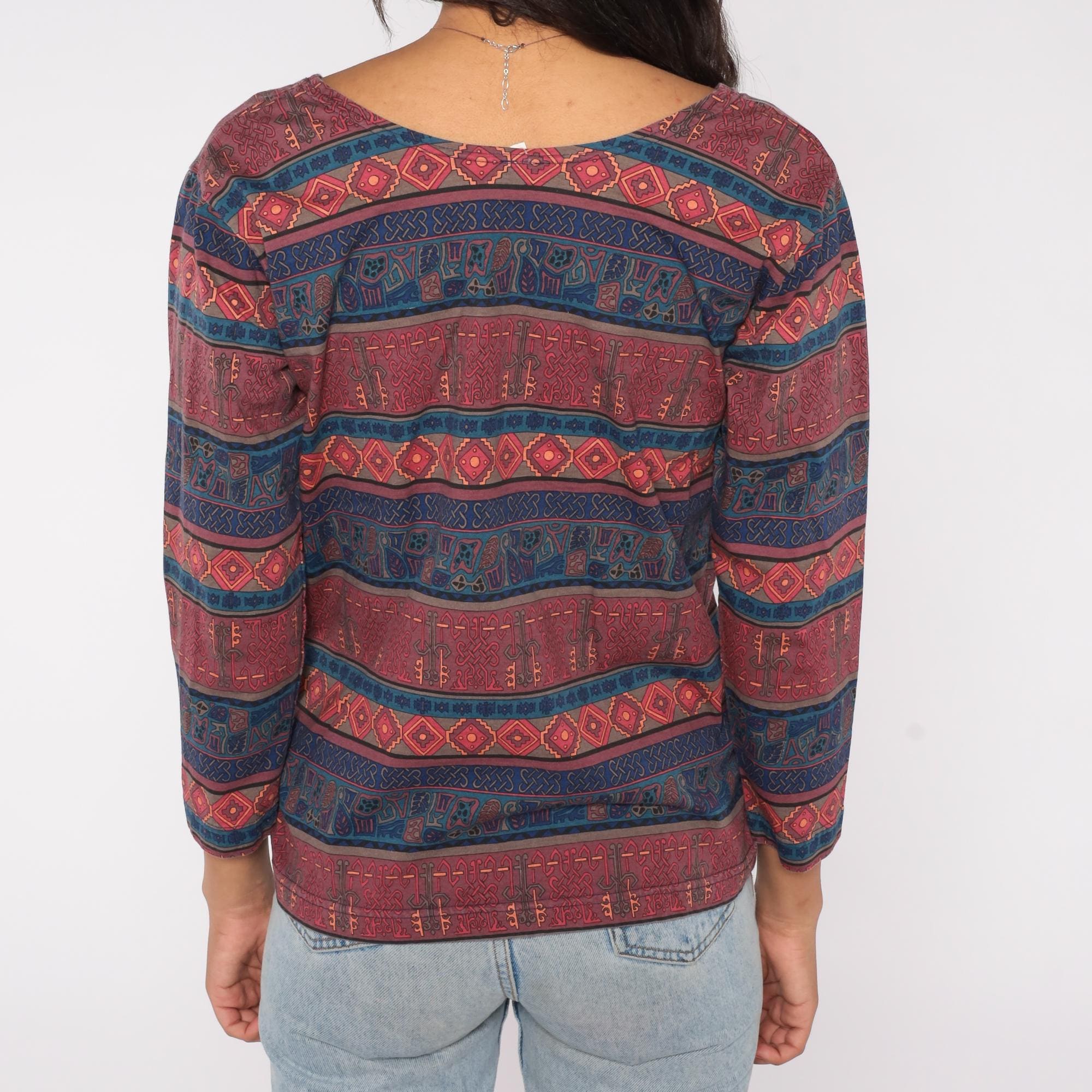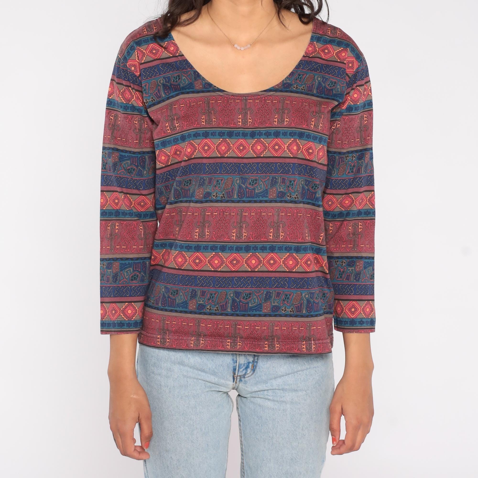 90s Southwestern print top by Chicos Design. Features a vibrant tribal pattern in burgundy, navy blue, and terracotta. Comfortable scoop neck design with 3/4 length sleeves.