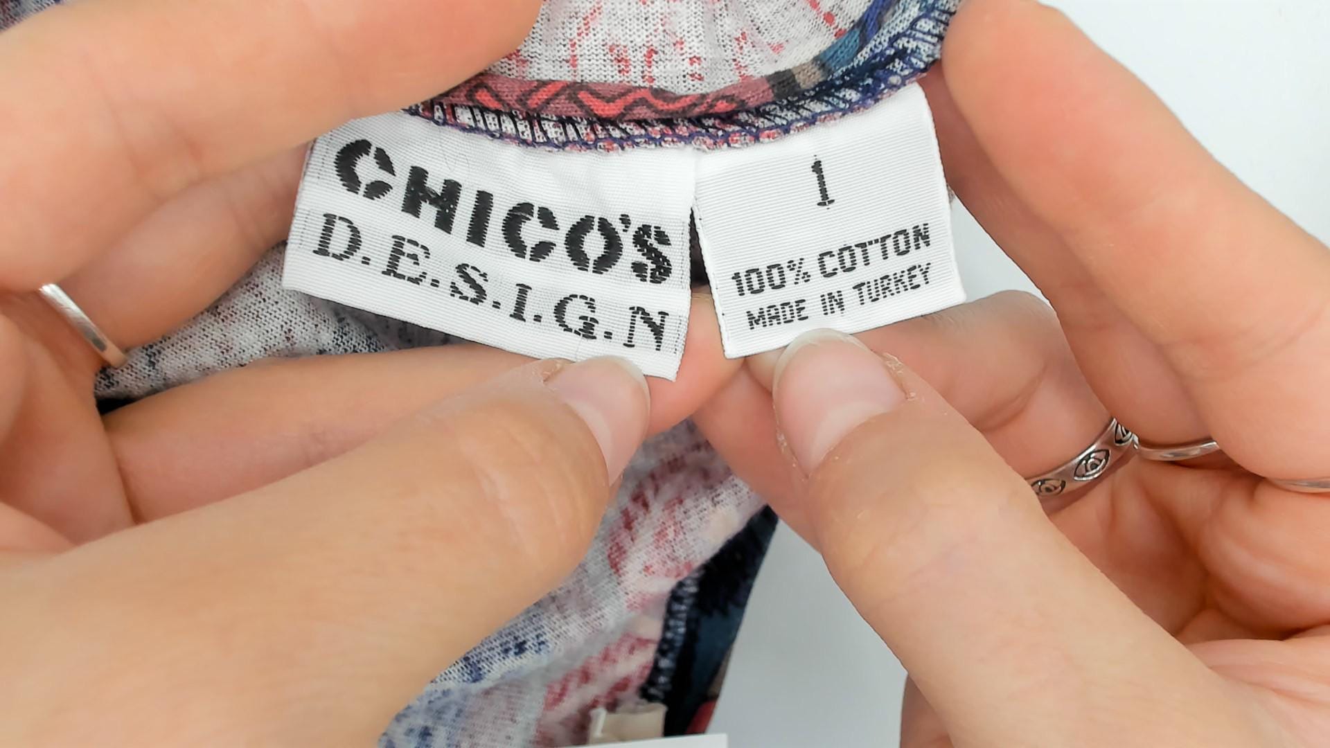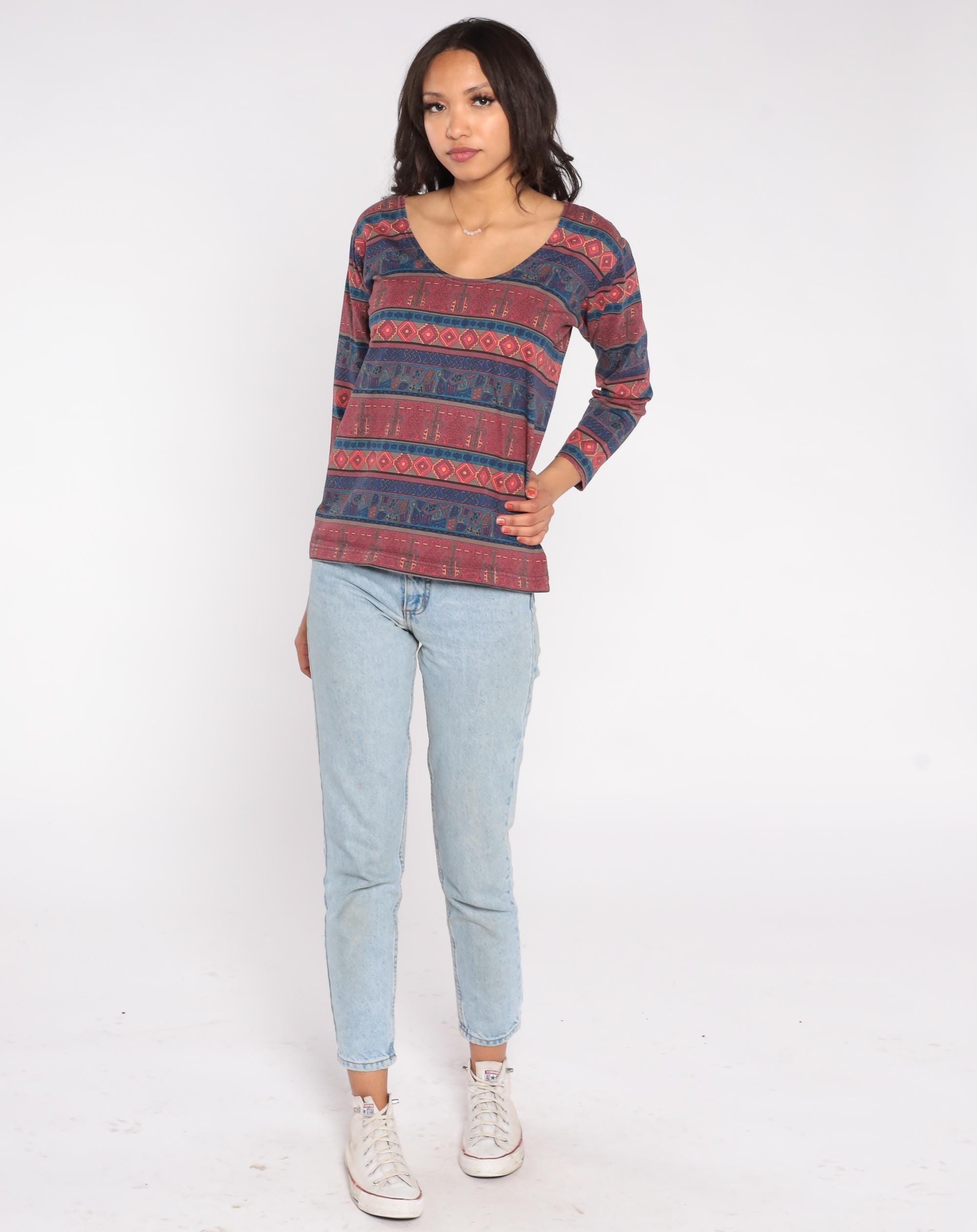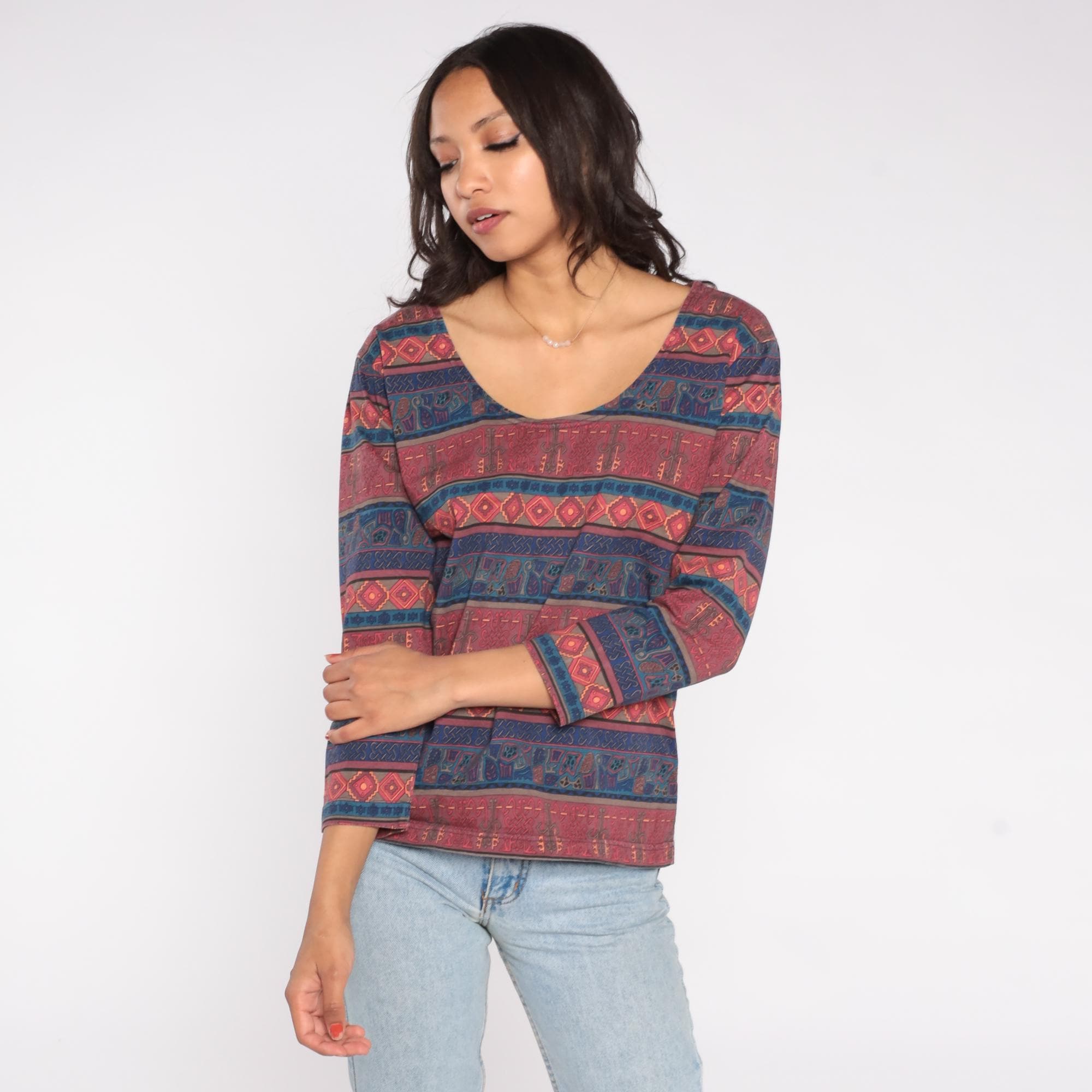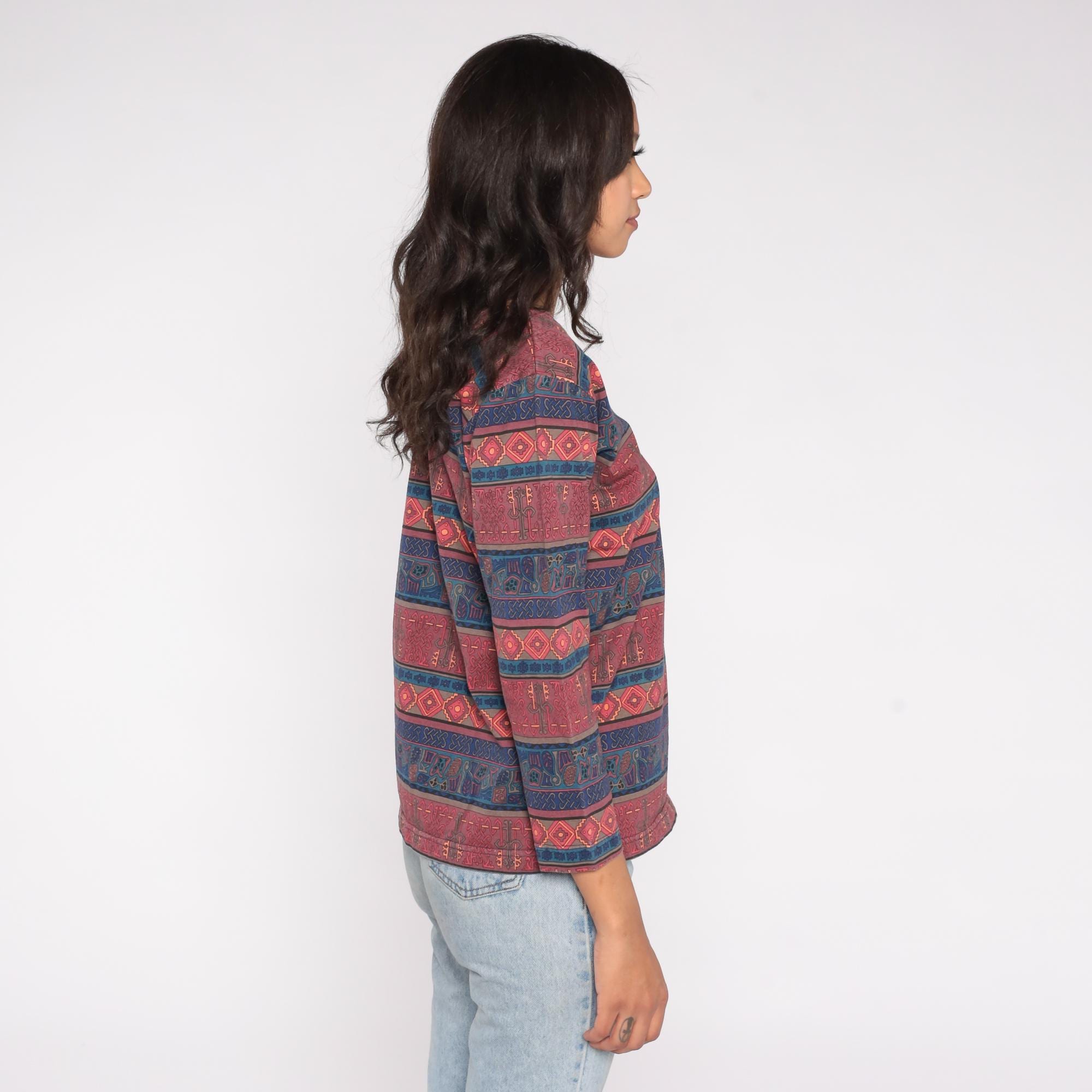 90s Southwestern print top by Chicos Design. Features a vibrant tribal pattern in burgundy, navy blue, and terracotta. Comfortable scoop neck design with 3/4 length sleeves.