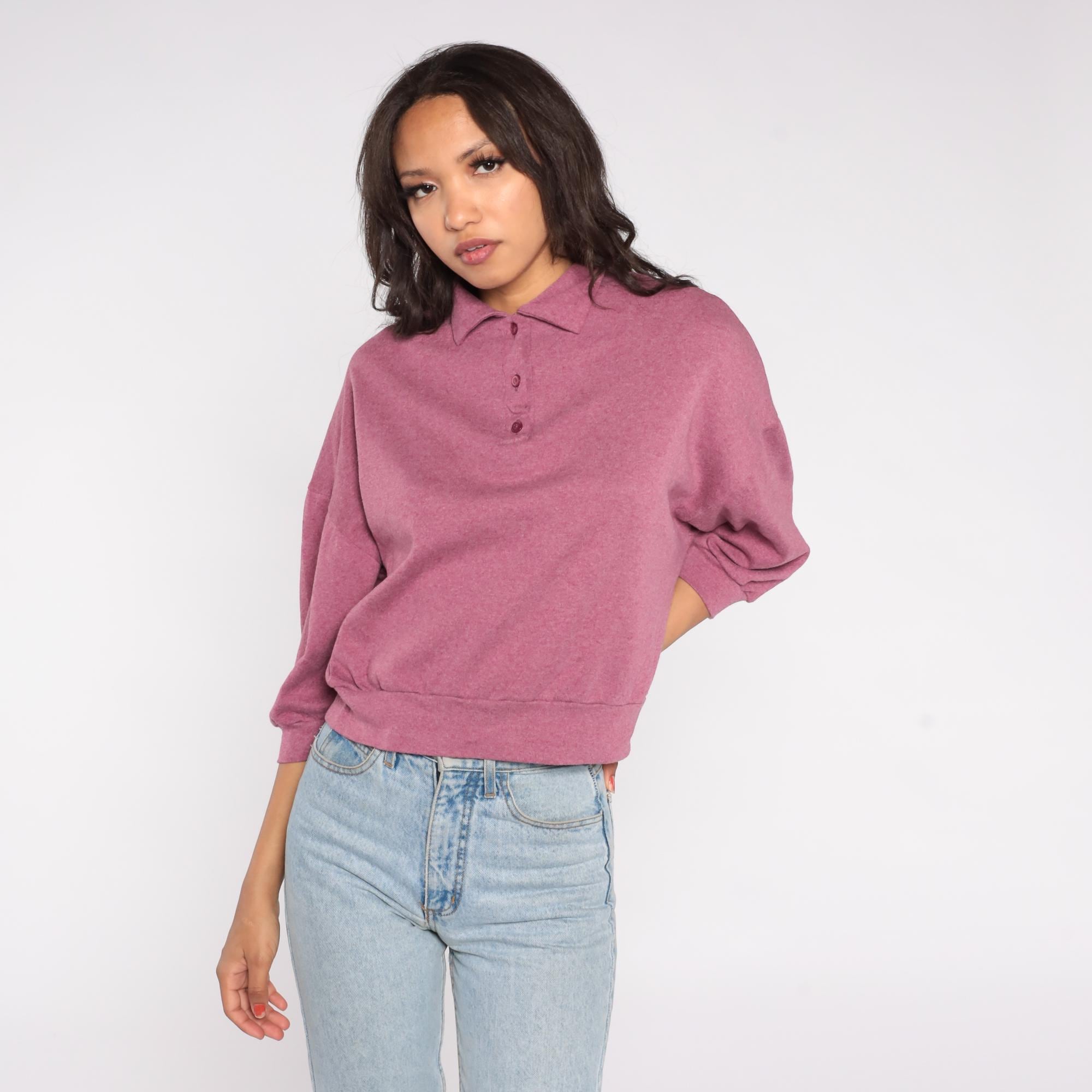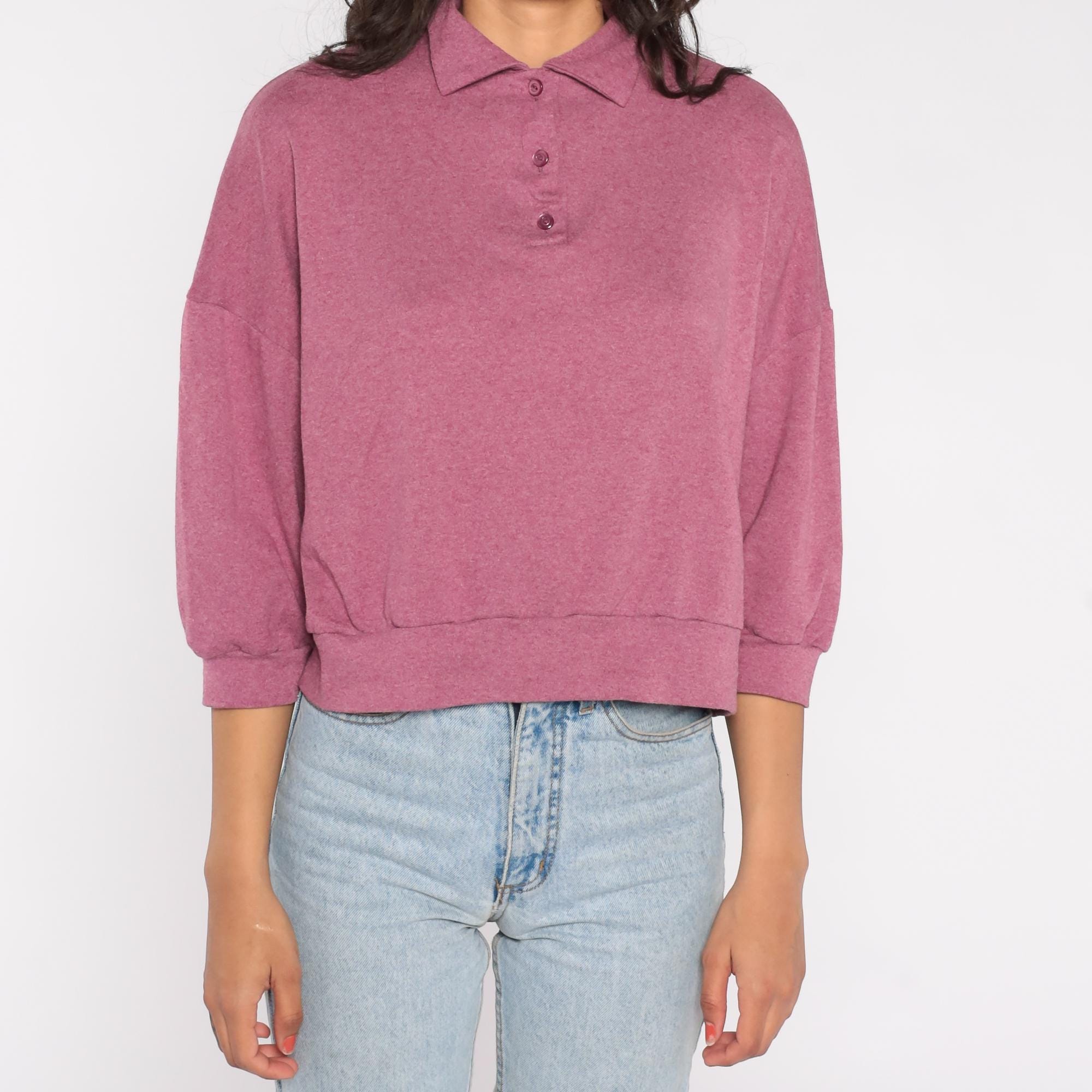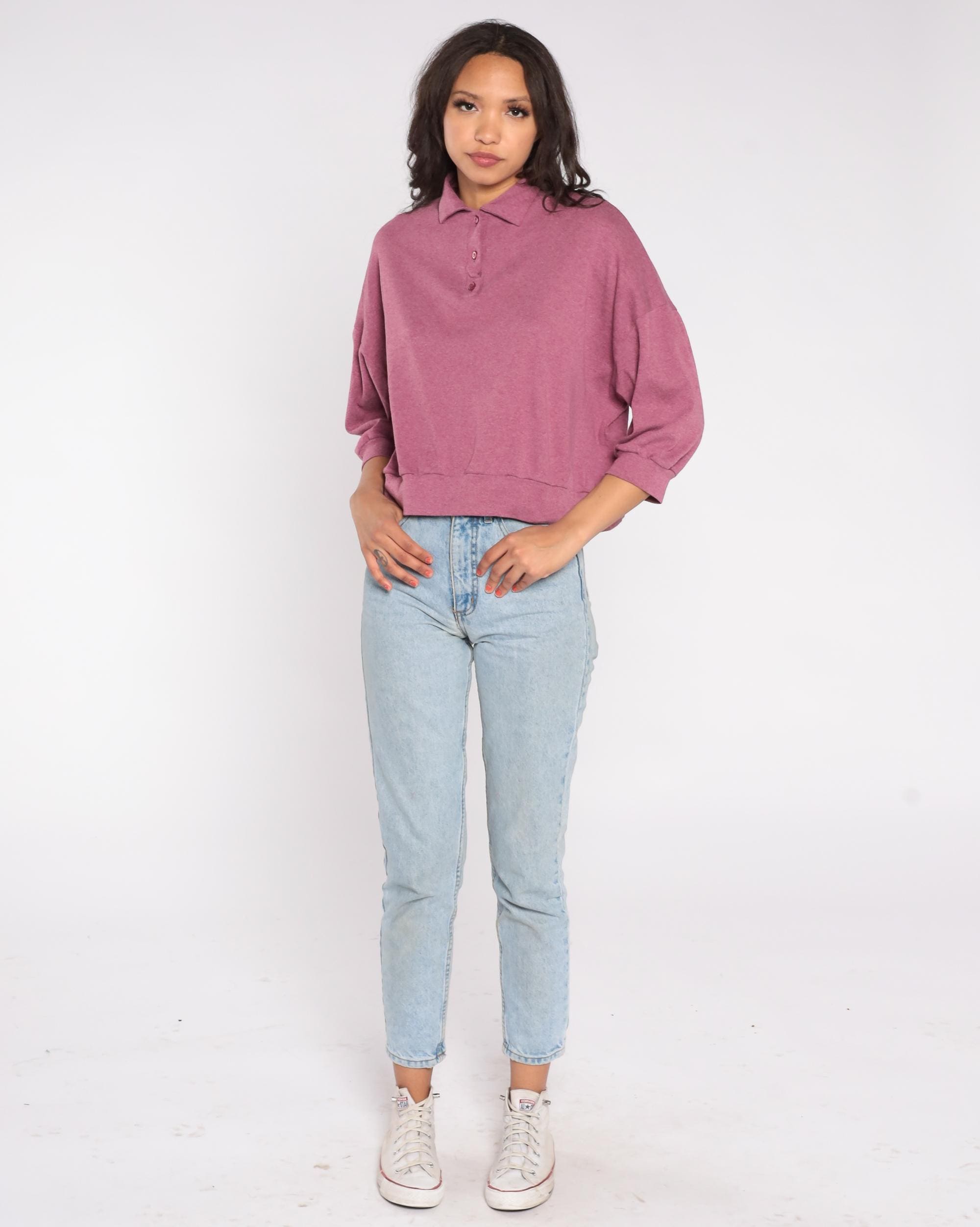 90s mauve polo sweater by Tumbleweeds. Features a beautiful dusty rose cotton-polyester blend fabric with classic polo collar and 3-button placket. Cropped, boxy fit with 3/4 length sleeves and ribbed cuffs and hem.