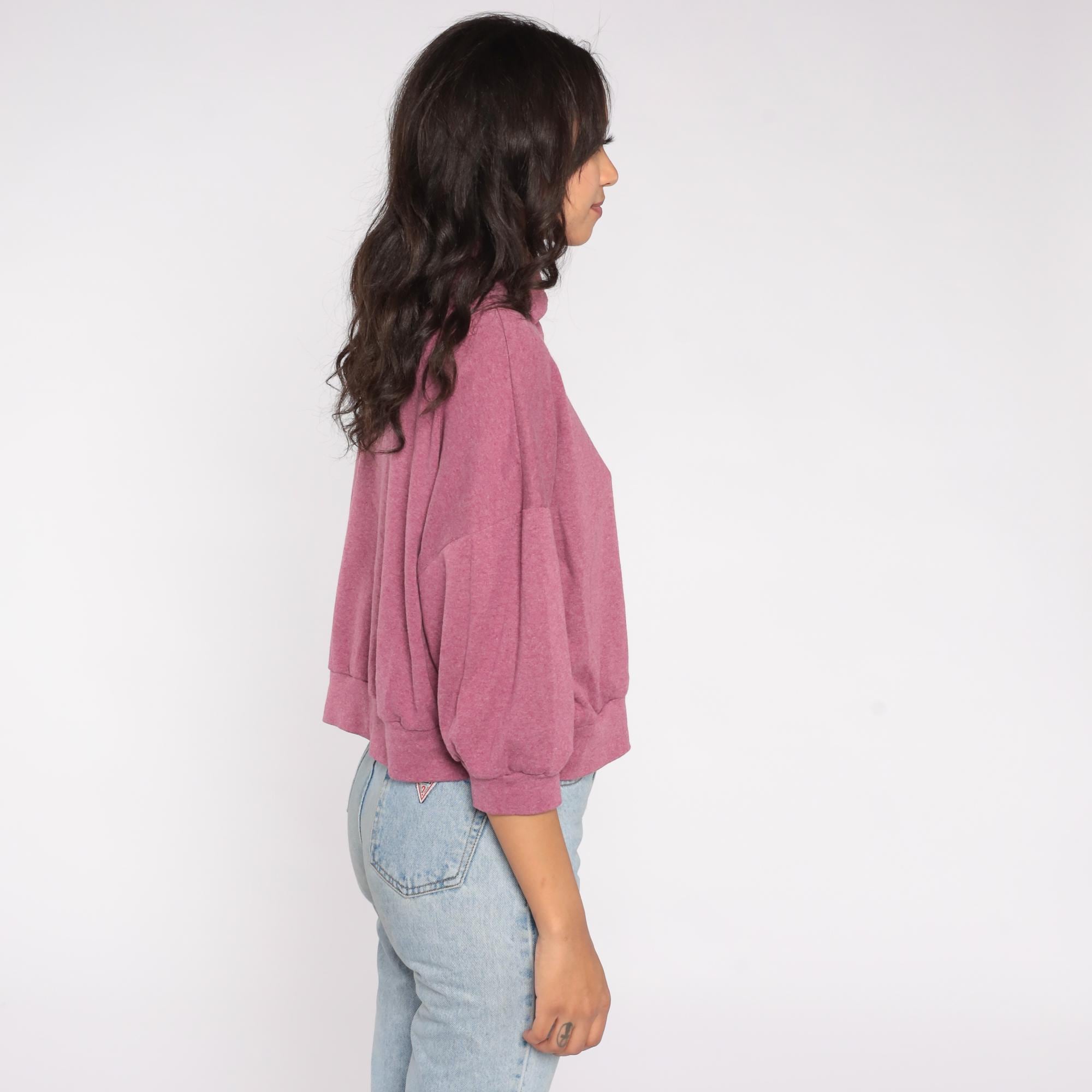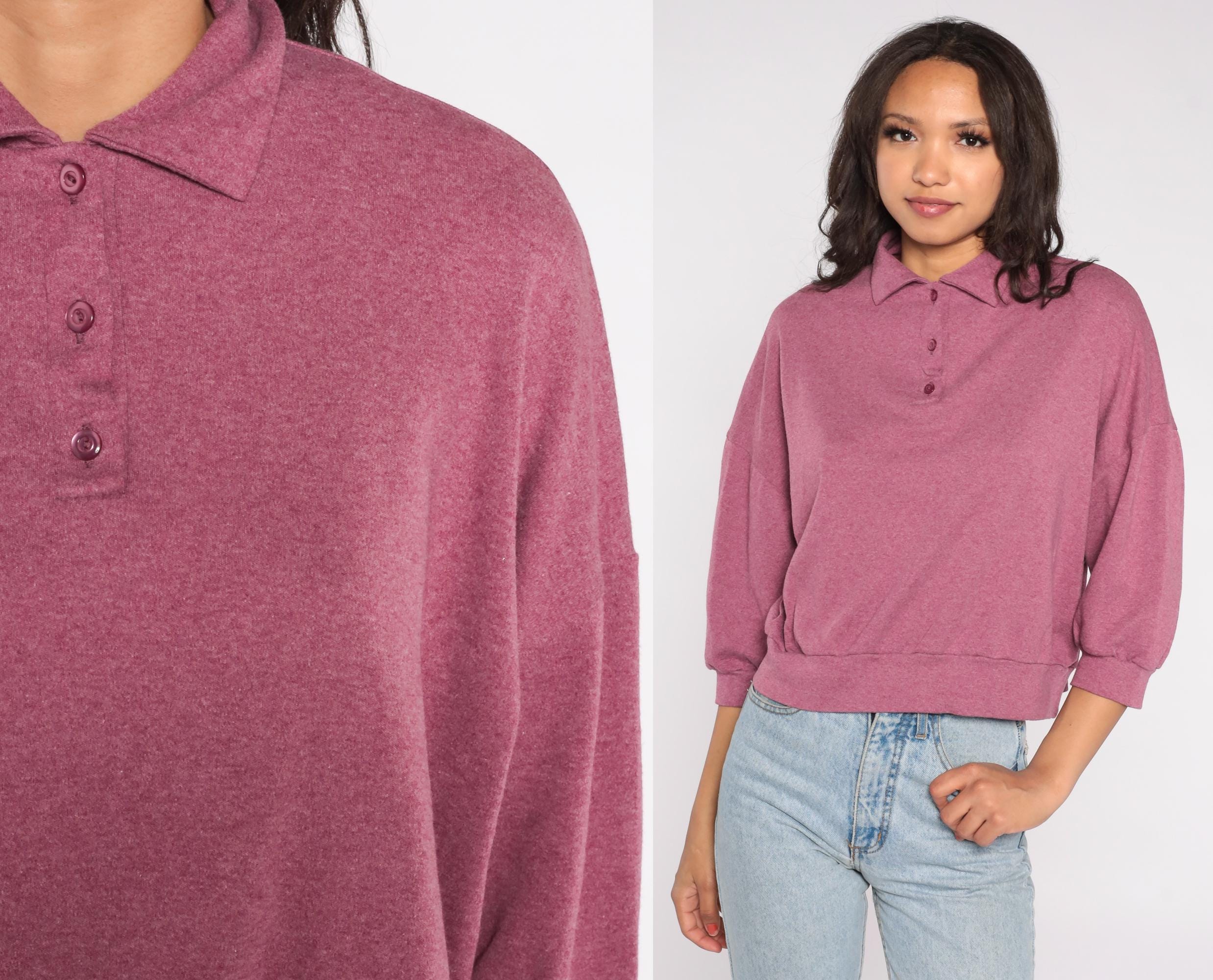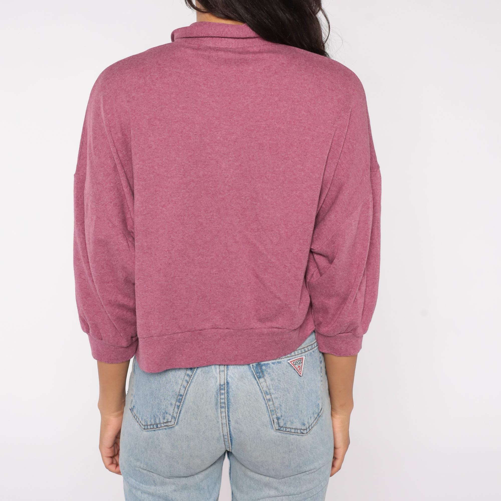 90s mauve polo sweater by Tumbleweeds. Features a beautiful dusty rose cotton-polyester blend fabric with classic polo collar and 3-button placket. Cropped, boxy fit with 3/4 length sleeves and ribbed cuffs and hem.