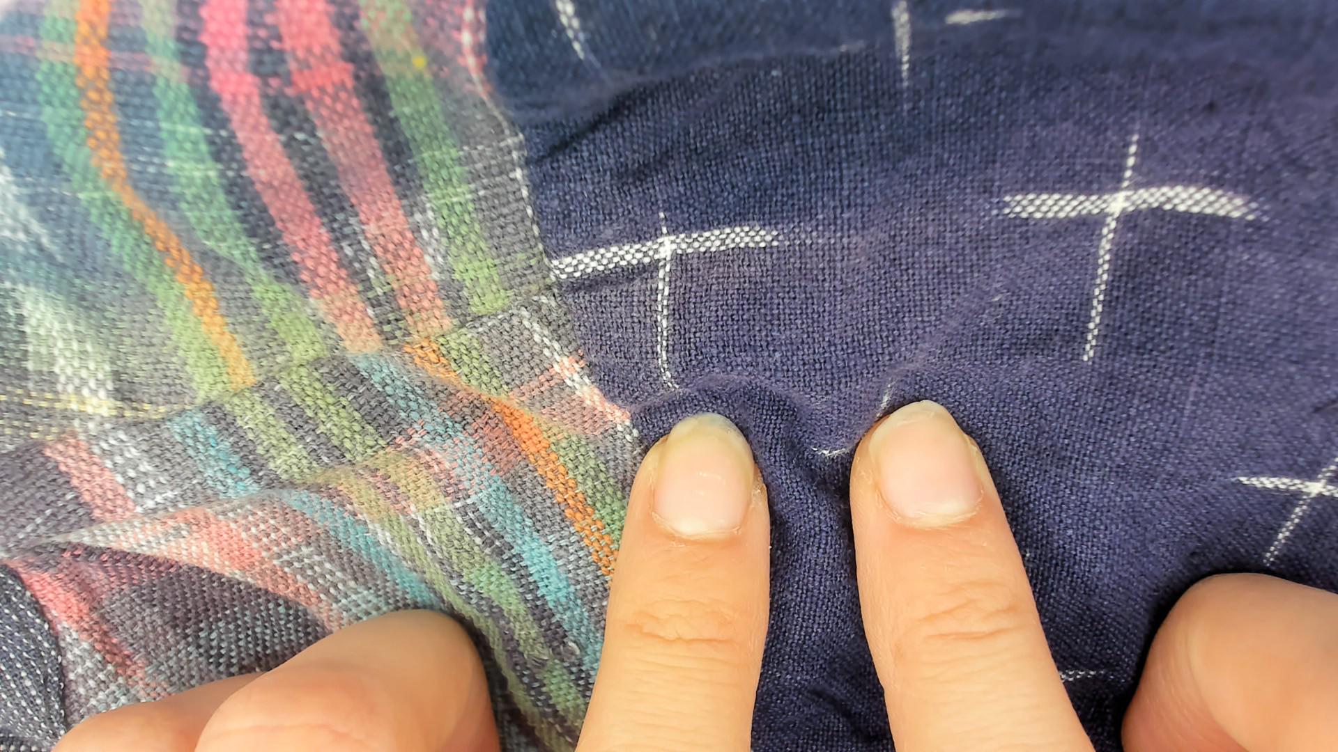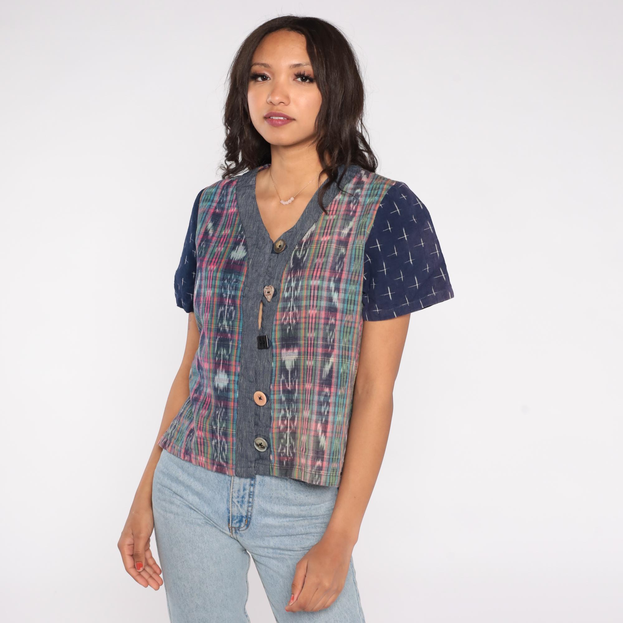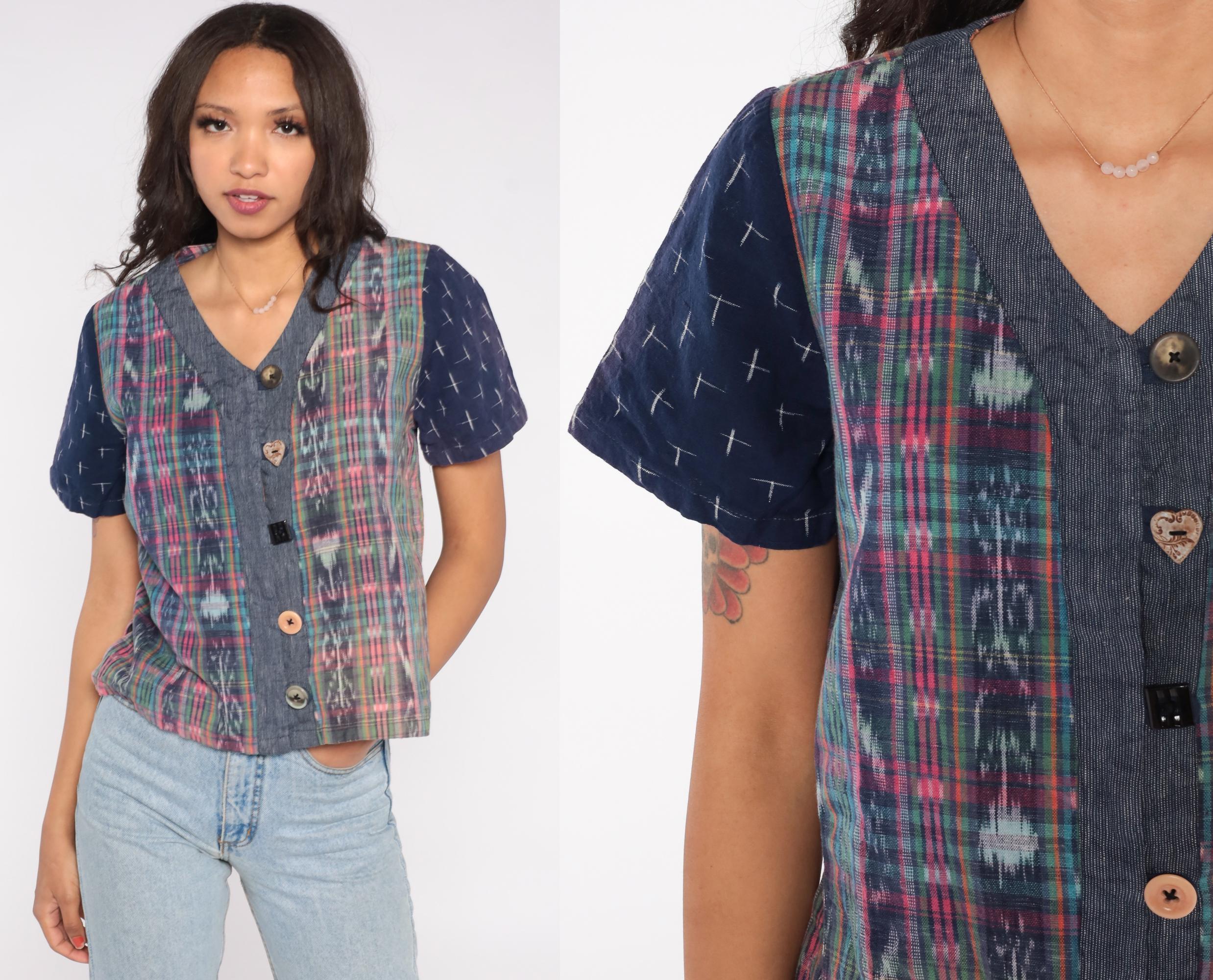 90s patchwork button up top featuring a beautiful blend of ikat prints, plaid, and navy cross-stitch patterns. Center panel in chambray denim with unique mismatched button closure. Relaxed V-neck design with short sleeves.