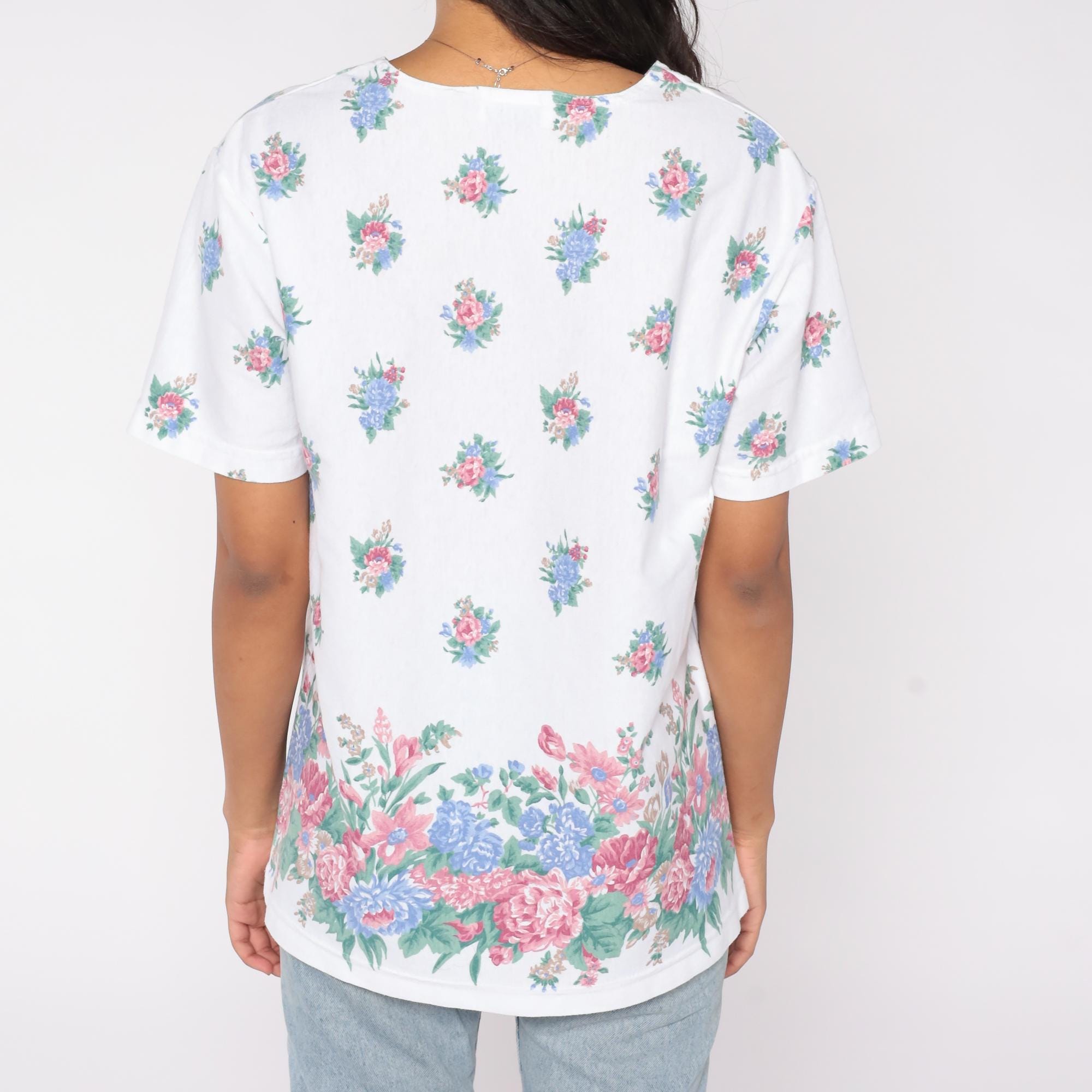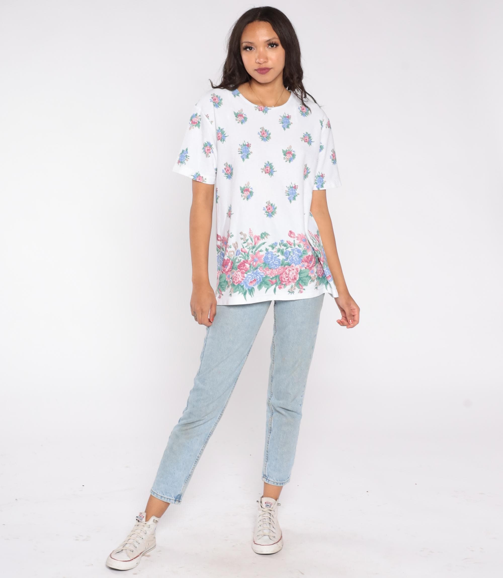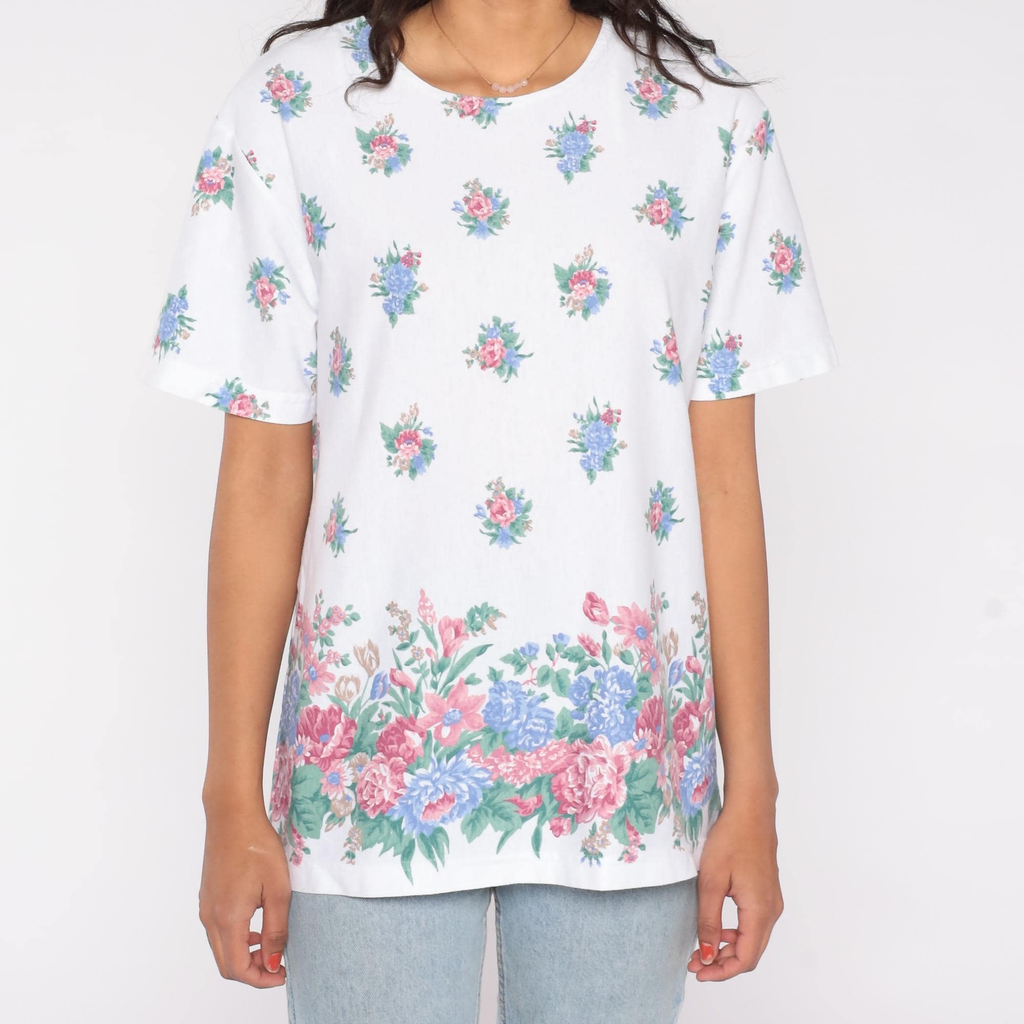 90s floral t-shirt by Katelyn Rose. Features a beautiful cottage garden print with pink roses and blue flowers scattered throughout the white fabric. Stunning border print along the bottom with a lush garden scene of pink and blue blooms with green foliage. Classic crew neck design with short sleeves.