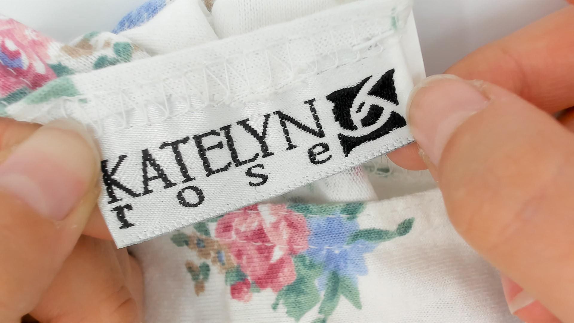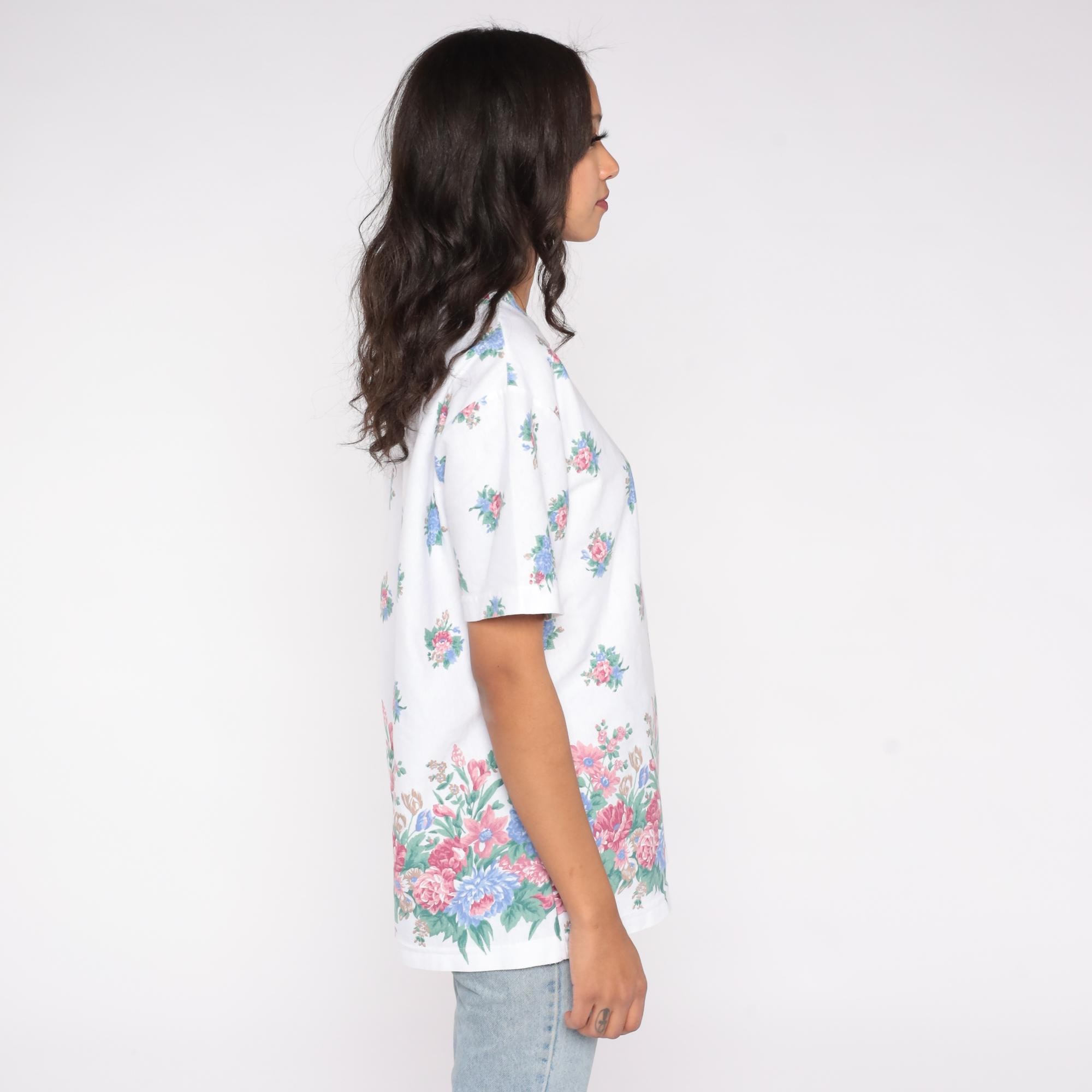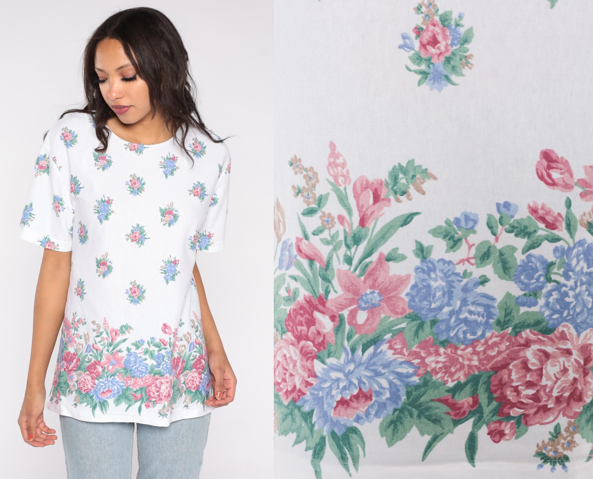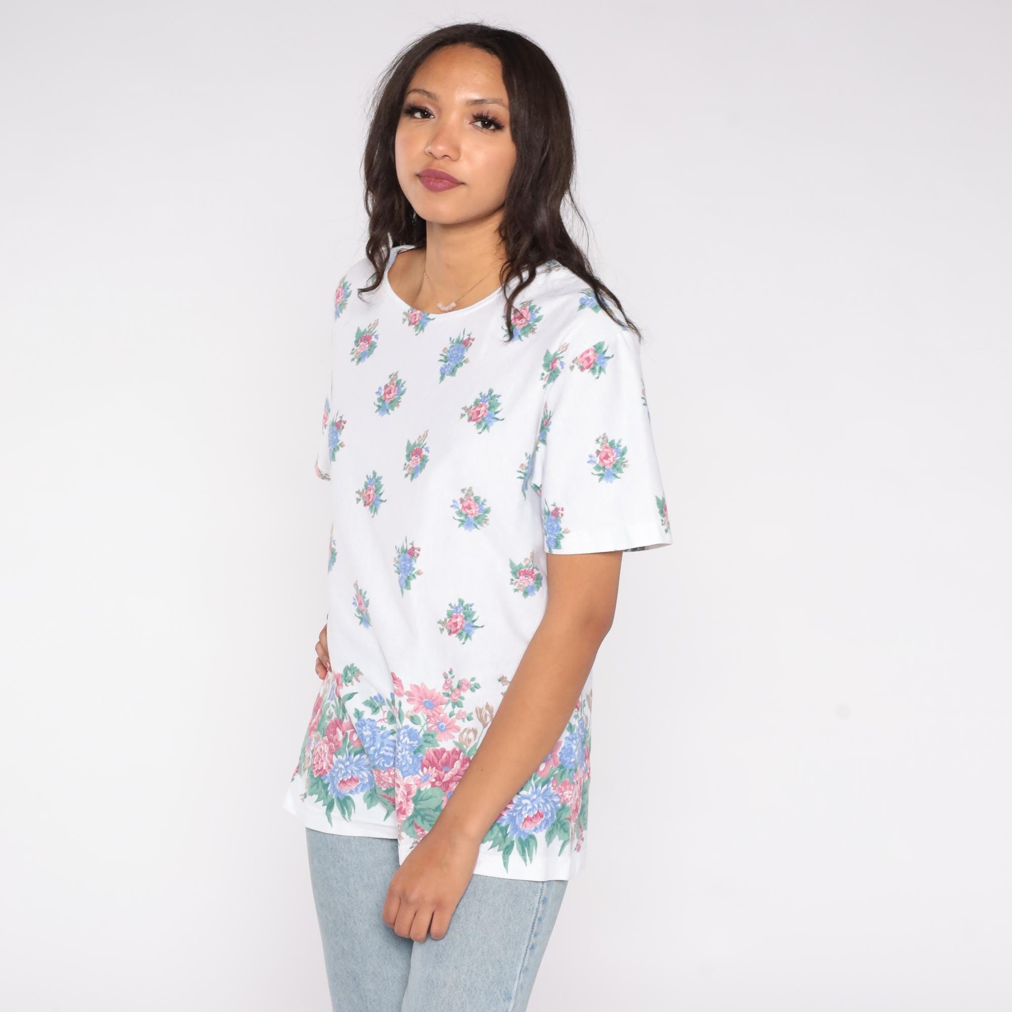 90s floral t-shirt by Katelyn Rose. Features a beautiful cottage garden print with pink roses and blue flowers scattered throughout the white fabric. Stunning border print along the bottom with a lush garden scene of pink and blue blooms with green foliage. Classic crew neck design with short sleeves.