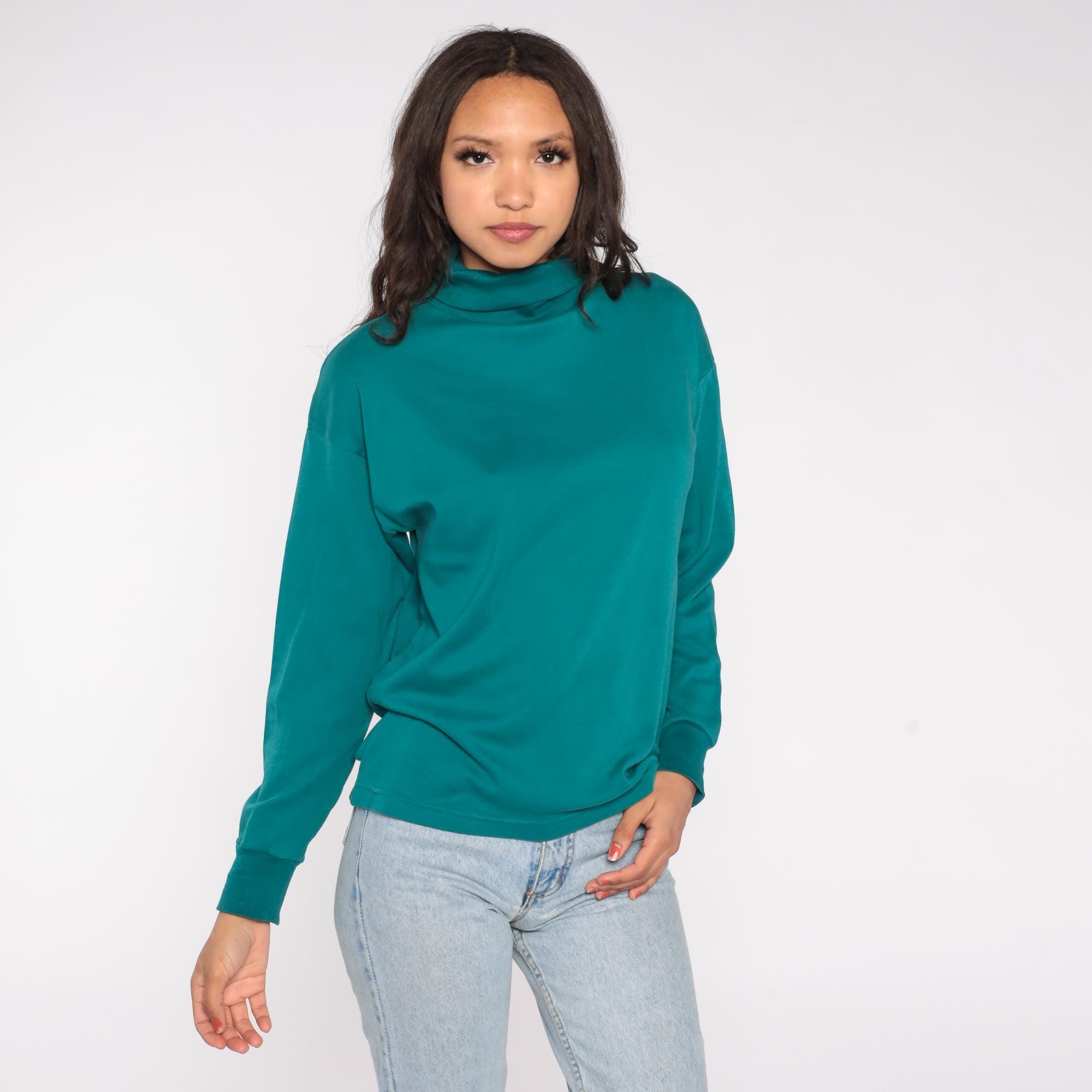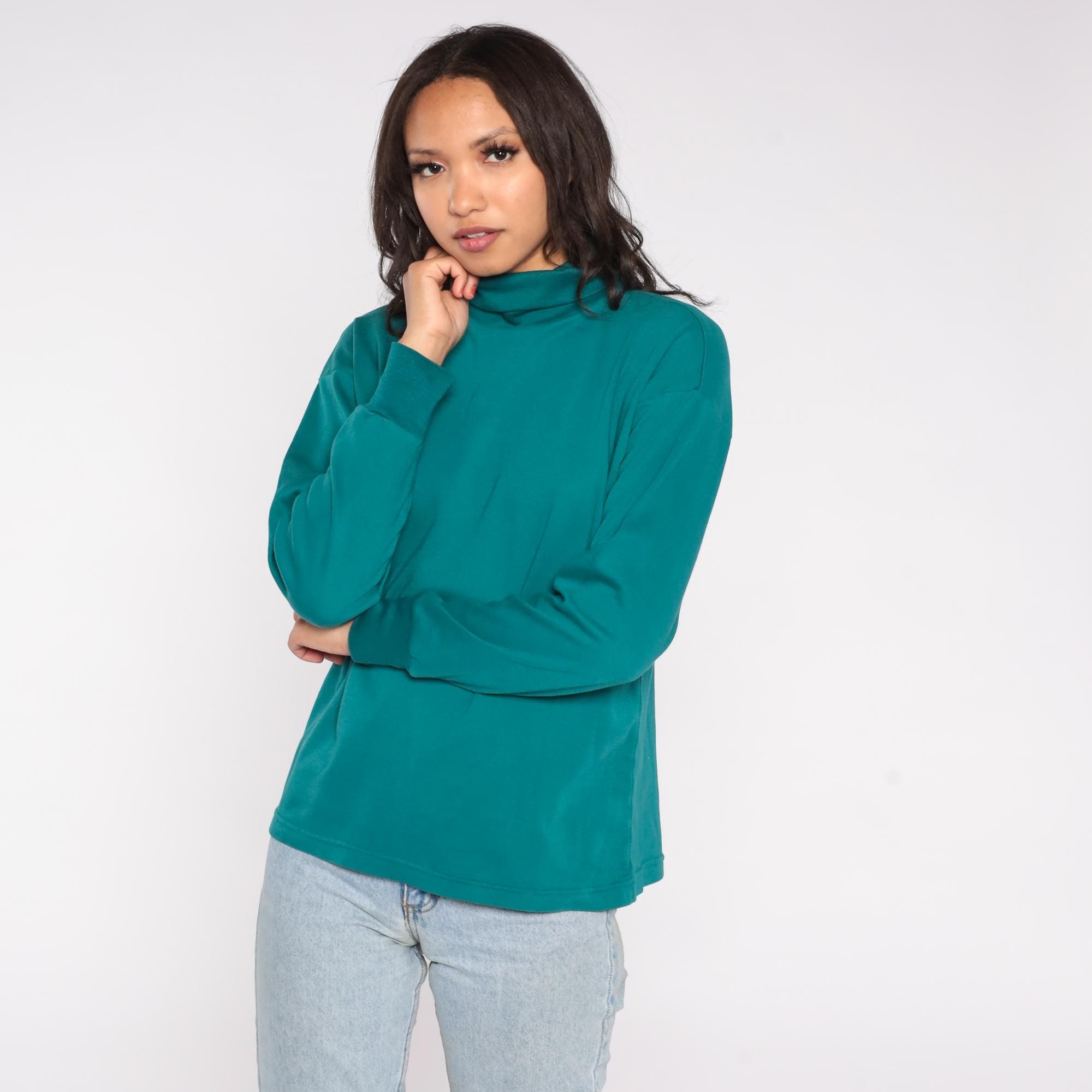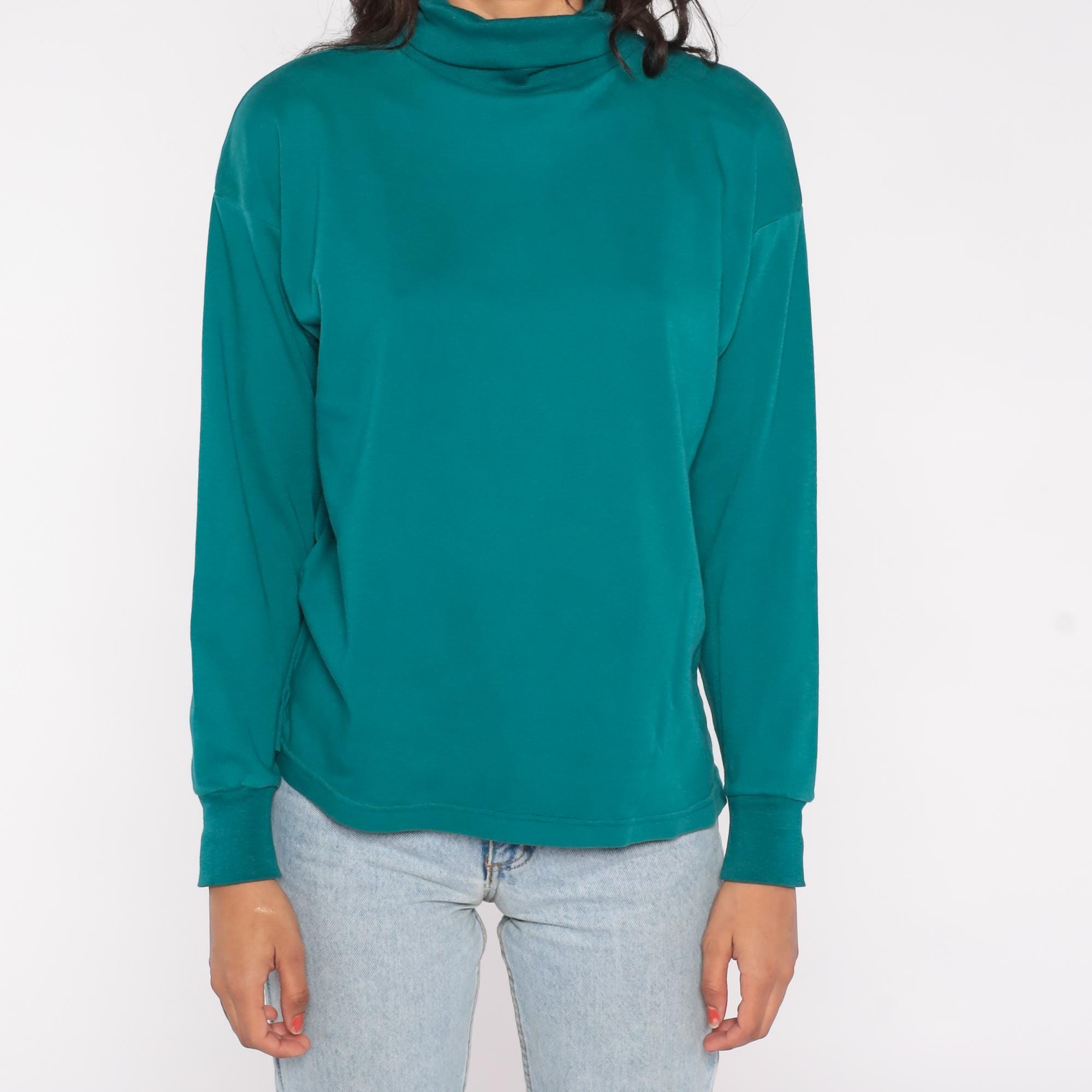 90s teal turtleneck in a rich jewel tone. Features soft cotton-polyester blend fabric with classic mock neck design. Simple, minimalist styling with clean lines and slightly relaxed fit.