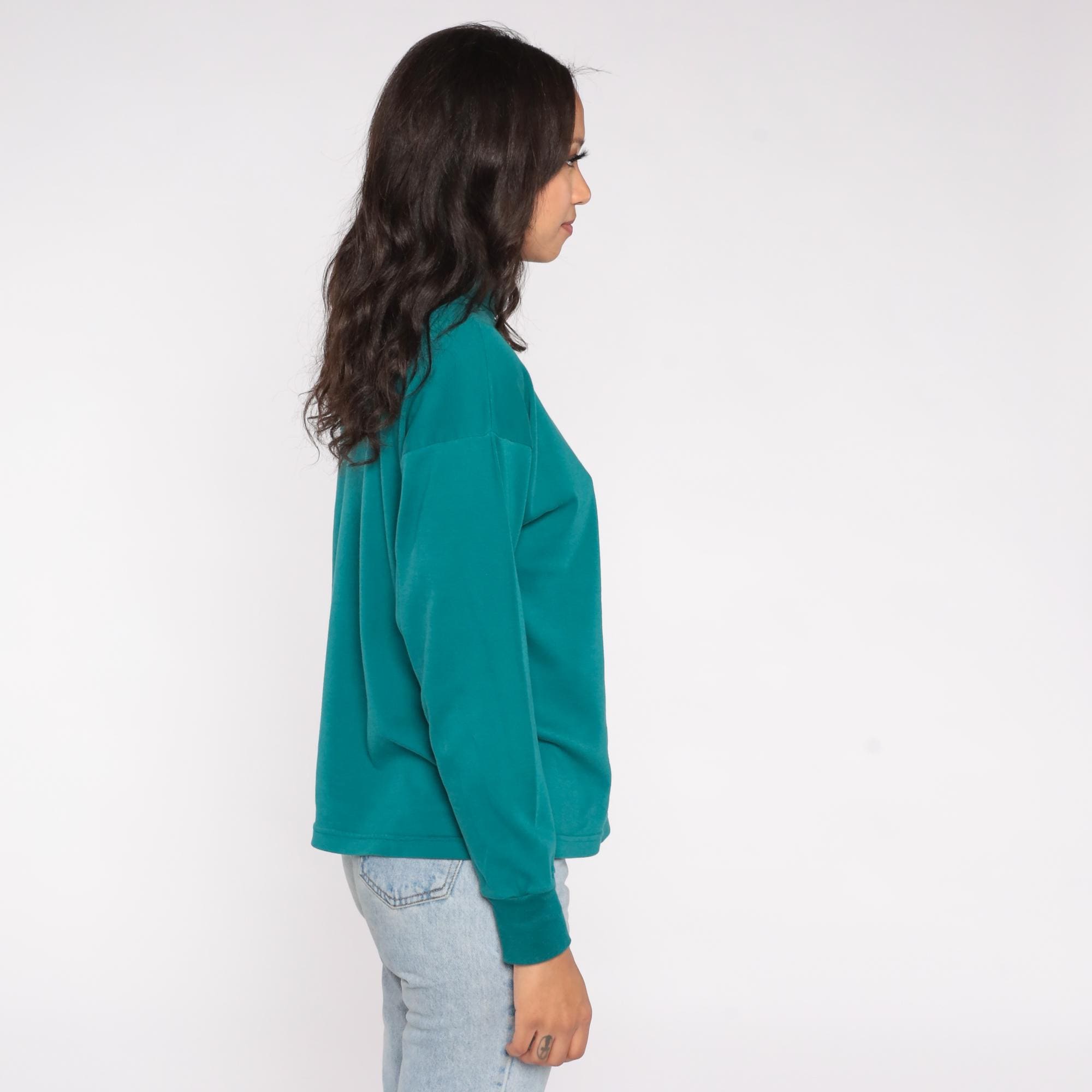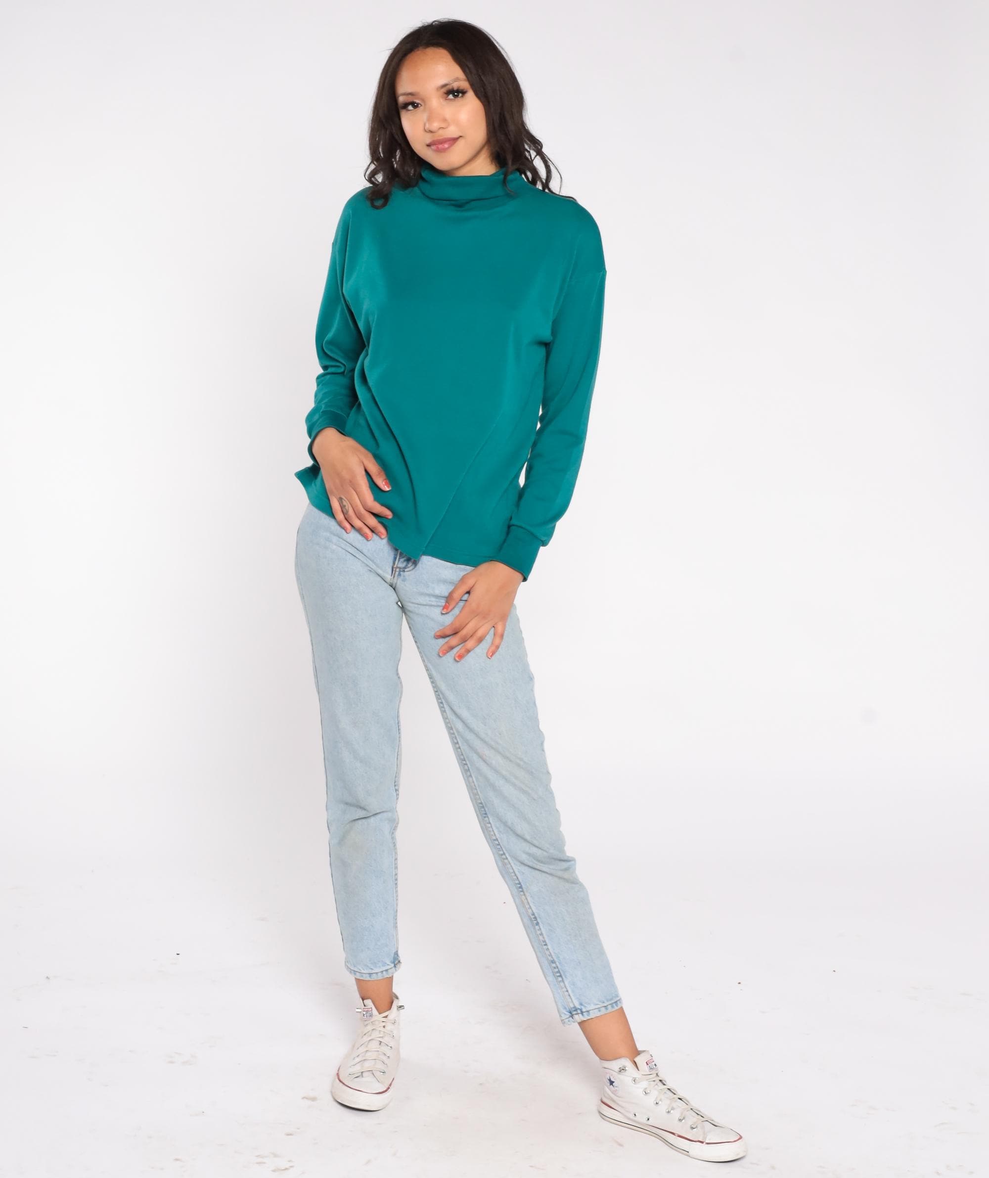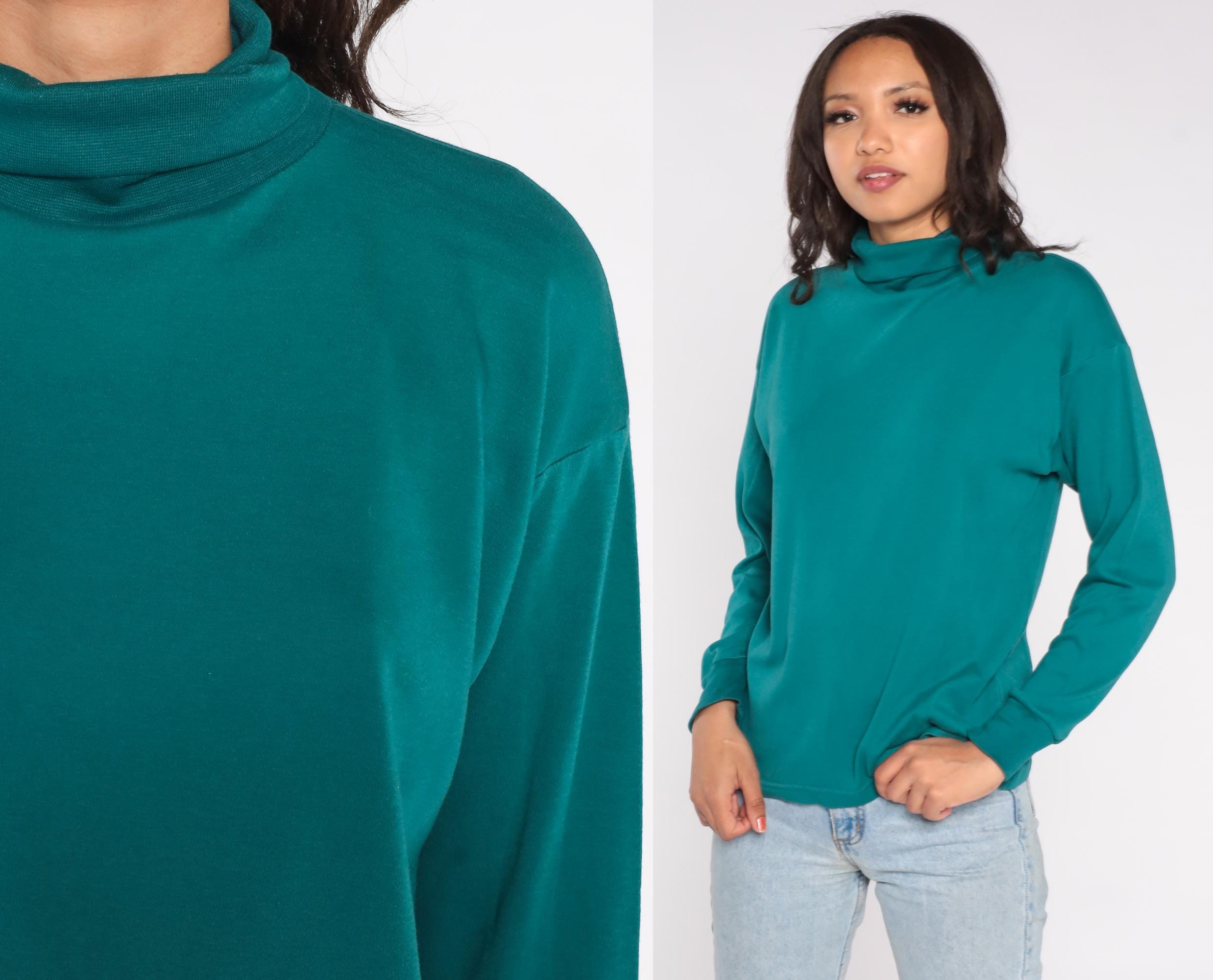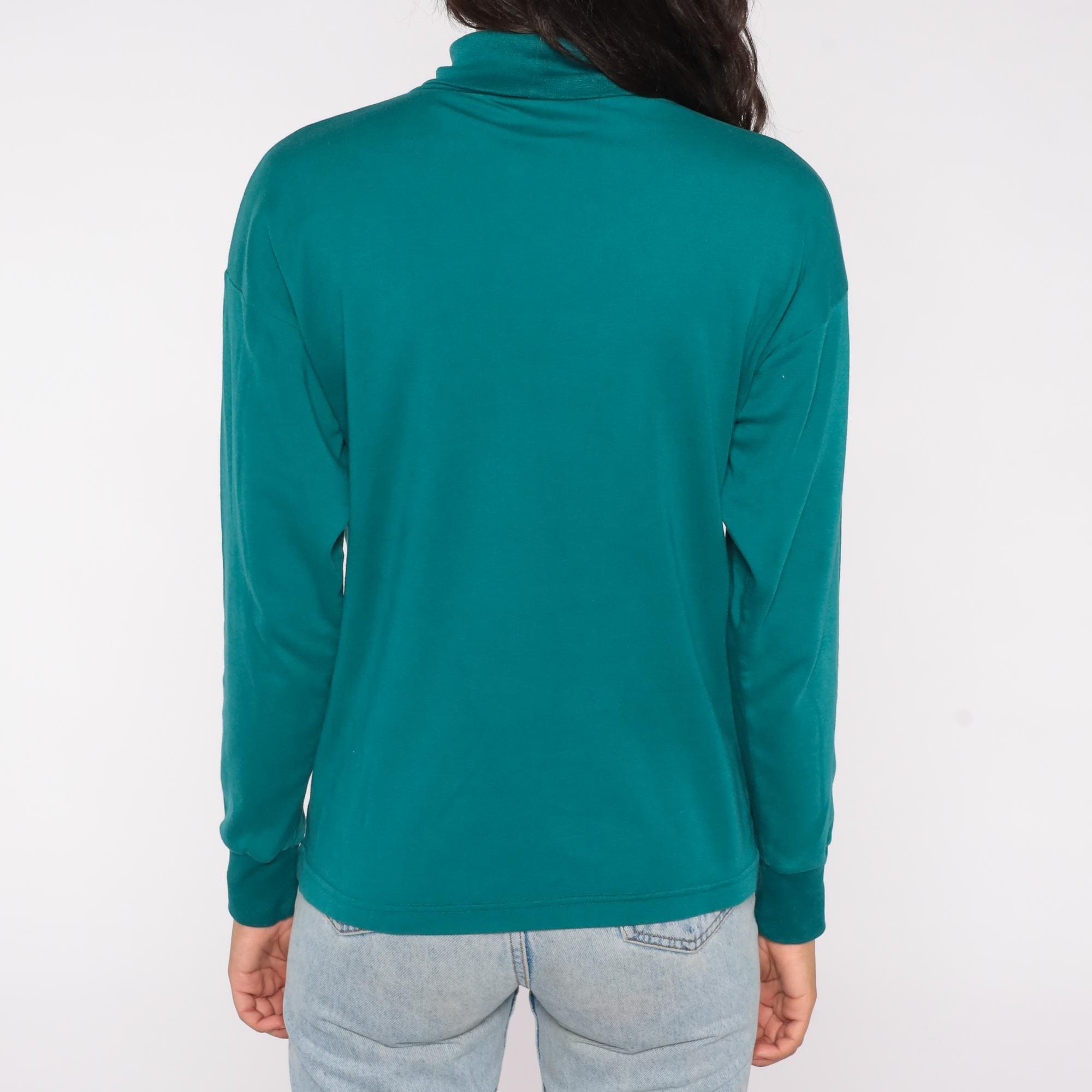 90s teal turtleneck in a rich jewel tone. Features soft cotton-polyester blend fabric with classic mock neck design. Simple, minimalist styling with clean lines and slightly relaxed fit.