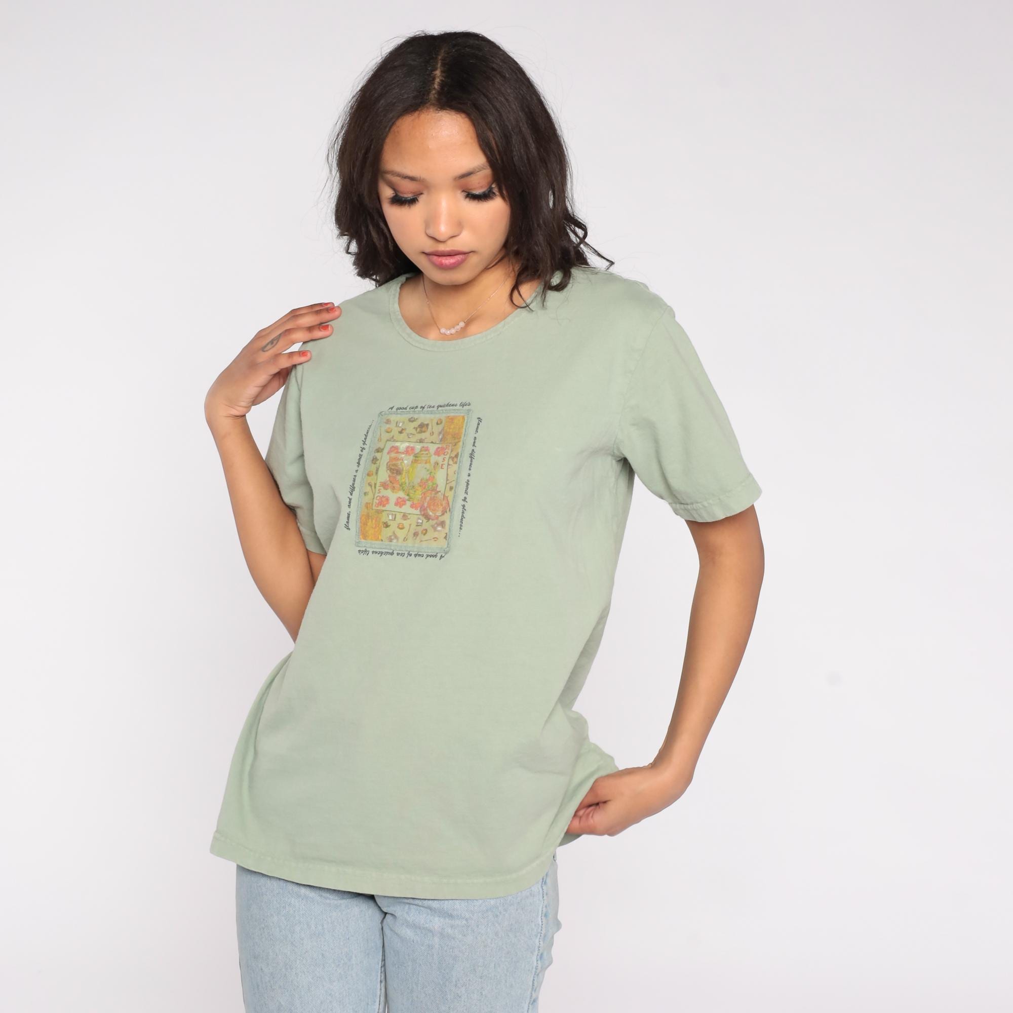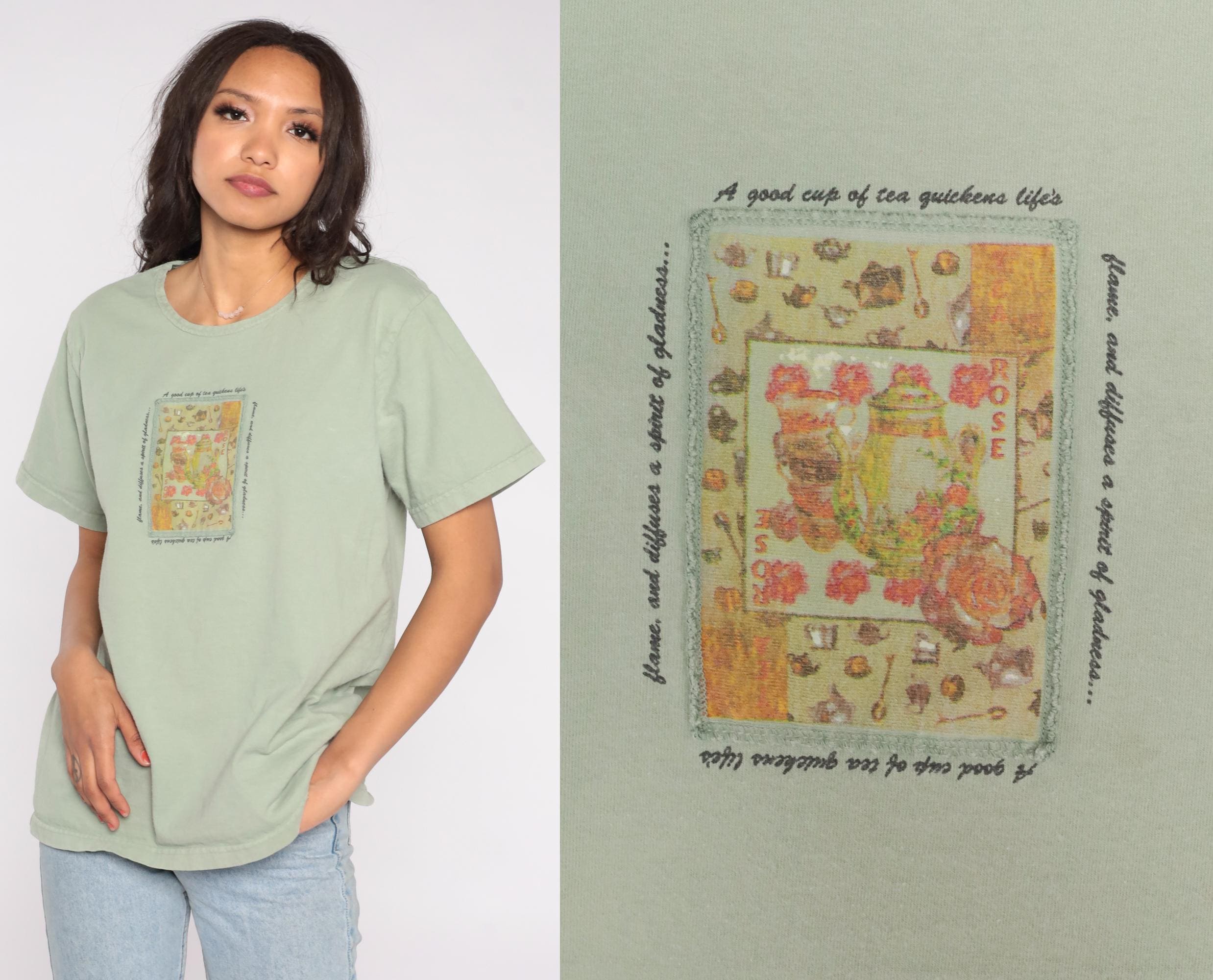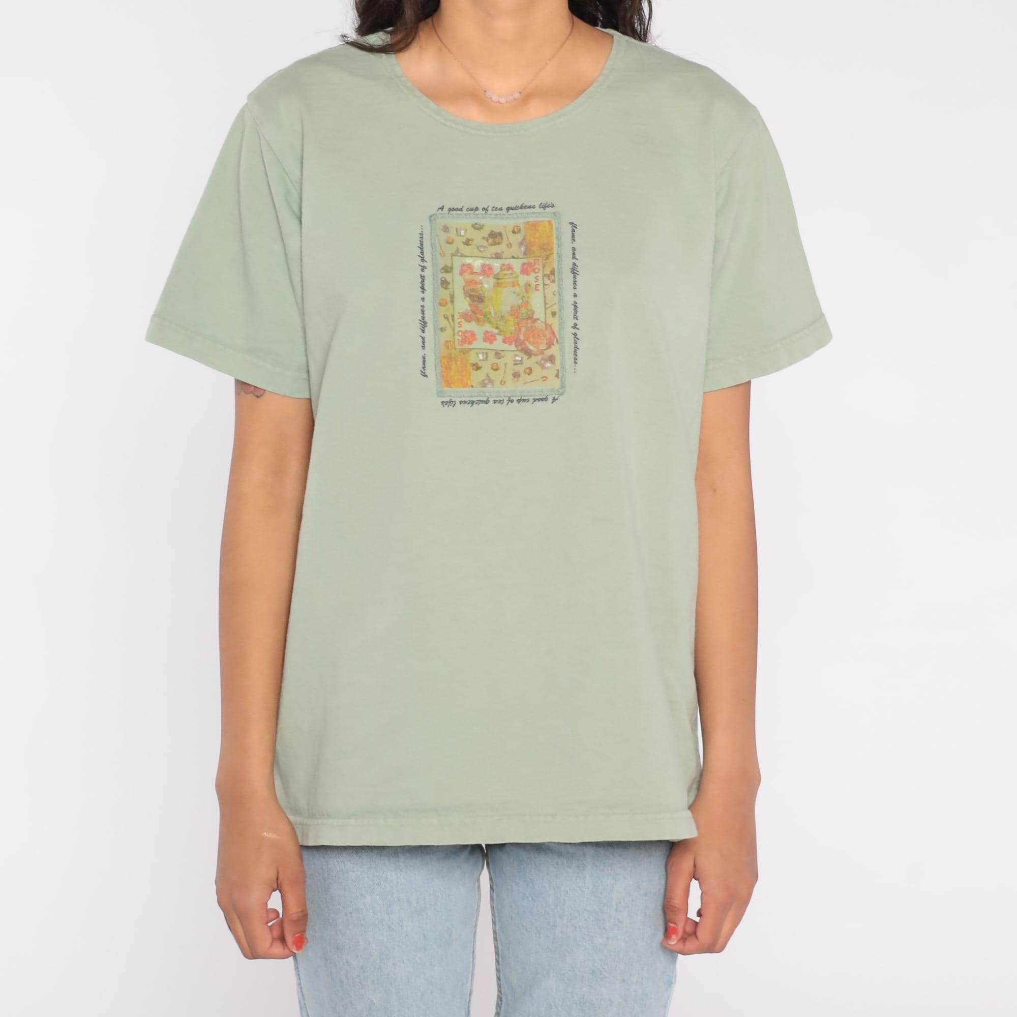 Y2K sage green t-shirt featuring a rose teapot graphic framed by the quote “A good cup of tea quickens life’s flame and diffuses a spirit of gladness.