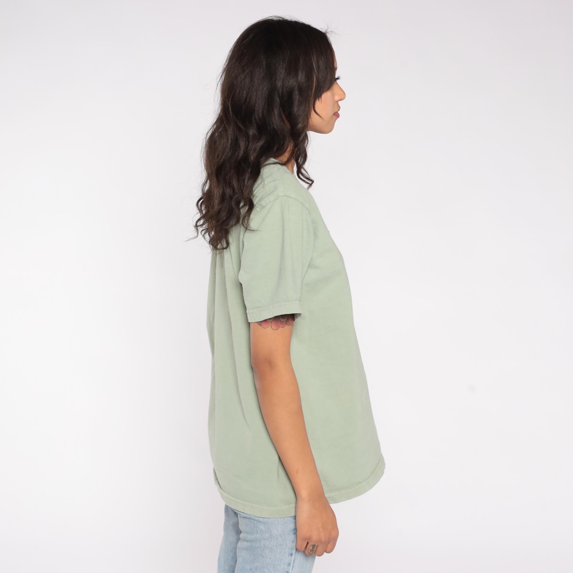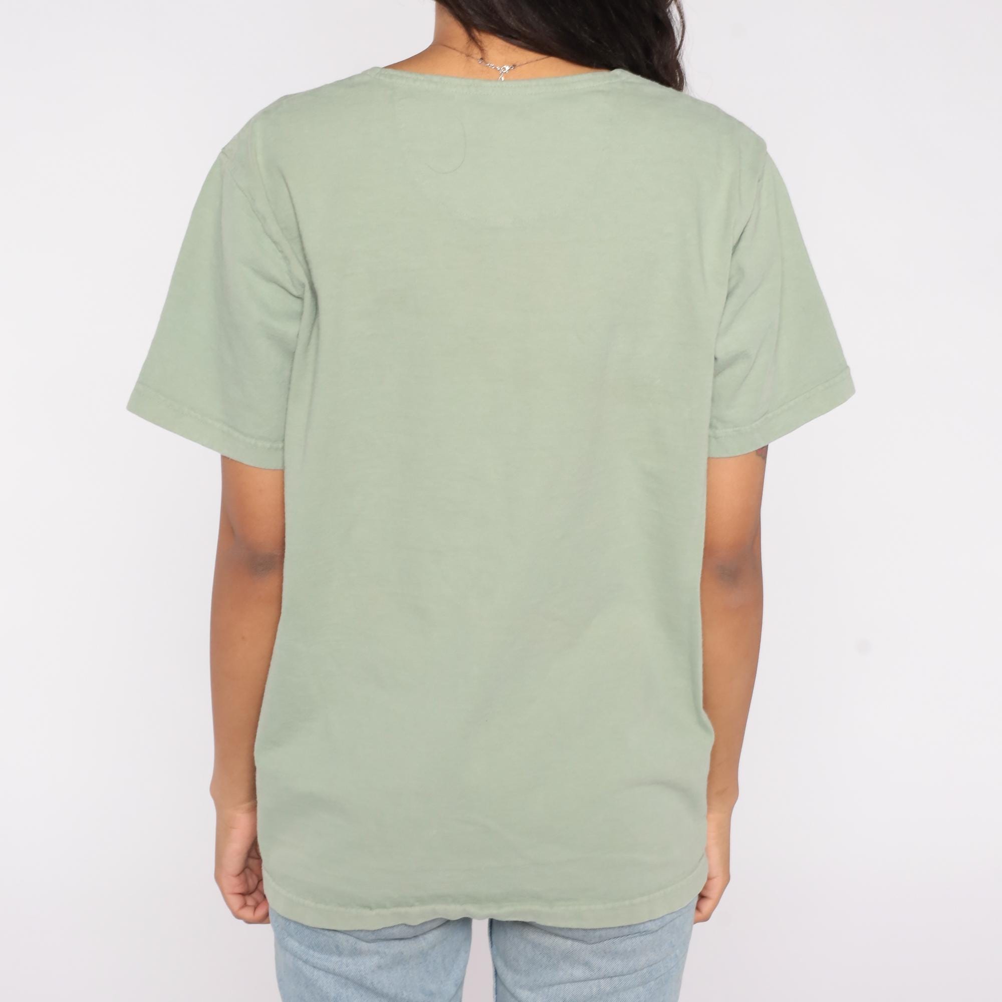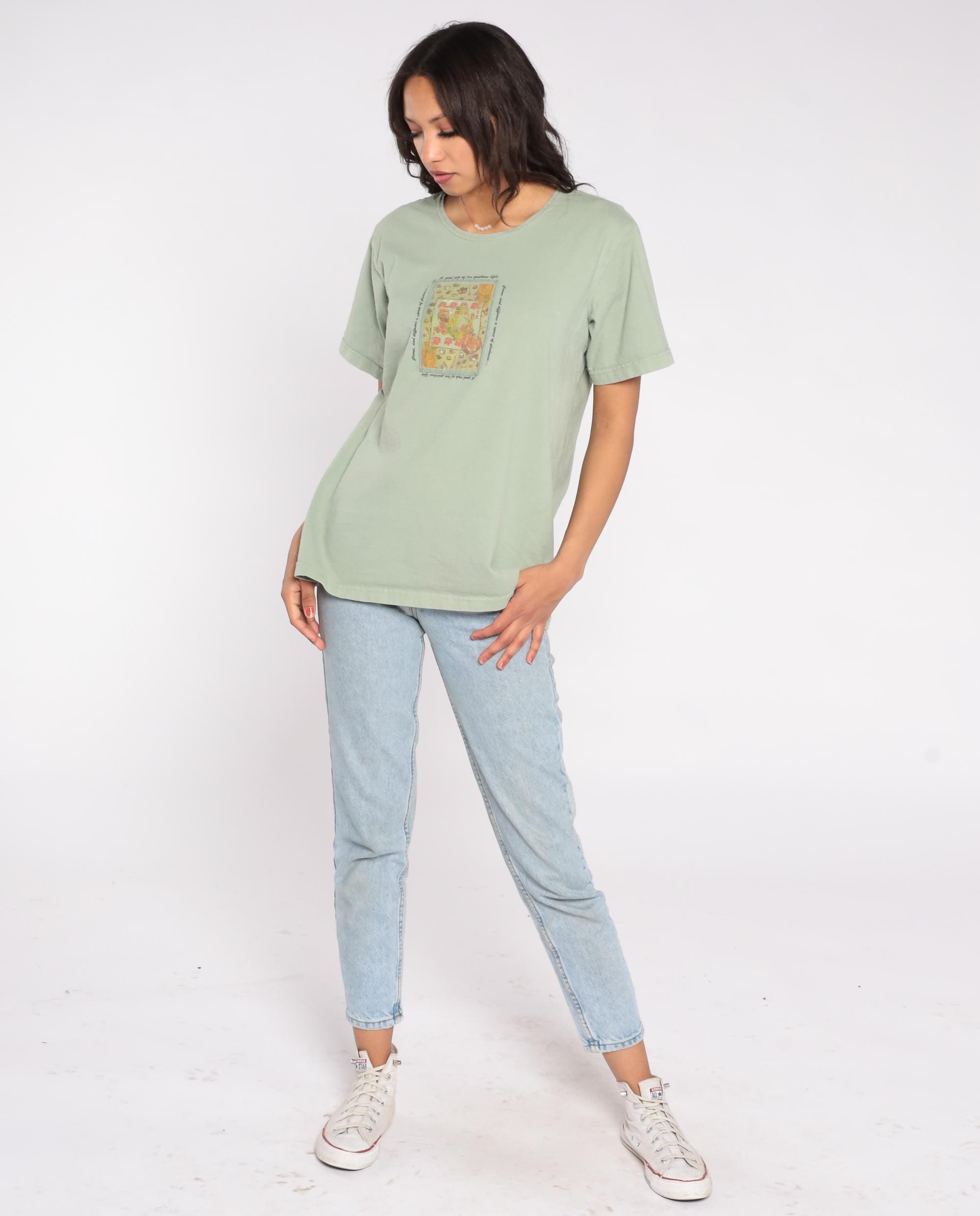 Y2K sage green t-shirt featuring a rose teapot graphic framed by the quote “A good cup of tea quickens life’s flame and diffuses a spirit of gladness.