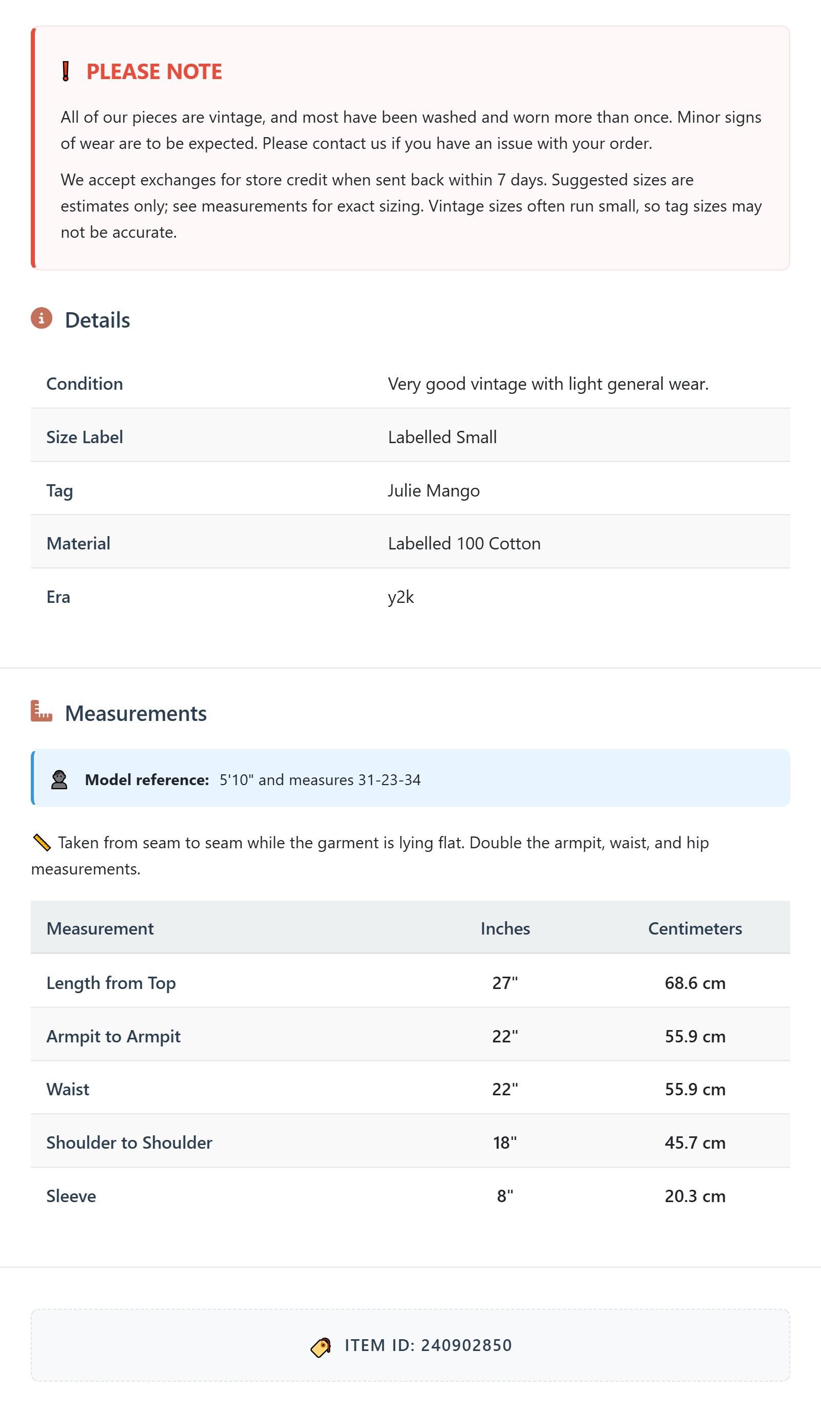 All of our pieces are vintage, and most have been washed and worn more than once. Minor signs of wear are to be expected. Please contact us if you have an issue with your order. We accept exchanges for store credit when sent back within 7 days.