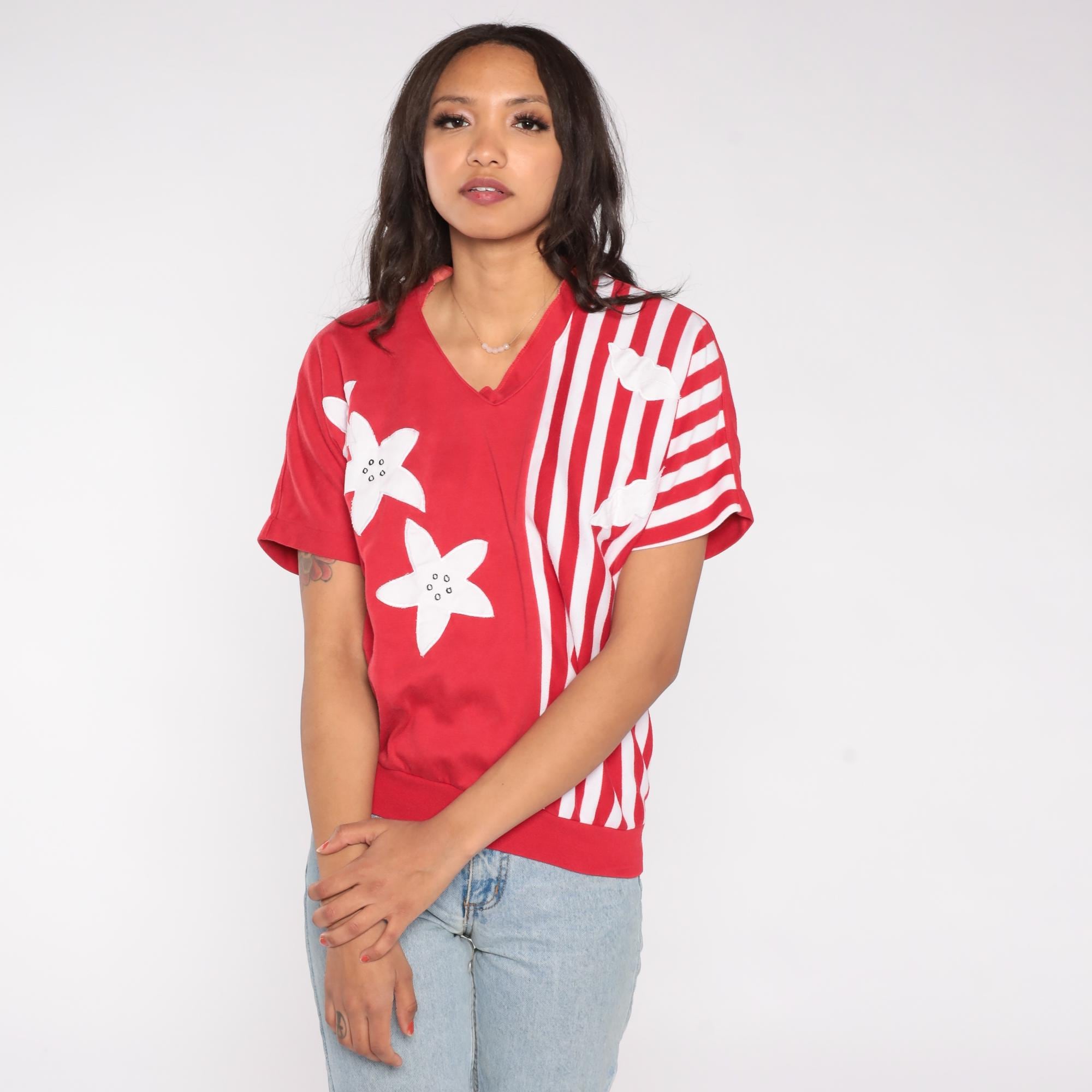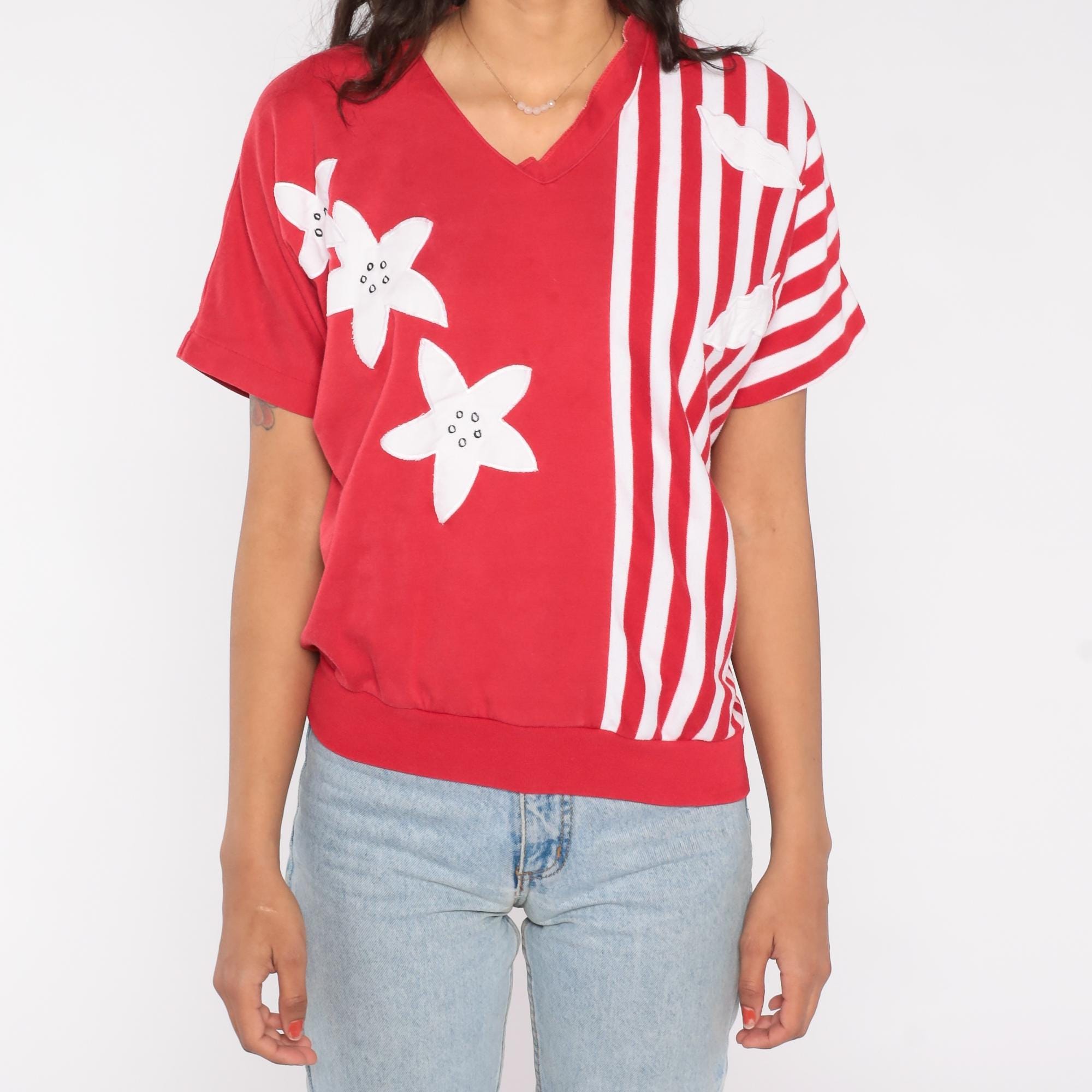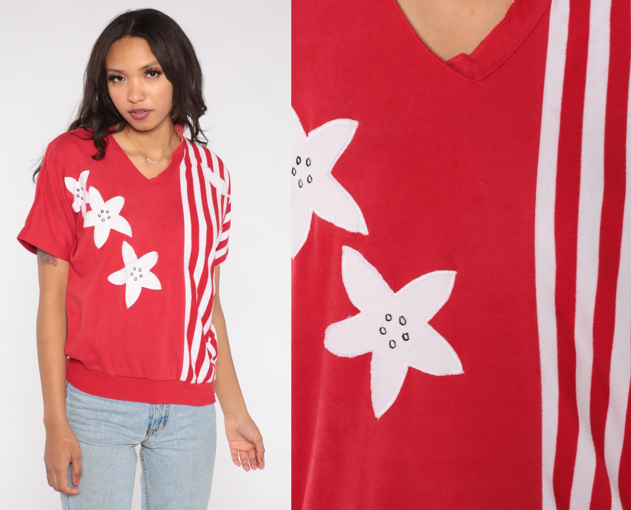 80s red short sleeve top featuring white floral applique and vertical stripe contrast design. Made in Korea by Alfred Dunner, this pullover shirt includes a V neckline and relaxed fit.