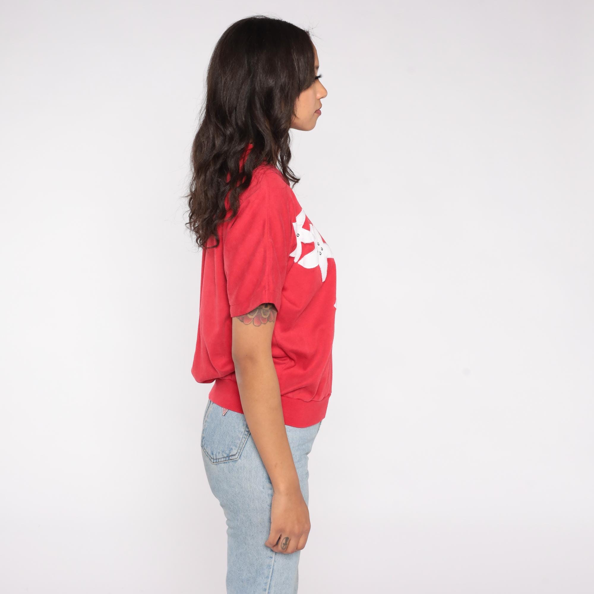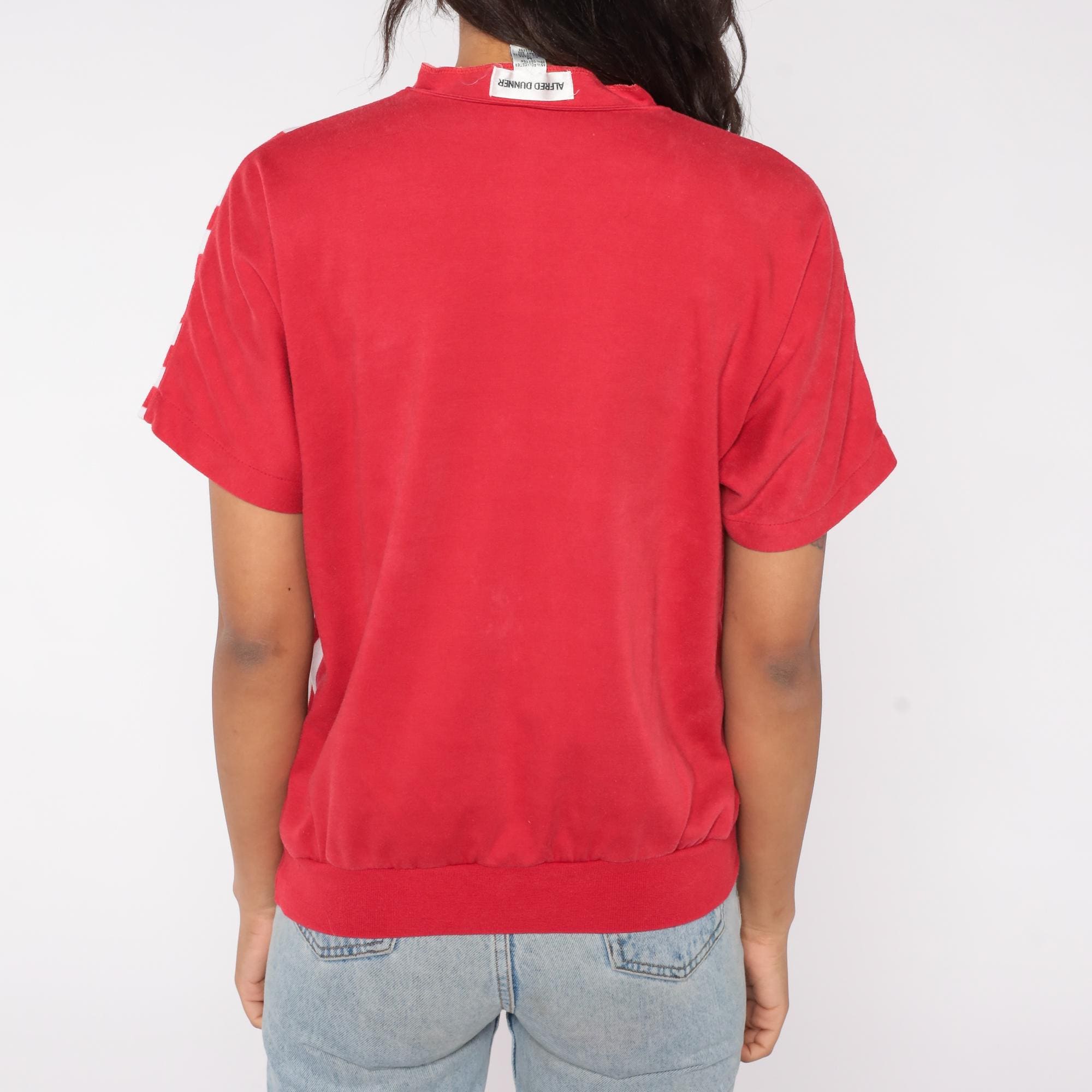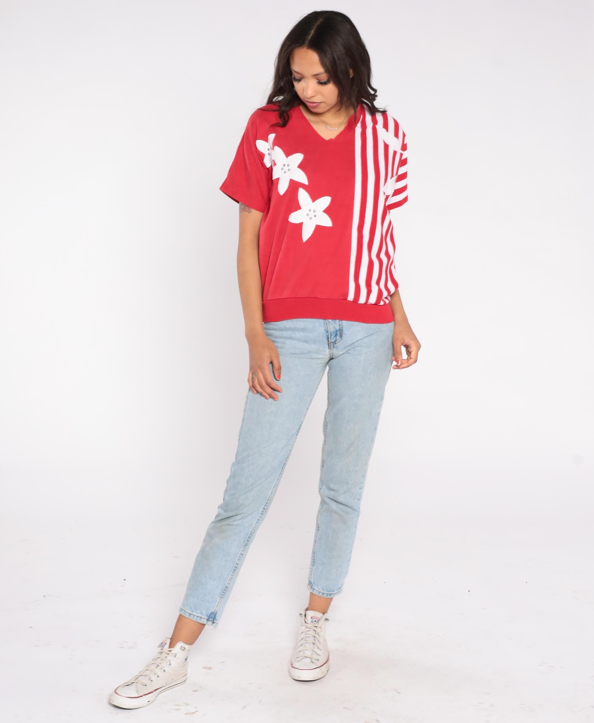 80s red short sleeve top featuring white floral applique and vertical stripe contrast design. Made in Korea by Alfred Dunner, this pullover shirt includes a V neckline and relaxed fit.