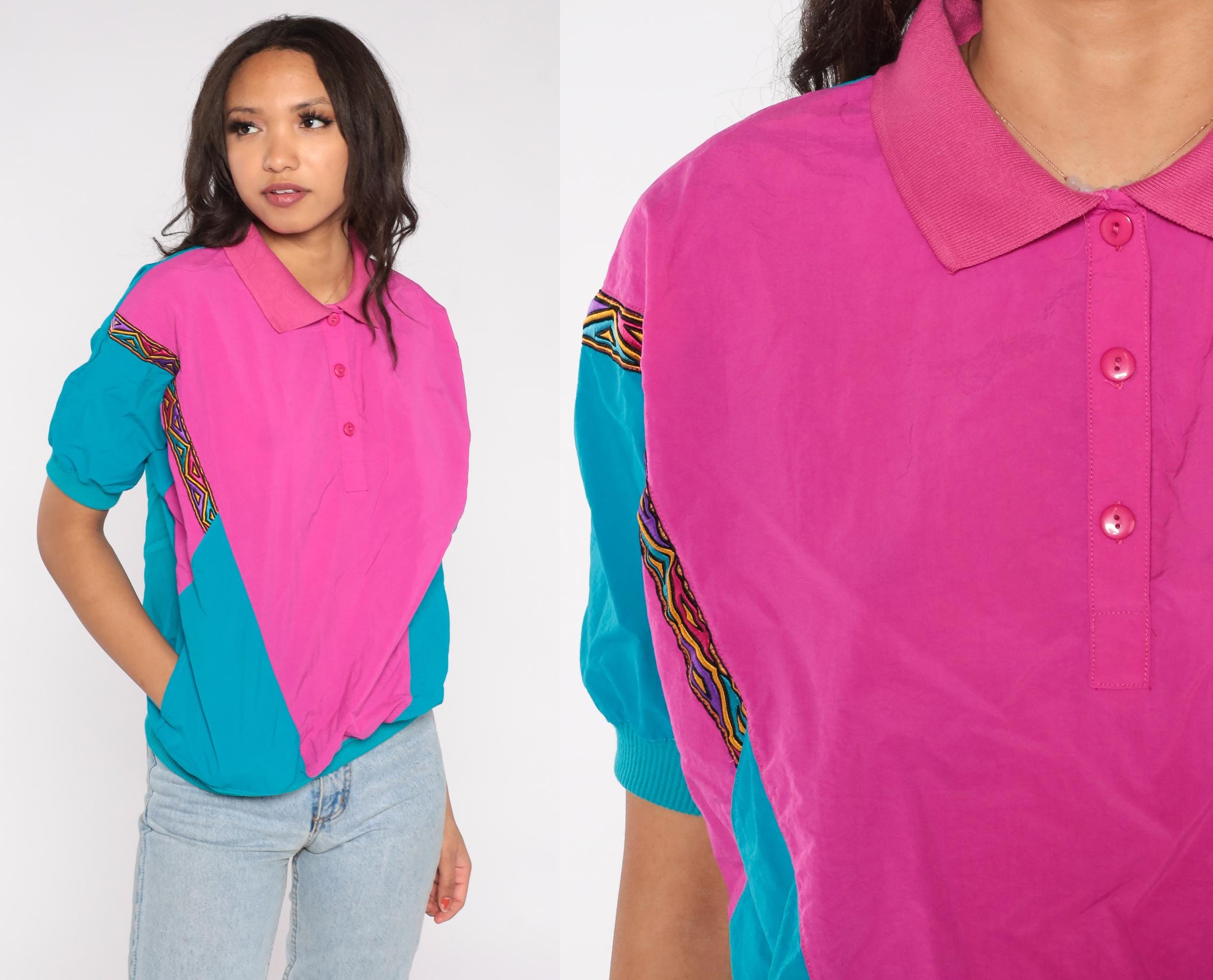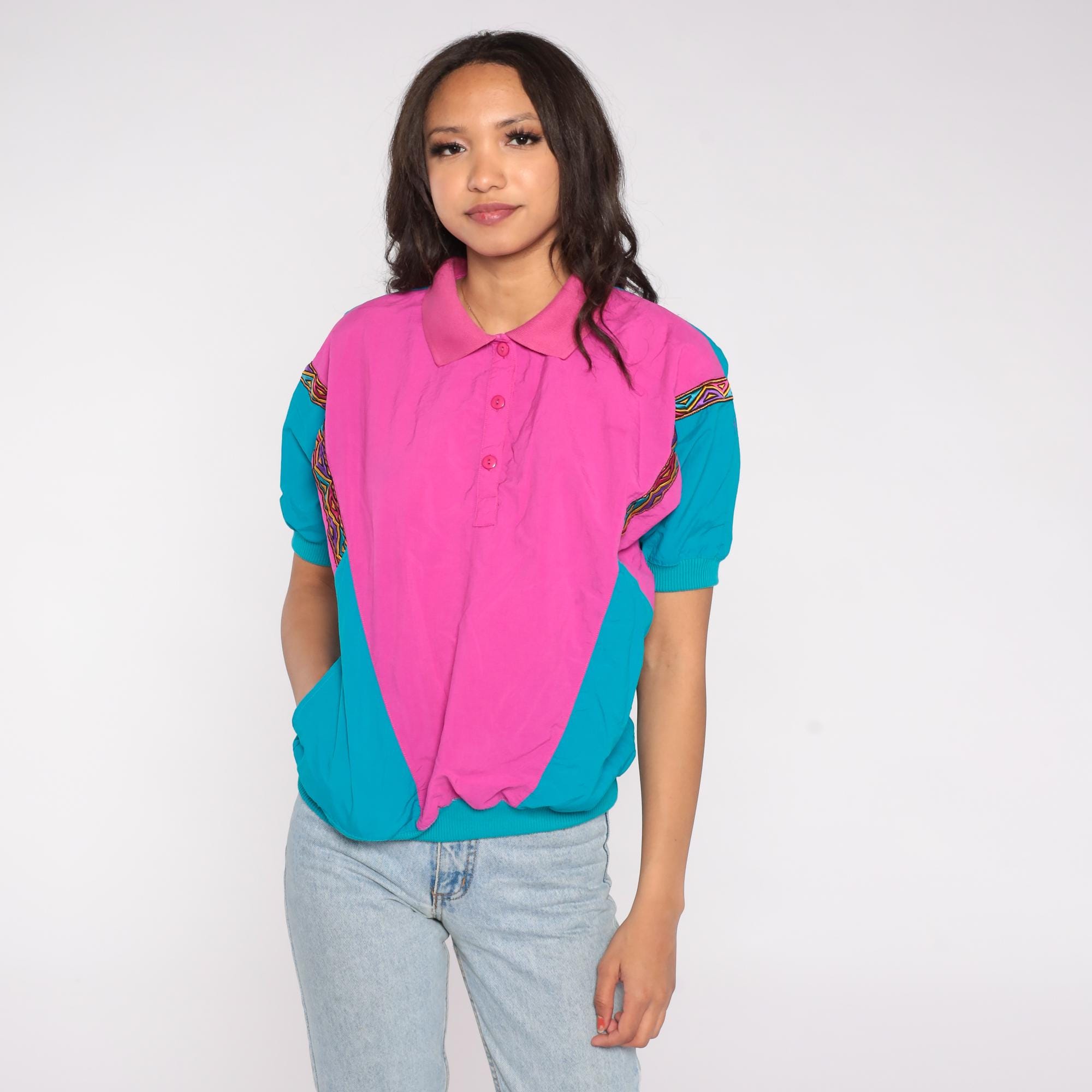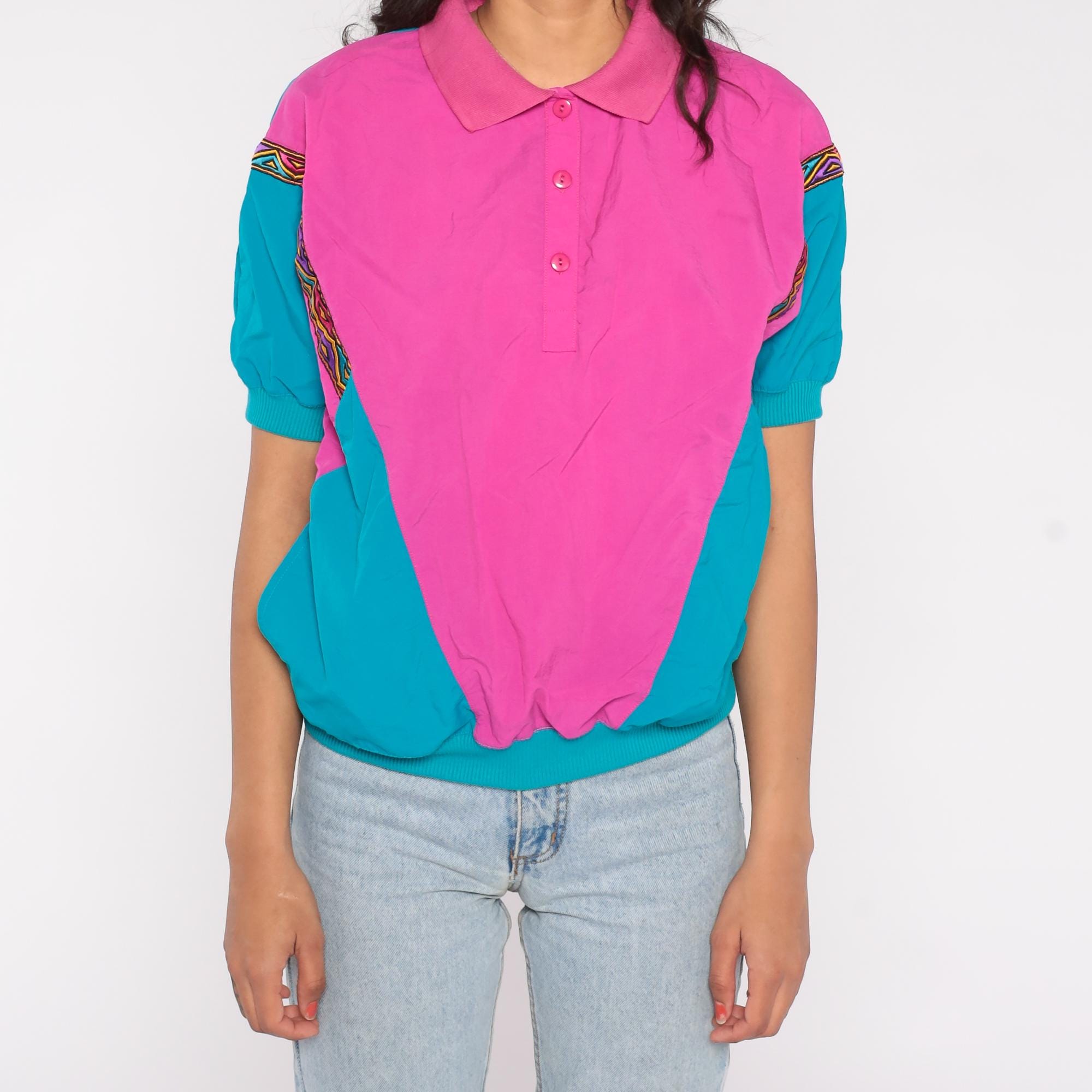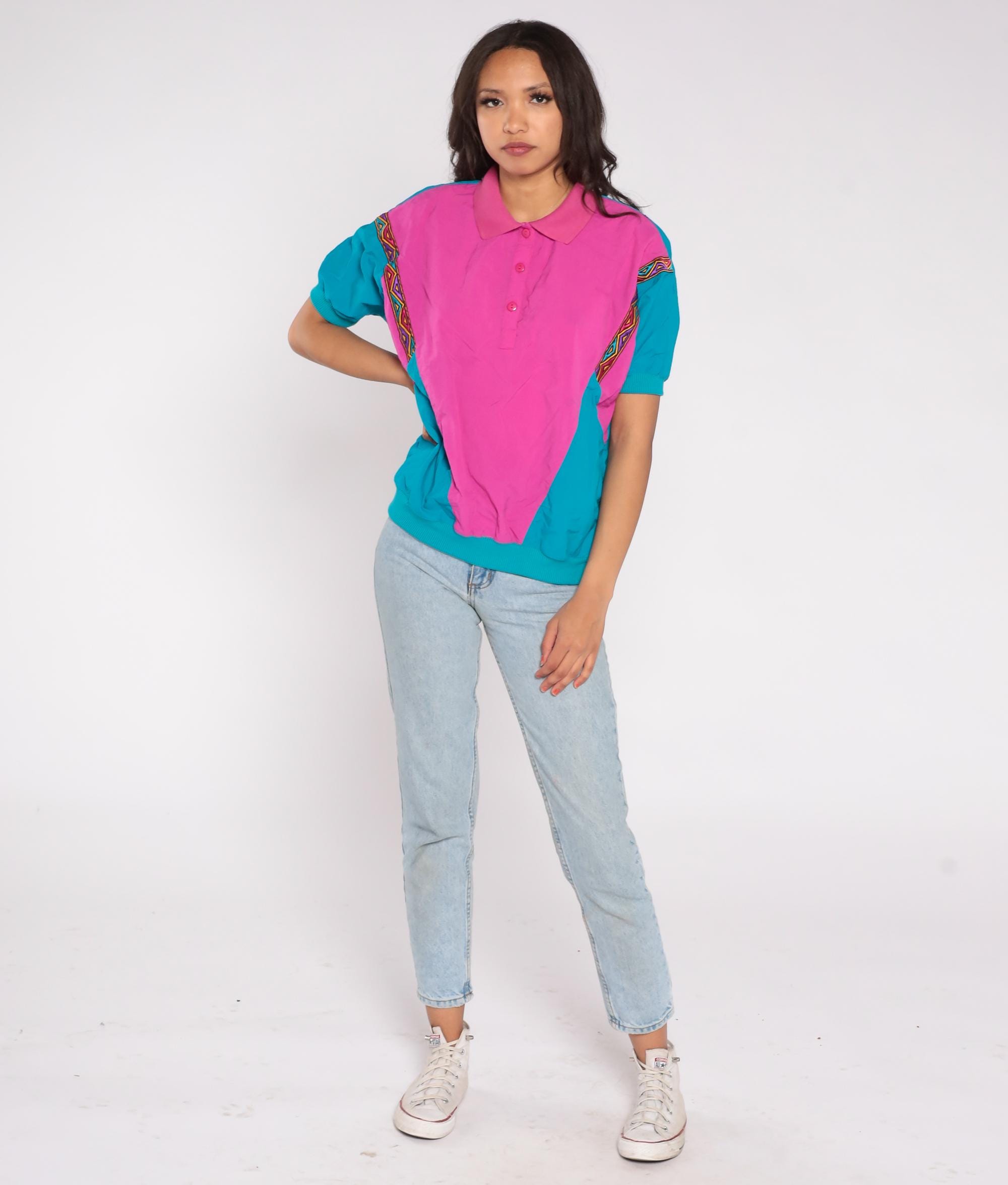 90s hot pink and teal polo top by Lavon by Cheerful Corp. Features vibrant color block design with bright pink front panel and teal sleeves/sides. Decorative trim along shoulders adds a unique abstract touch. Classic polo collar with three matching pink buttons. Short sleeves with elastic ribbed cuffs.