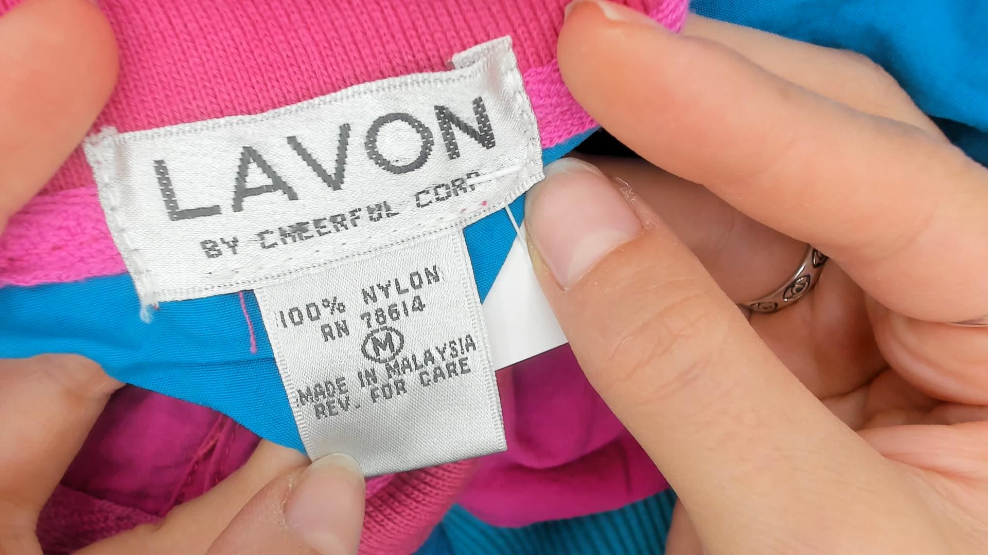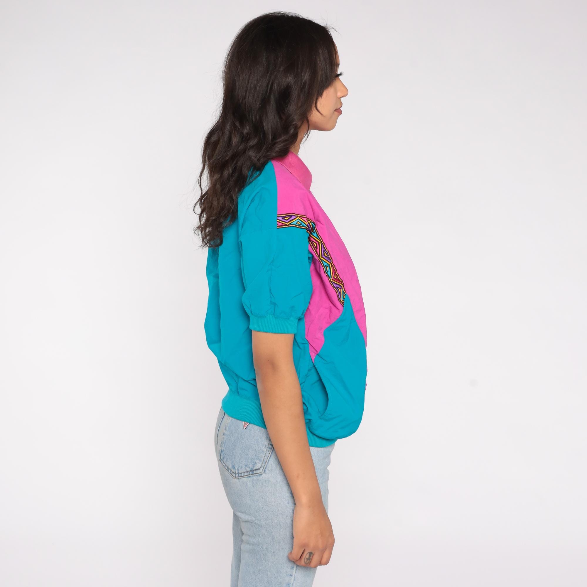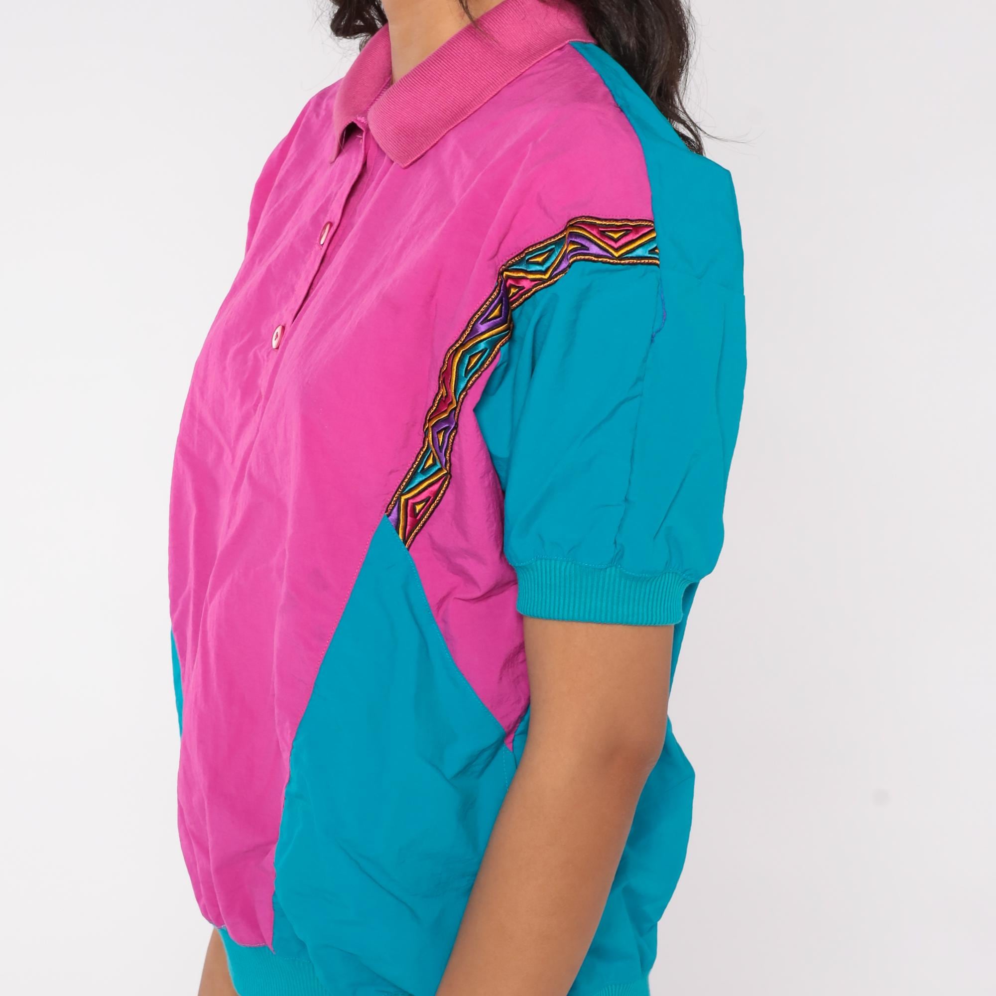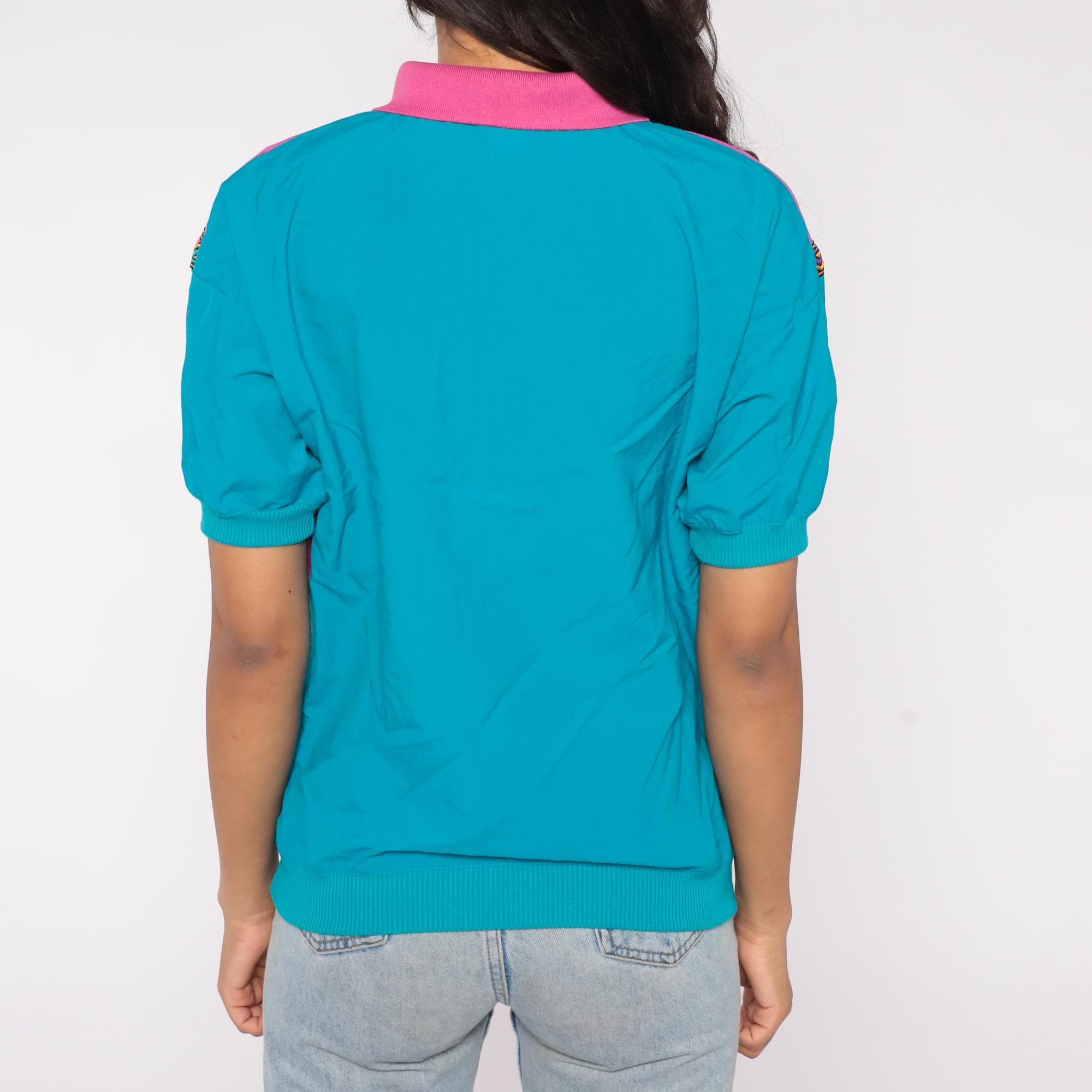 90s hot pink and teal polo top by Lavon by Cheerful Corp. Features vibrant color block design with bright pink front panel and teal sleeves/sides. Decorative trim along shoulders adds a unique abstract touch. Classic polo collar with three matching pink buttons. Short sleeves with elastic ribbed cuffs.