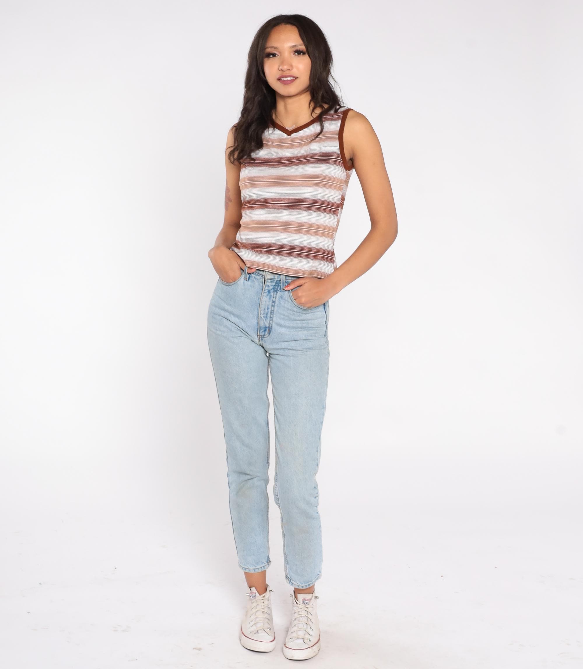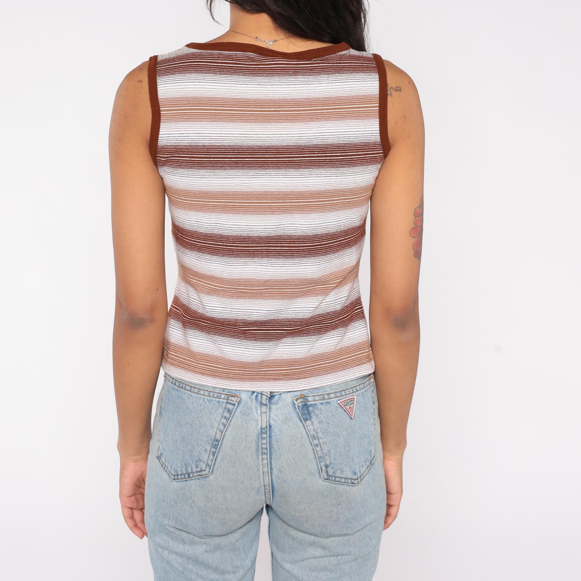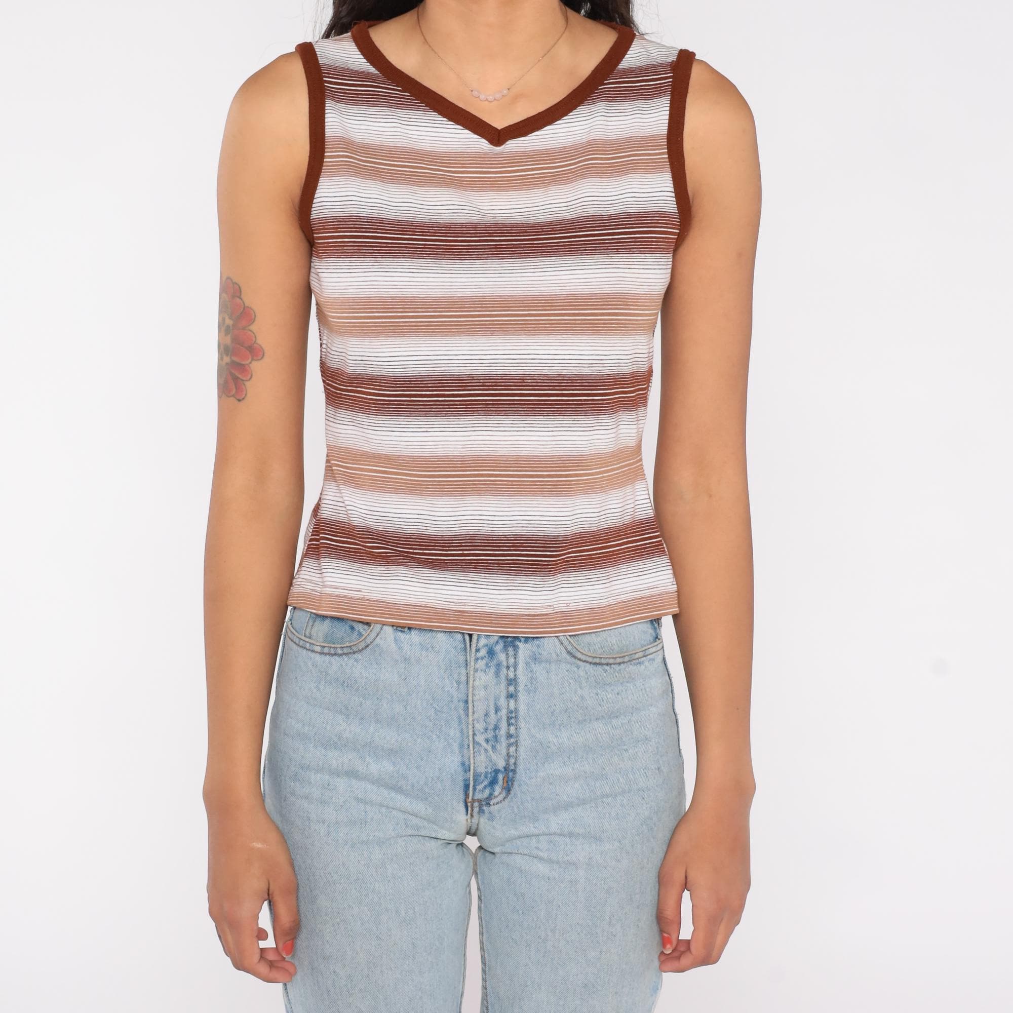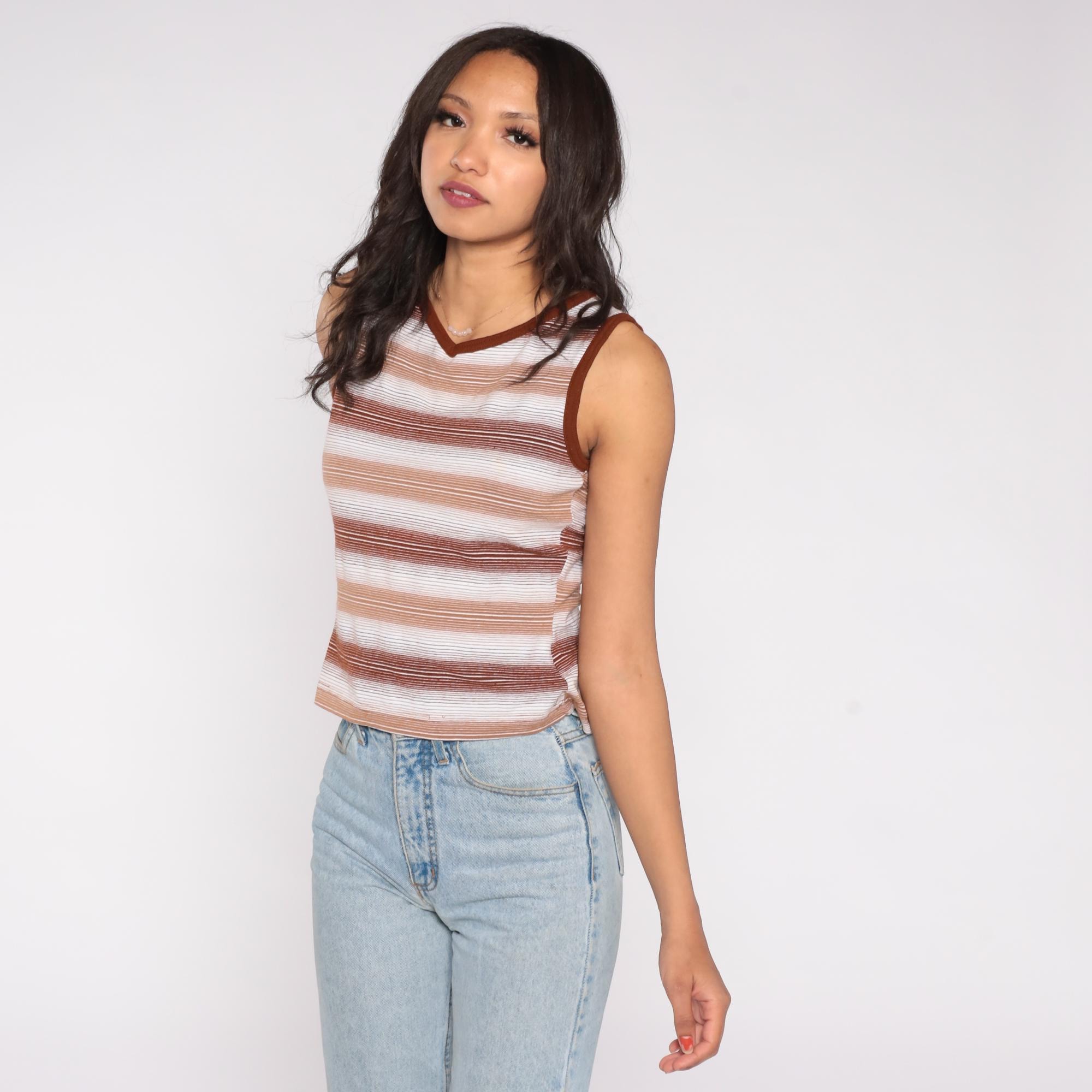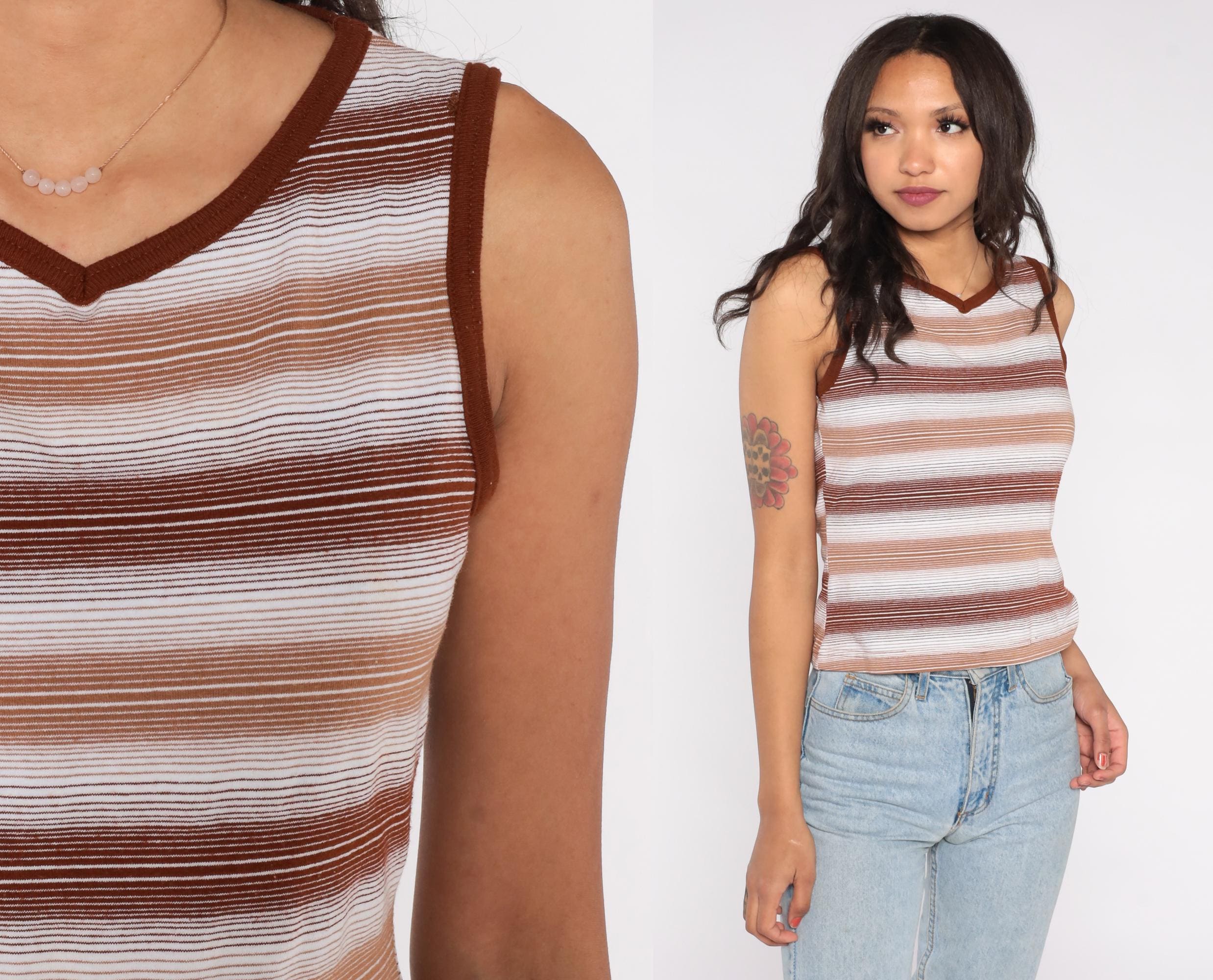 70s brown and white striped tank top with a fitted silhouette and V neckline. Features ribbed trim at the neck and armholes and a semi-sheer knit texture. Earth tone stripes give it a classic minimalist feel perfect for layering.