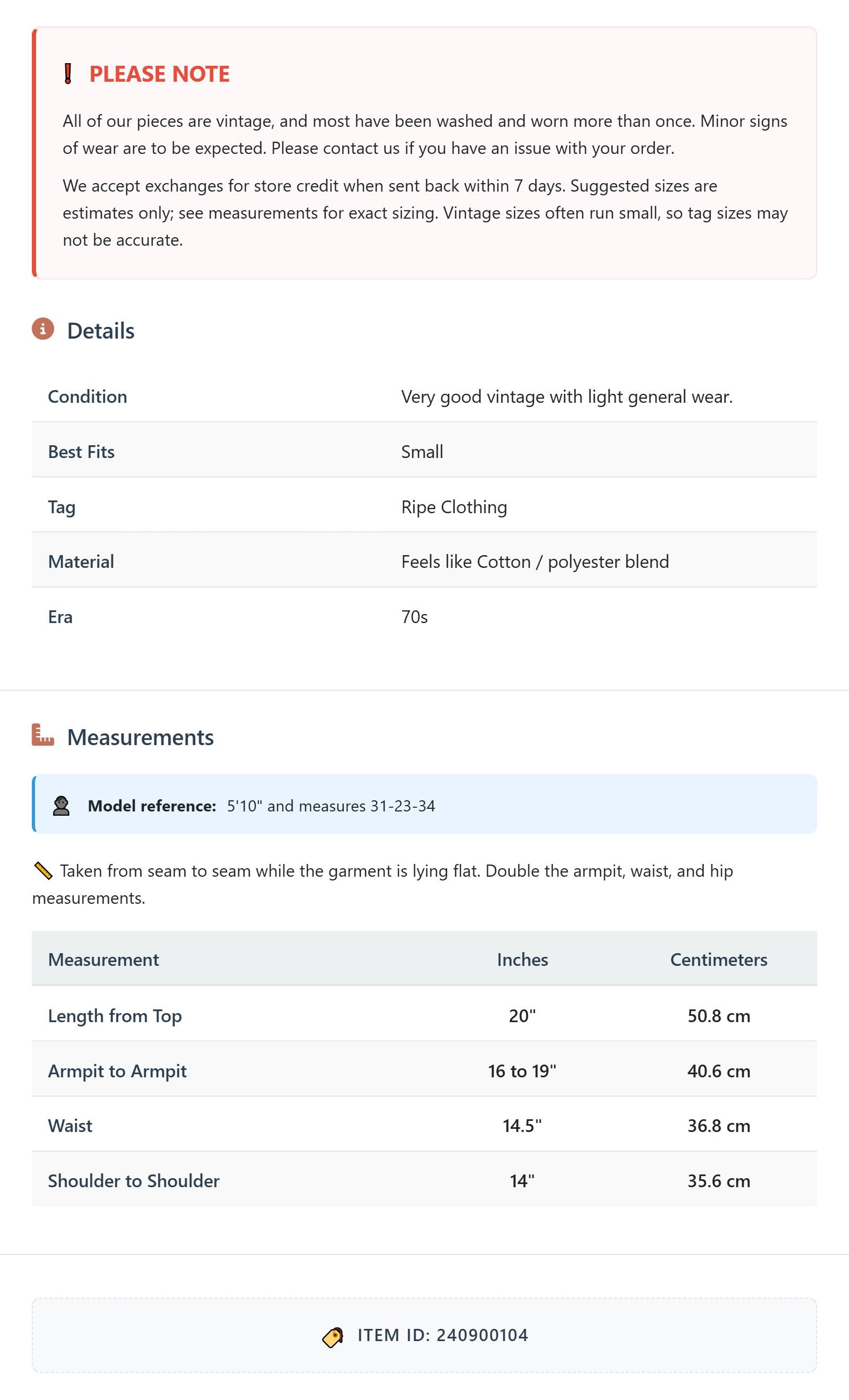 All of our pieces are vintage, and most have been washed and worn more than once. Minor signs of wear are to be expected. Please contact us if you have an issue with your order. We accept exchanges for store credit when sent back within 7 days.