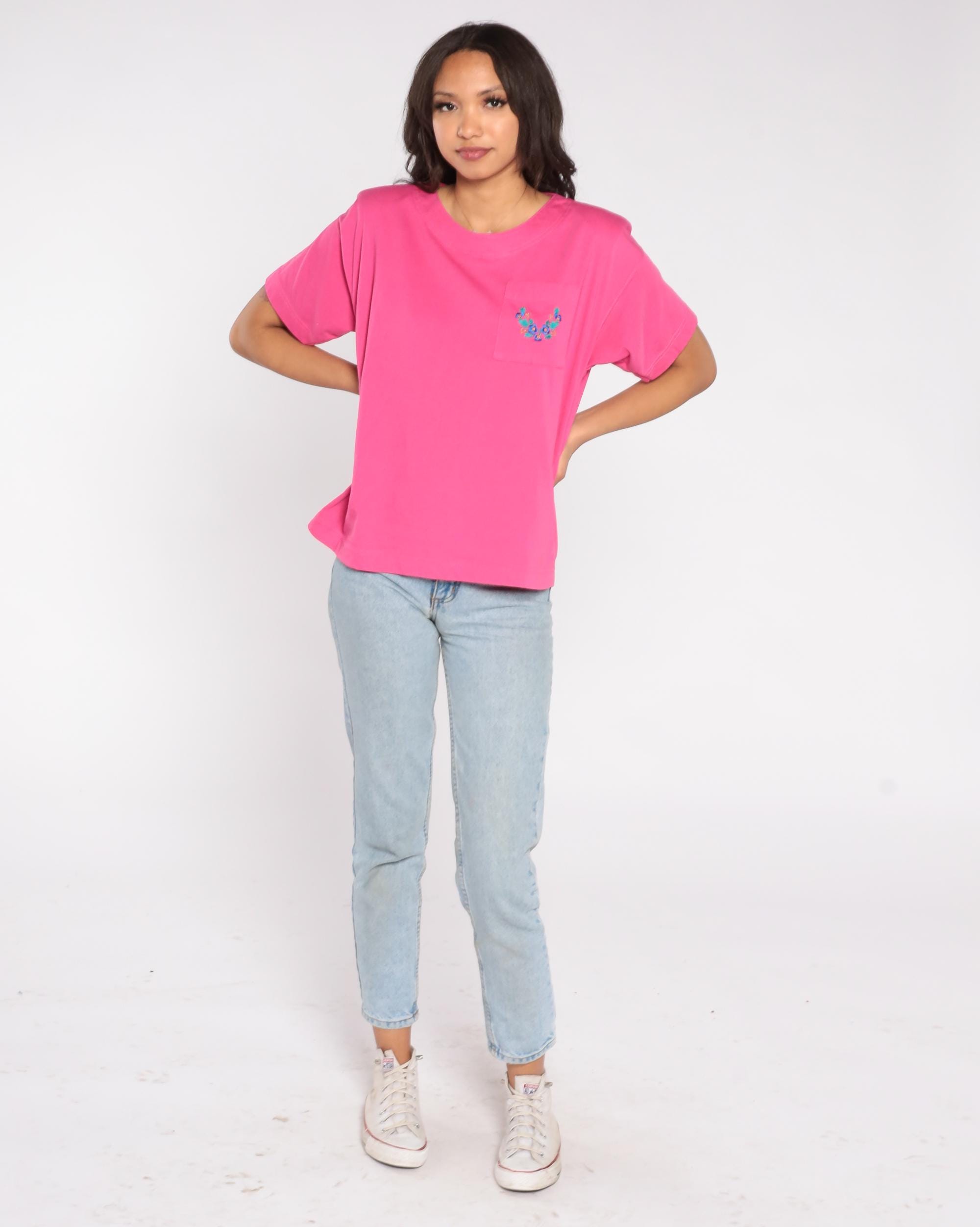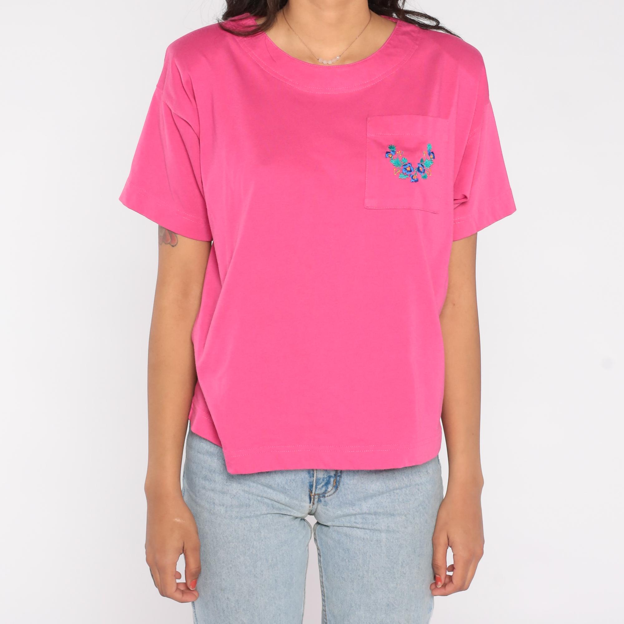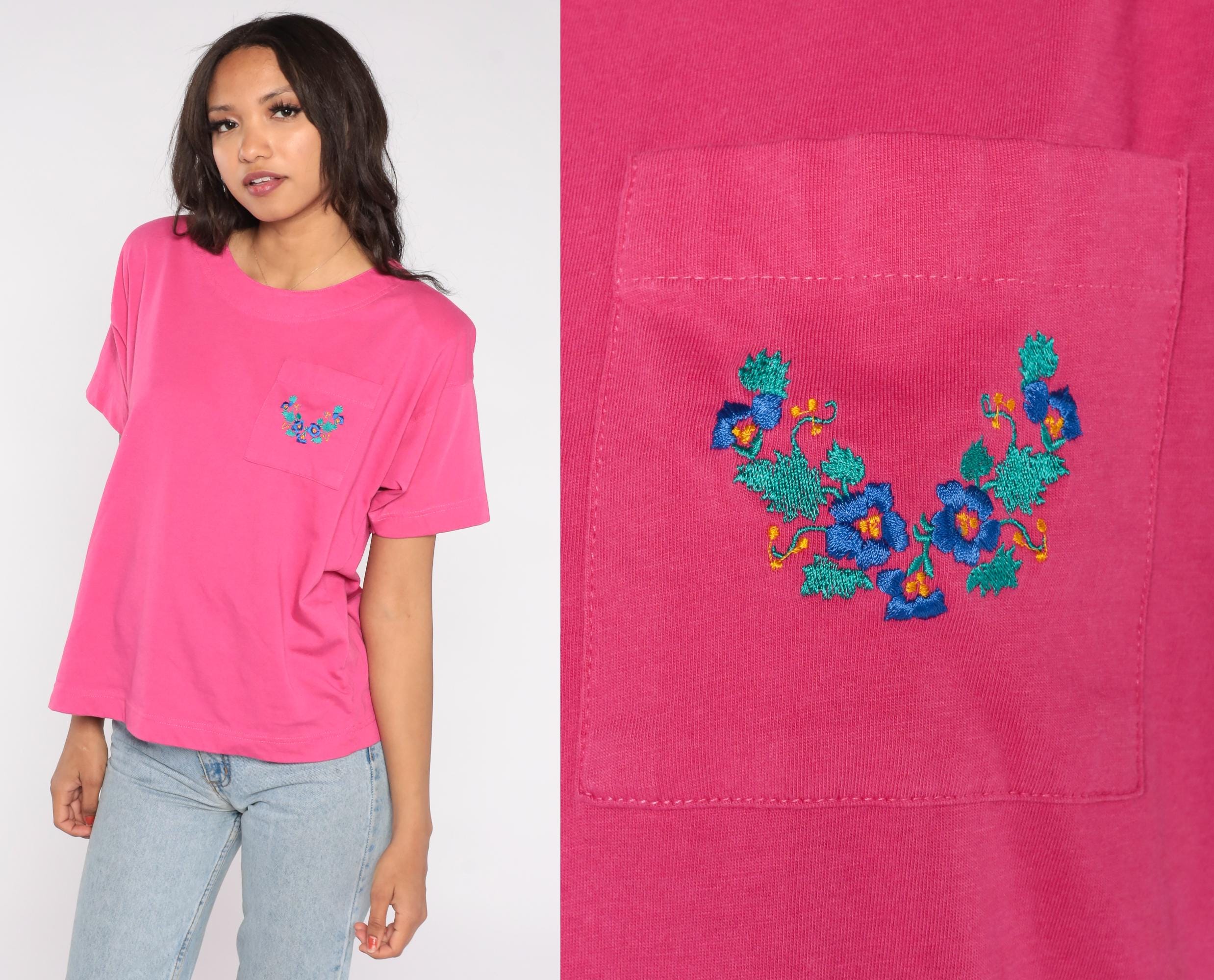 90s hot pink t-shirt by Colter Bay Sport. Features vibrant magenta fabric with a single chest pocket adorned with delicate floral embroidery in blue, teal, and yellow. Classic crew neck design with short sleeves.