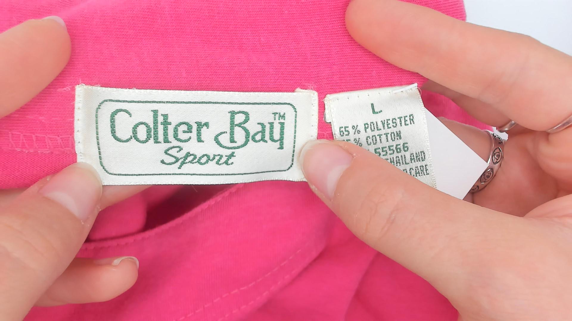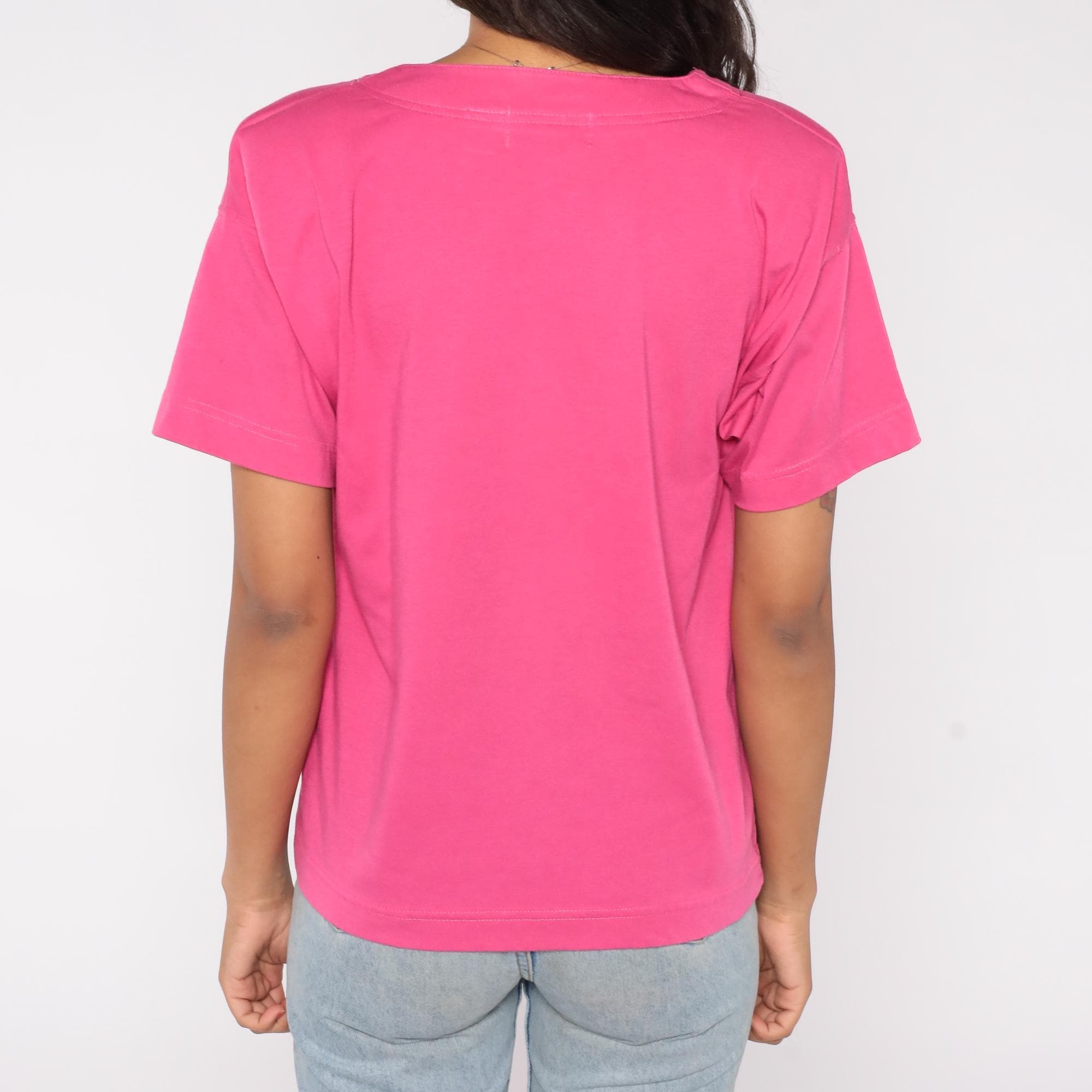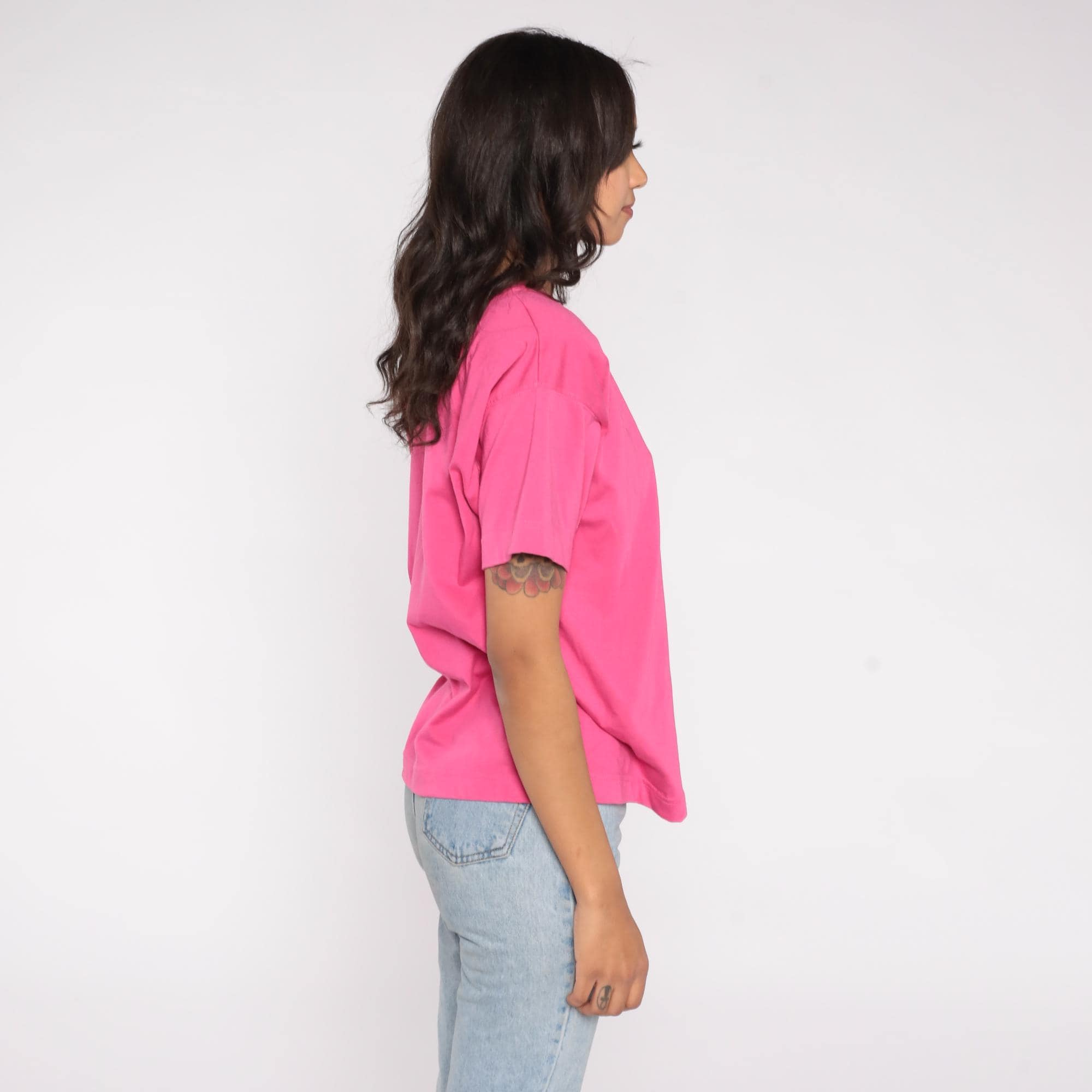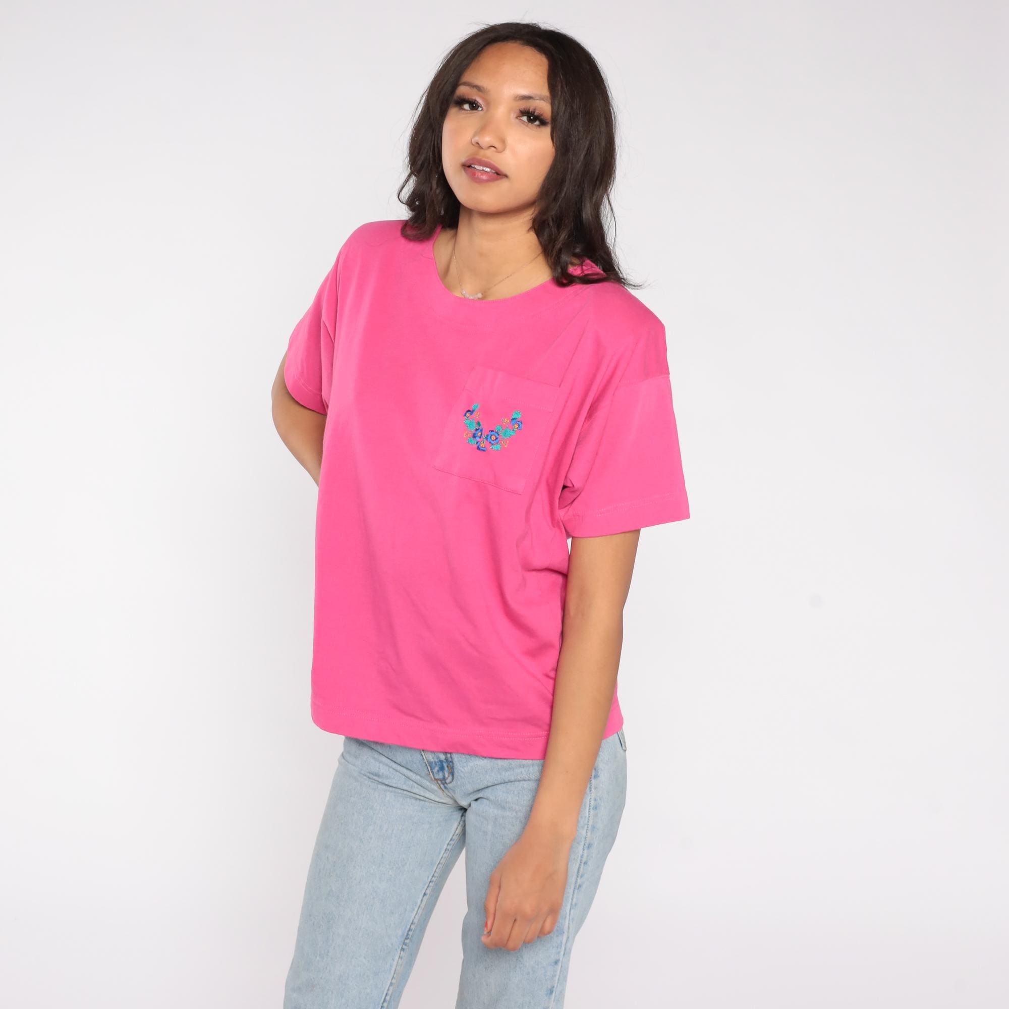 90s hot pink t-shirt by Colter Bay Sport. Features vibrant magenta fabric with a single chest pocket adorned with delicate floral embroidery in blue, teal, and yellow. Classic crew neck design with short sleeves.