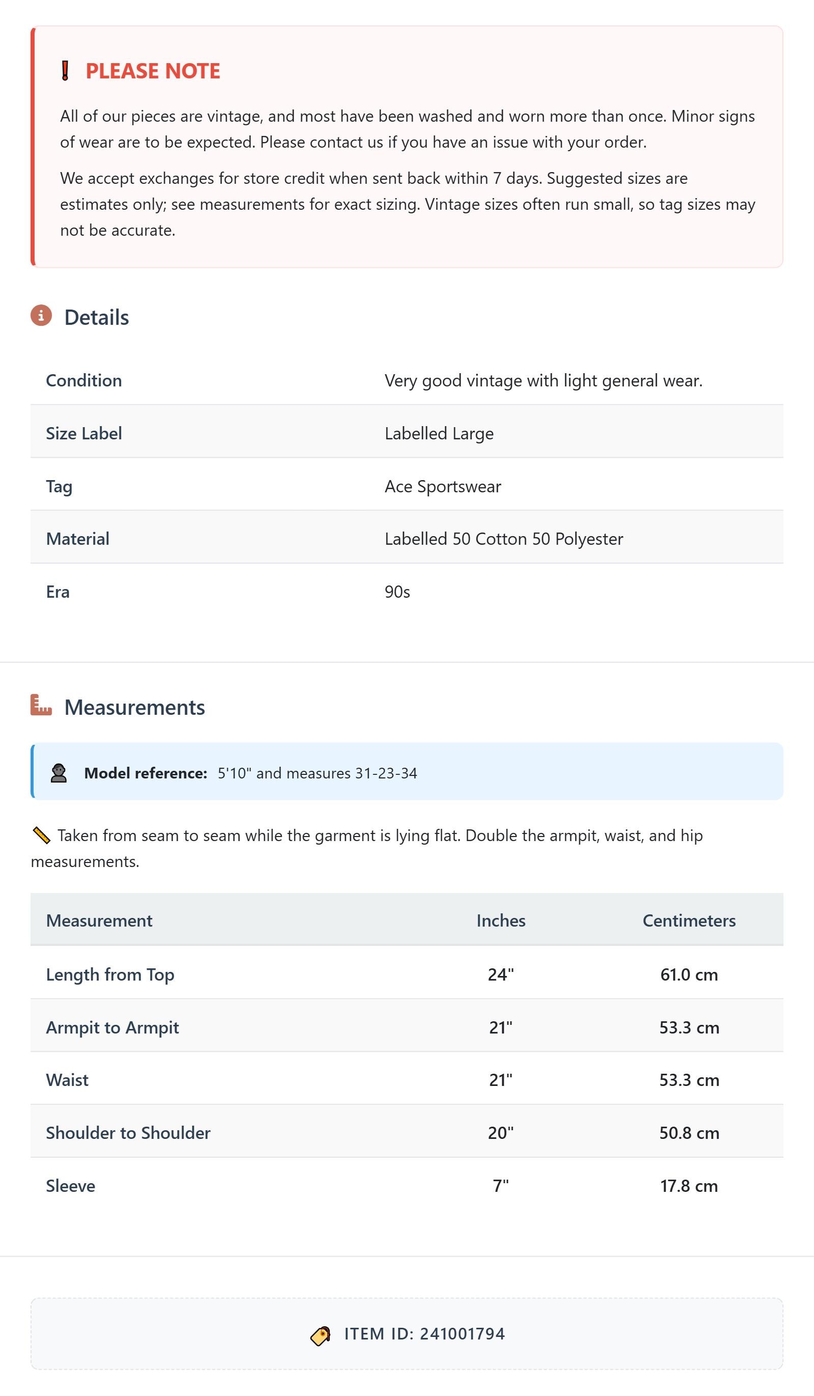All of our pieces are vintage, and most have been washed and worn more than once. Minor signs of wear are to be expected. Please contact us if you have an issue with your order. We accept exchanges for store credit when sent back within 7 days.
