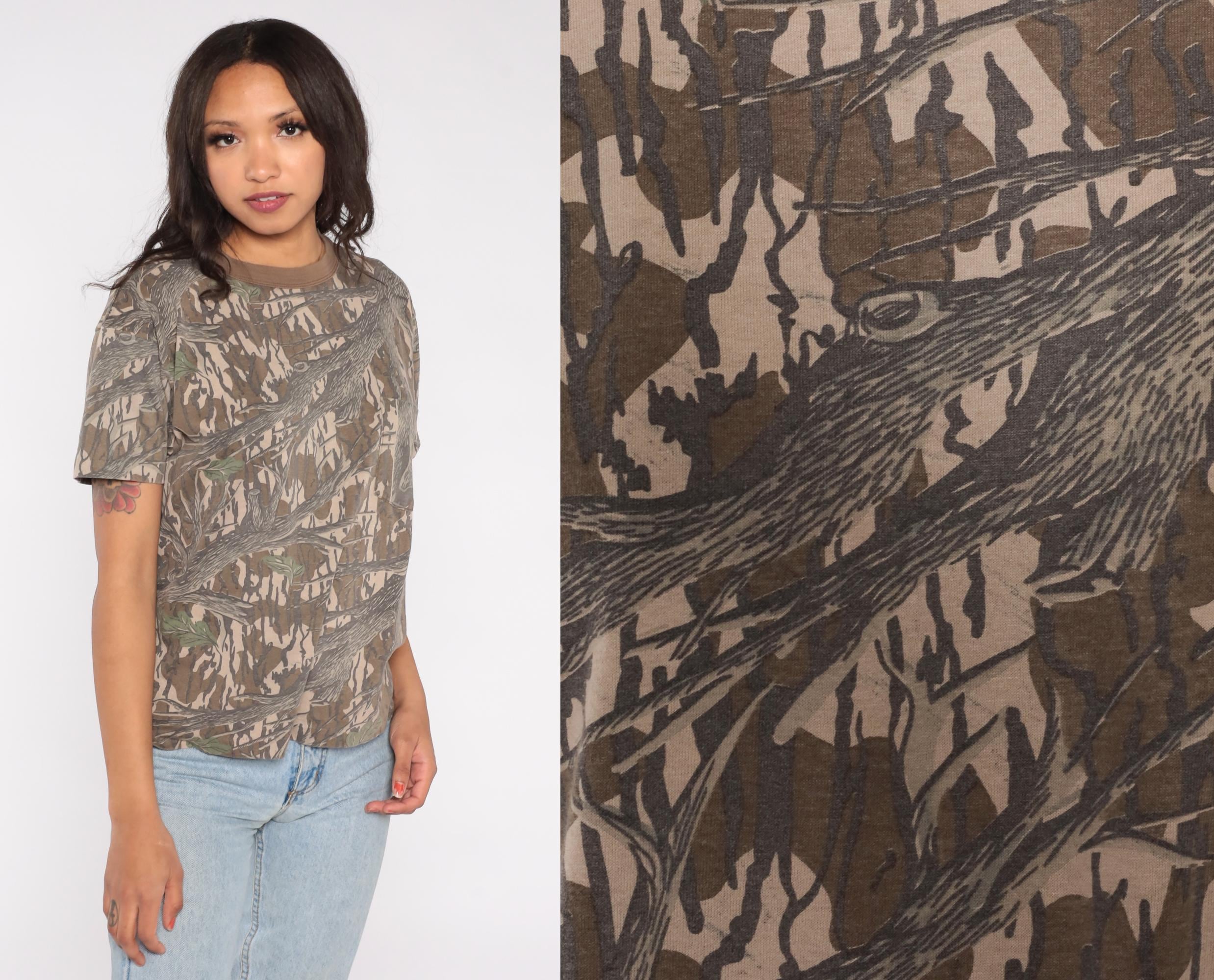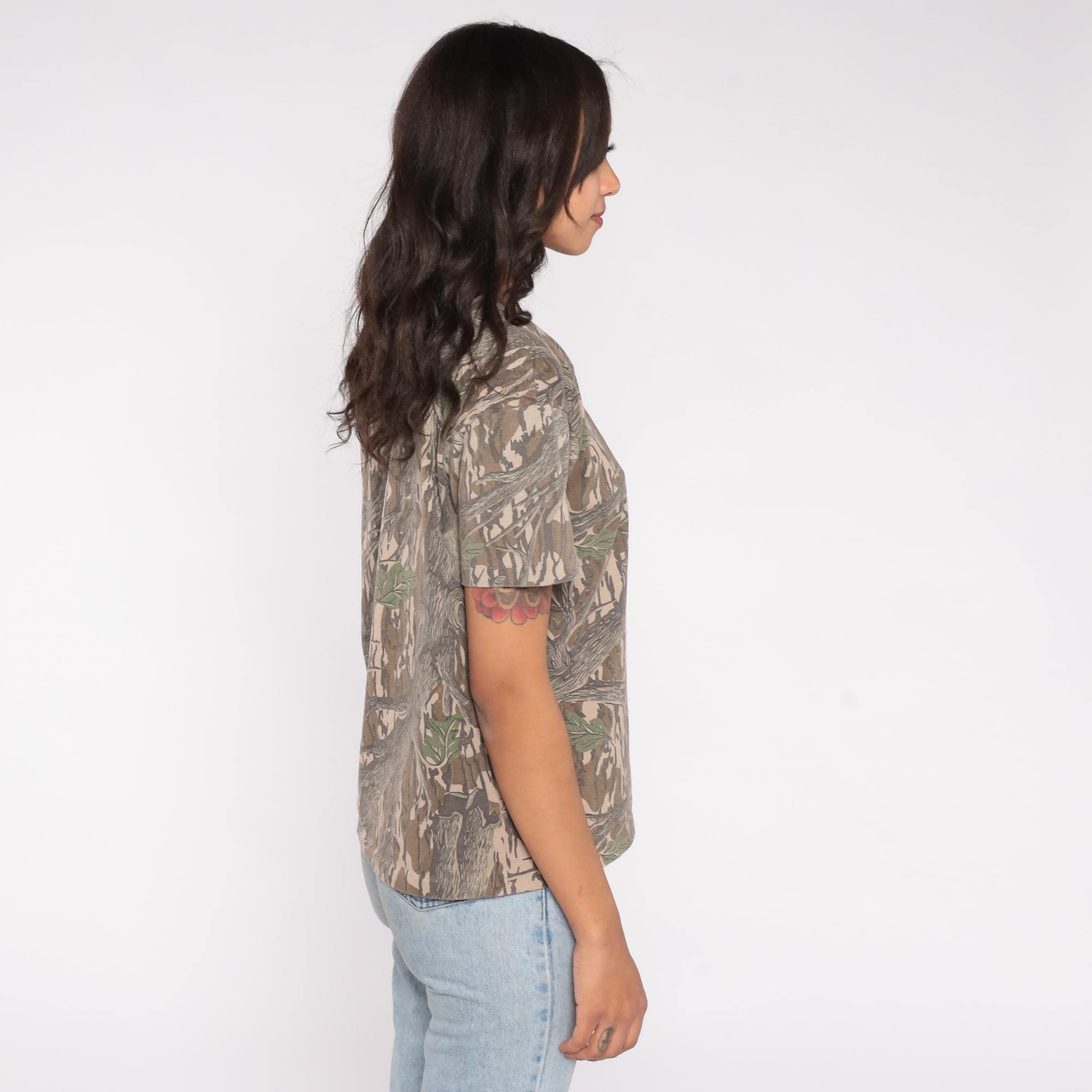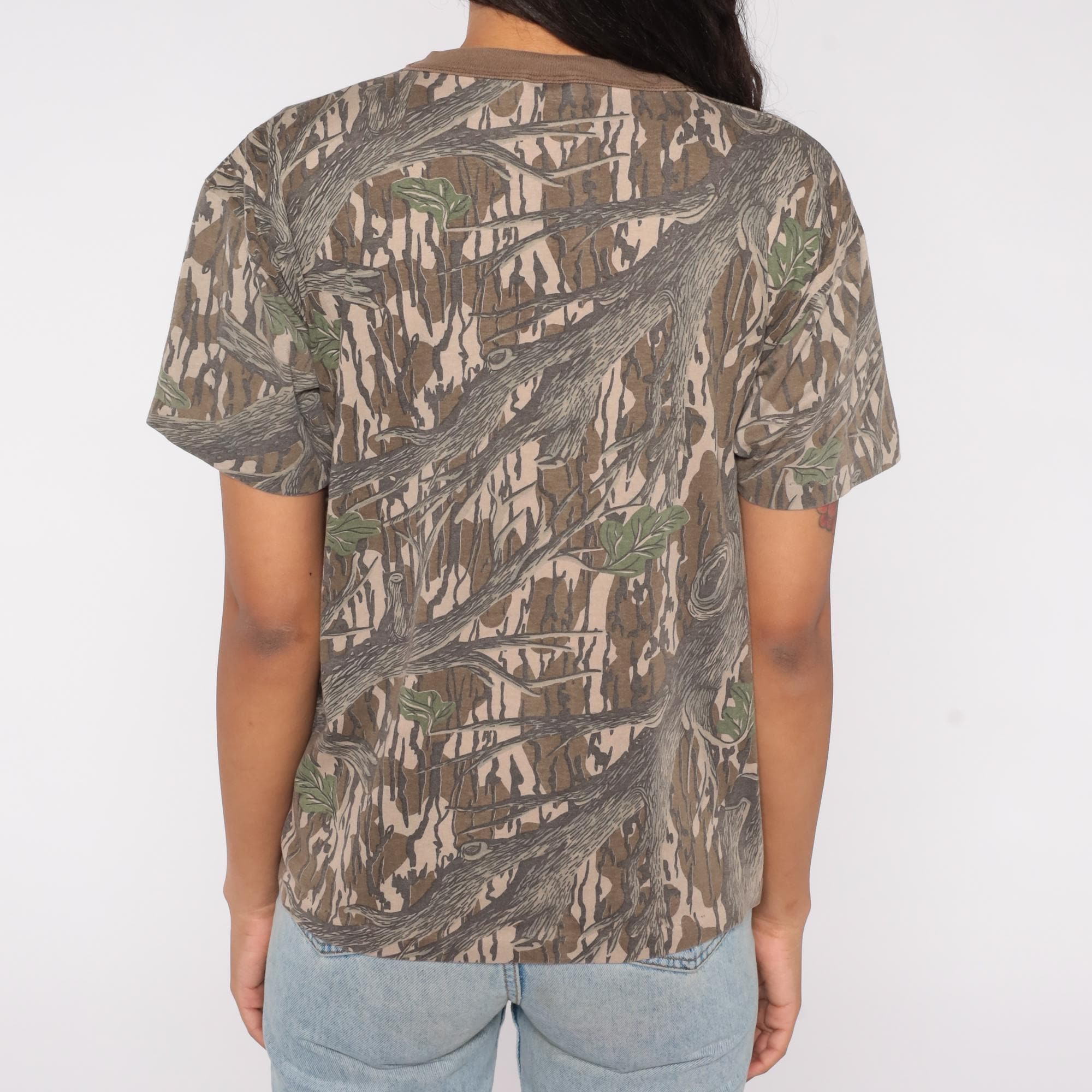Vintage 90s camo print t-shirt by Ace Sportswear featuring an allover Real Tree bark and foliage pattern in brown and green tones.