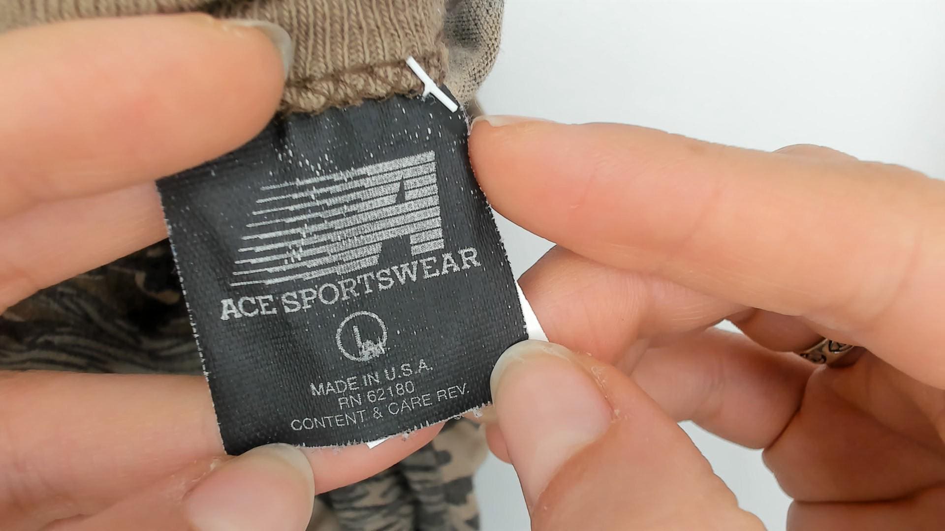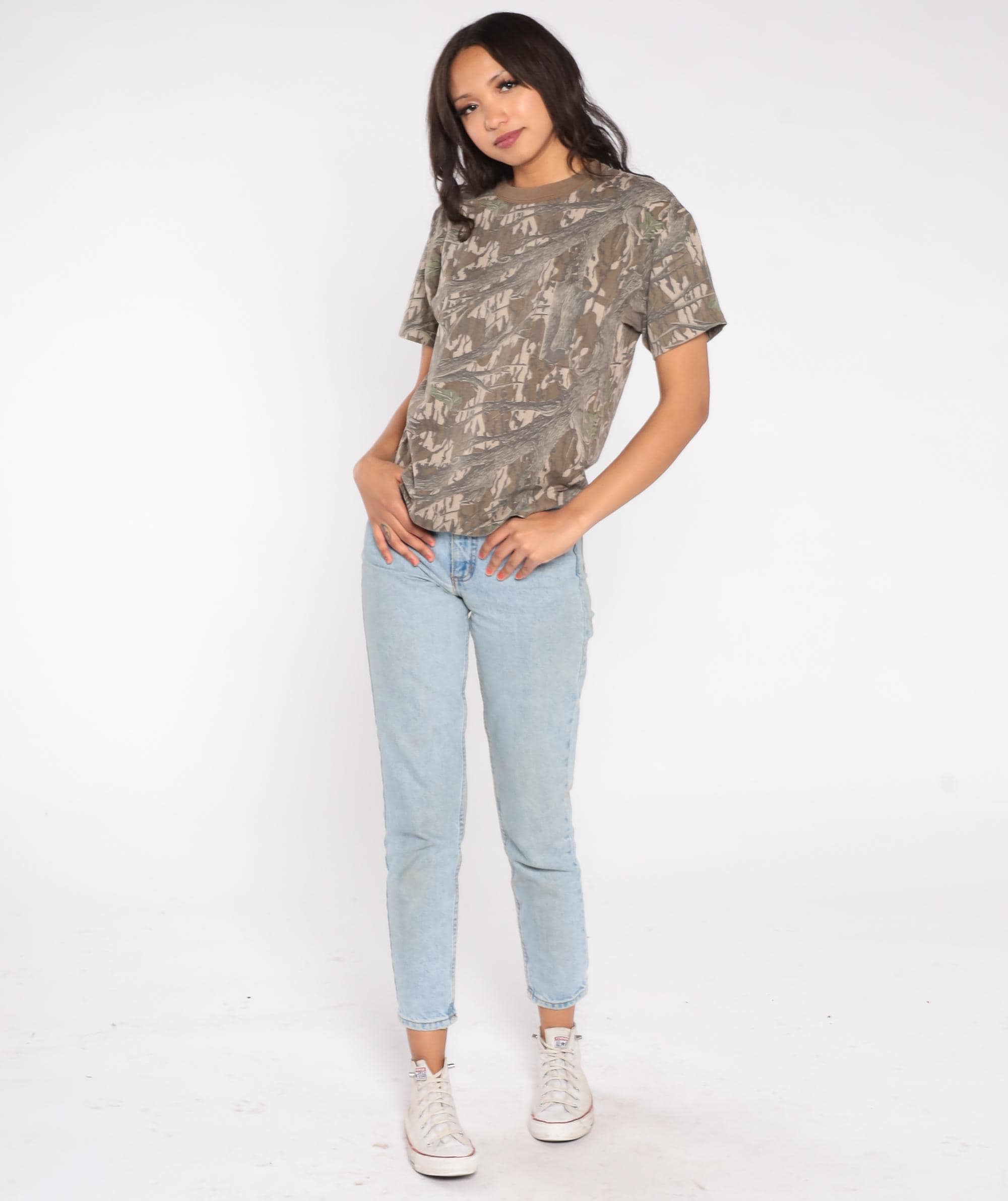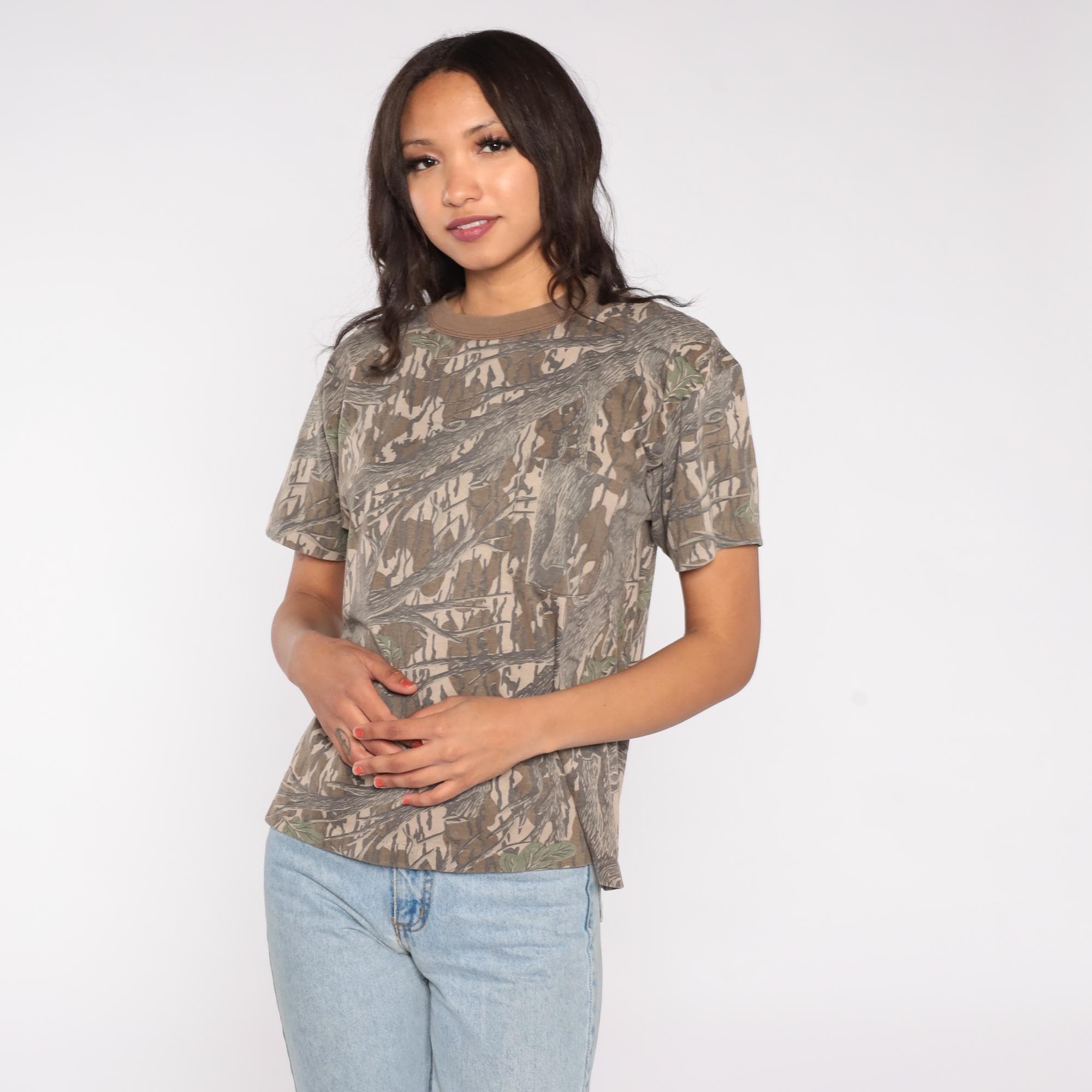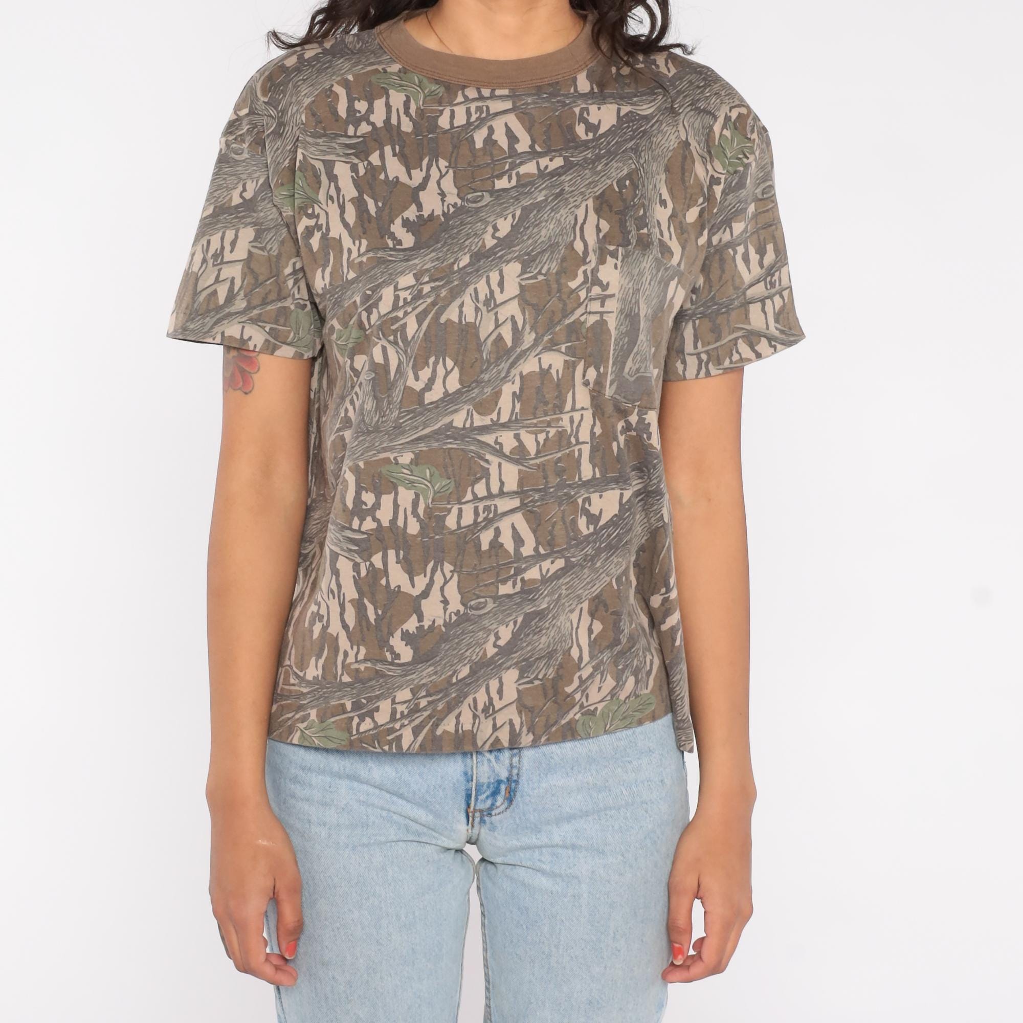 Vintage 90s camo print t-shirt by Ace Sportswear featuring an allover Real Tree bark and foliage pattern in brown and green tones.