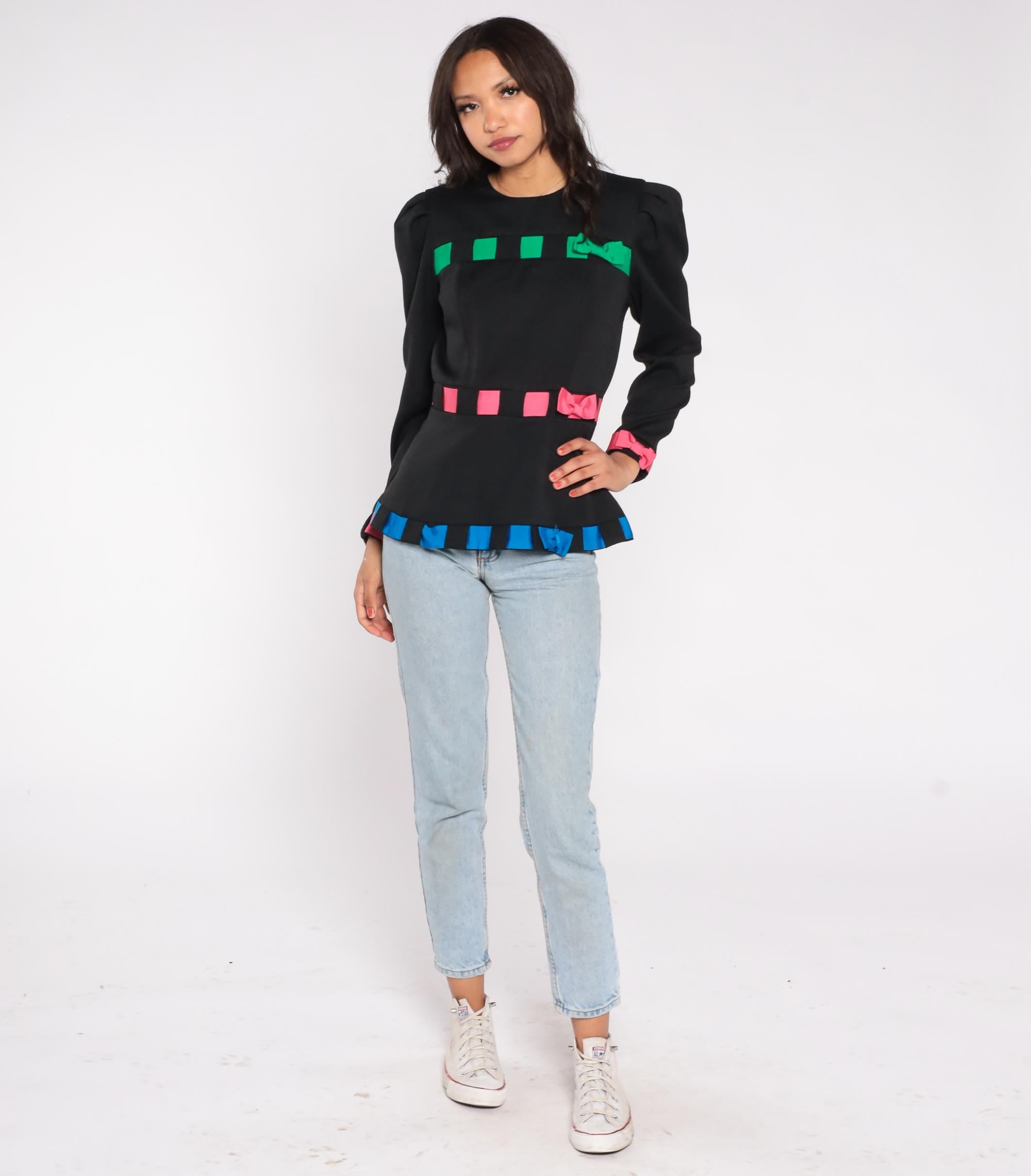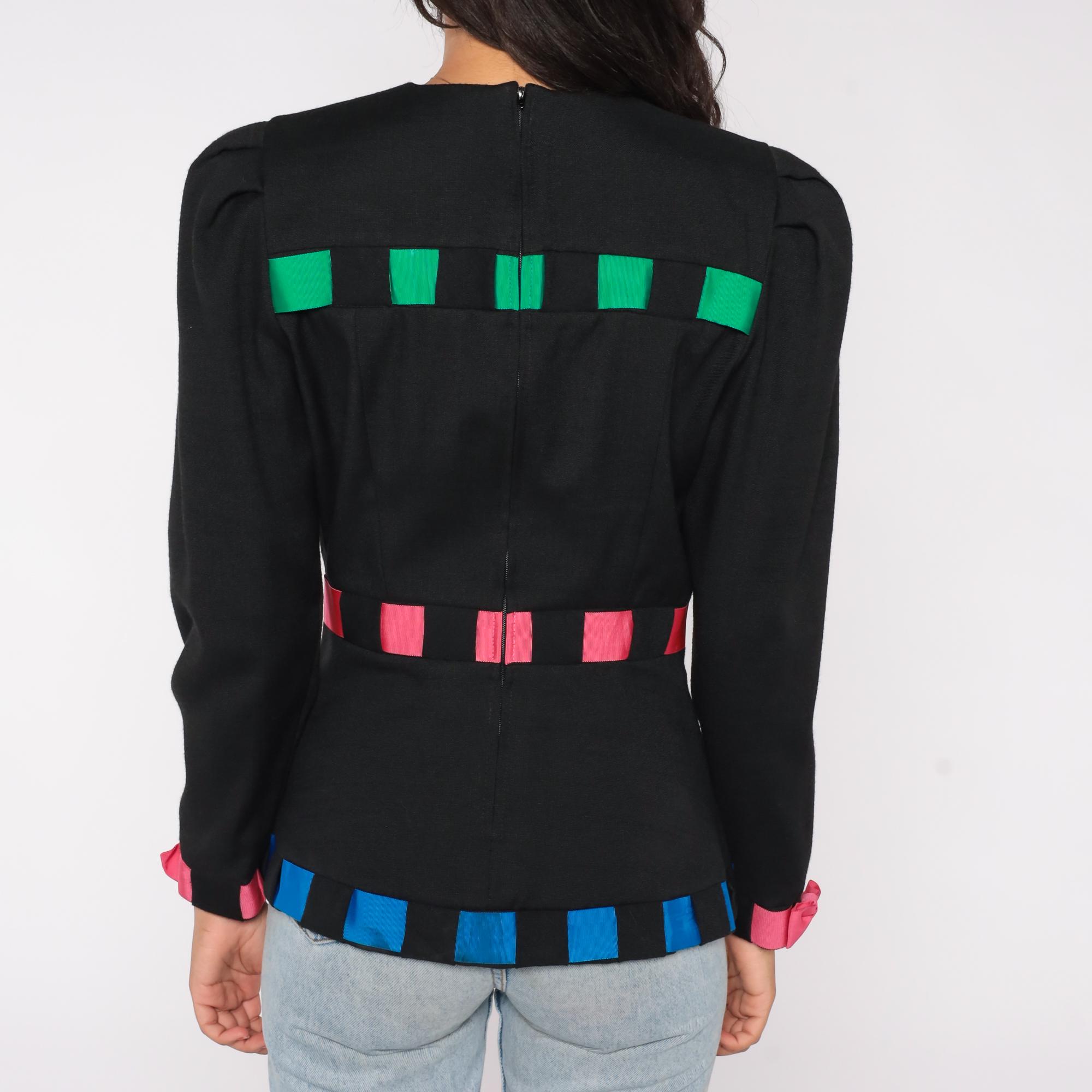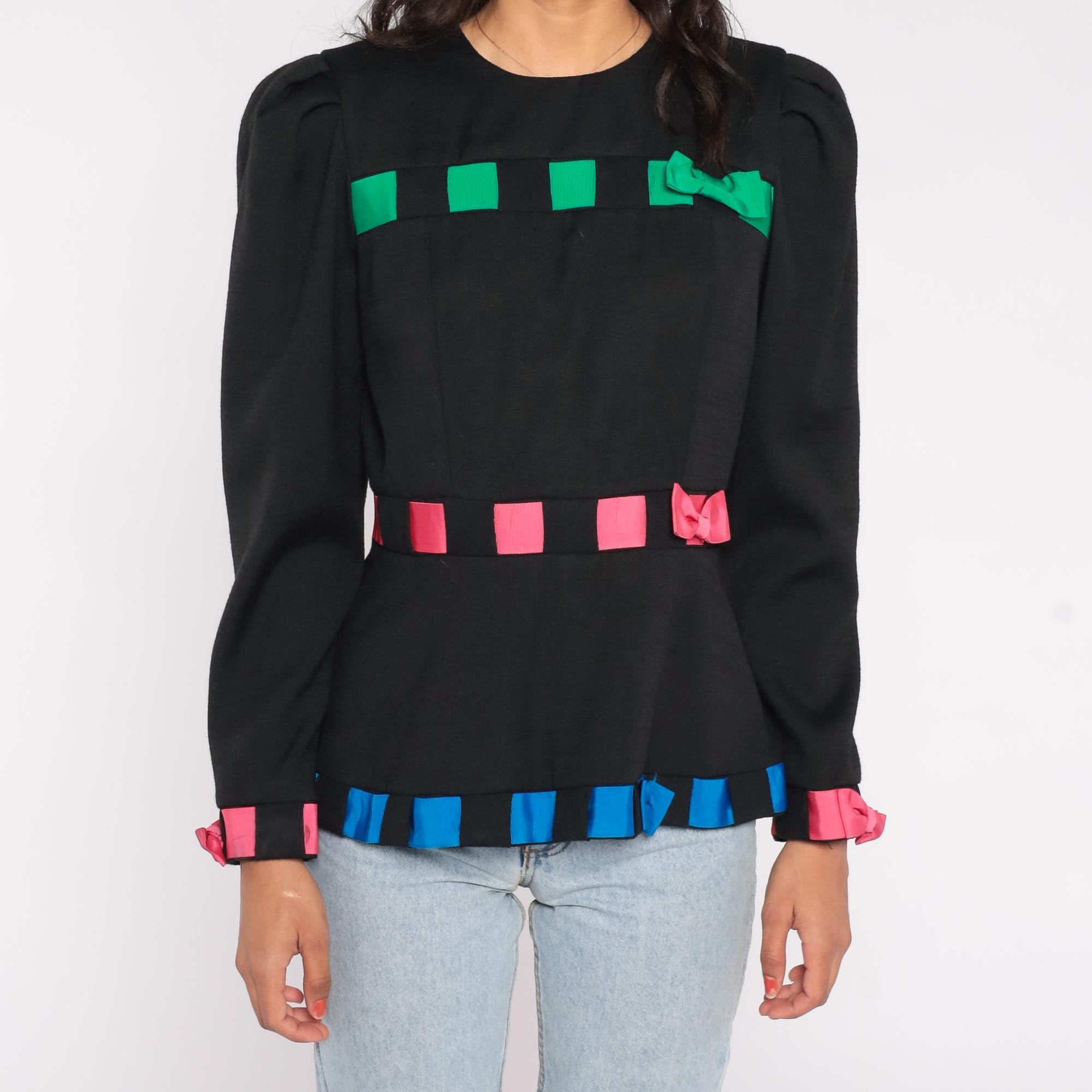 90s black blouse features colorful grosgrain ribbon panels with bow accents in green, pink, and blue. Includes puff shoulders, long sleeves, and a fitted waist that flares into a peplum hem. Rear zipper closure.