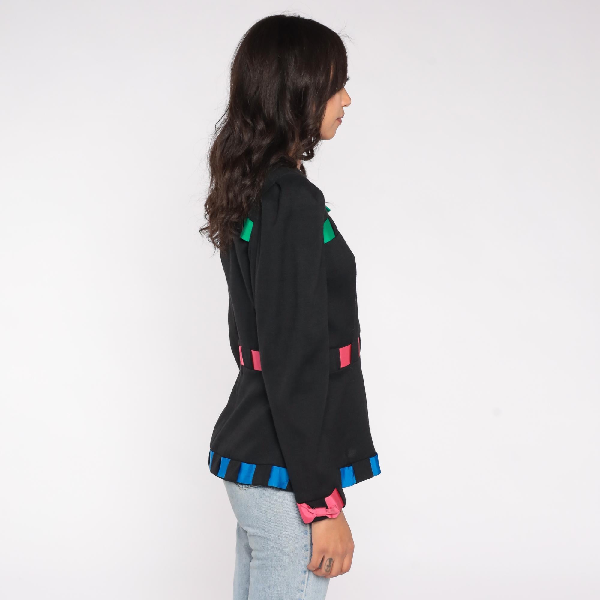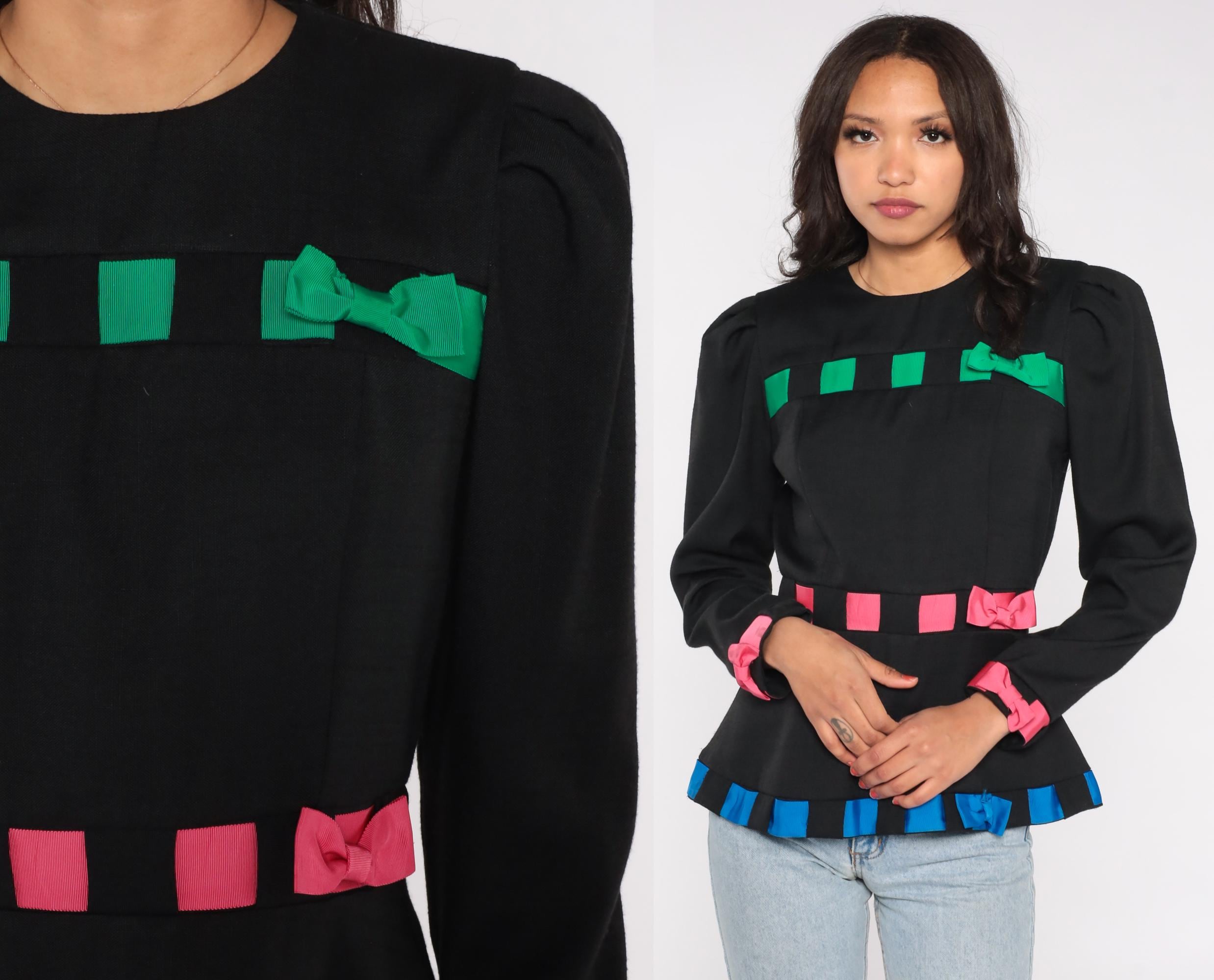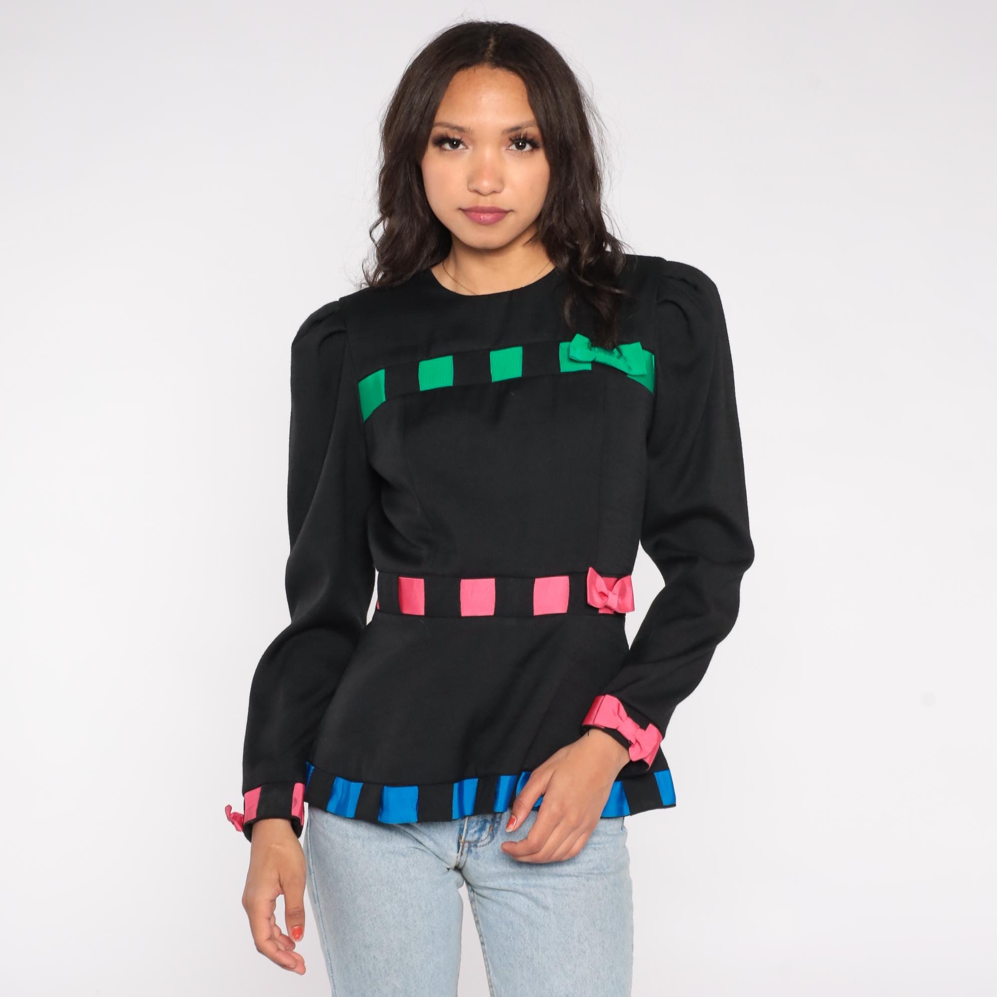 90s black blouse features colorful grosgrain ribbon panels with bow accents in green, pink, and blue. Includes puff shoulders, long sleeves, and a fitted waist that flares into a peplum hem. Rear zipper closure.
