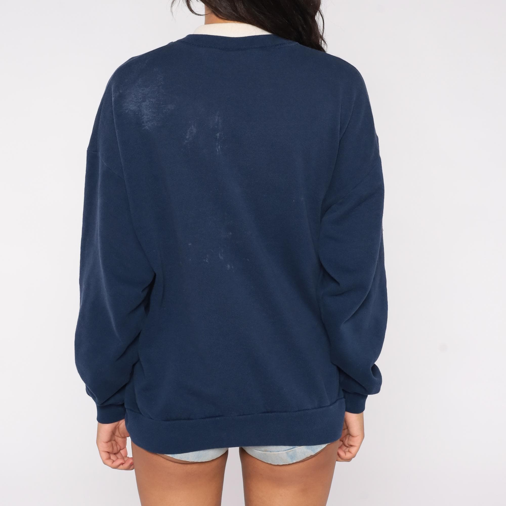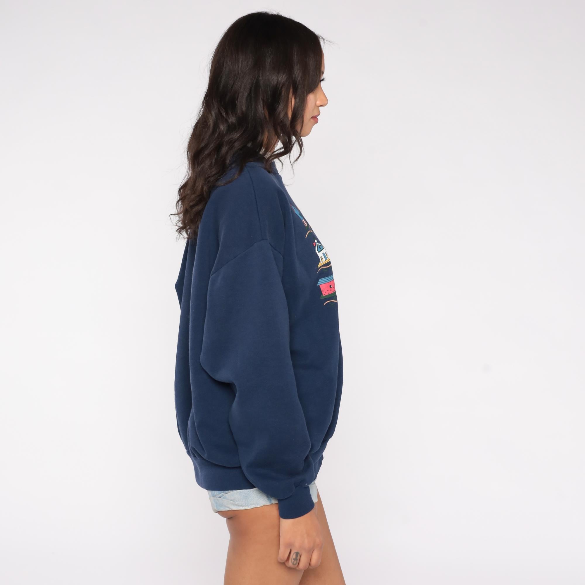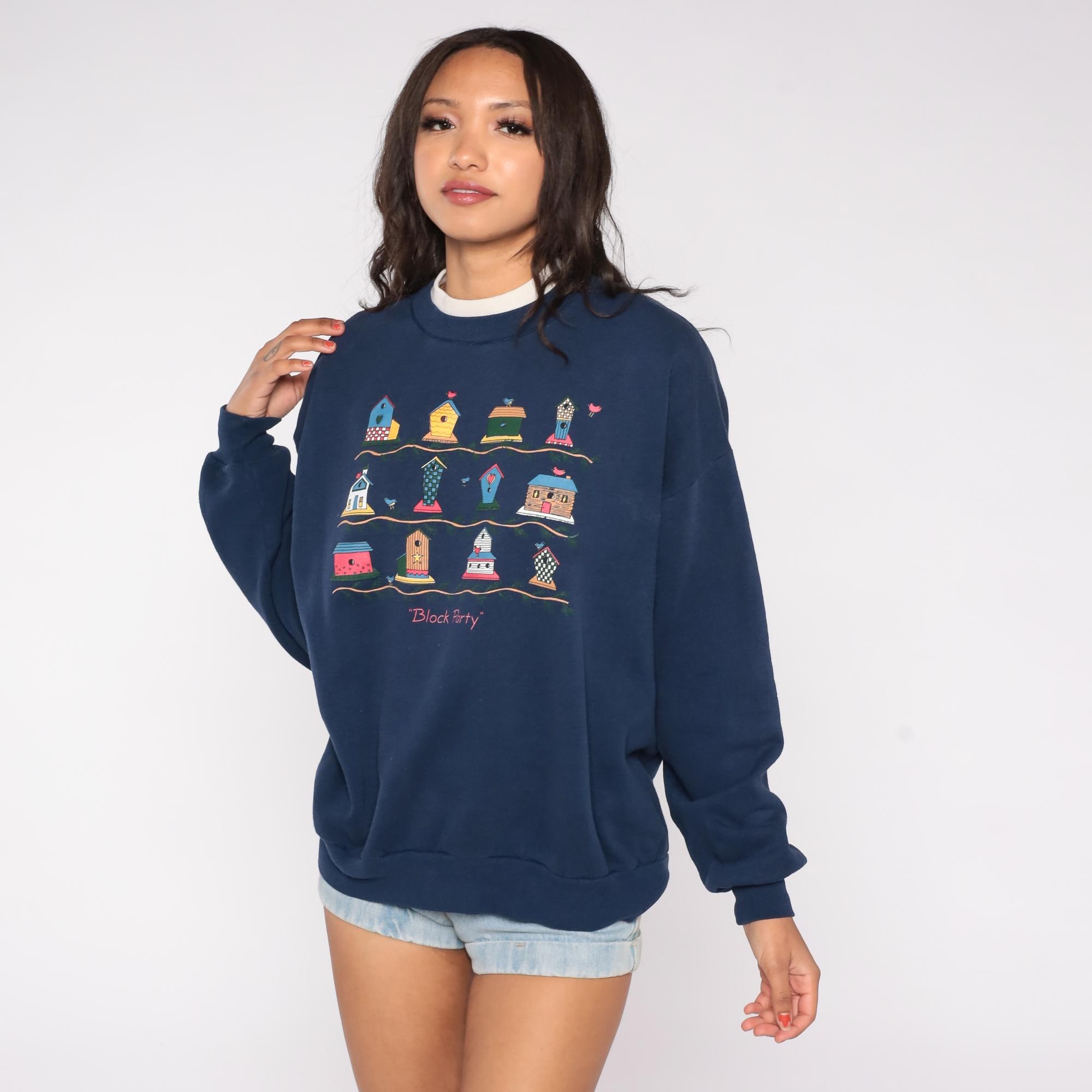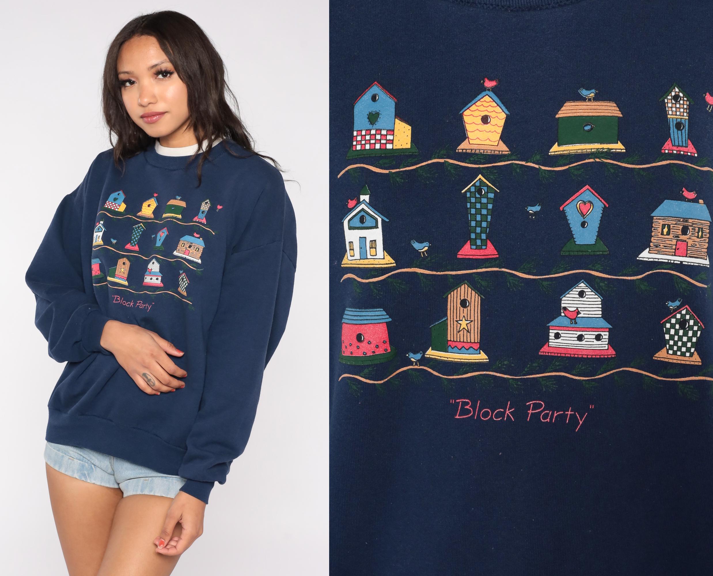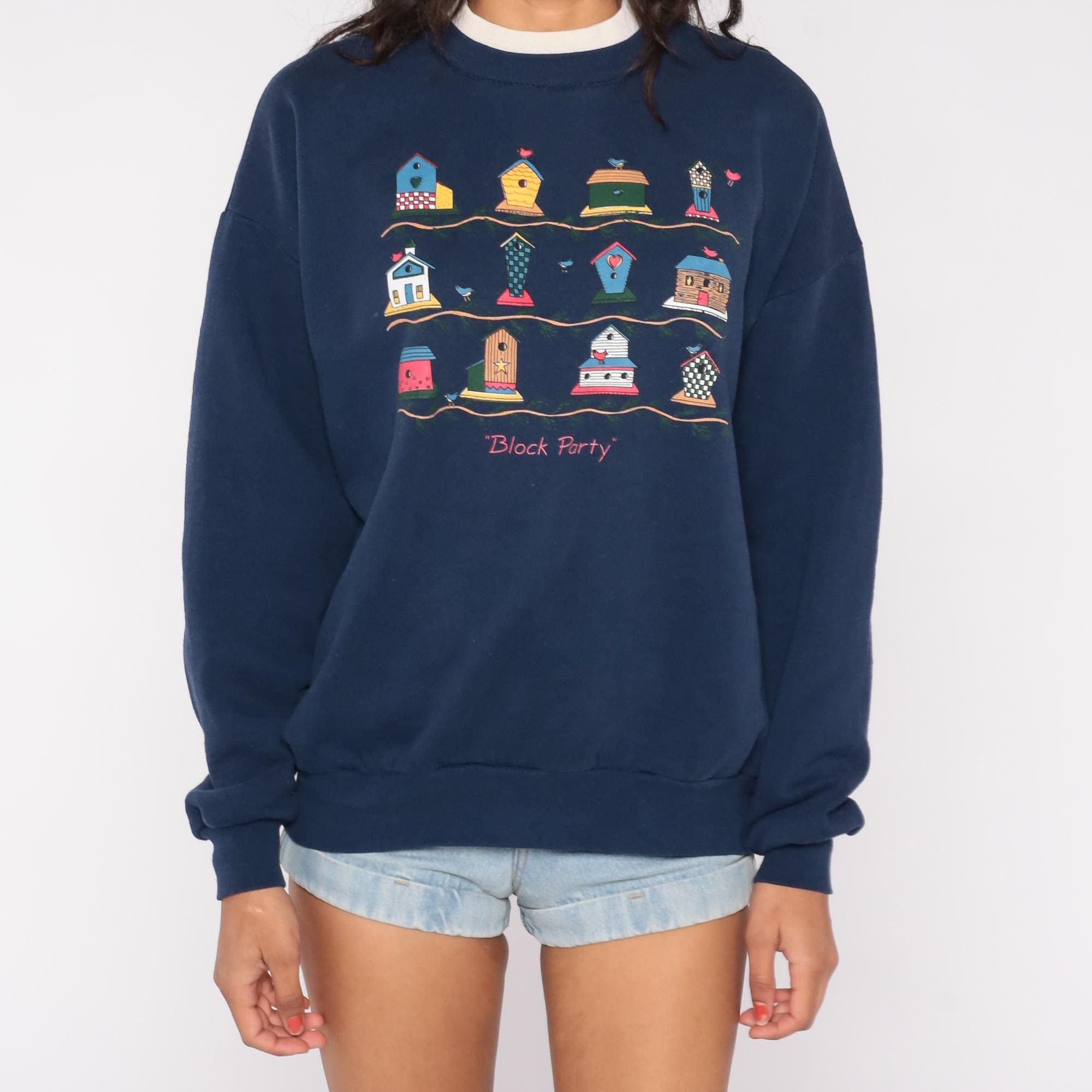 90s Gopher Sport sweatshirt features a charming "Block Party" birdhouse graphic showcasing colorful bird houses arranged in three rows with tiny blue and red birds perched atop. The navy blue background highlights the vibrant multi-color illustration of yellow, blue, red, green, and white birdhouses in various whimsical styles.