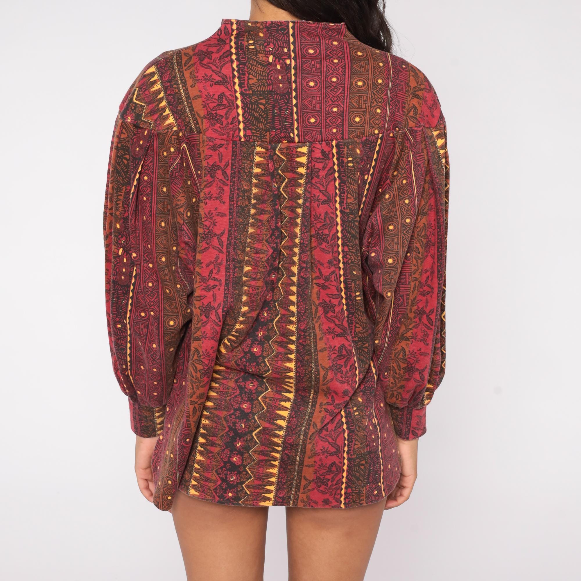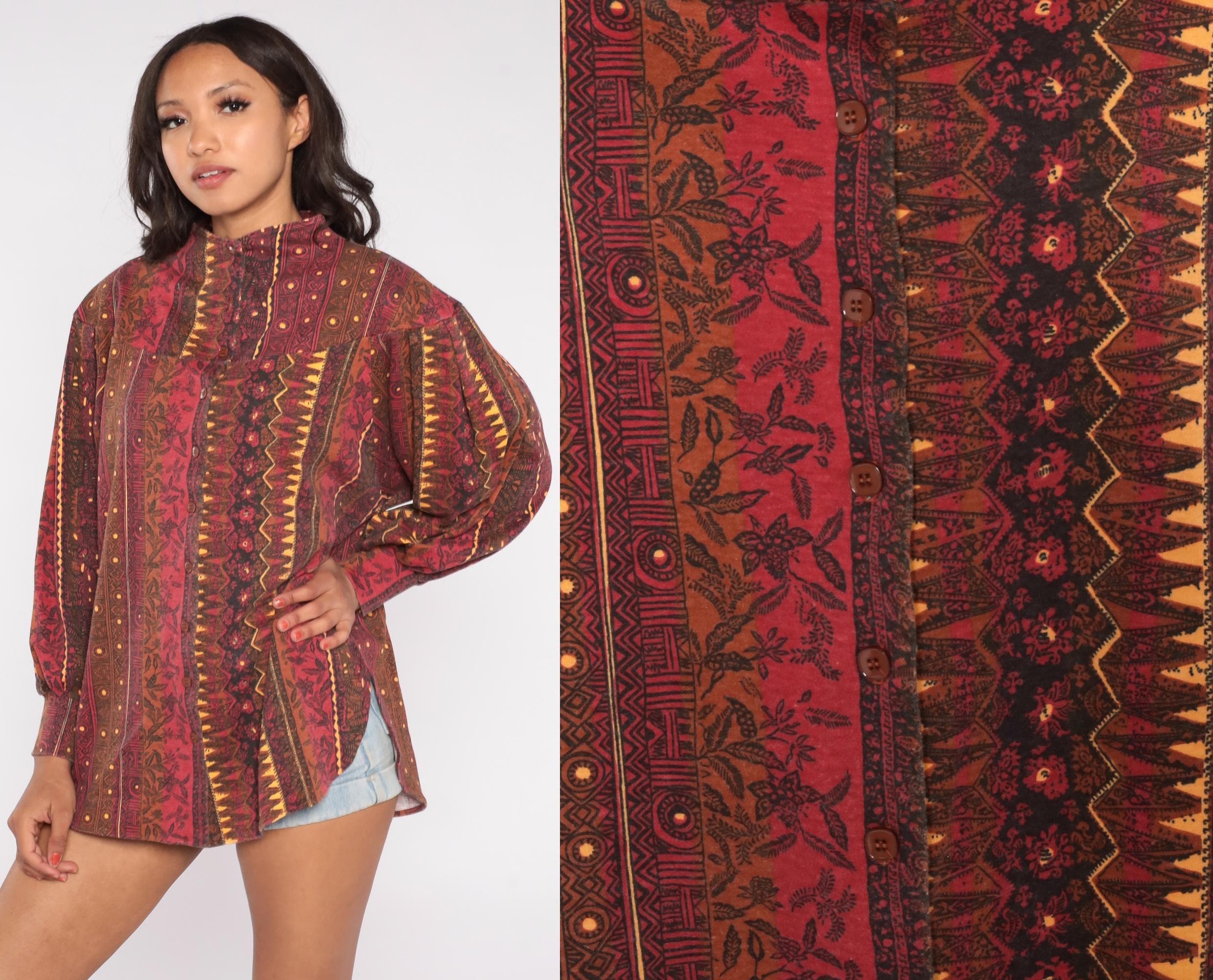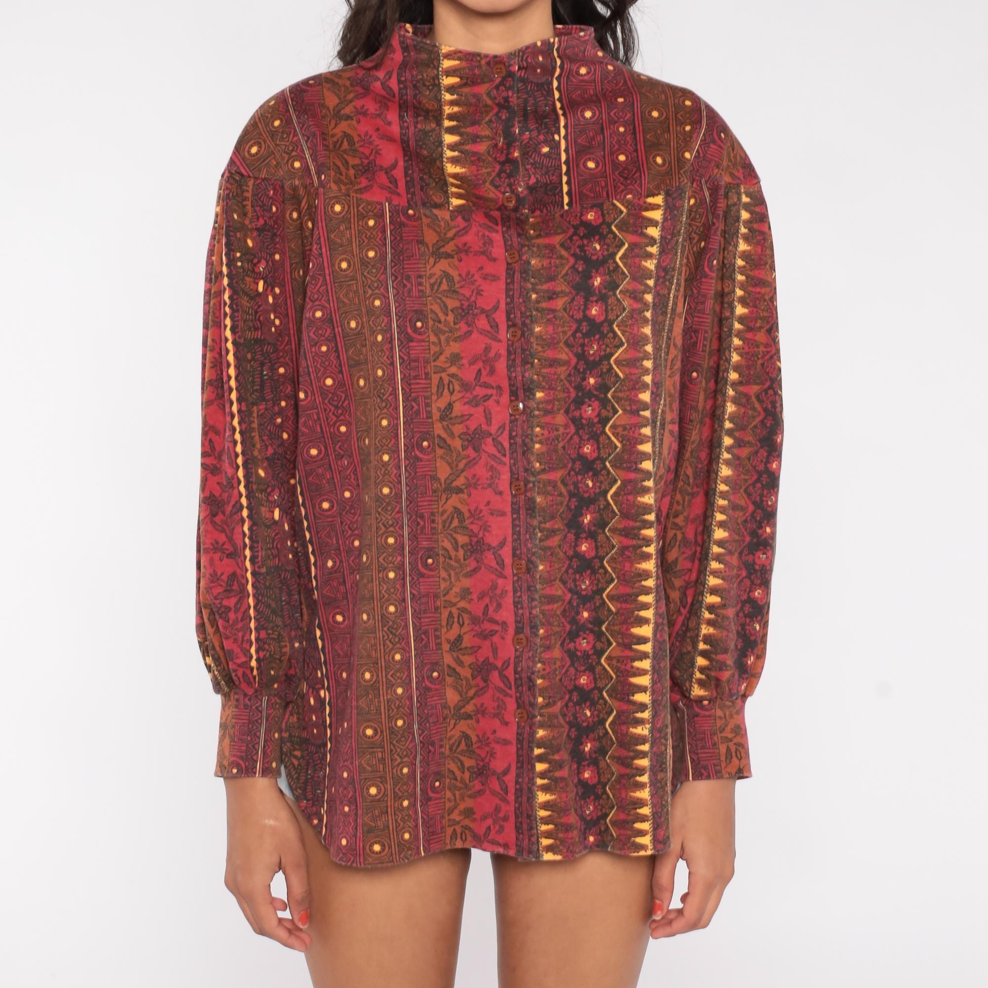 90s Mike & Me by Moon Craft blouse features a stunning ethnic-inspired print in rich burgundy, rust red, and brown tones with metallic gold accents. The vertical striped pattern showcases intricate geometric designs, floral motifs, and tribal elements throughout. Mandarin collar with front button closure and relaxed silhouette.