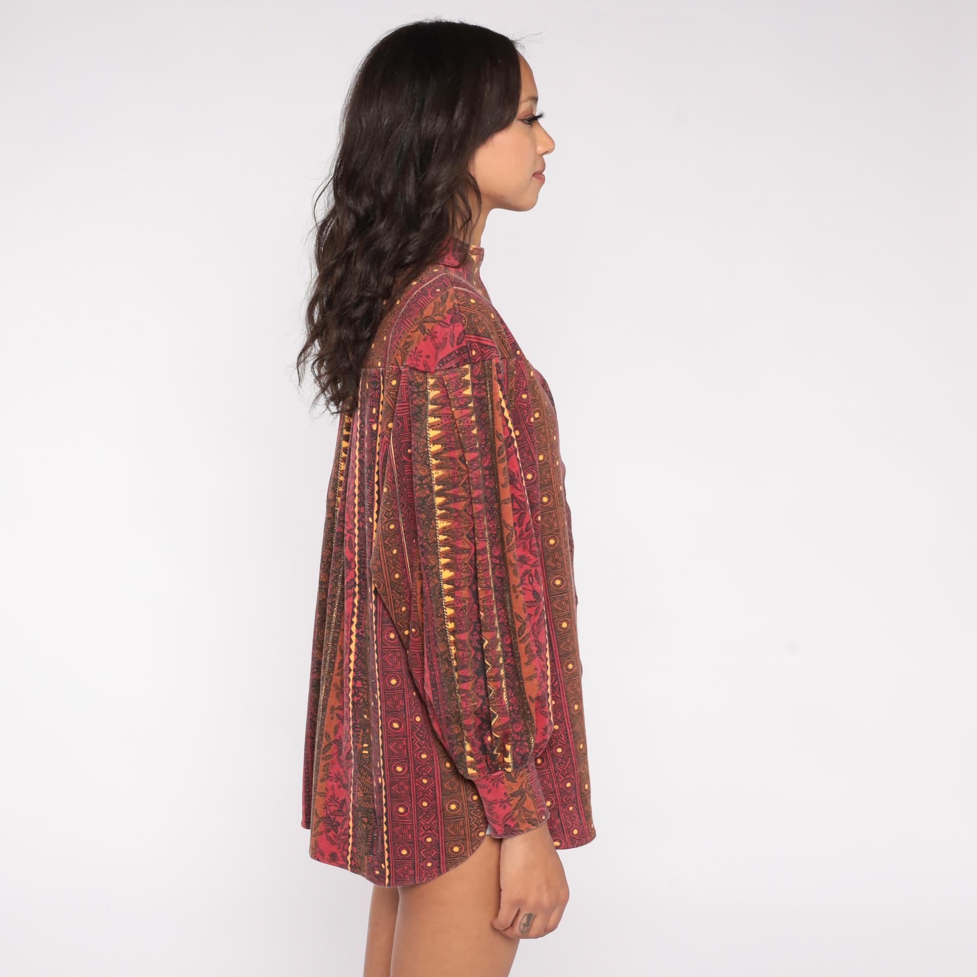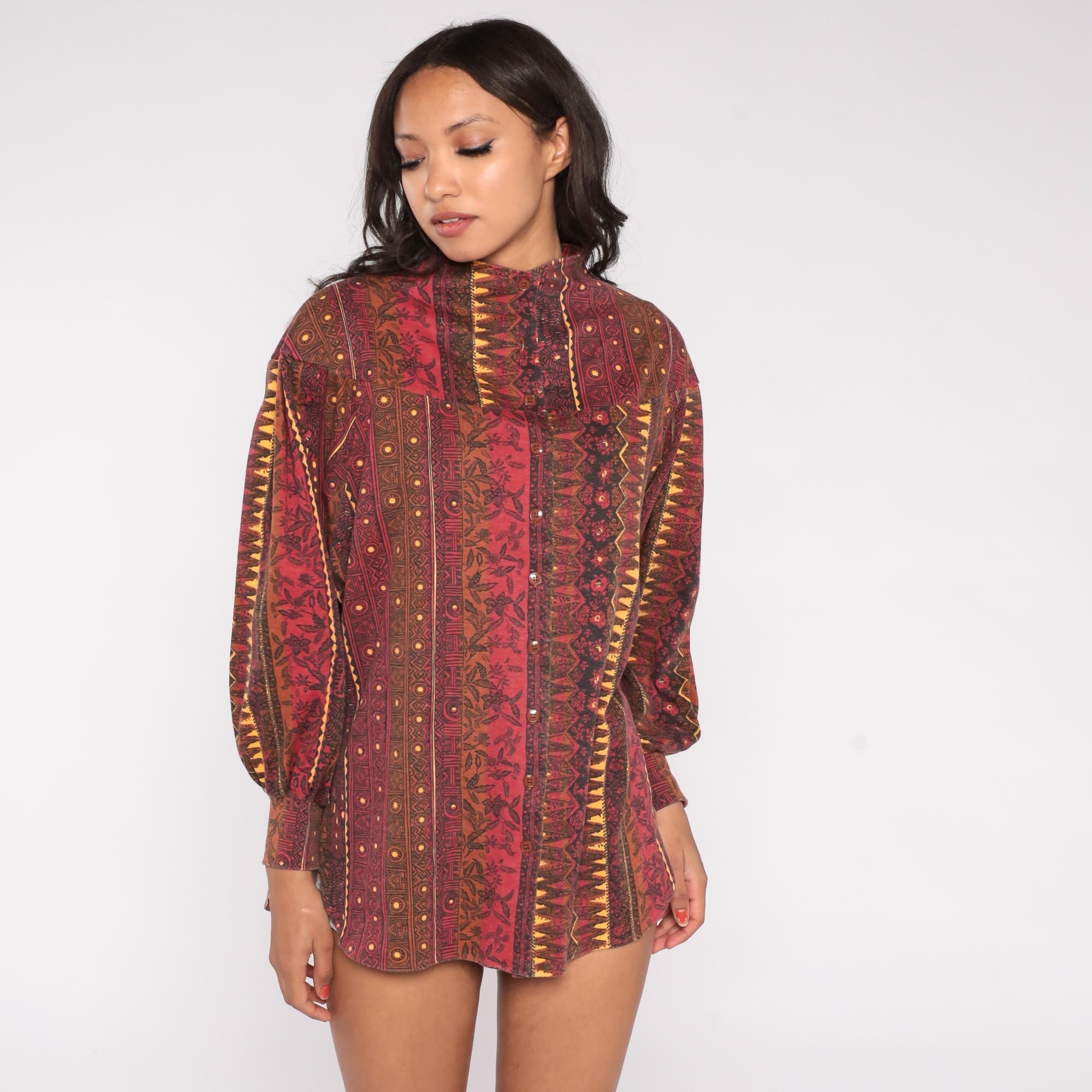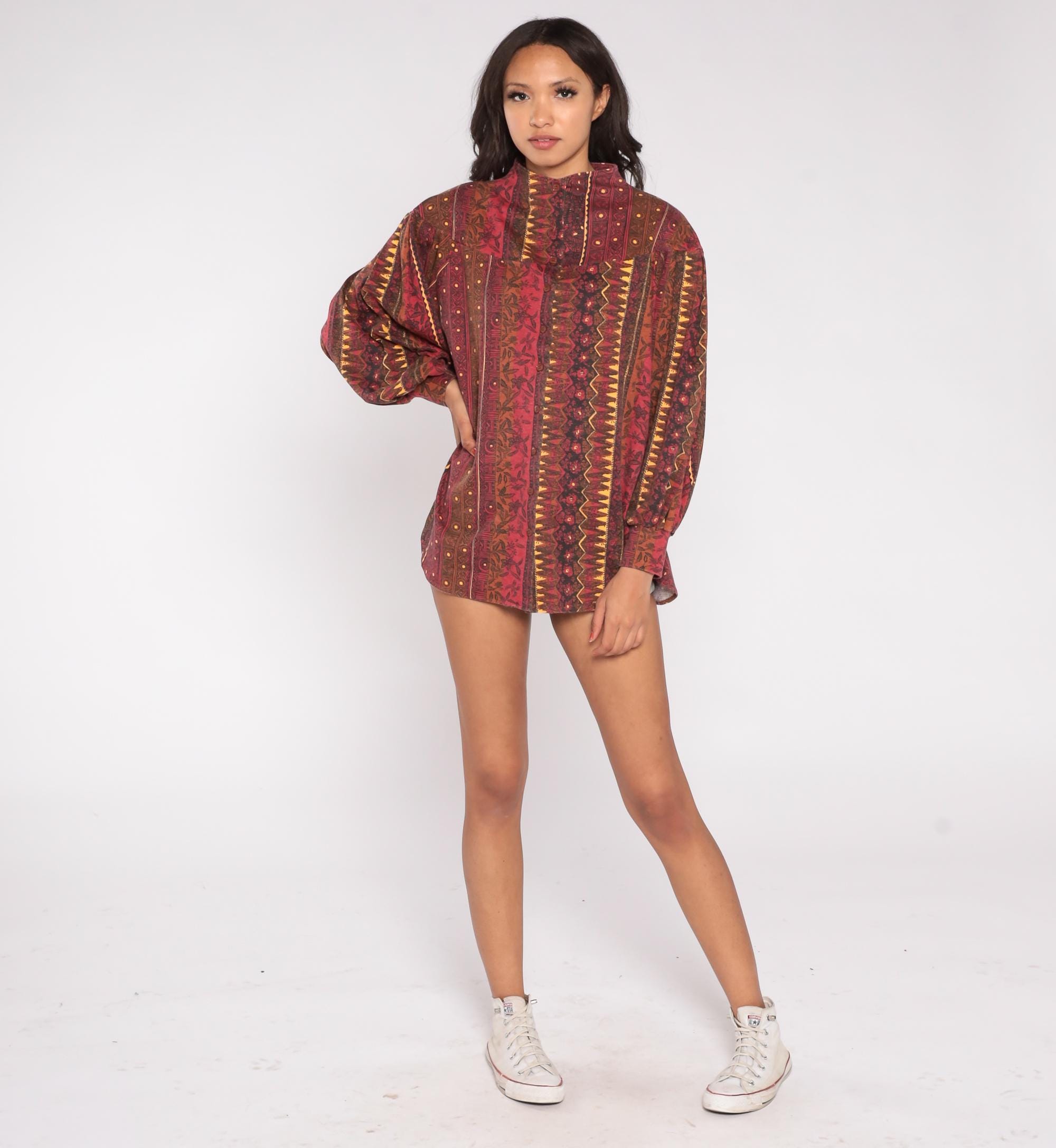 90s Mike & Me by Moon Craft blouse features a stunning ethnic-inspired print in rich burgundy, rust red, and brown tones with metallic gold accents. The vertical striped pattern showcases intricate geometric designs, floral motifs, and tribal elements throughout. Mandarin collar with front button closure and relaxed silhouette.