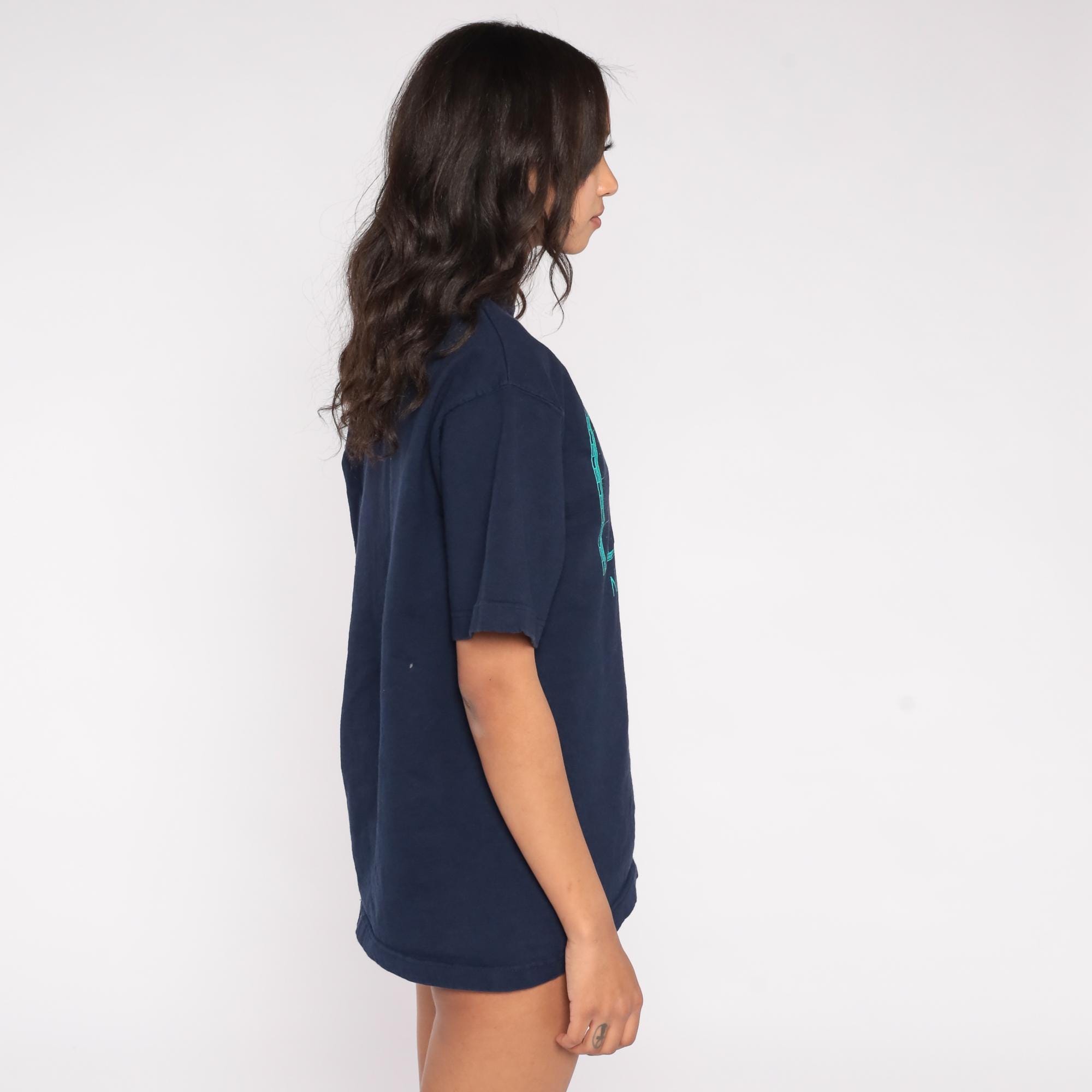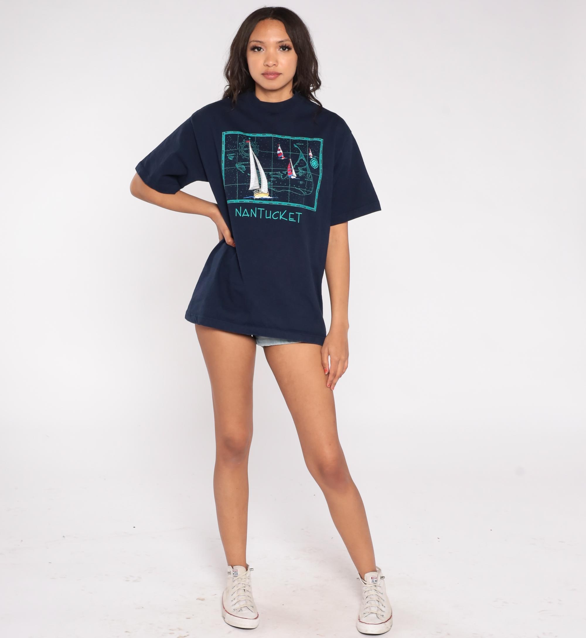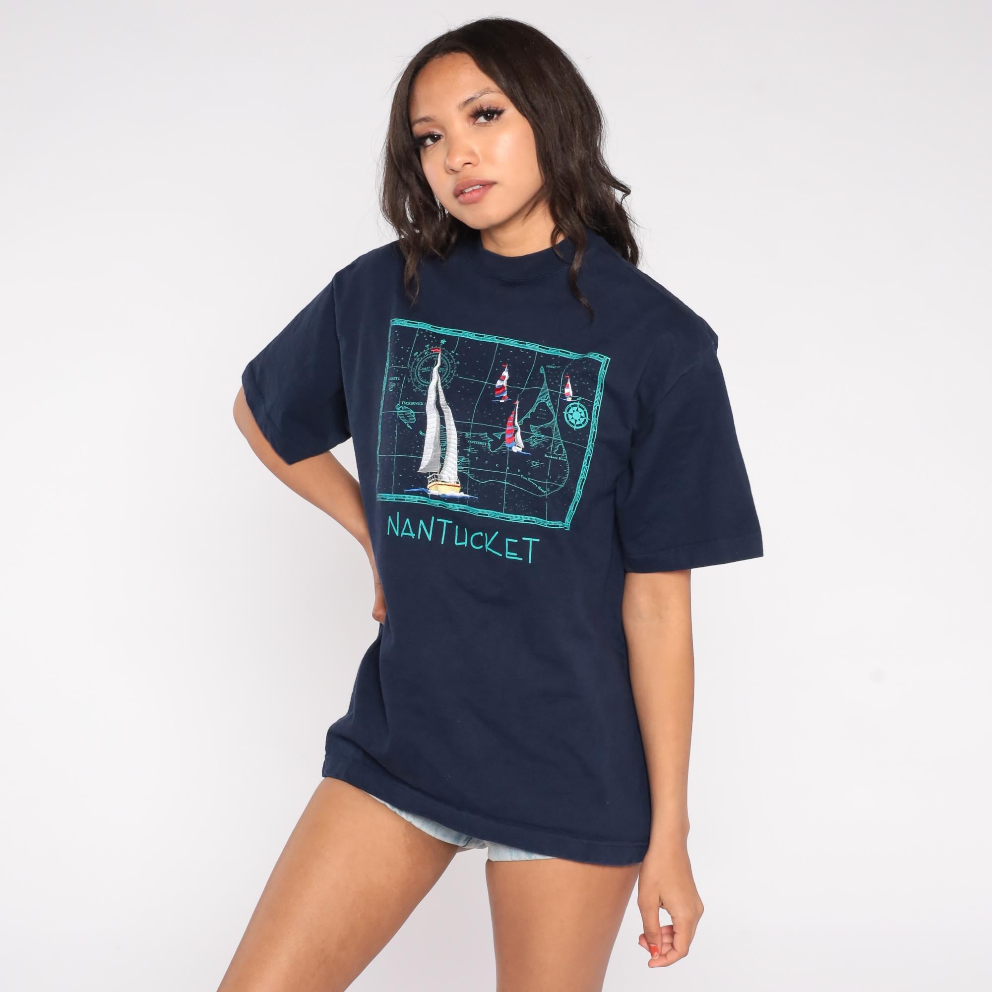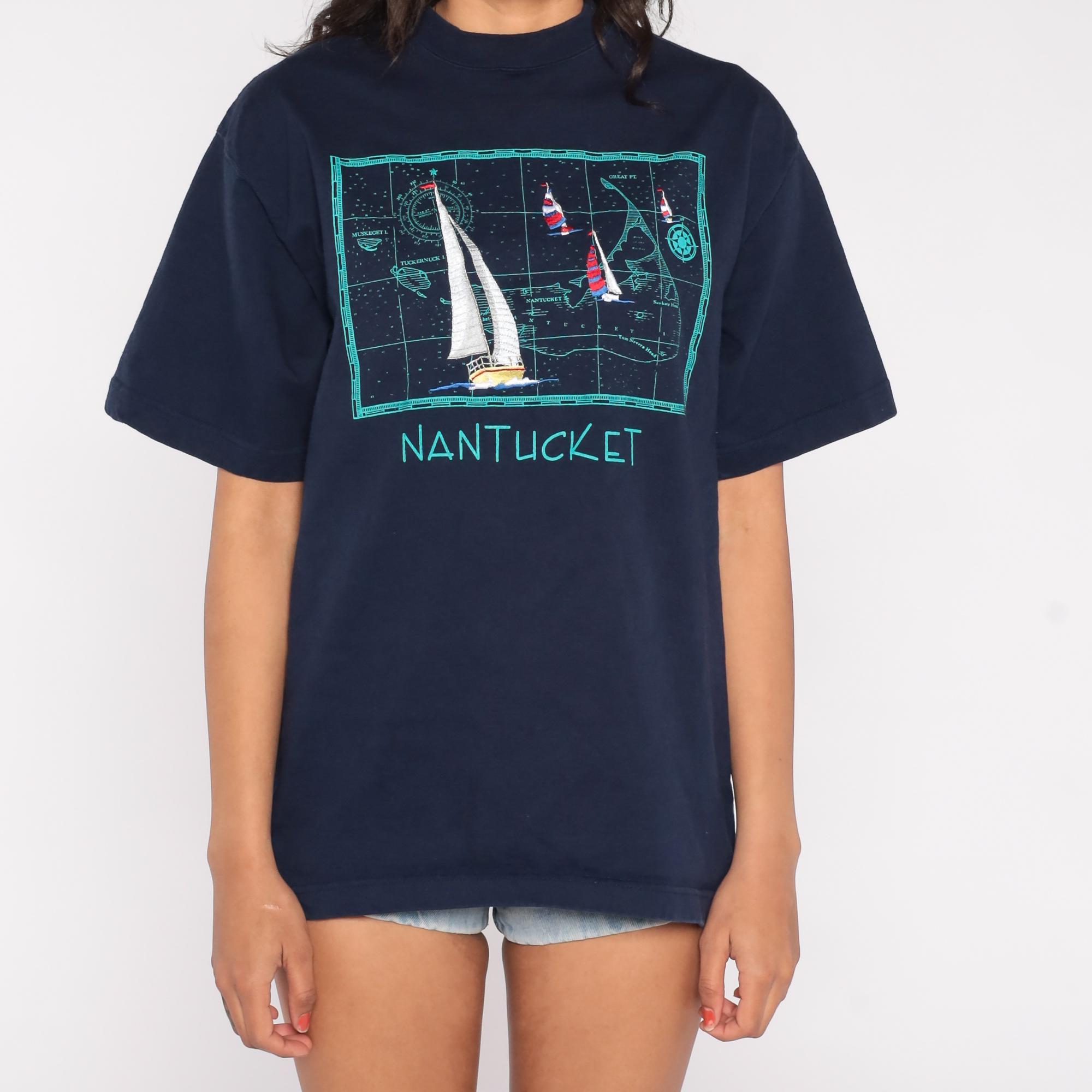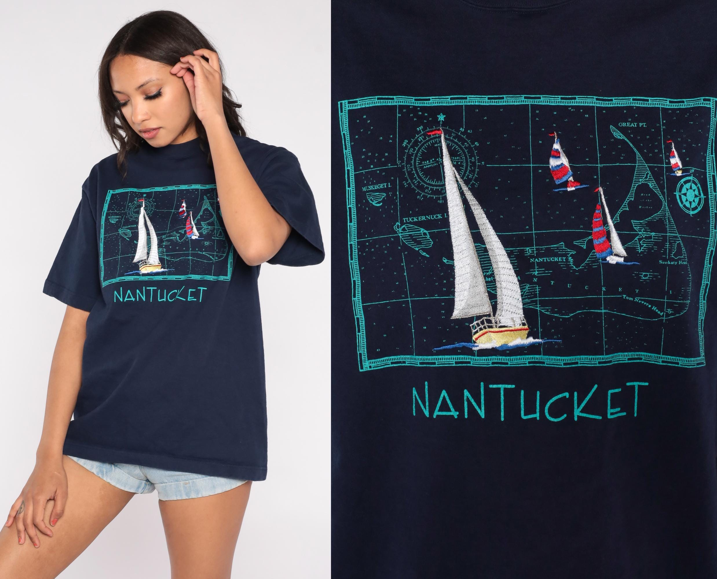 90s Singal Sports t-shirt features a detailed nautical map of Nantucket with embroidered sailboats in white and red/blue accents. The design showcases surrounding islands including Tuckernuck and Muskeget against a deep navy blue background with teal chart gridlines. "NANTUCKET" is embroidered below in matching teal.