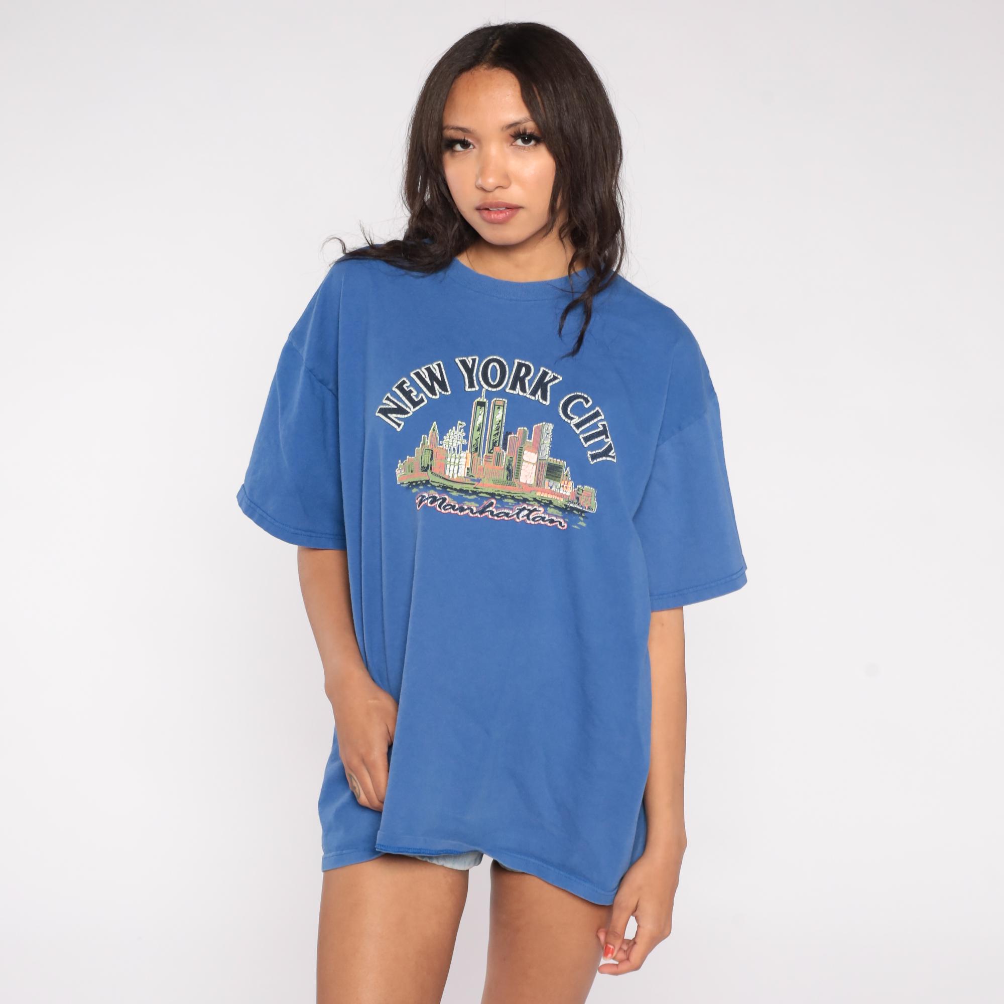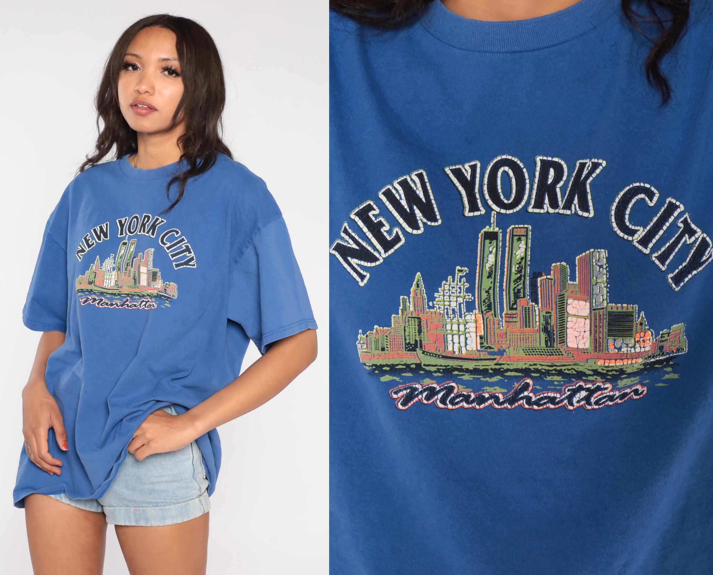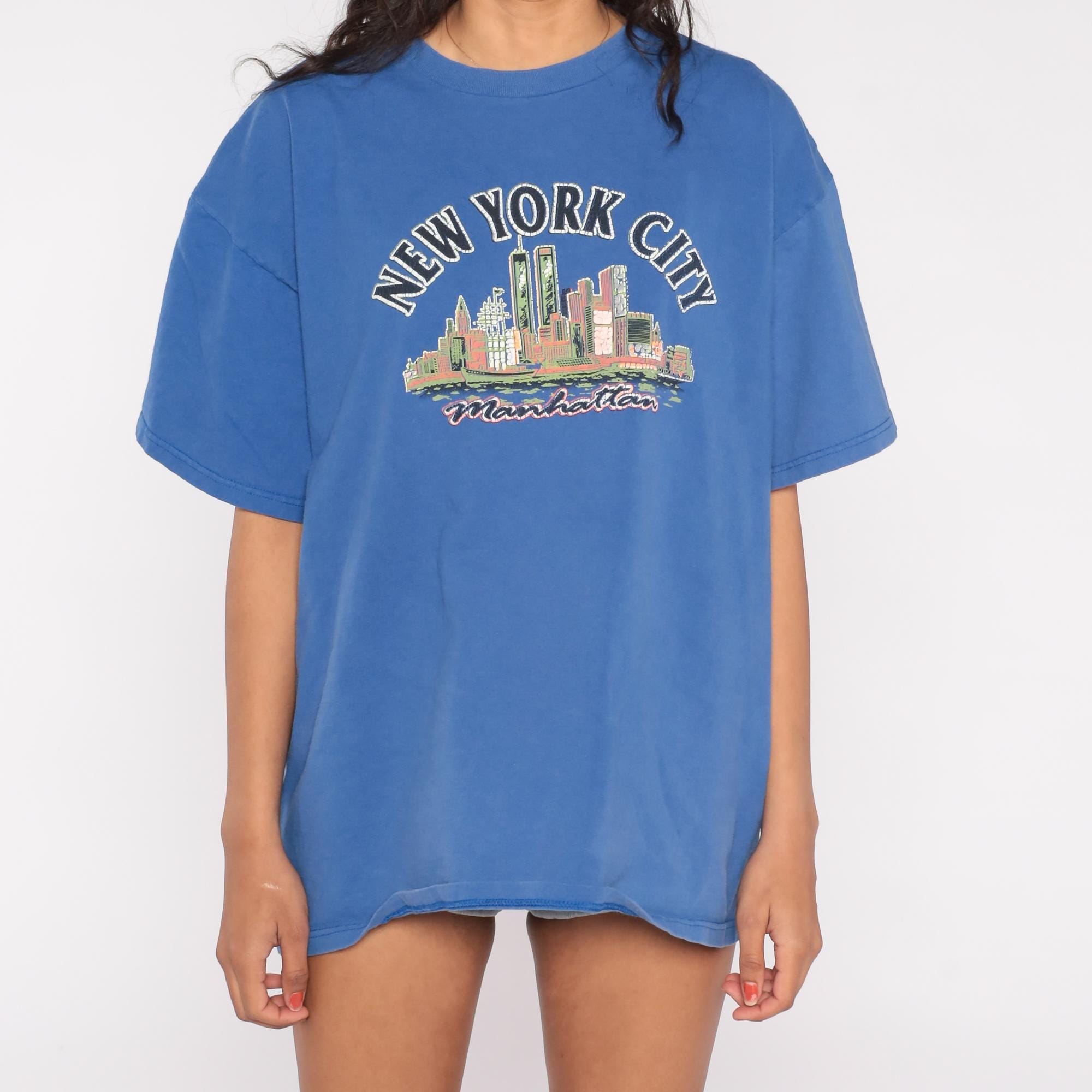 90s Fruit of the Loom t-shirt features a historical New York City skyline with the iconic Twin Towers prominently displayed in the World Trade Center complex. The royal blue cotton shirt showcases a colorful screen-printed graphic of the pre-2001 Manhattan skyline with "NEW YORK CITY" arched above and "Manhattan" script below.