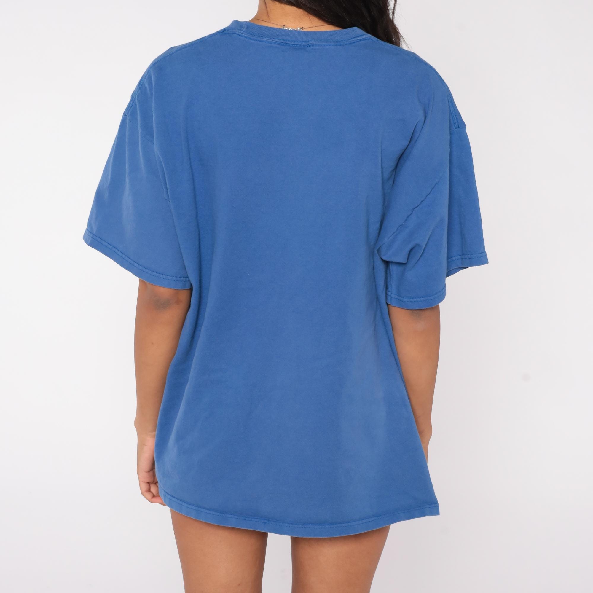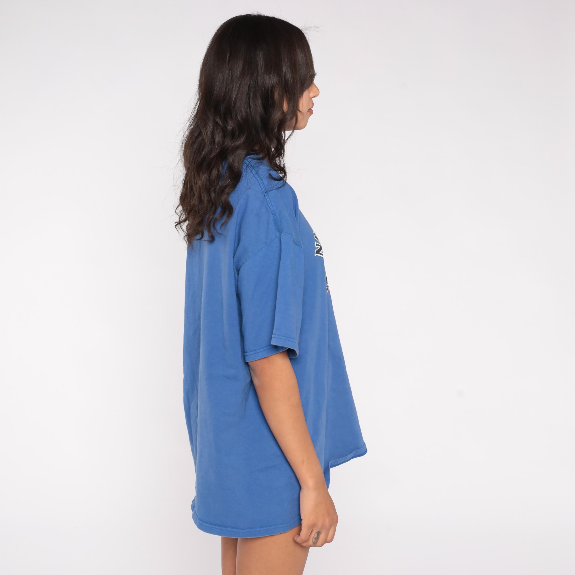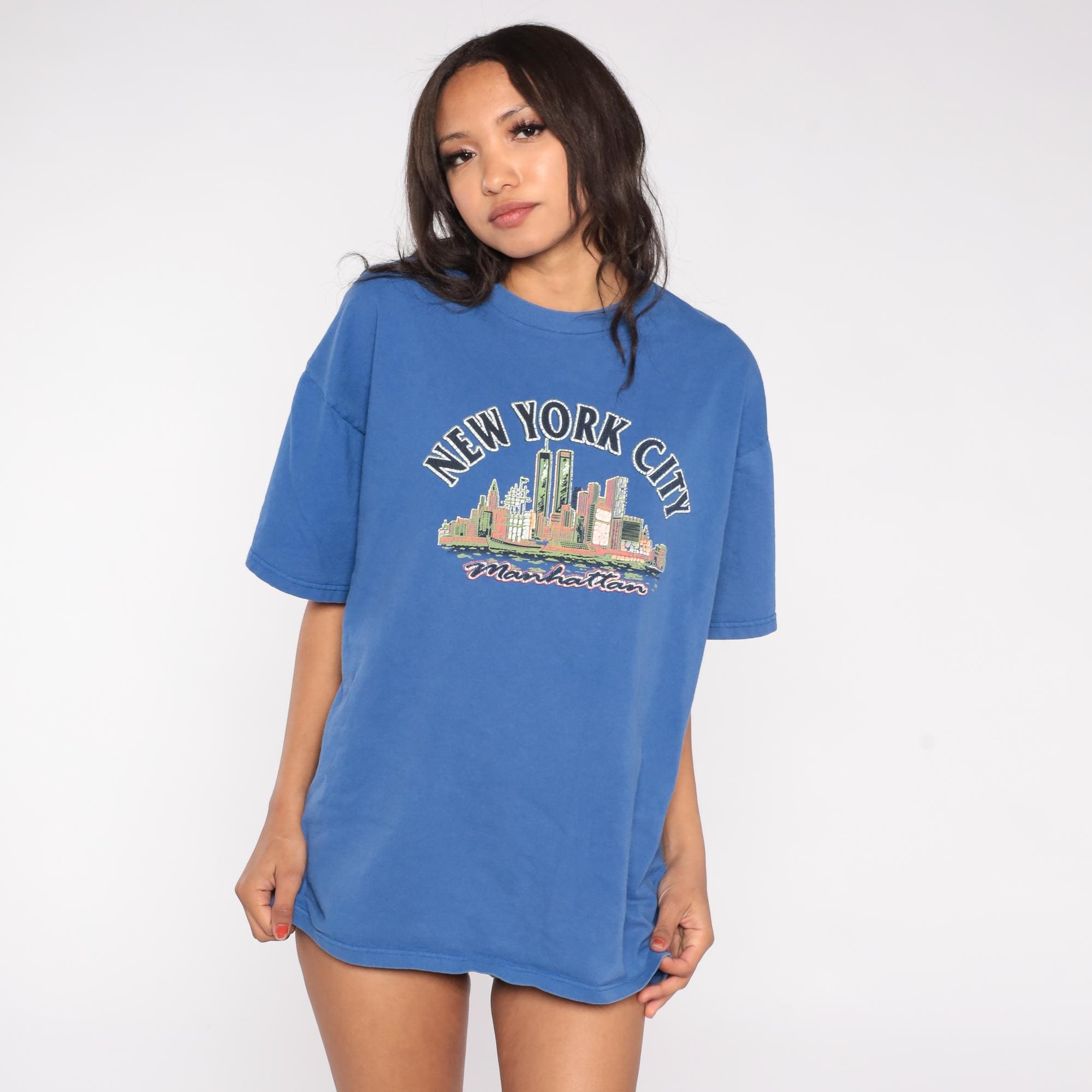 90s Fruit of the Loom t-shirt features a historical New York City skyline with the iconic Twin Towers prominently displayed in the World Trade Center complex. The royal blue cotton shirt showcases a colorful screen-printed graphic of the pre-2001 Manhattan skyline with "NEW YORK CITY" arched above and "Manhattan" script below.