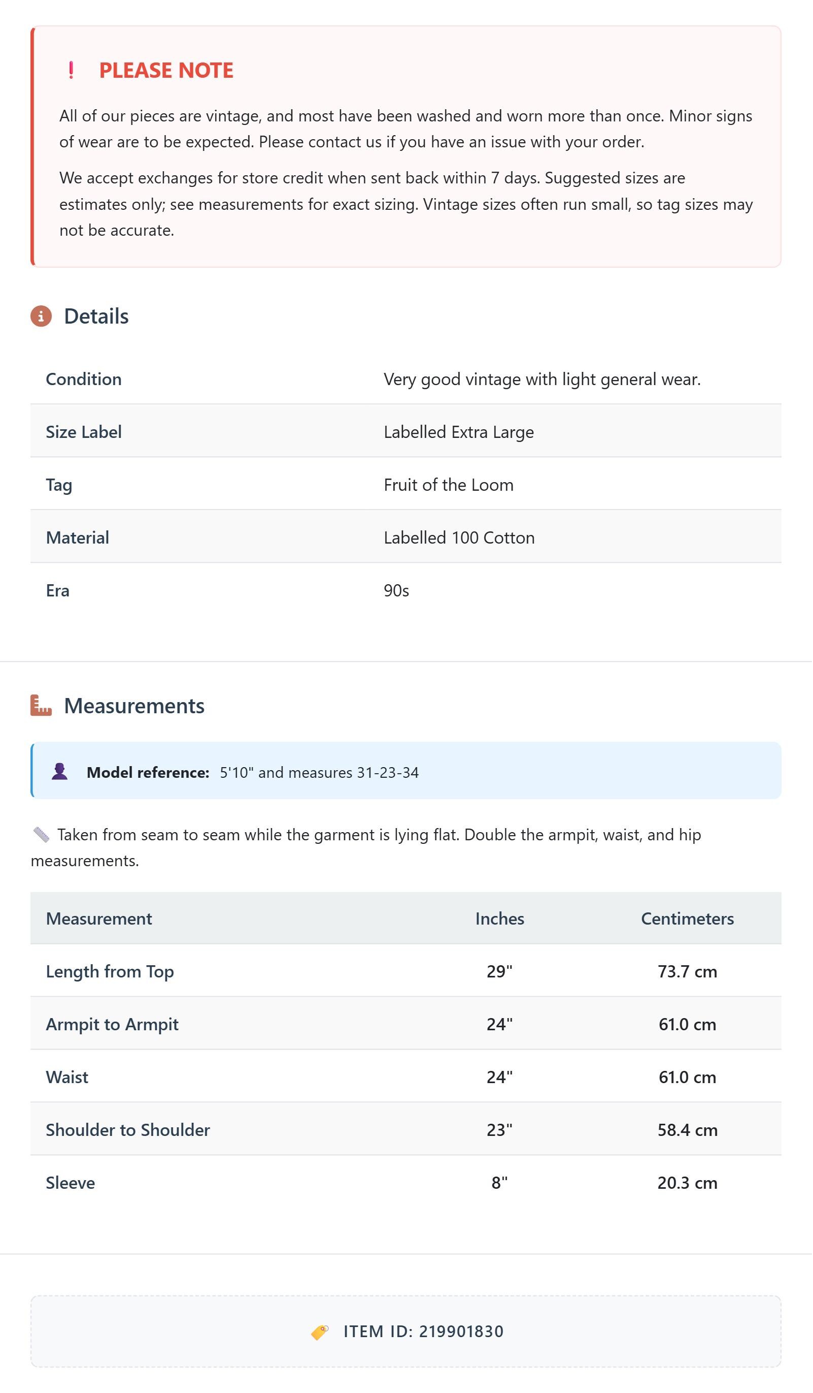 All of our pieces are vintage, and most have been washed and worn more than once. Minor signs of wear are to be expected. Please contact us if you have an issue with your order. We accept exchanges for store credit when sent back within 7 days.