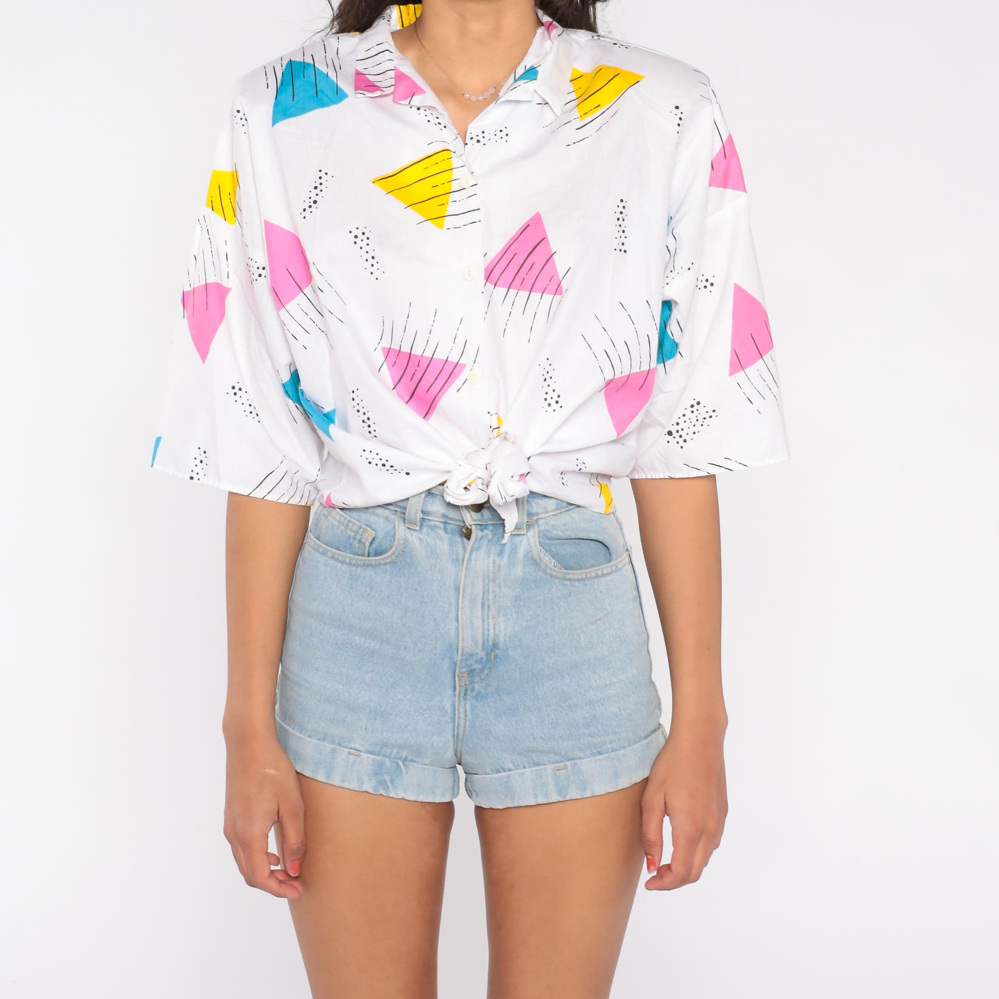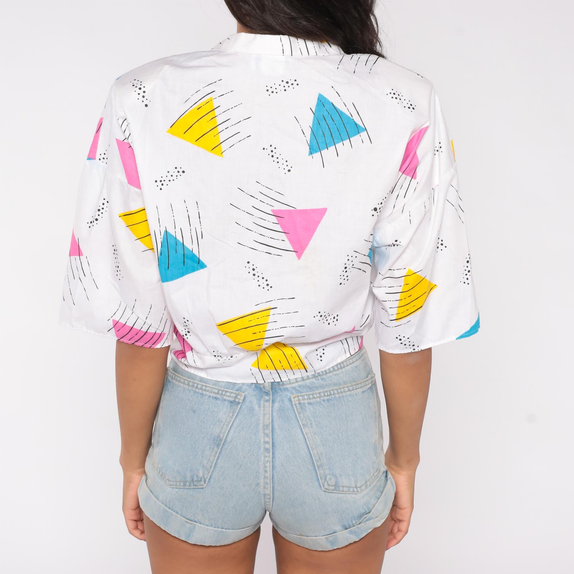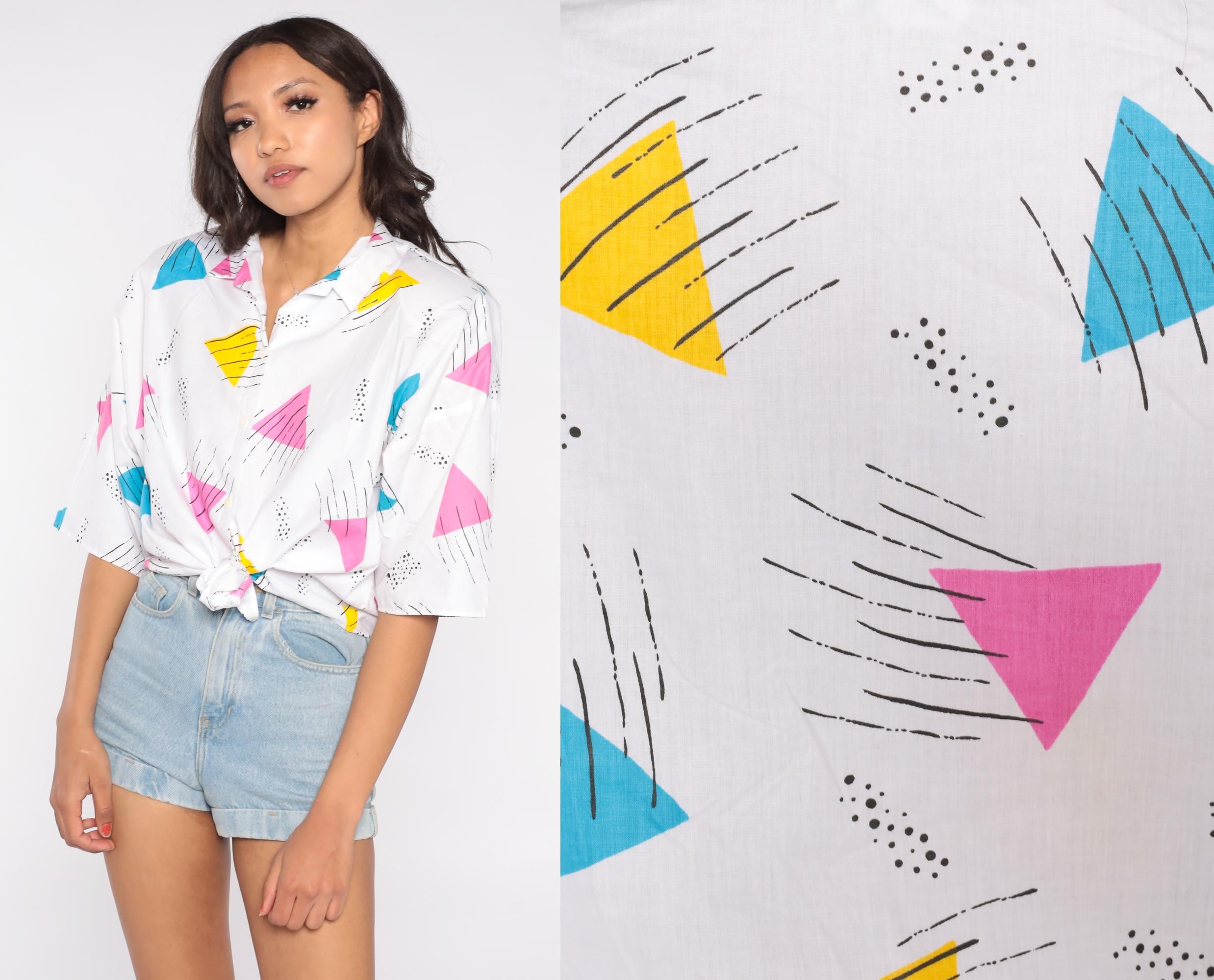 90s That's It! California button-up shirt features a vibrant Memphis Group inspired geometric print with colorful triangles in pink, yellow, and turquoise blue against a crisp white background. The design showcases classic Memphis style elements including abstract shapes, bold colors, and playful black line details.