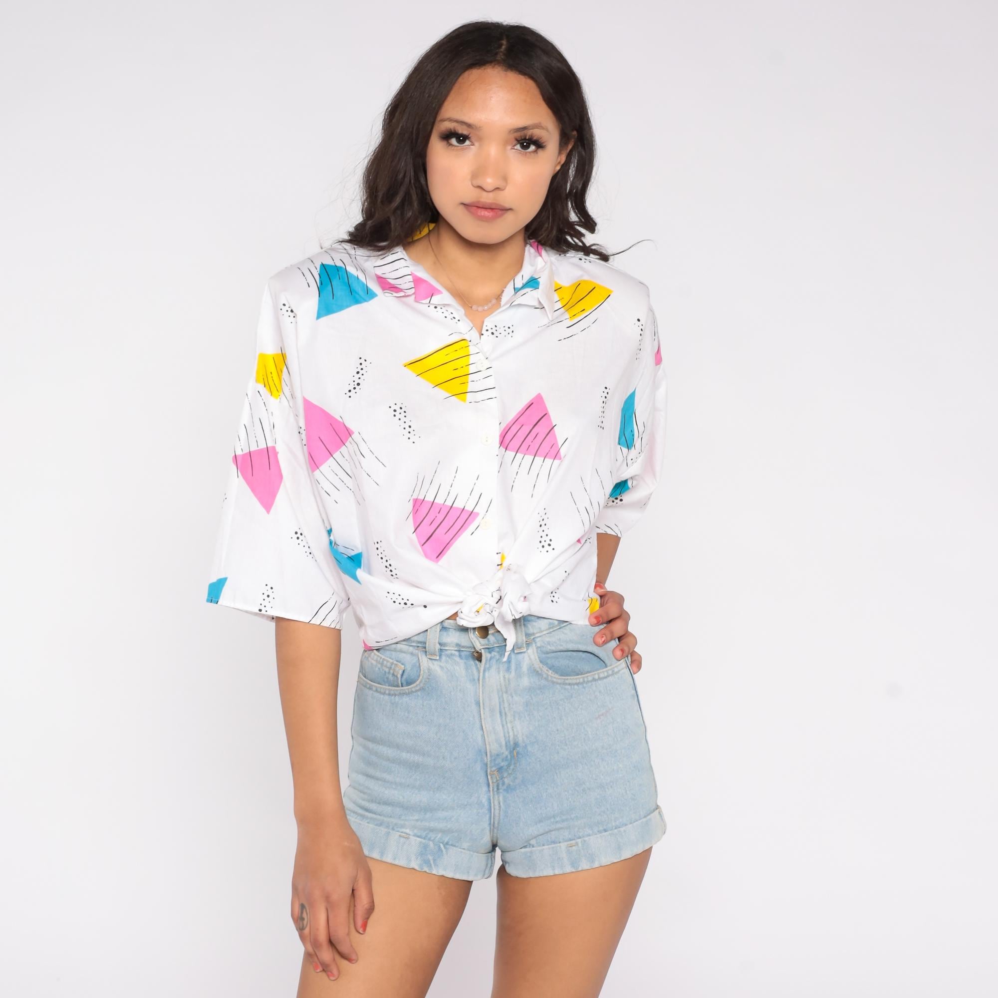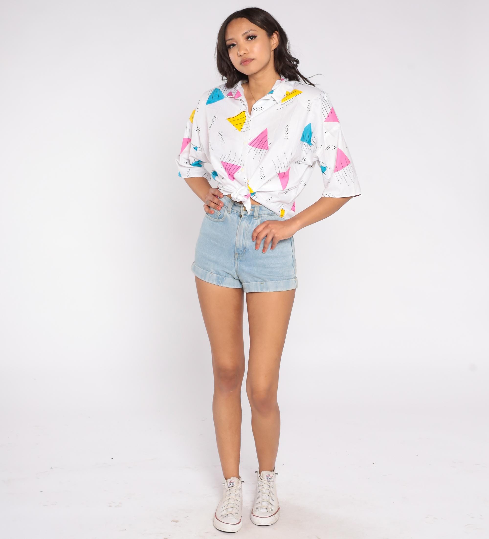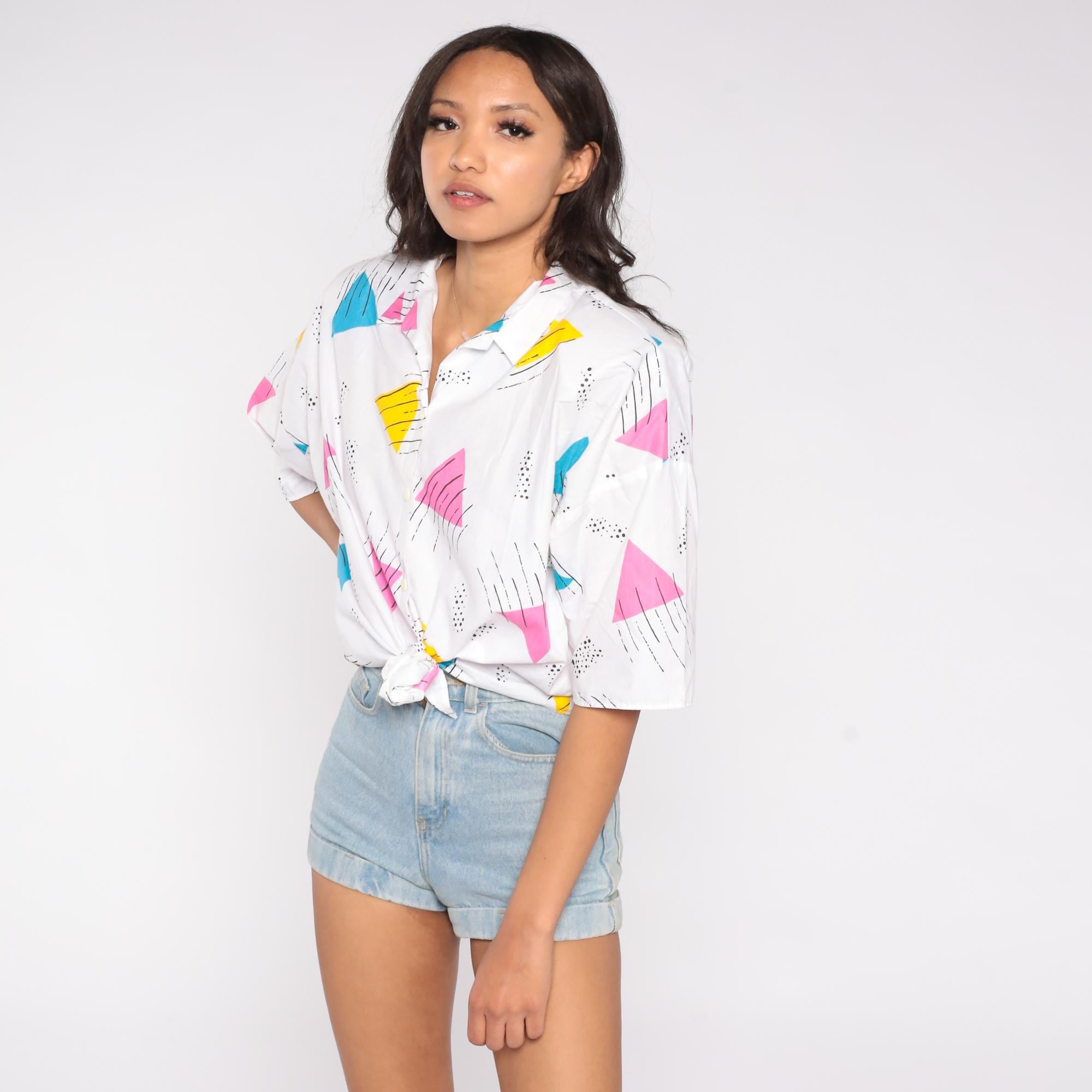 90s That's It! California button-up shirt features a vibrant Memphis Group inspired geometric print with colorful triangles in pink, yellow, and turquoise blue against a crisp white background. The design showcases classic Memphis style elements including abstract shapes, bold colors, and playful black line details.
