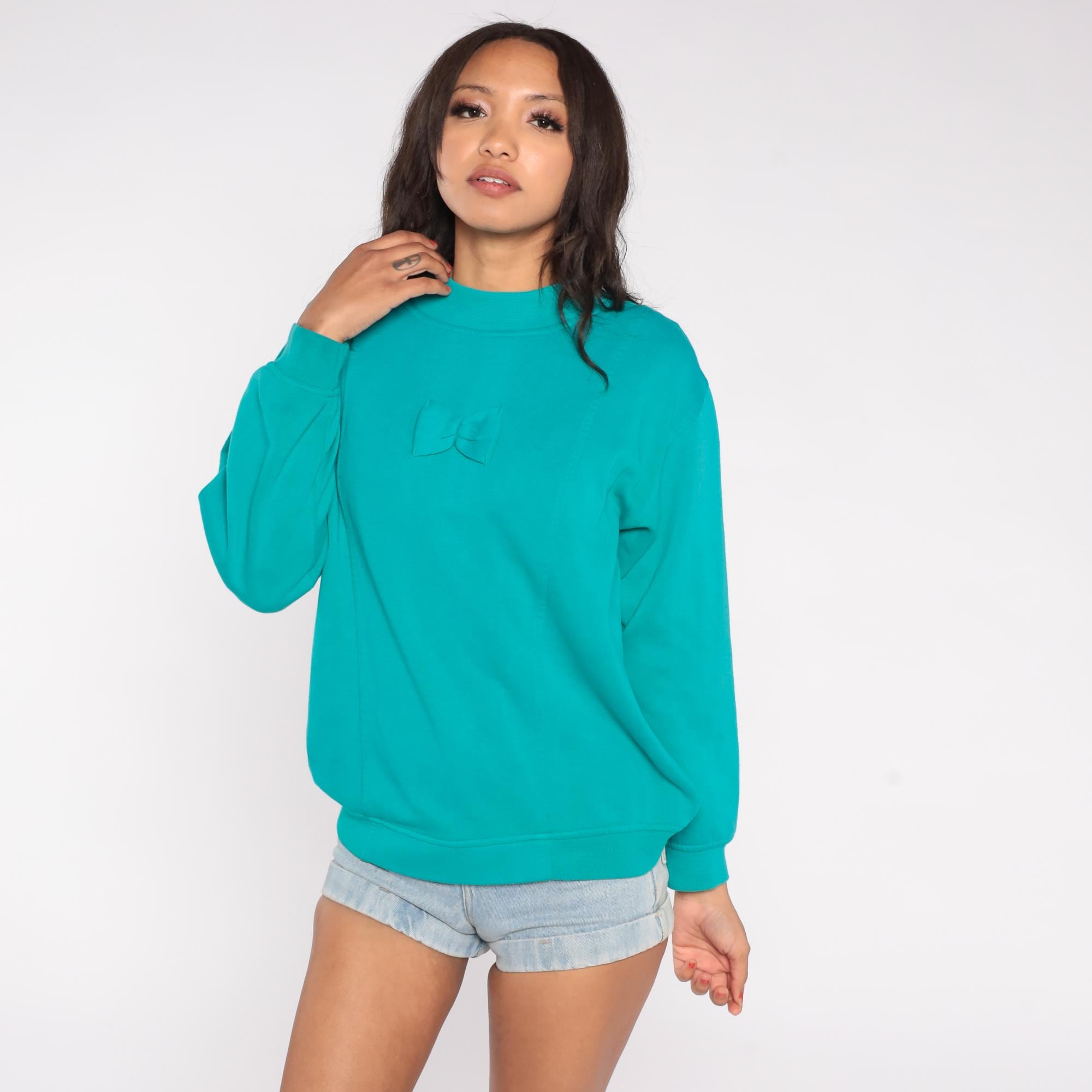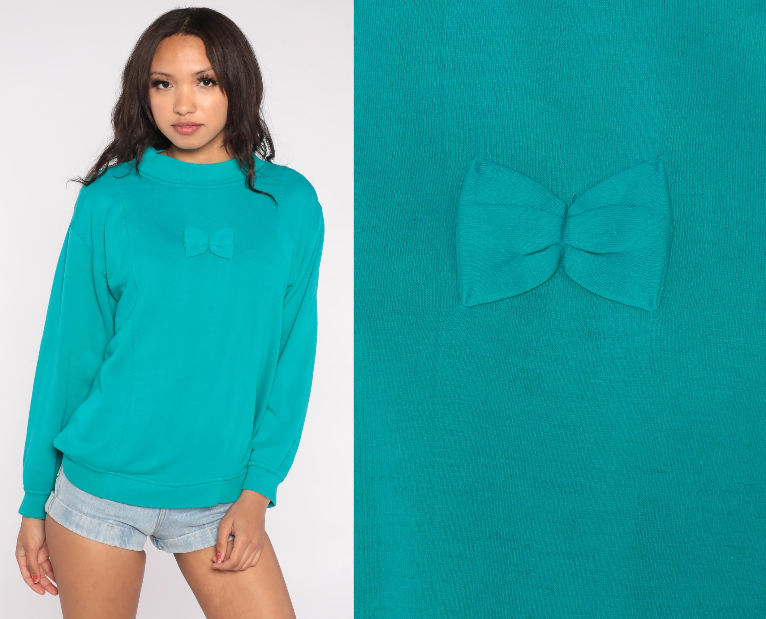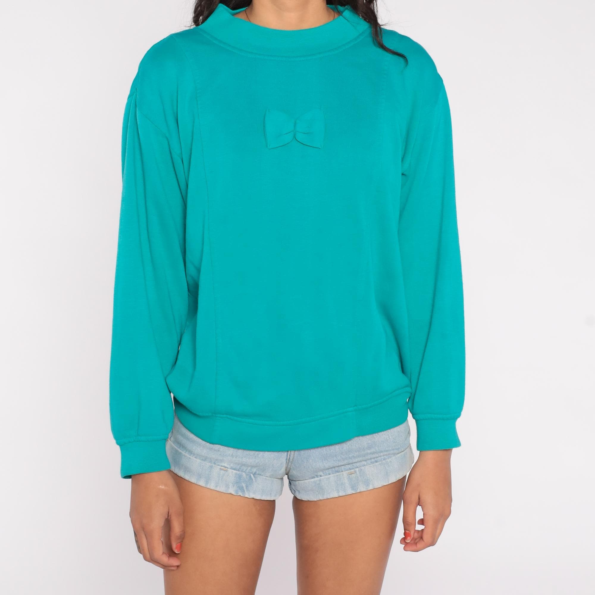 90s sweatshirt features a charming self-fabric bow applique centered on the chest against a vibrant teal turquoise background. Constructed from a soft cotton/polyester blend with a mock neck collar and long sleeves.