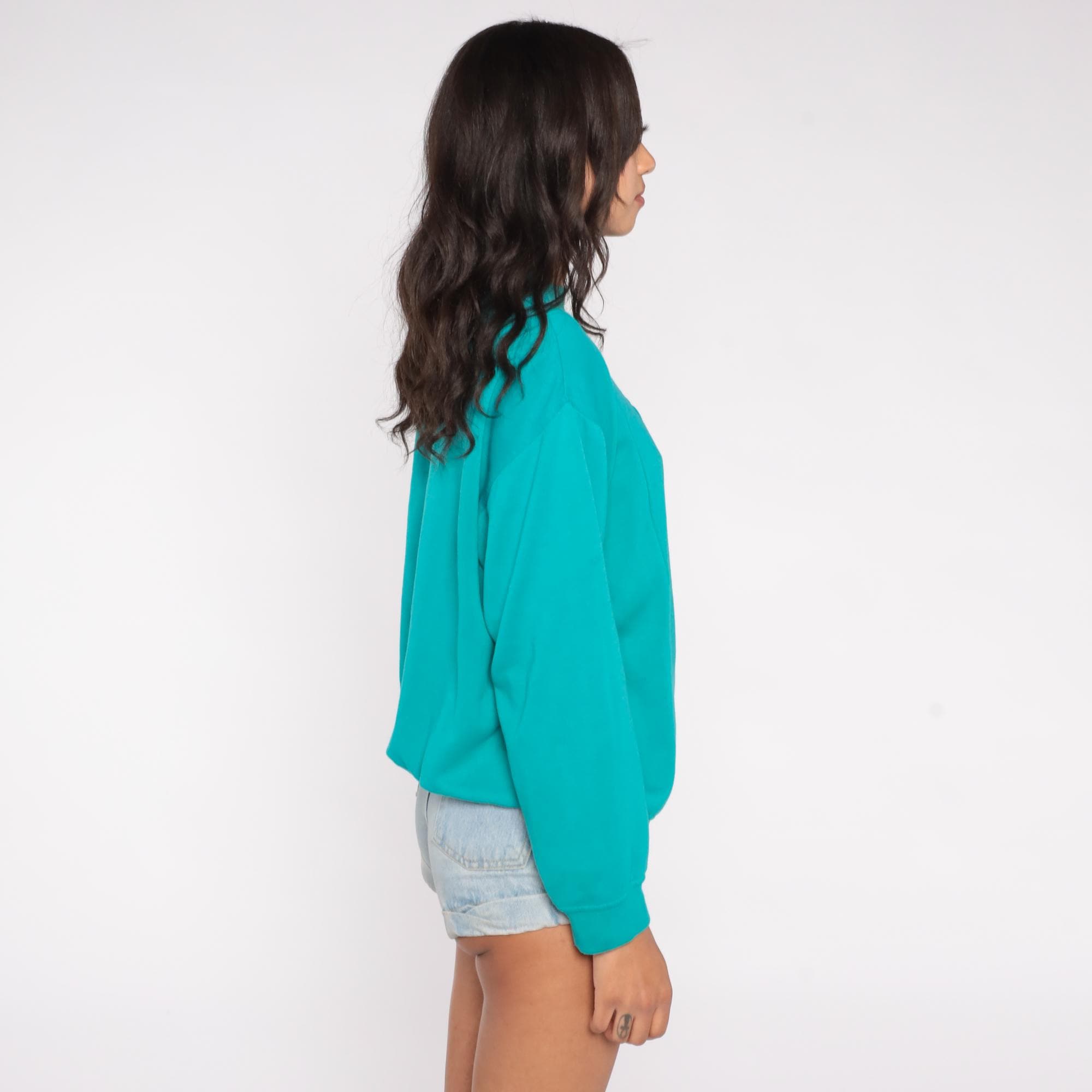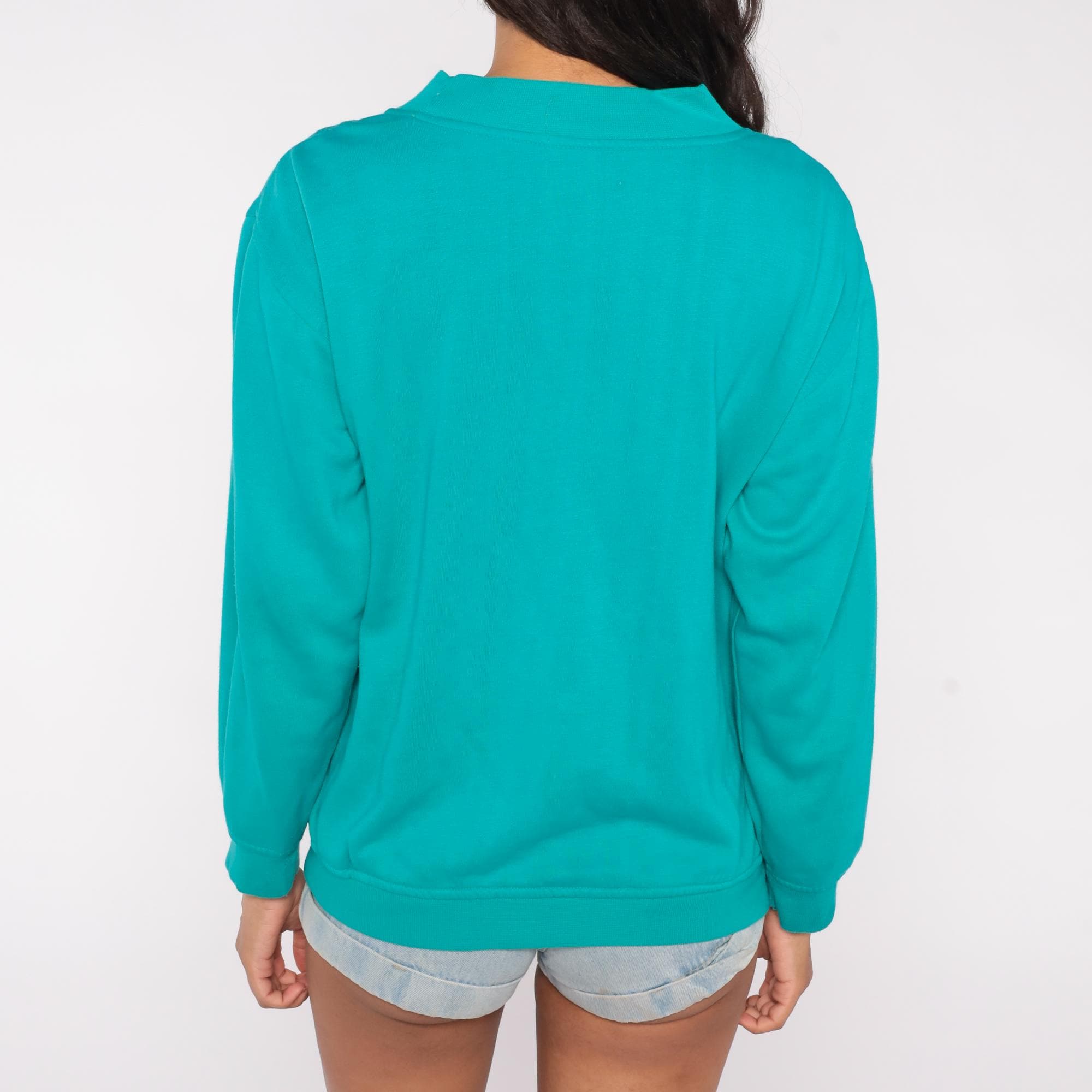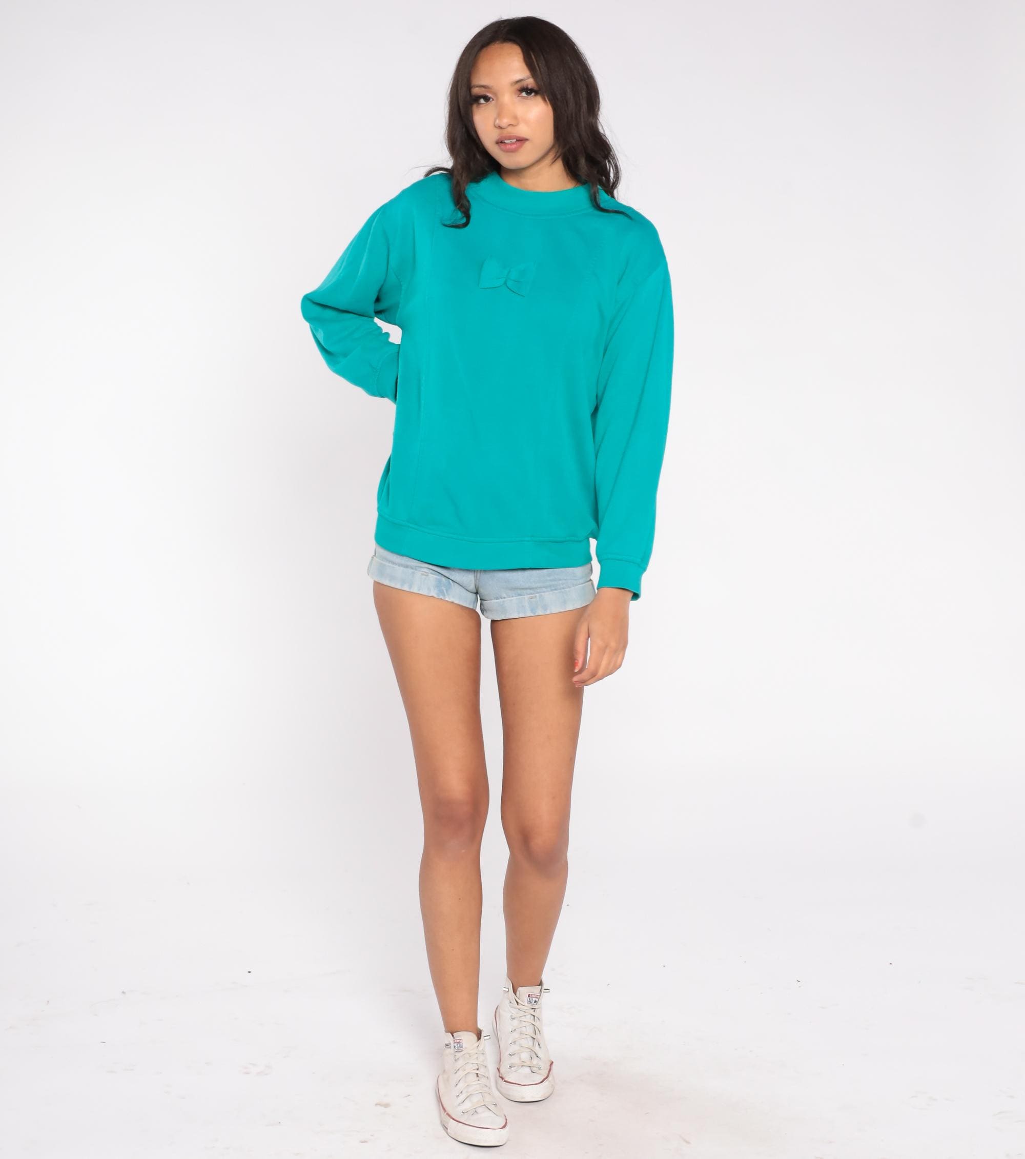 90s sweatshirt features a charming self-fabric bow applique centered on the chest against a vibrant teal turquoise background. Constructed from a soft cotton/polyester blend with a mock neck collar and long sleeves.