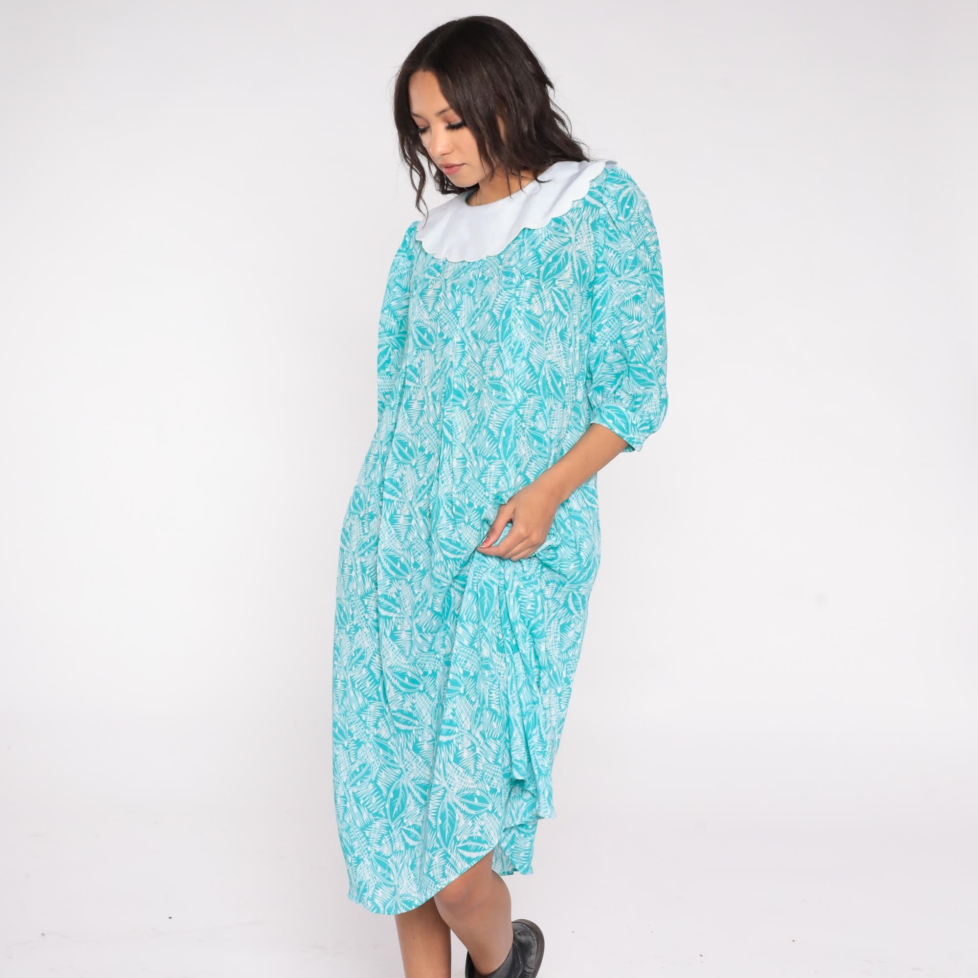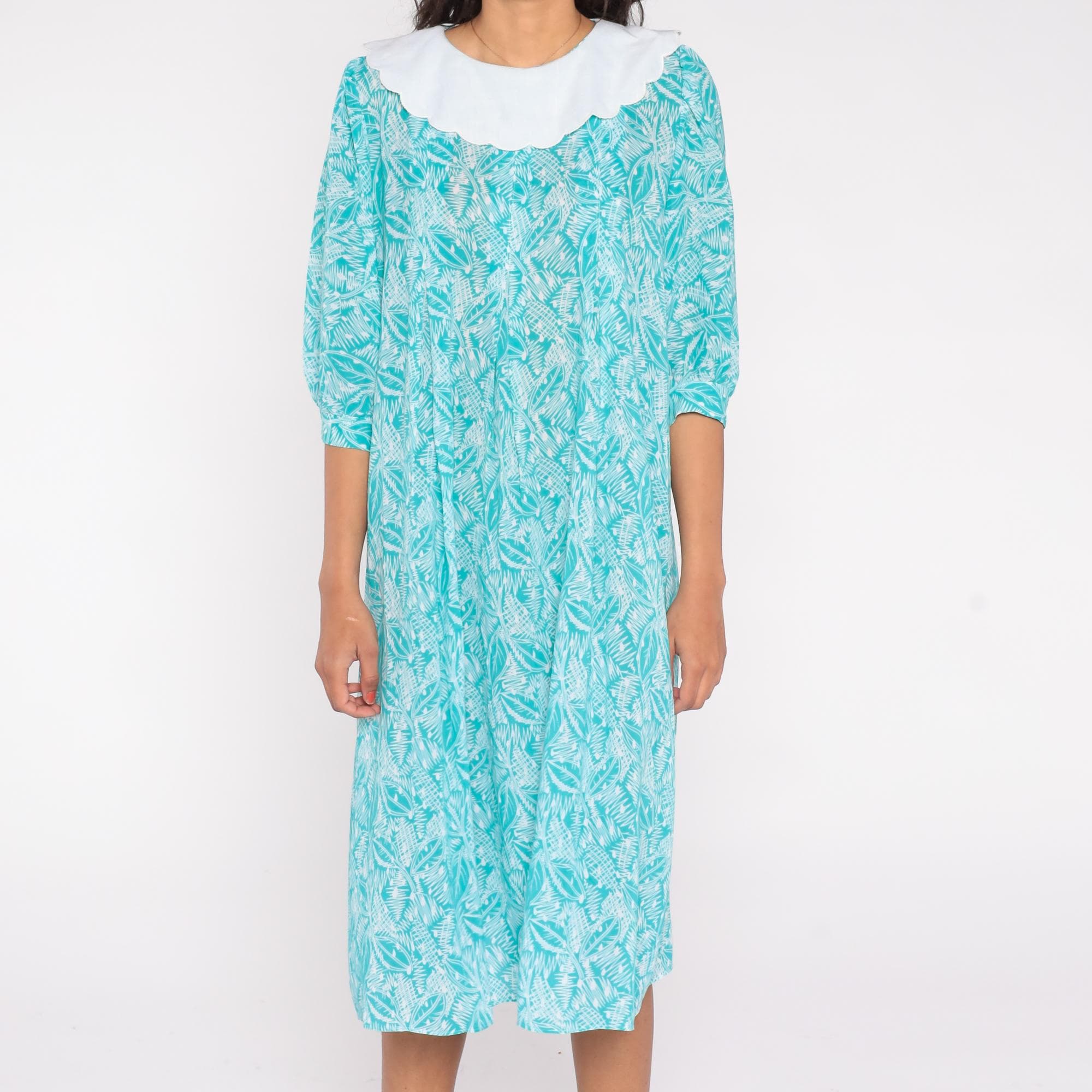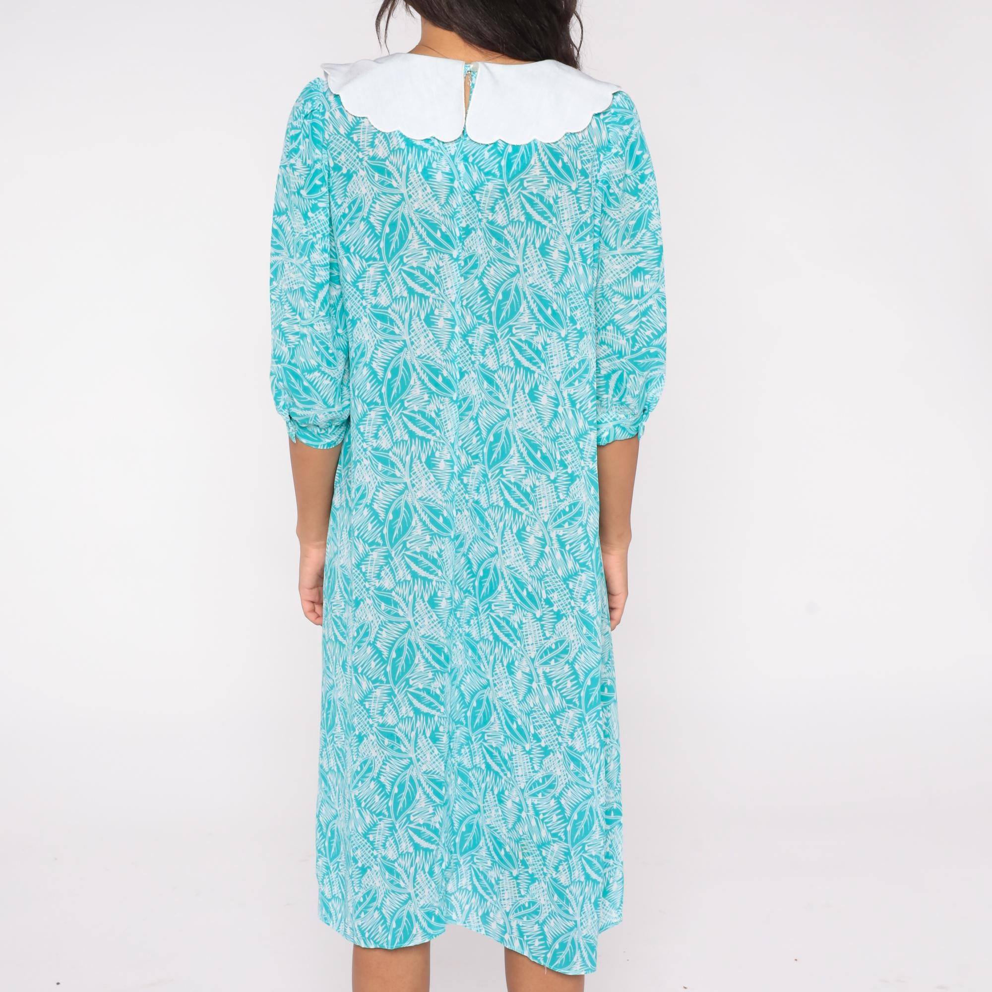 80s teal blue dress by Kathryn & Co. featuring a white scalloped Peter Pan collar and an allover abstract leaf print. The dress includes three-quarter puff sleeves, a loose midi-length silhouette, and a back keyhole button closure.