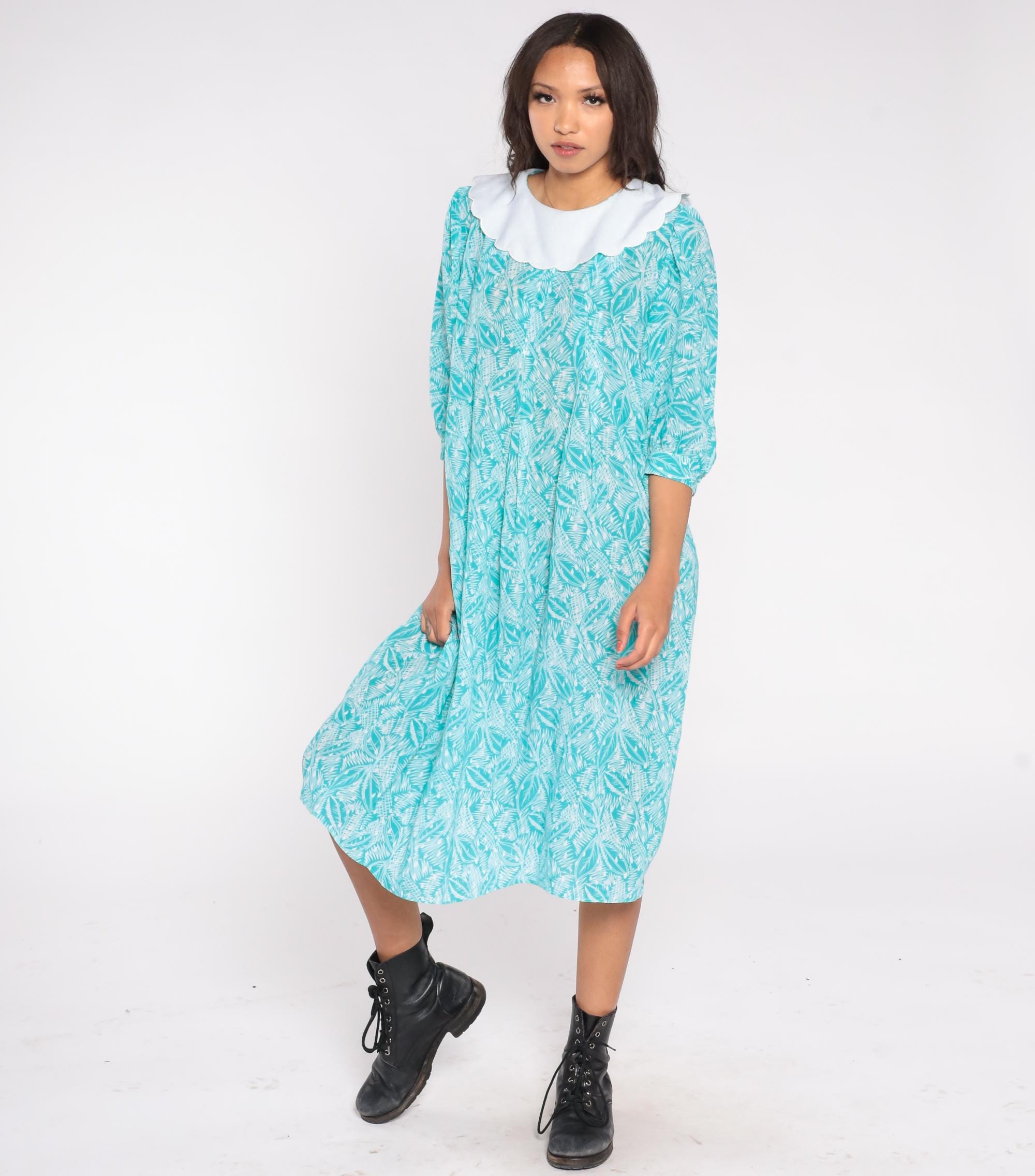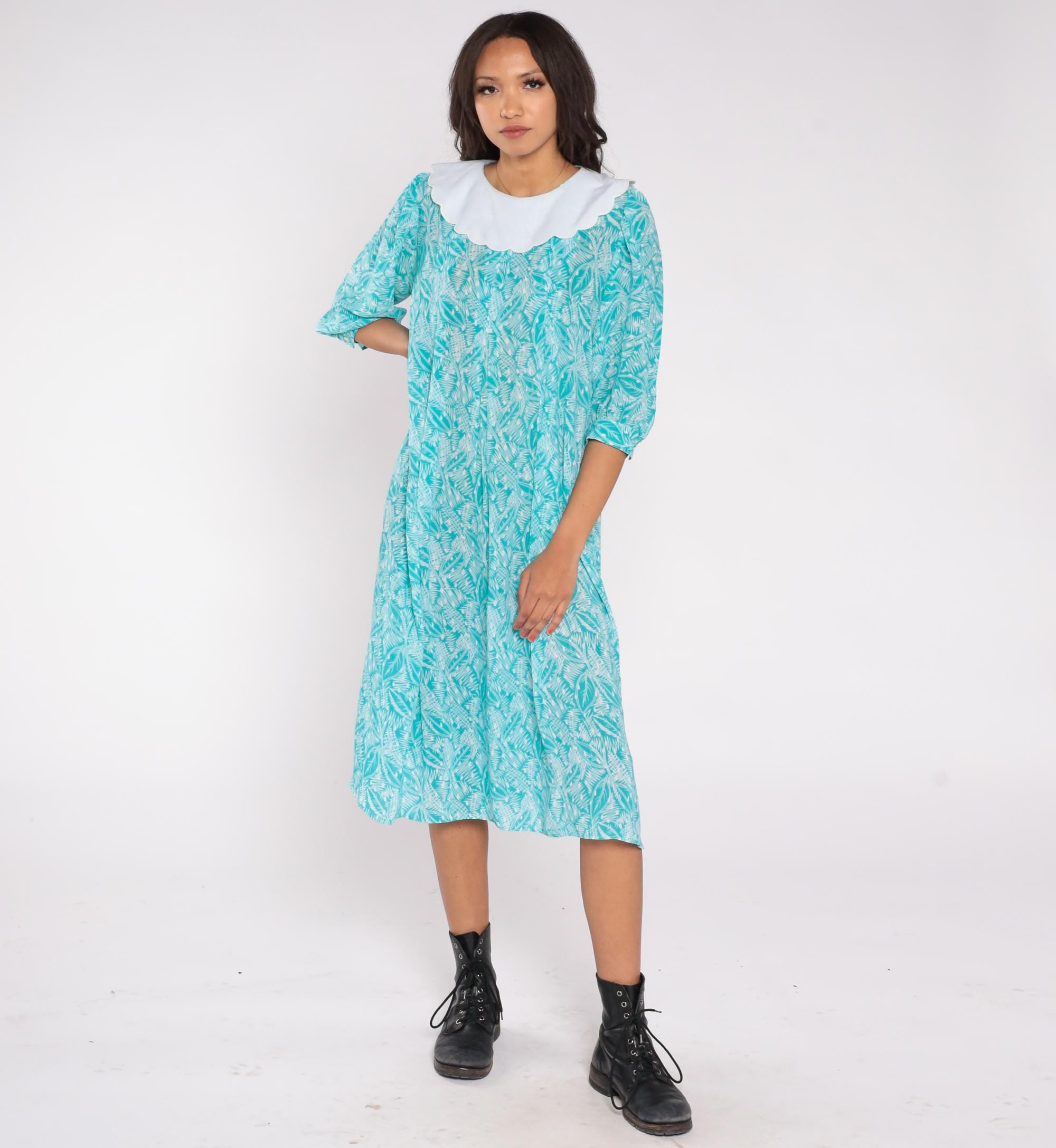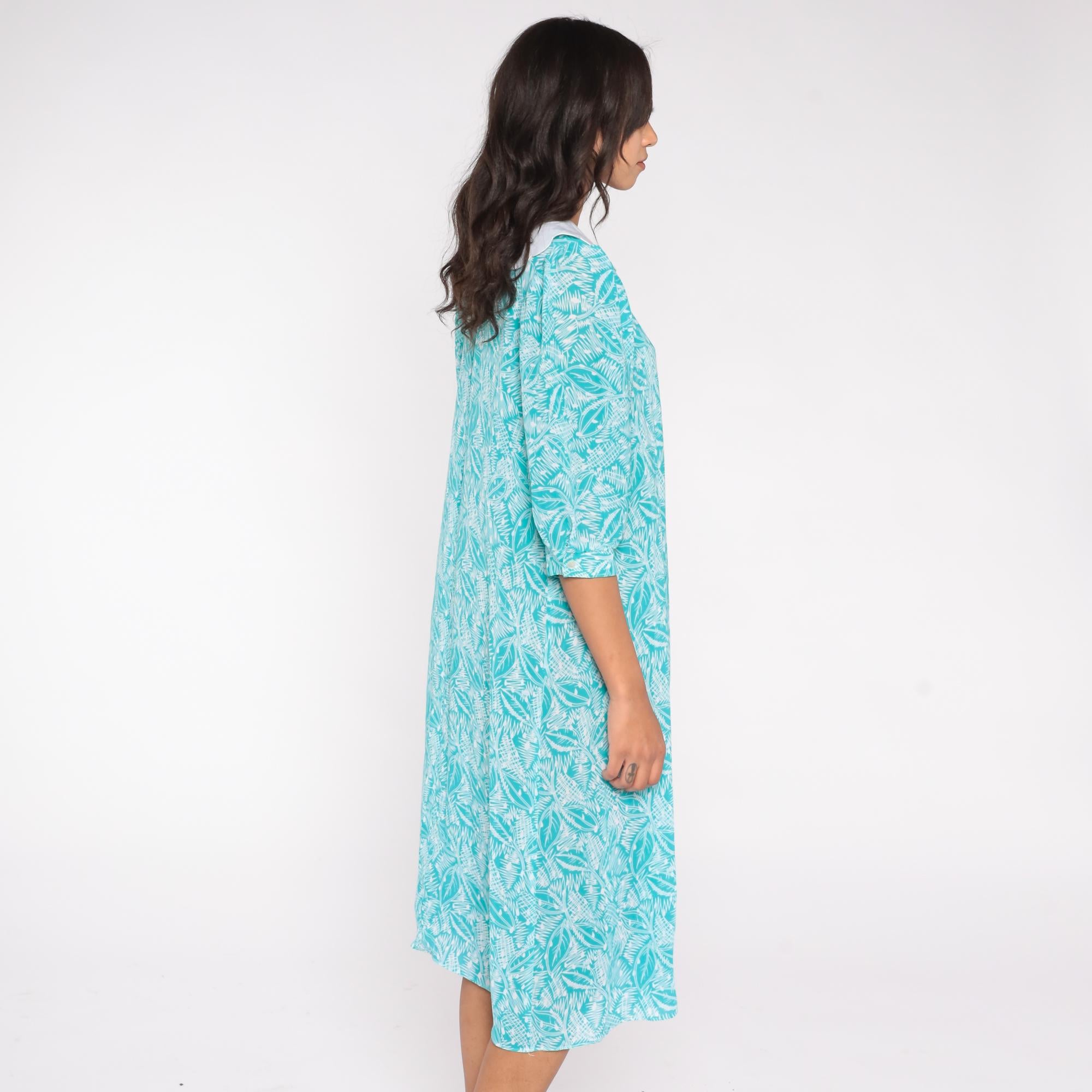 80s teal blue dress by Kathryn & Co. featuring a white scalloped Peter Pan collar and an allover abstract leaf print. The dress includes three-quarter puff sleeves, a loose midi-length silhouette, and a back keyhole button closure.