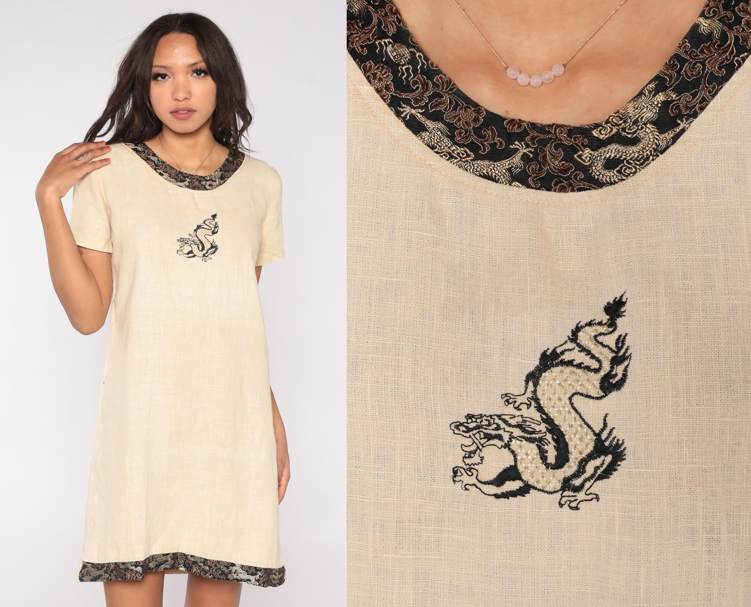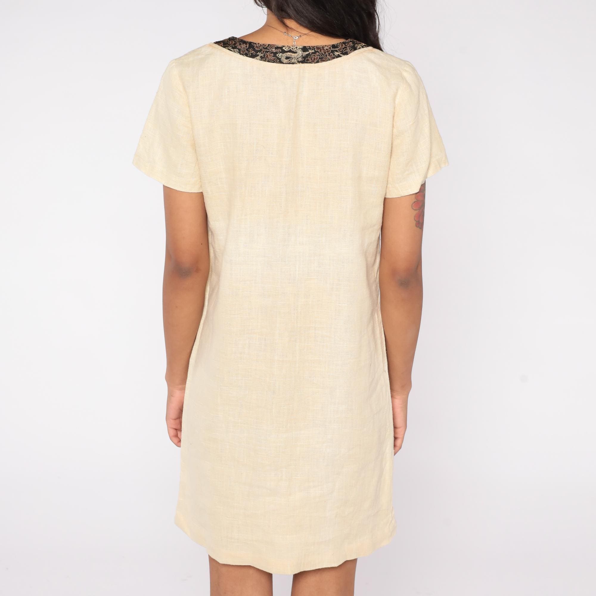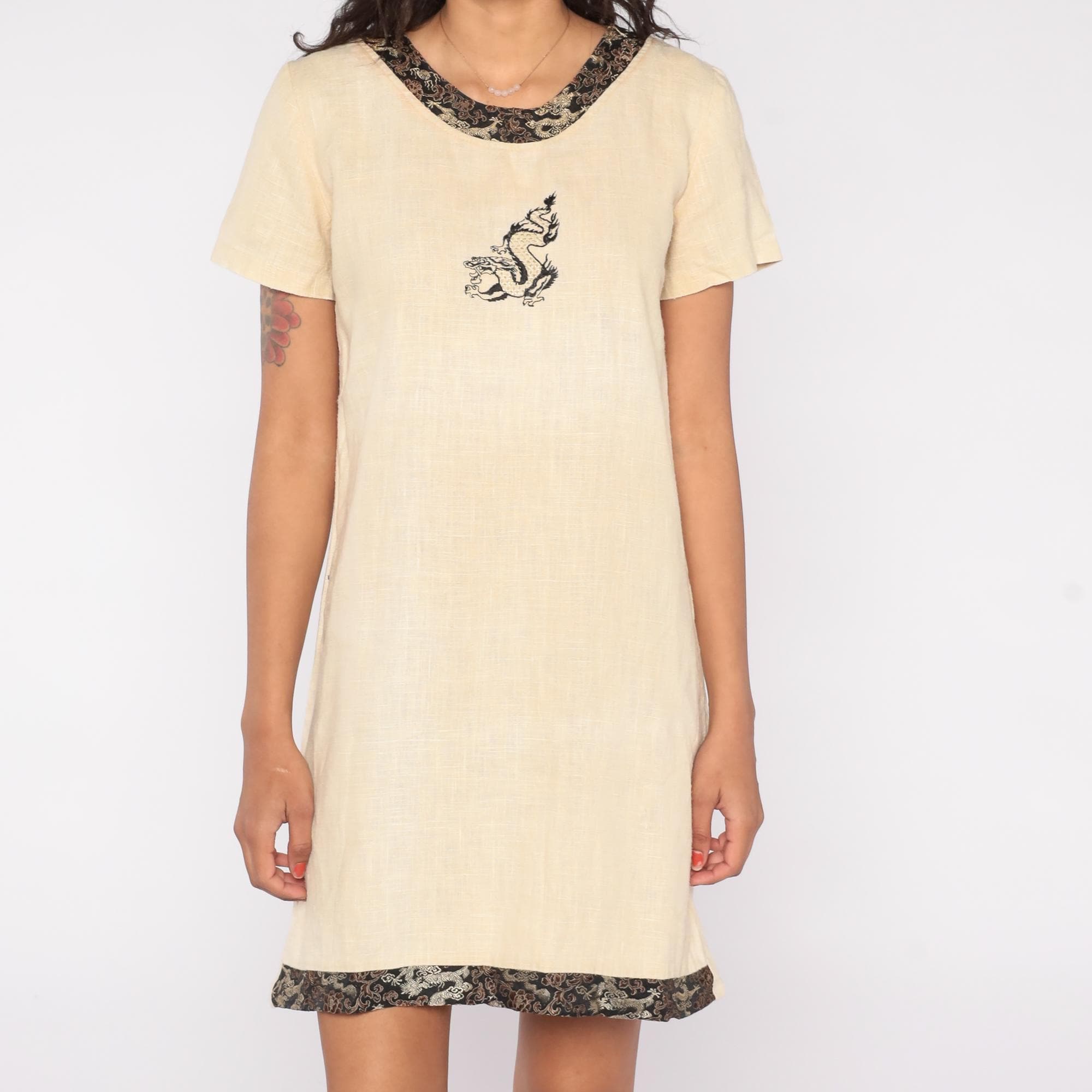 90s Mariko Designer Collection dress featuring a beige linen body with black and gold brocade trim along the neckline and hem. The front is detailed with an embroidered dragon motif. This shift-style dress has short sleeves and a relaxed fit that falls just above the knee.