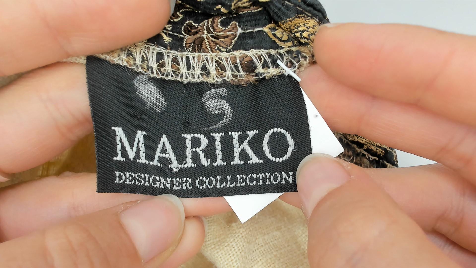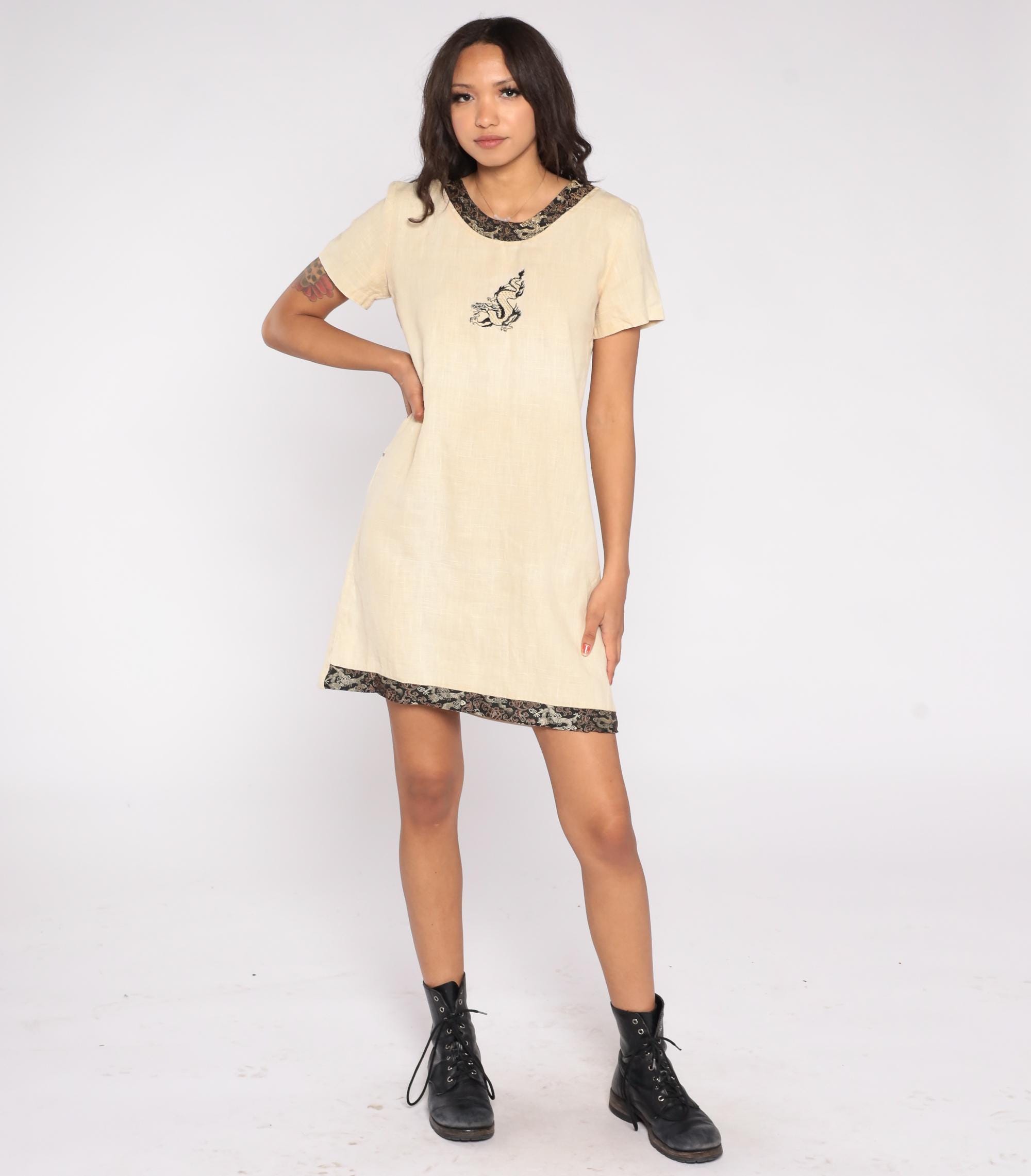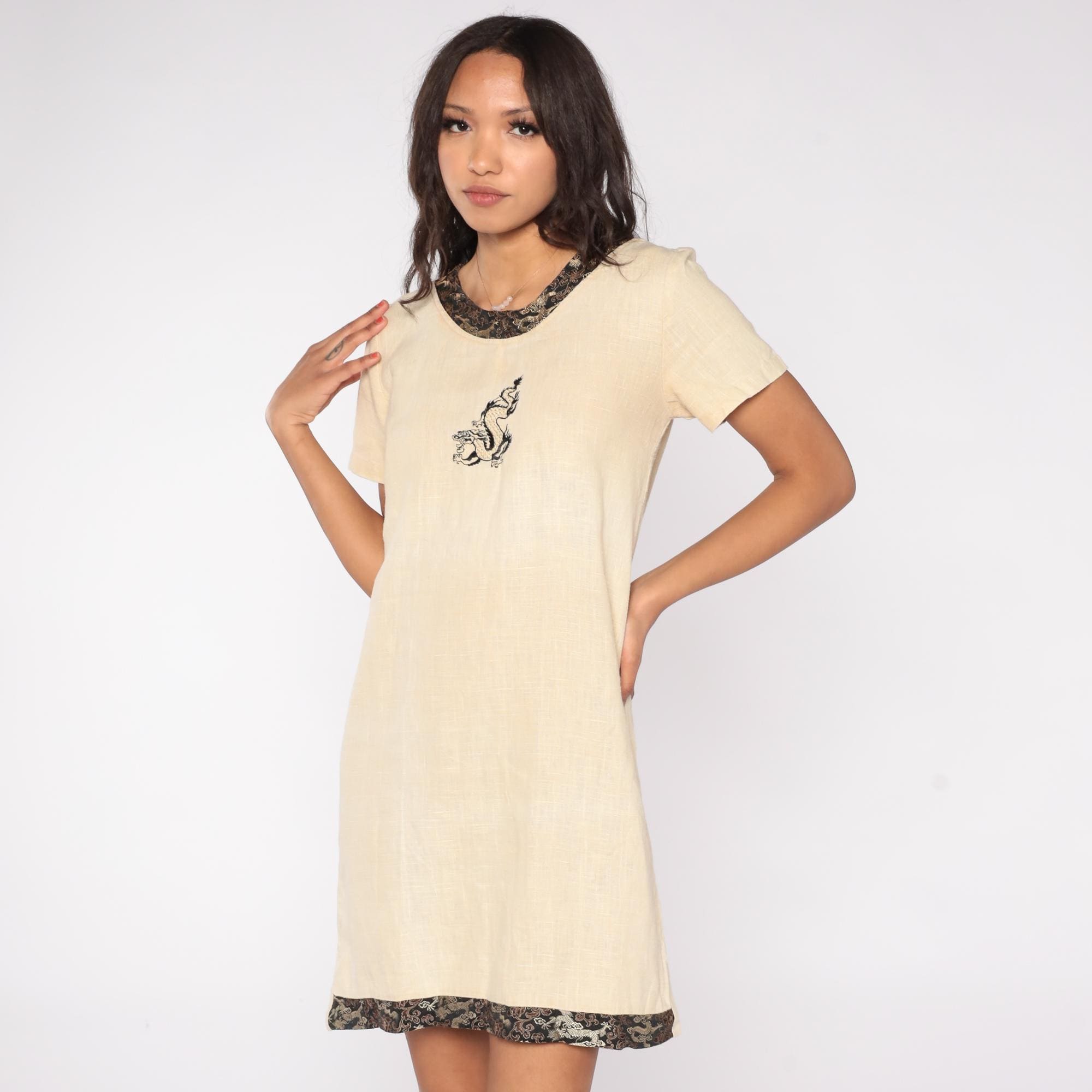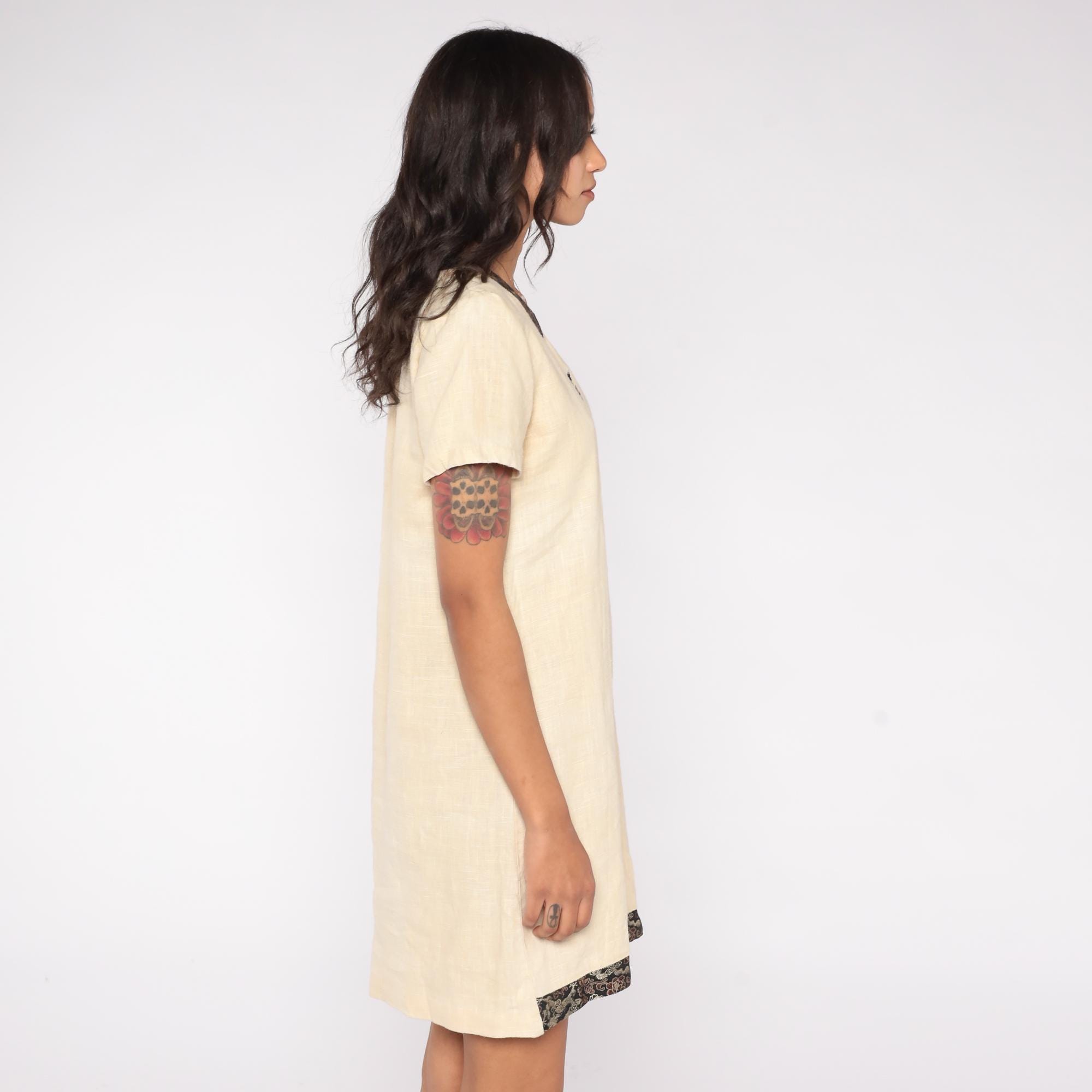 90s Mariko Designer Collection dress featuring a beige linen body with black and gold brocade trim along the neckline and hem. The front is detailed with an embroidered dragon motif. This shift-style dress has short sleeves and a relaxed fit that falls just above the knee.