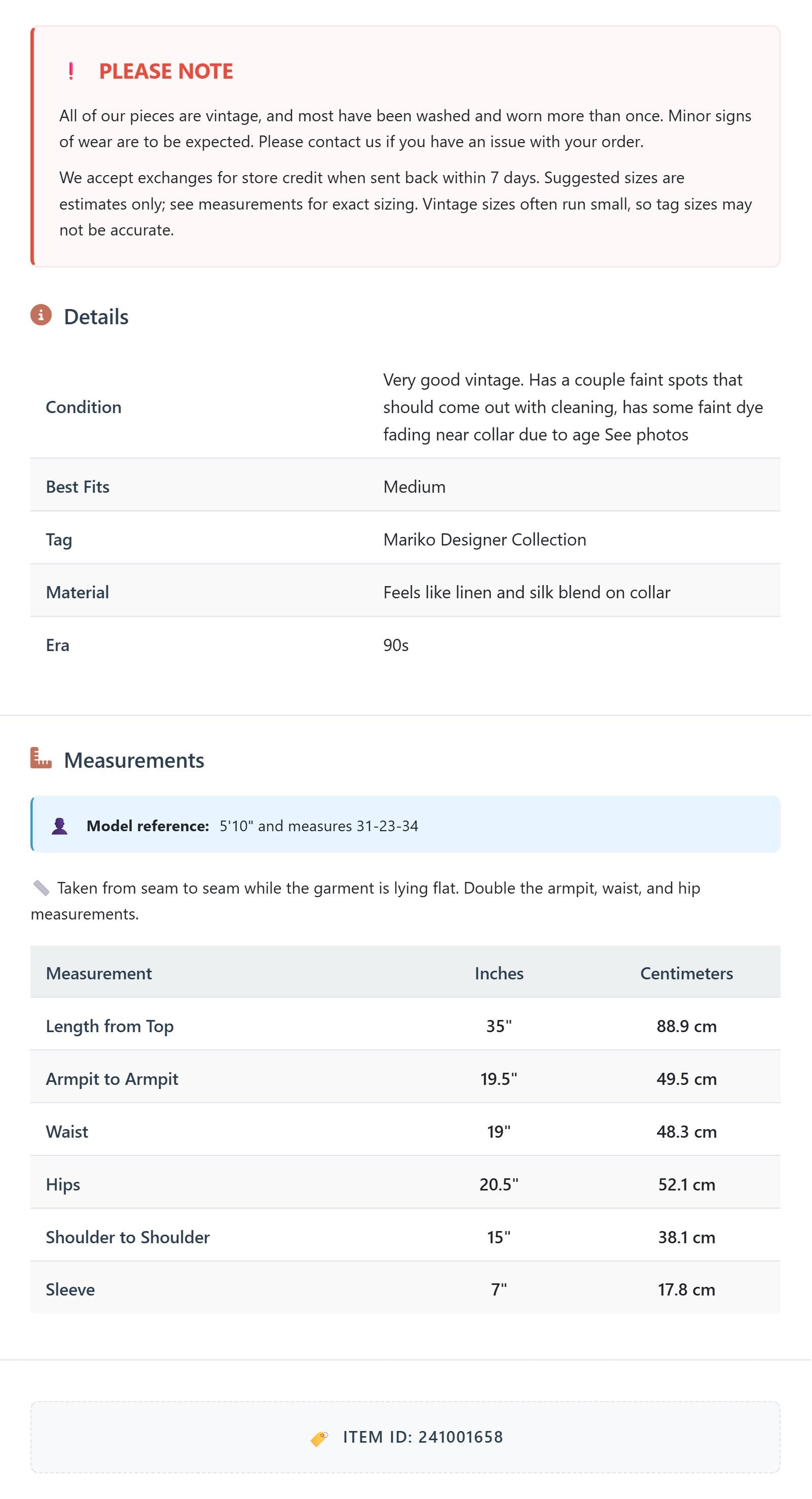 Condition: Very good vintage. Has a couple faint spots that should come out with cleaning, has some faint dye fading near collar due to age See photos