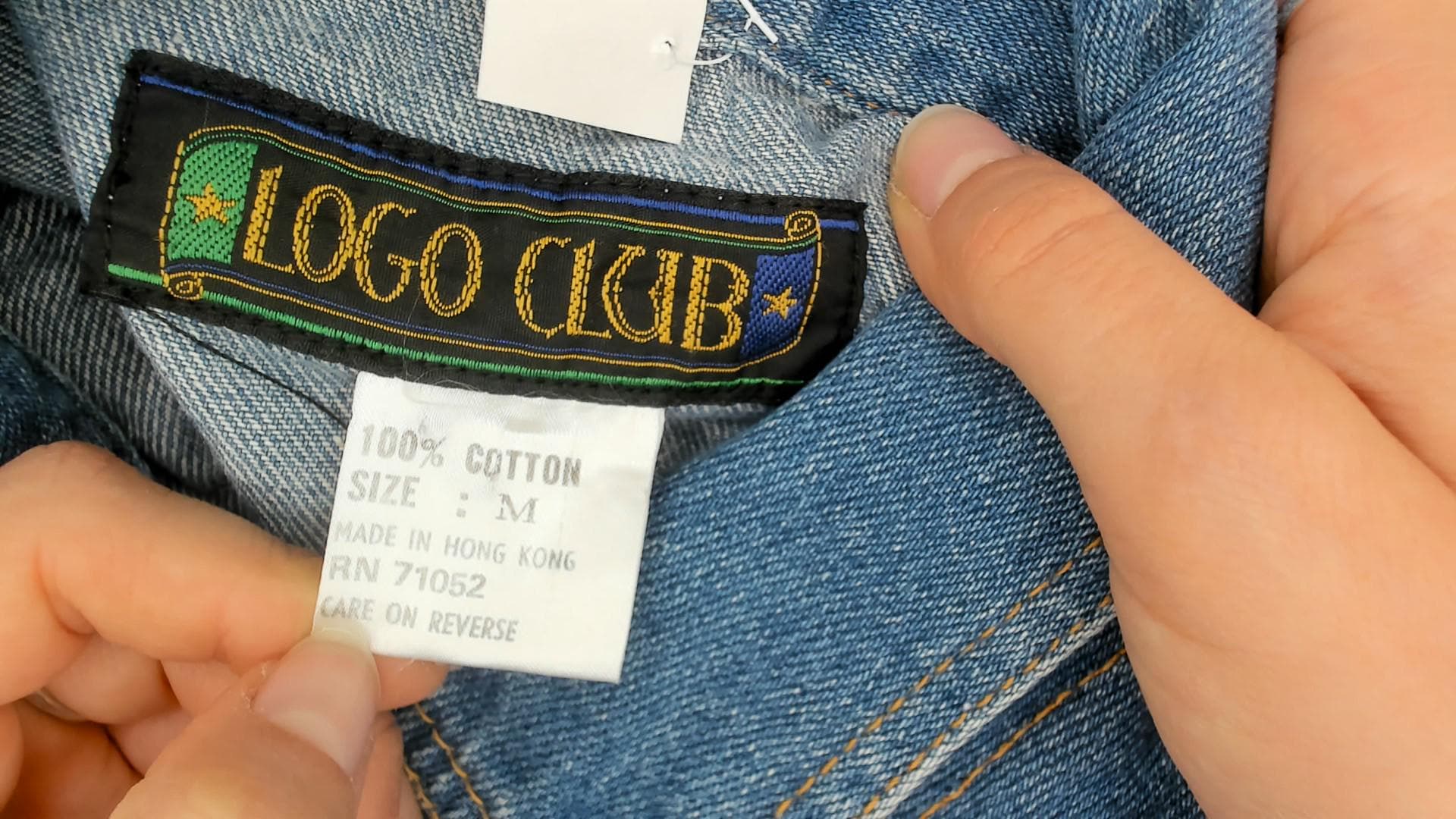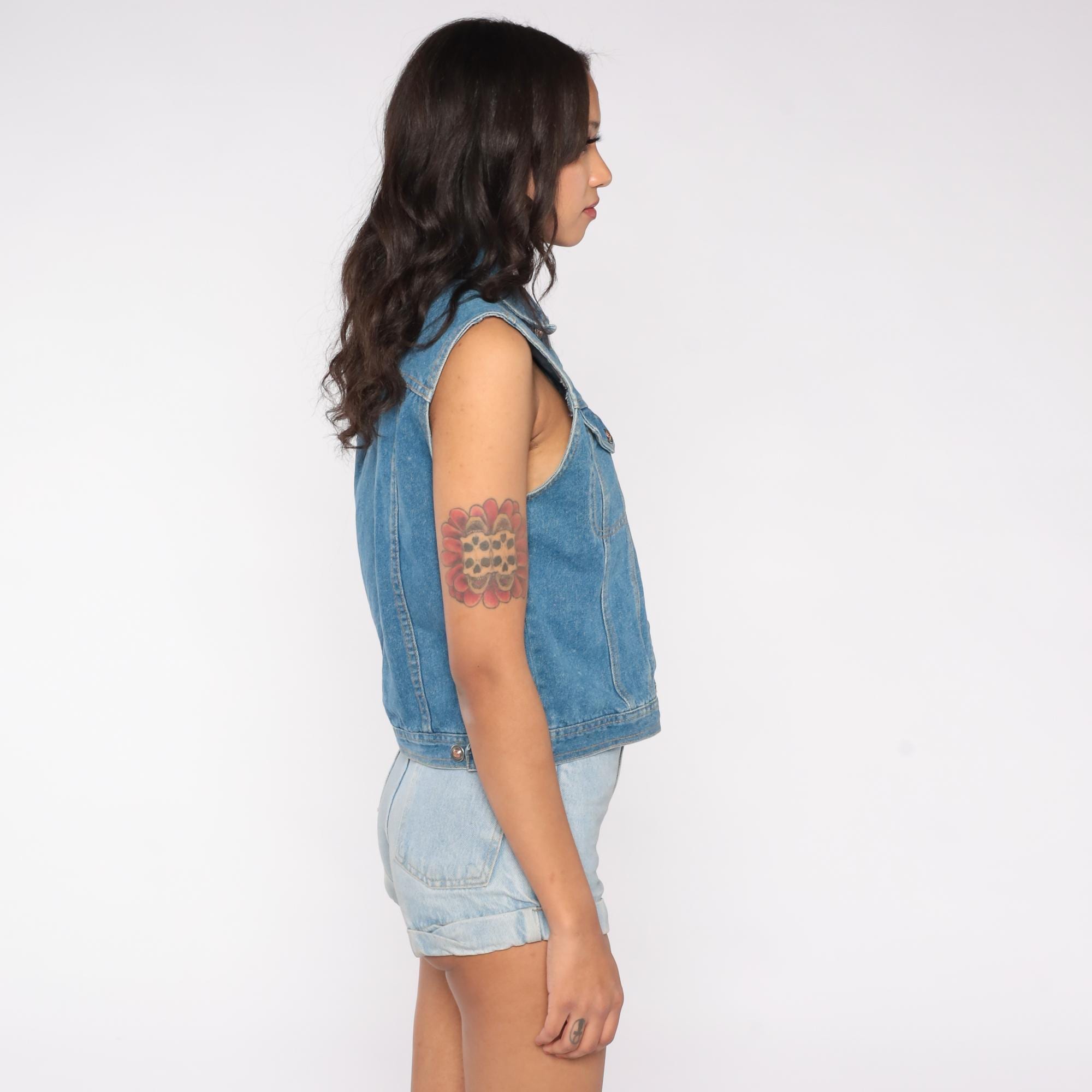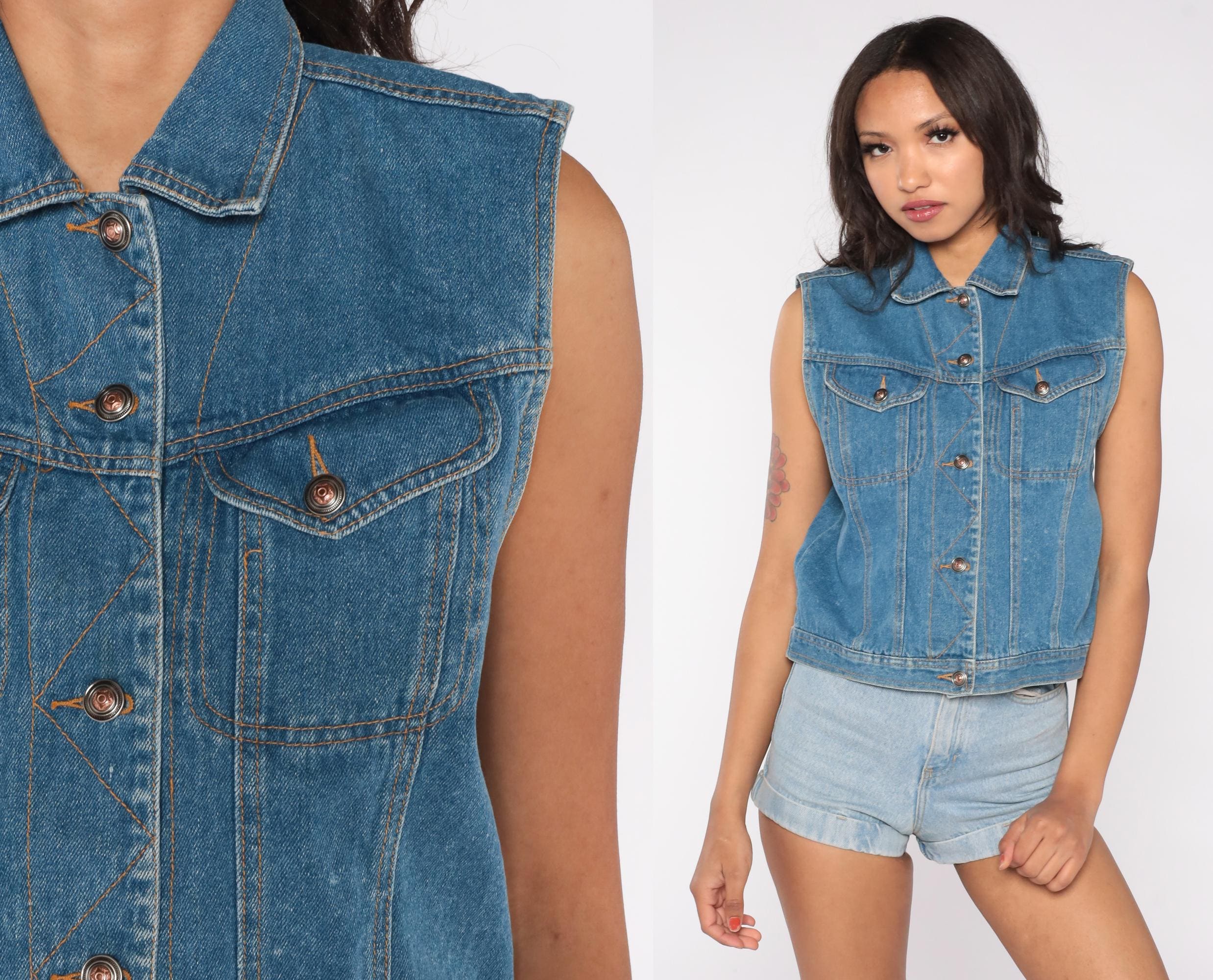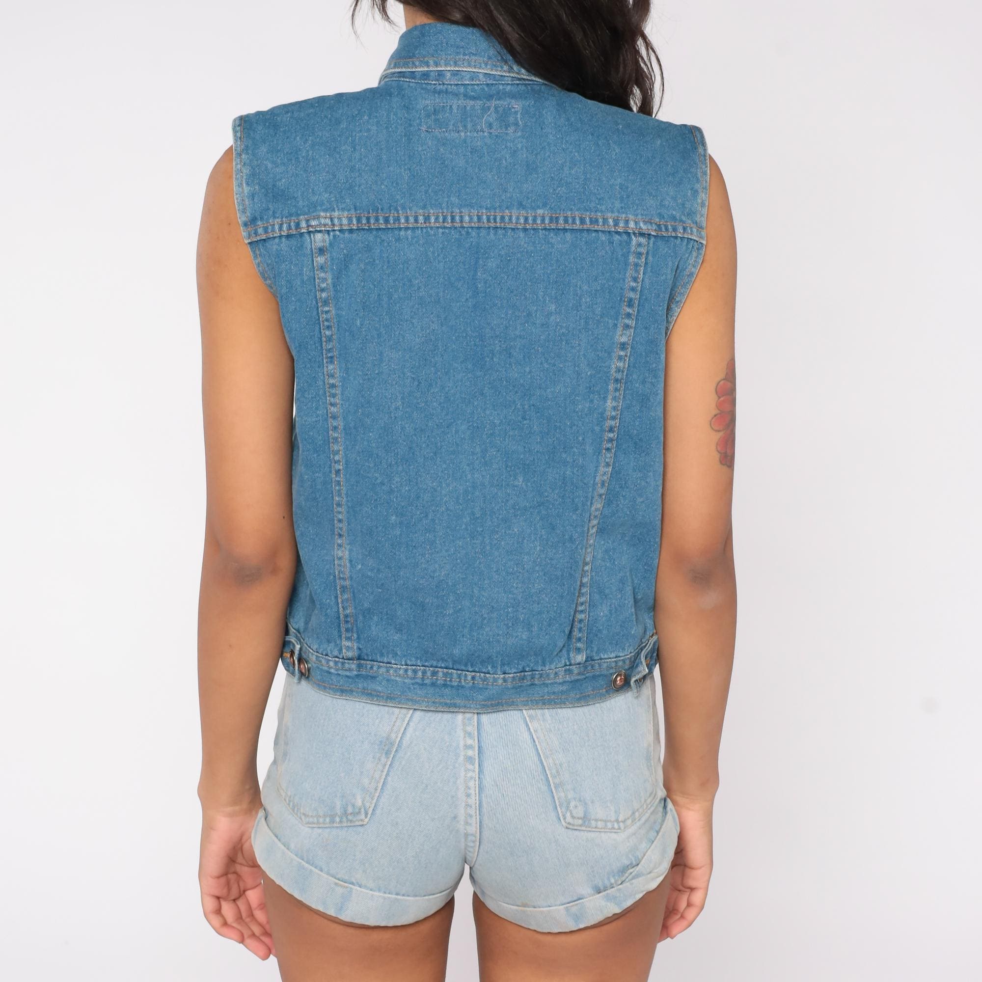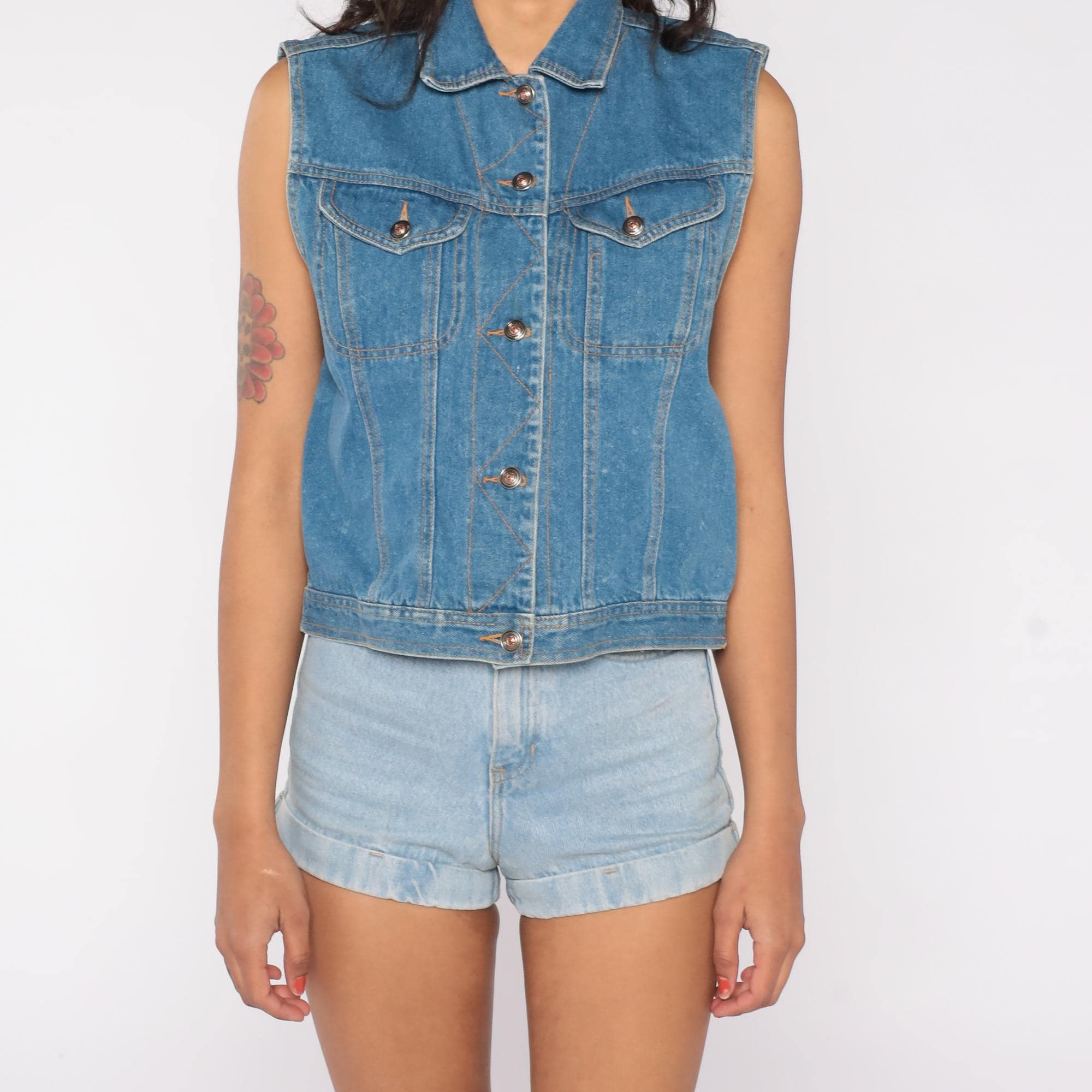 90s Logo Club denim vest in a medium blue wash. Features a sleeveless design with a button front closure, pointed yoke seams, and dual chest pockets with metal buttons.