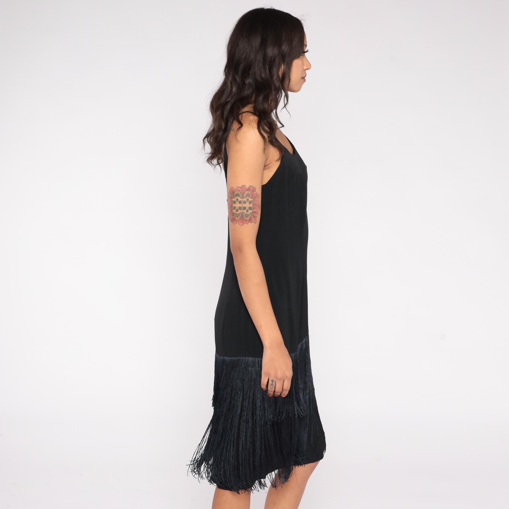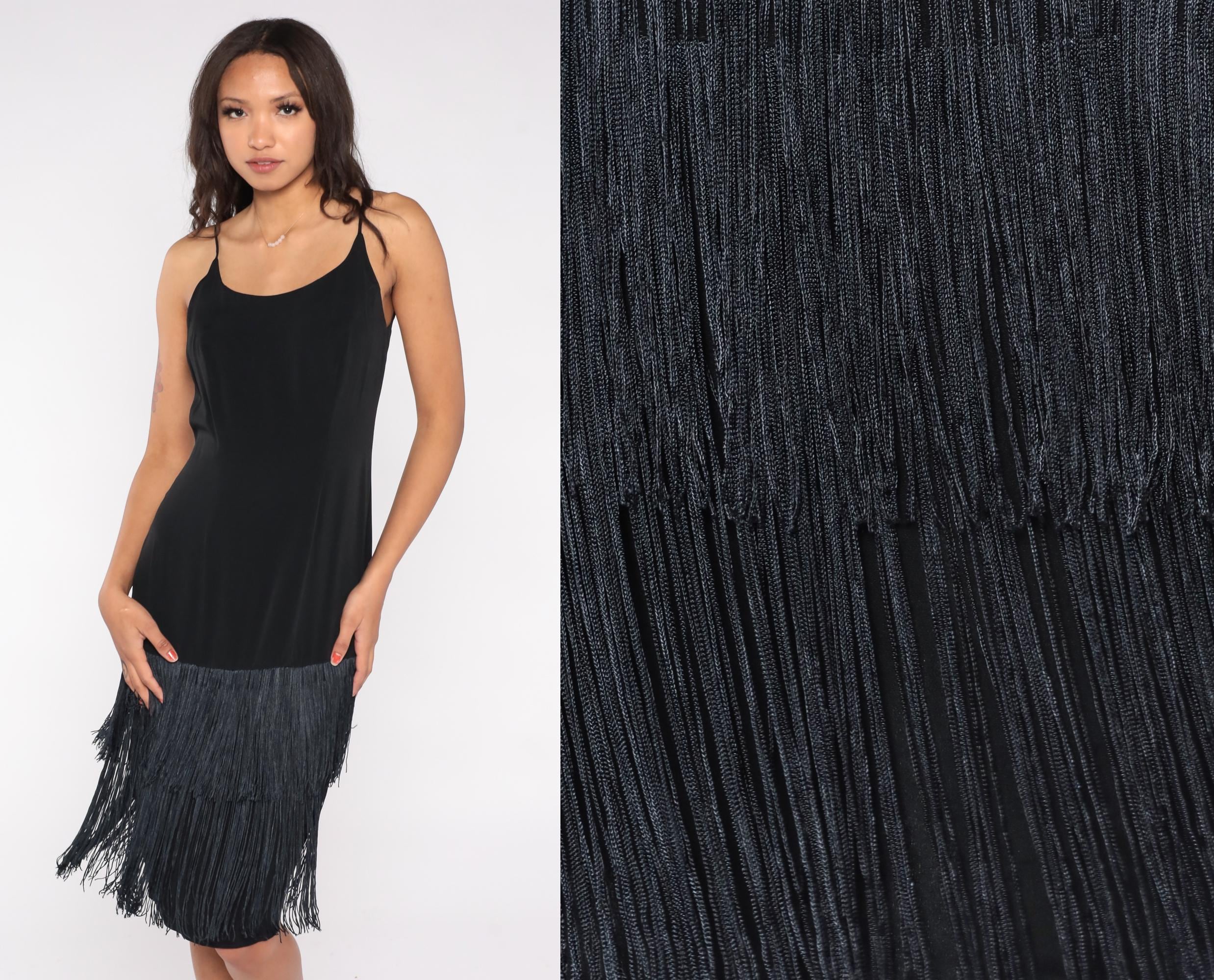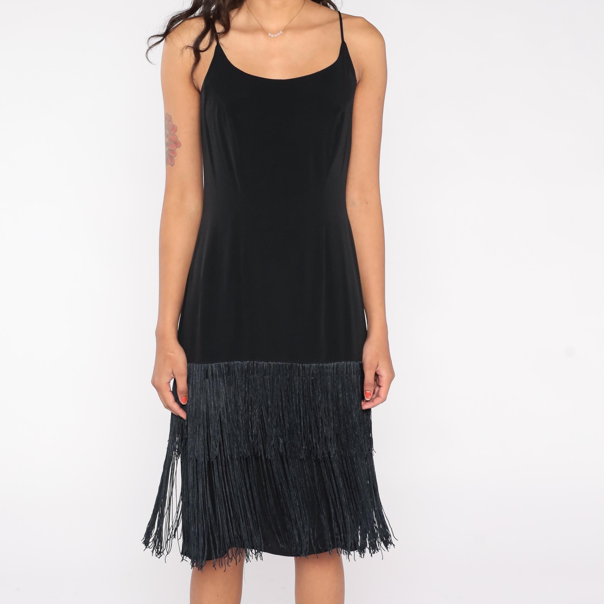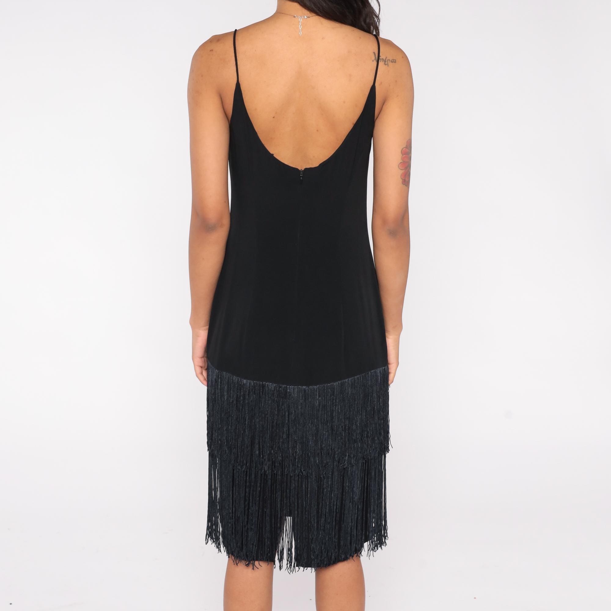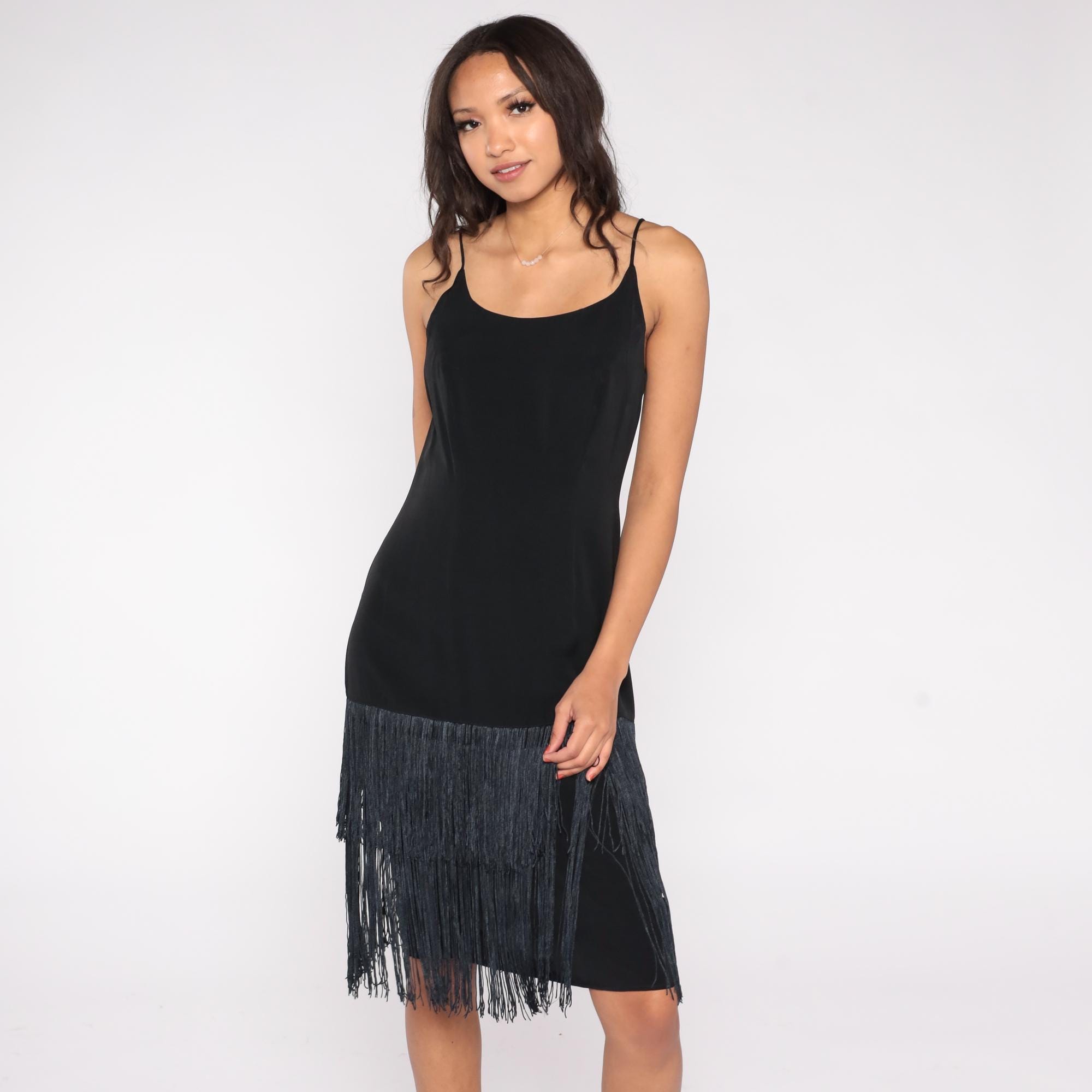 90s BB Collection black fringe dress featuring a sleek slip silhouette with a double-layer fringe hem. Designed with thin spaghetti straps, a scoop neckline, and a low back with hidden zip closure.