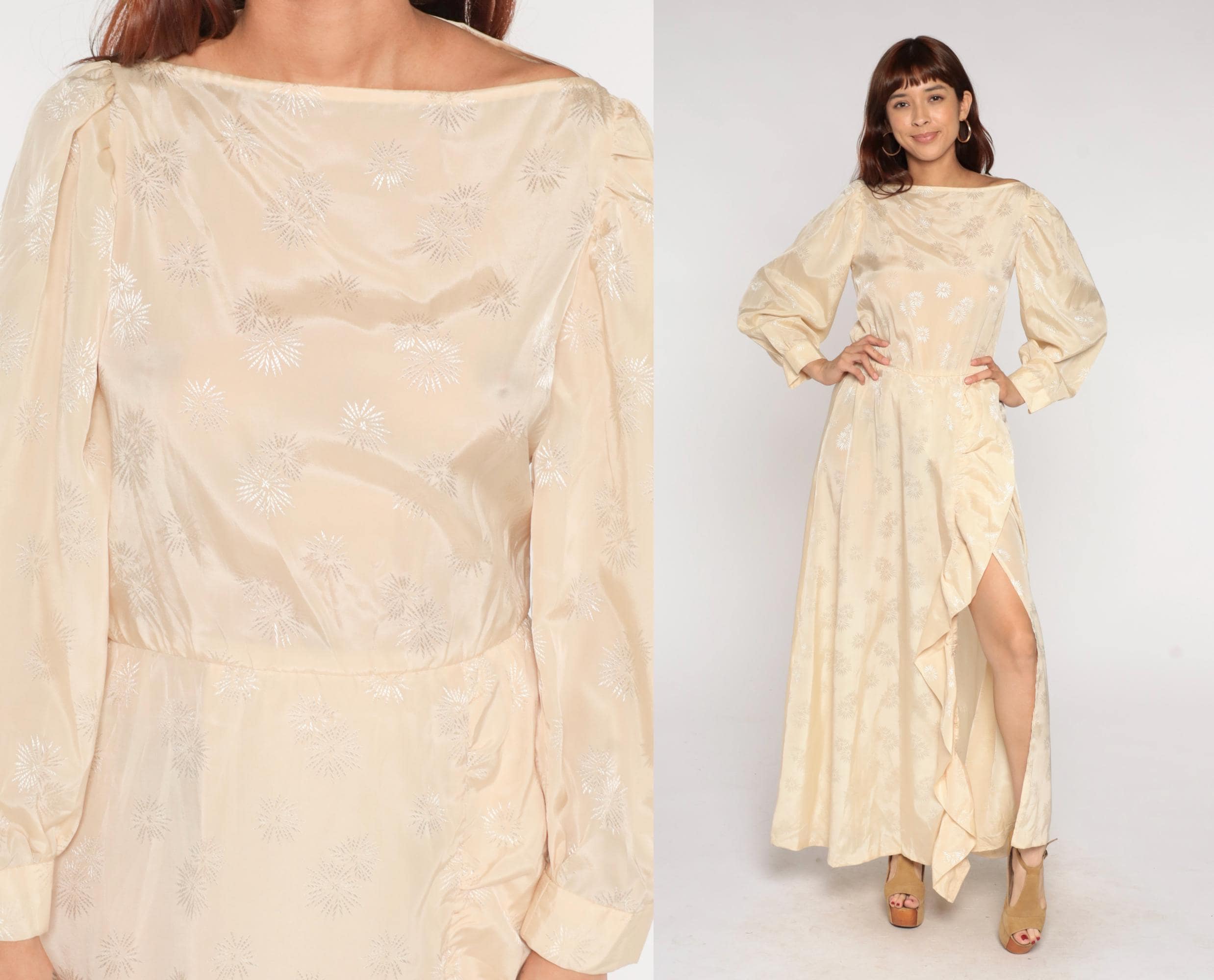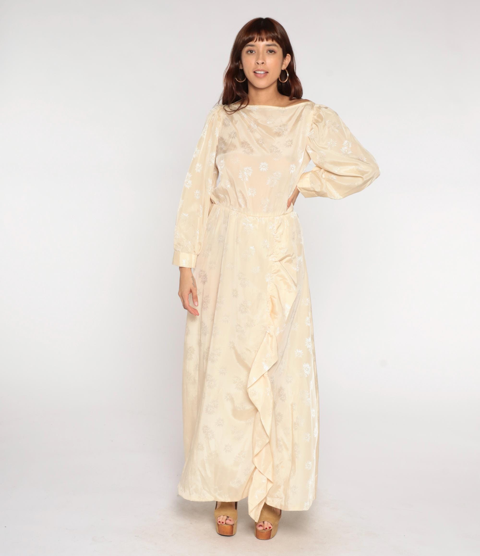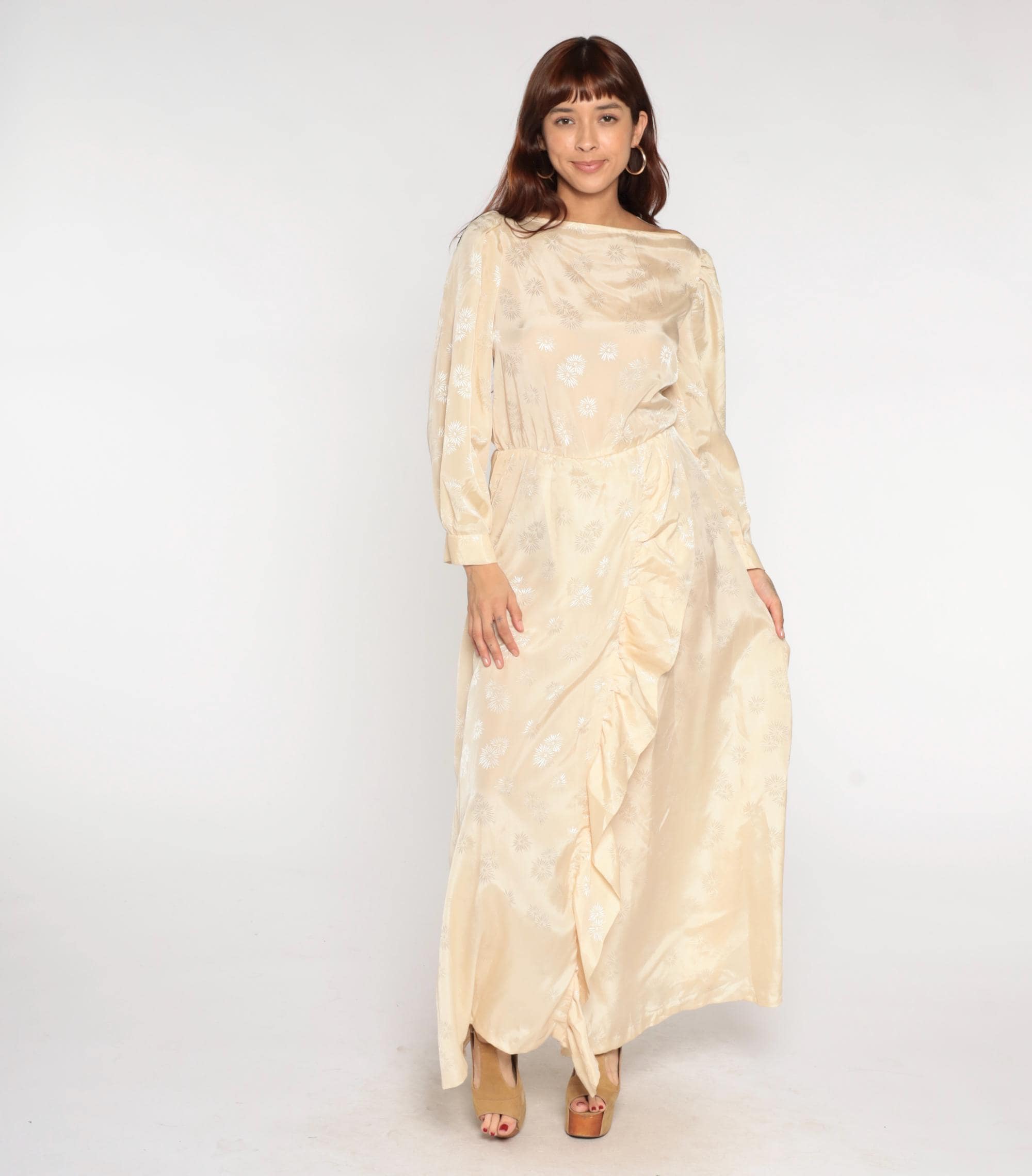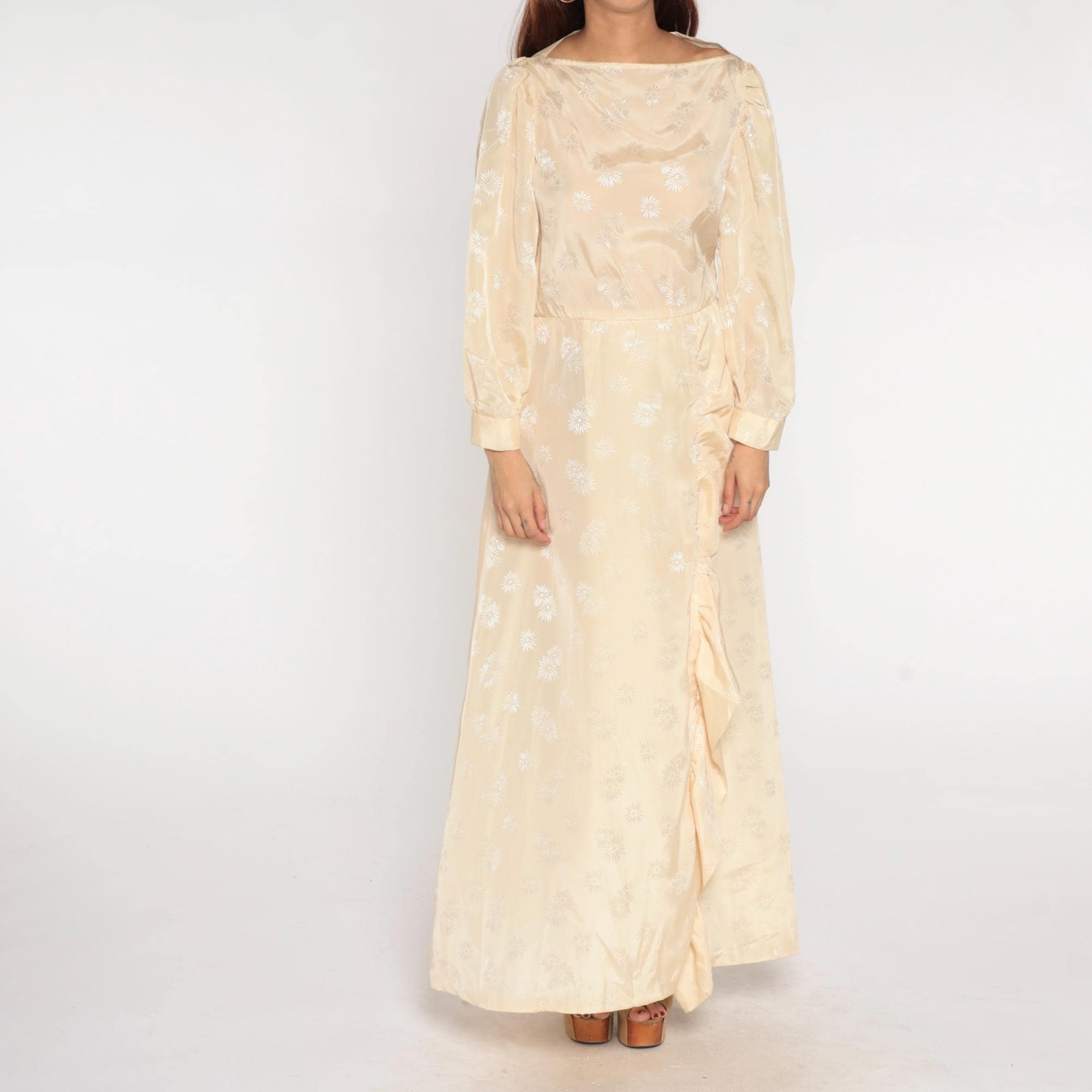 1970s maxi dress features allover sunburst embroidery in cream thread on a cream satin-finish polyester base. The dress has a bateau boat neckline, long bishop sleeves with fitted cuffs, and a defined waist seam. A dramatic ruffle detail runs vertically down the front skirt, creating a cascading slit effect. The skirt falls to maxi length with an A-line silhouette.