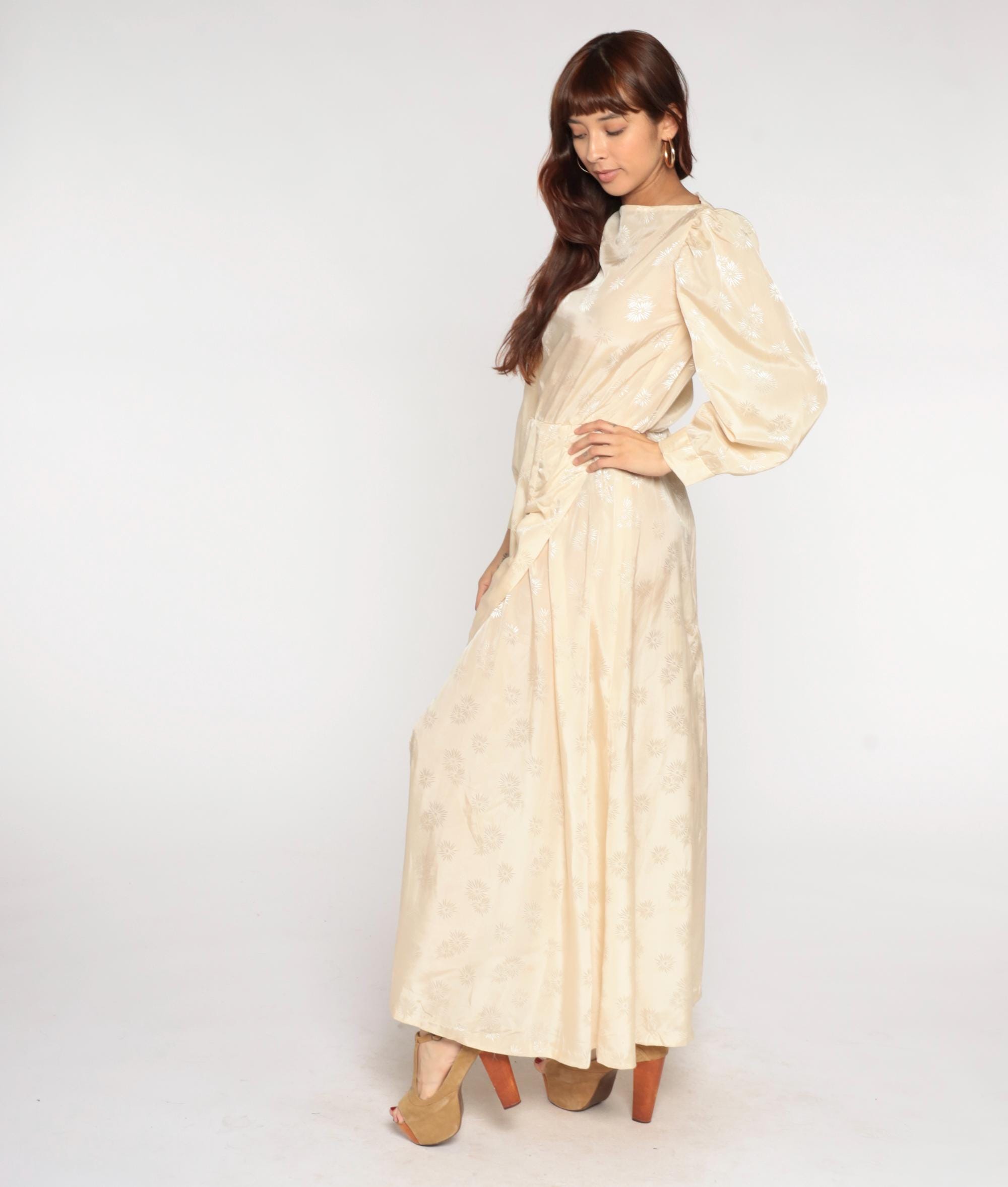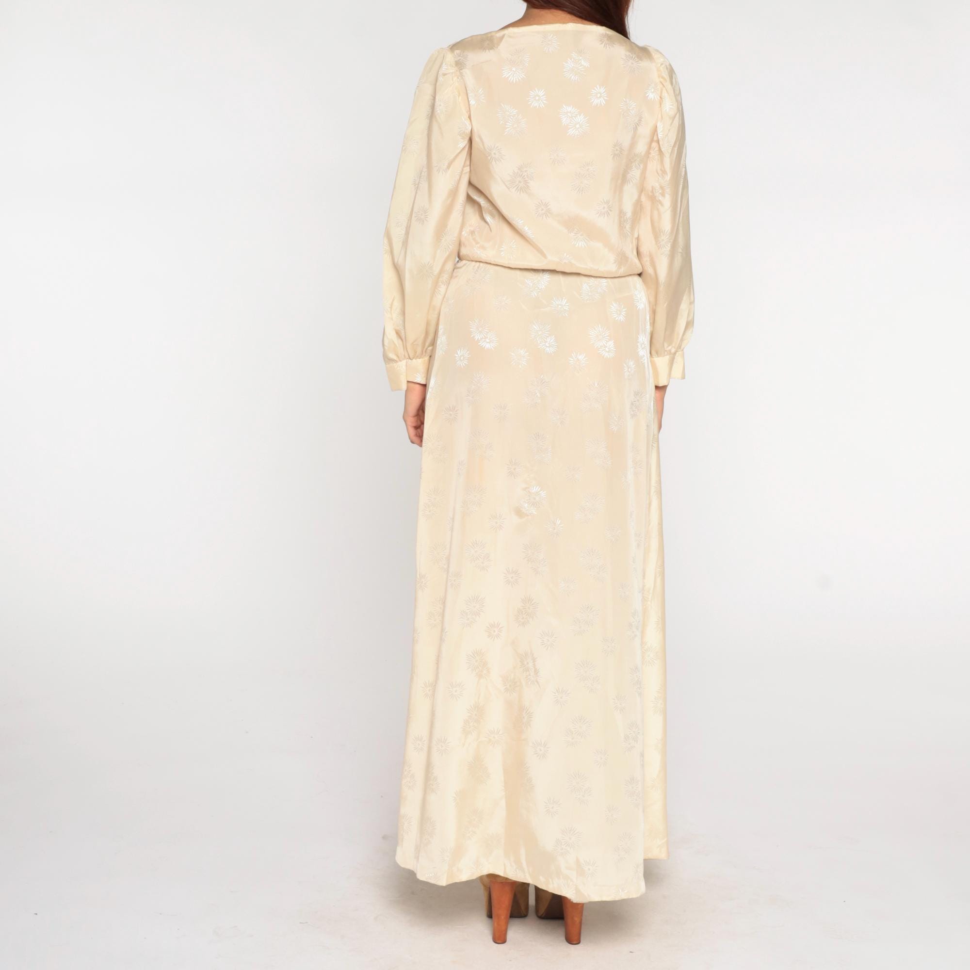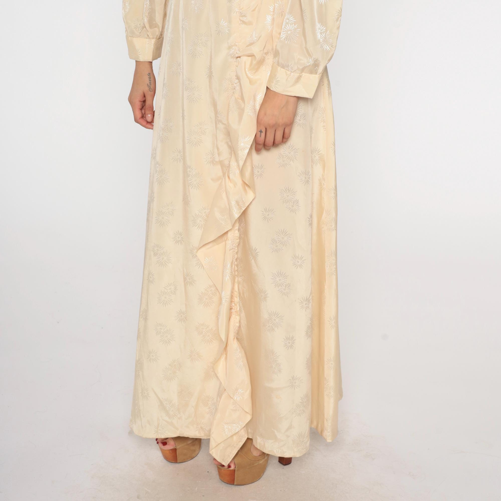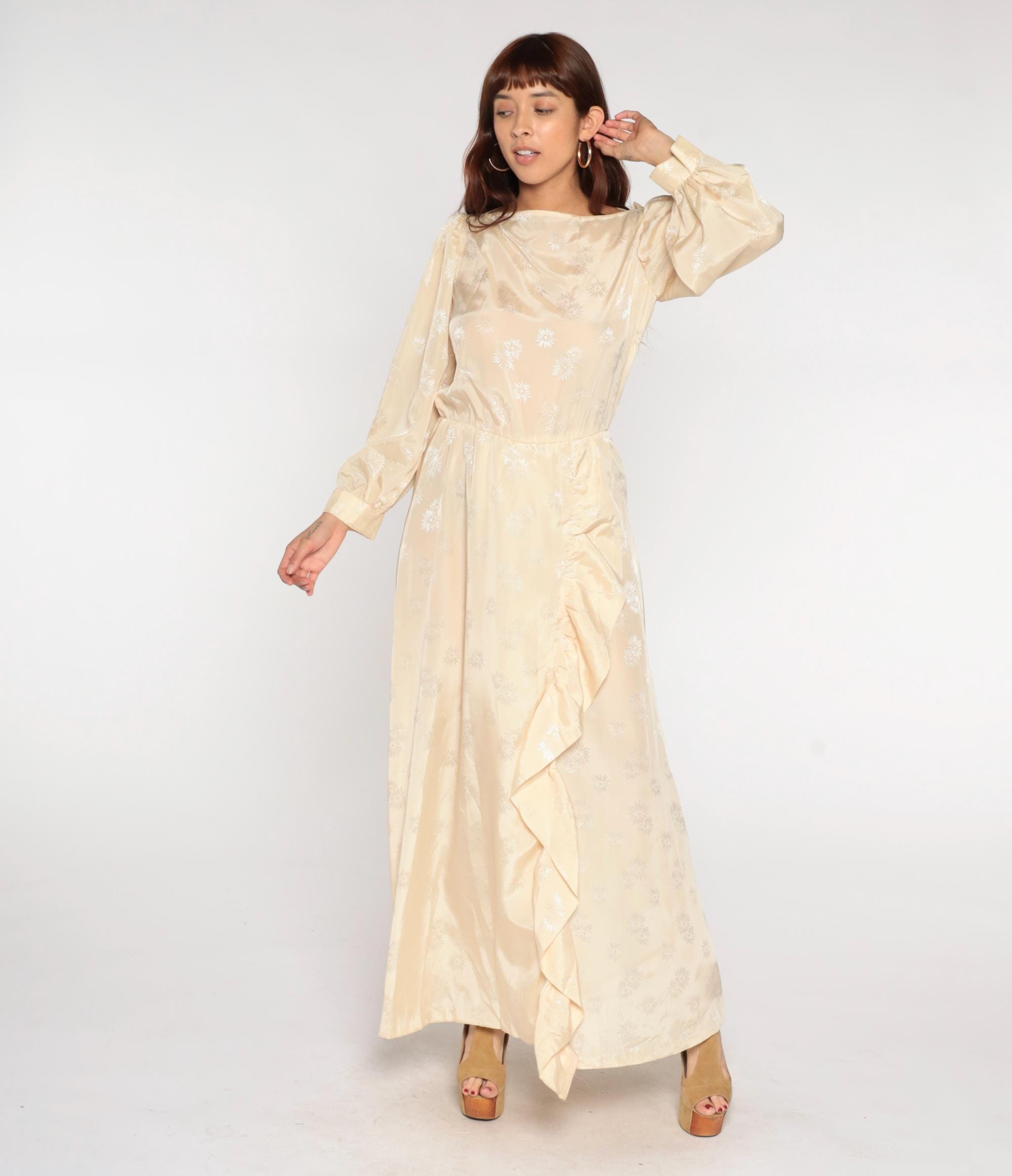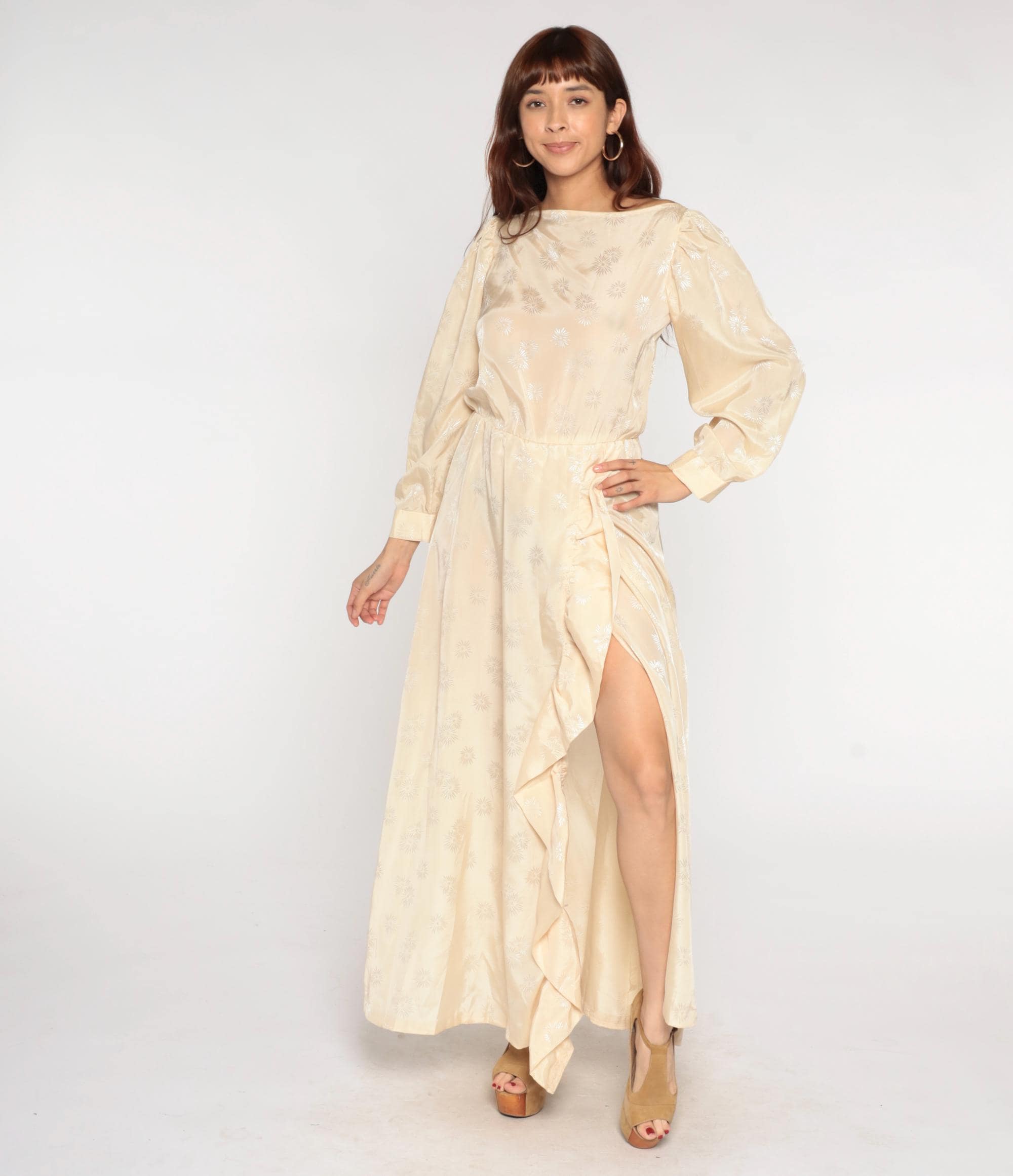 1970s maxi dress features allover sunburst embroidery in cream thread on a cream satin-finish polyester base. The dress has a bateau boat neckline, long bishop sleeves with fitted cuffs, and a defined waist seam. A dramatic ruffle detail runs vertically down the front skirt, creating a cascading slit effect. The skirt falls to maxi length with an A-line silhouette.