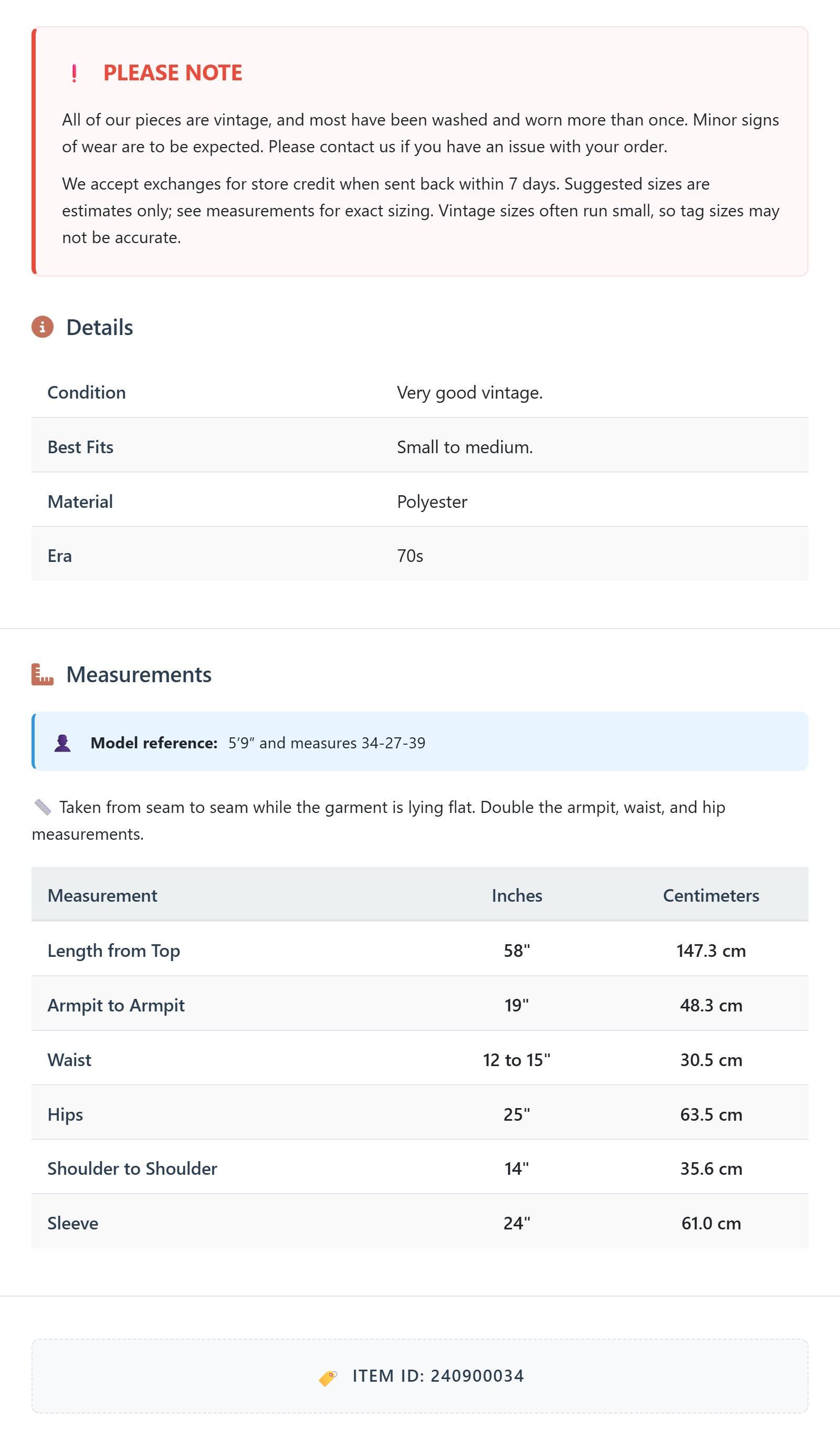 All of our pieces are vintage, and most have been washed and worn more than once. Minor signs of wear are to be expected. Please contact us if you have an issue with your order. We accept exchanges for store credit when sent back within 7 days.