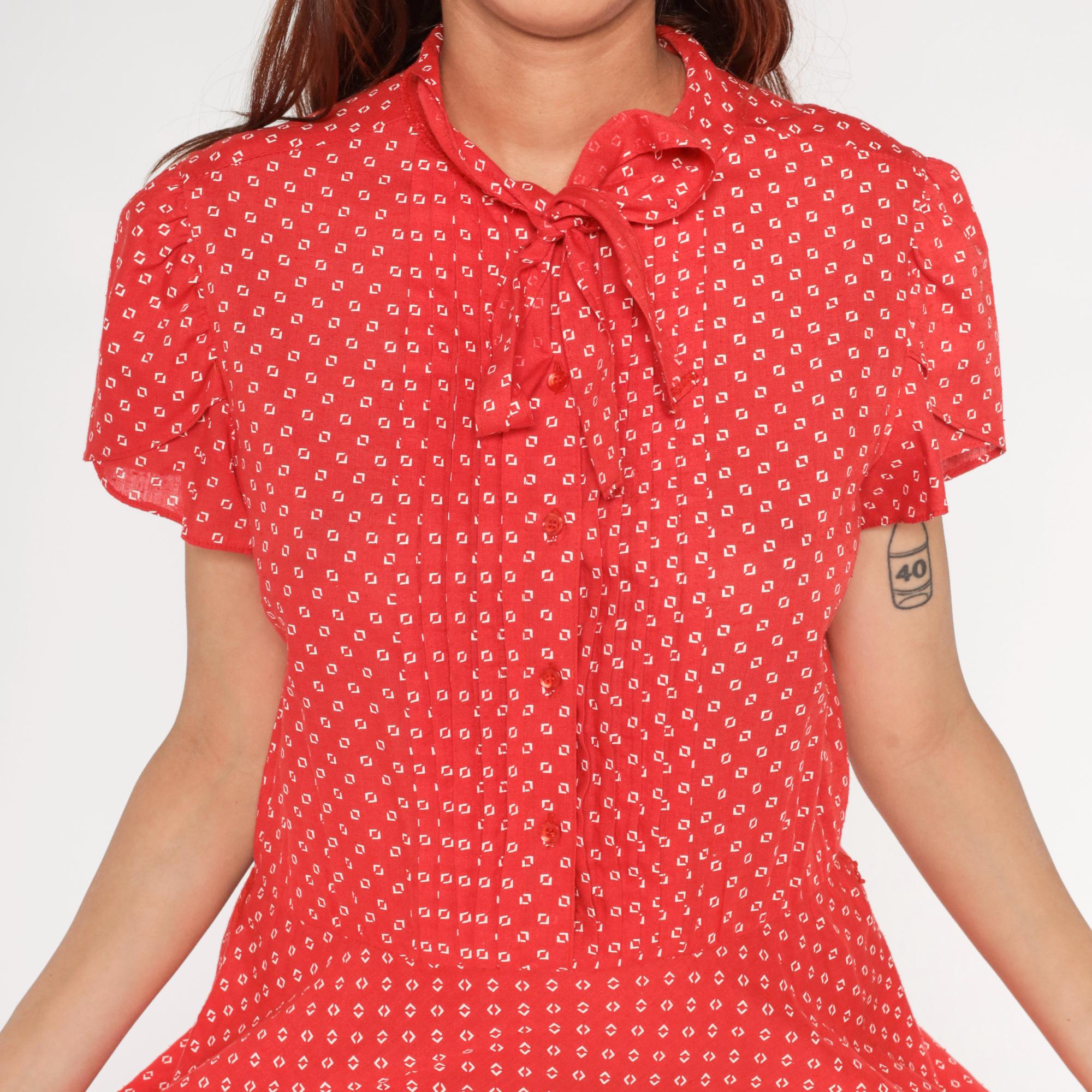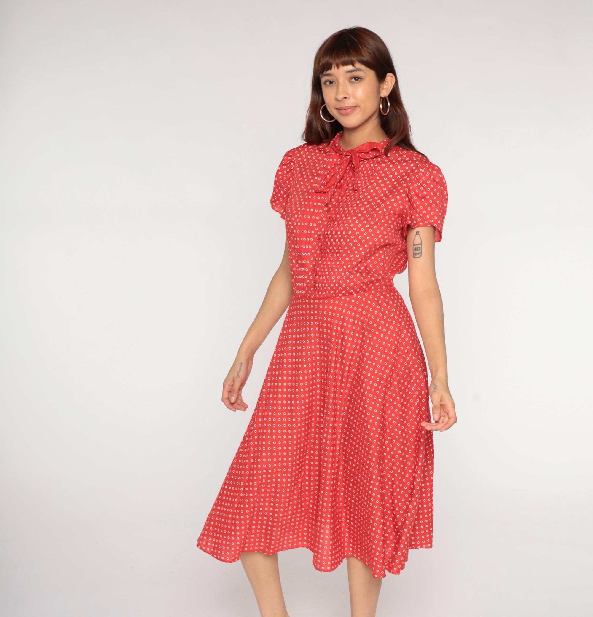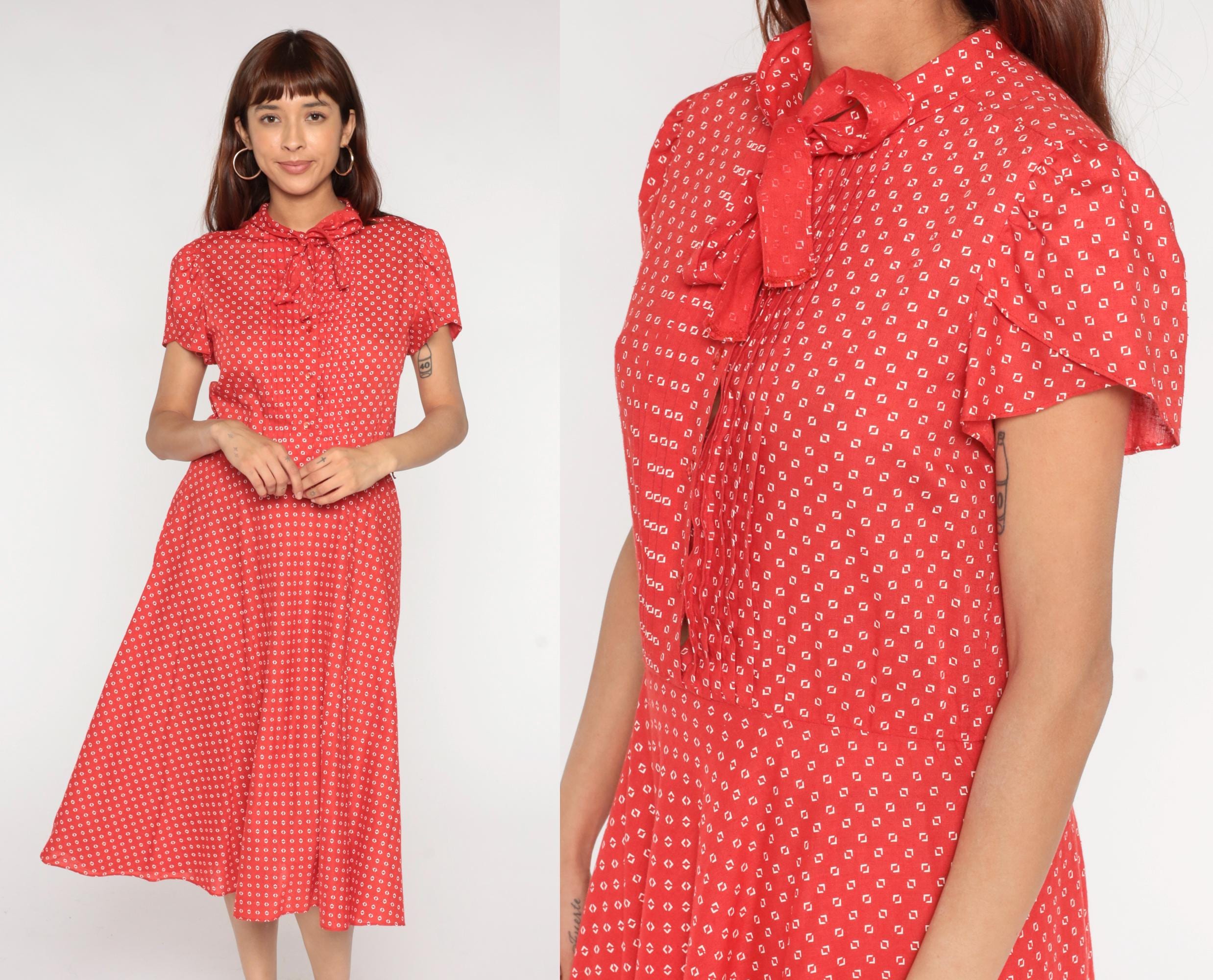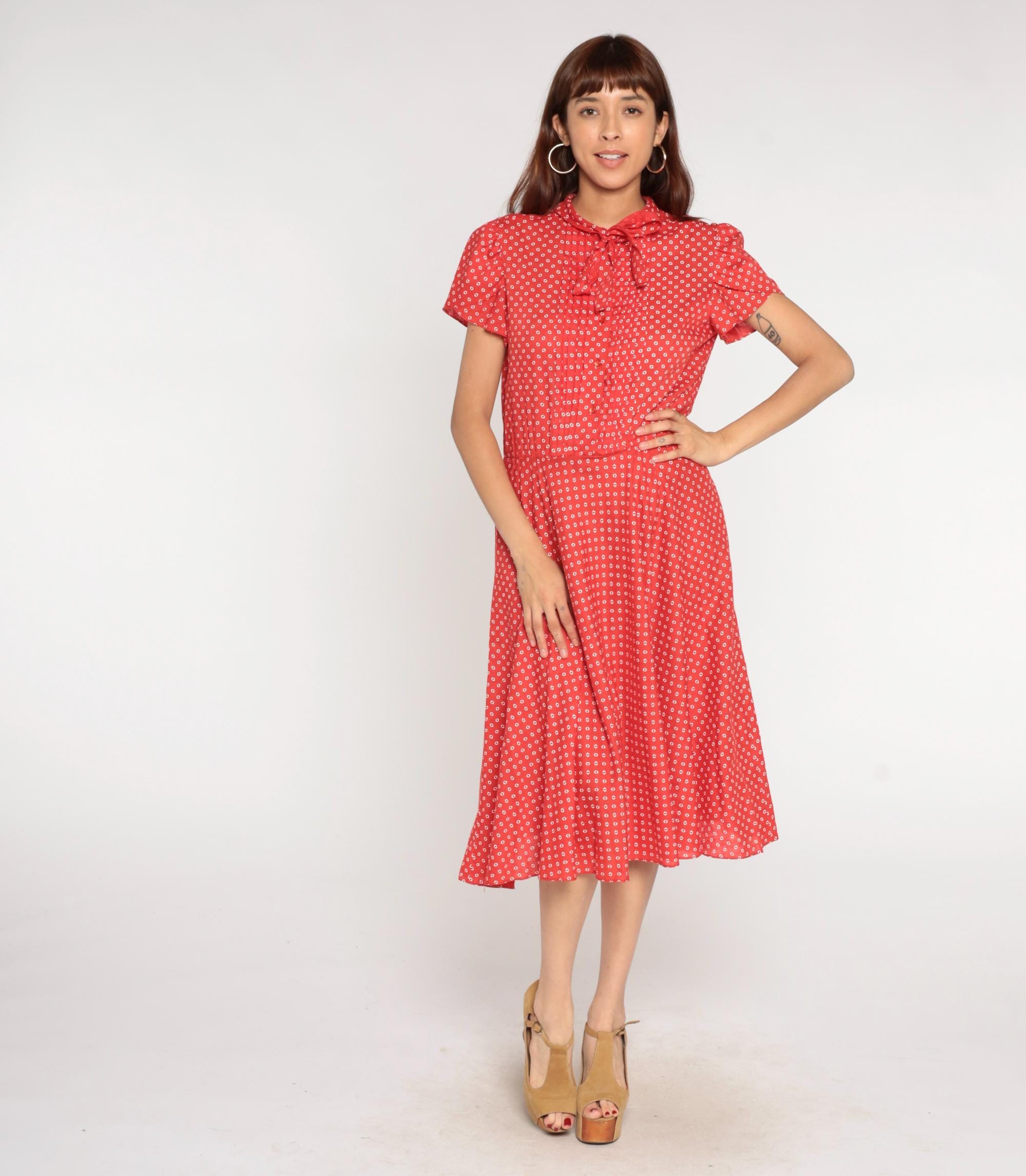 1970s Robbie Bee dress features a vibrant red base with allover white geometric diamond print. The dress has a classic pussy bow tie at the neckline that can be styled in a bow or left loose. Short sleeves with clean hemmed edges. The bodice has a fitted waist that releases into an A-line midi skirt with gentle flare. Back metal zipper closure.