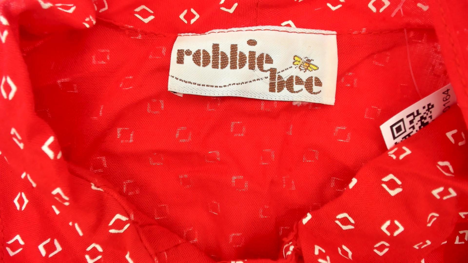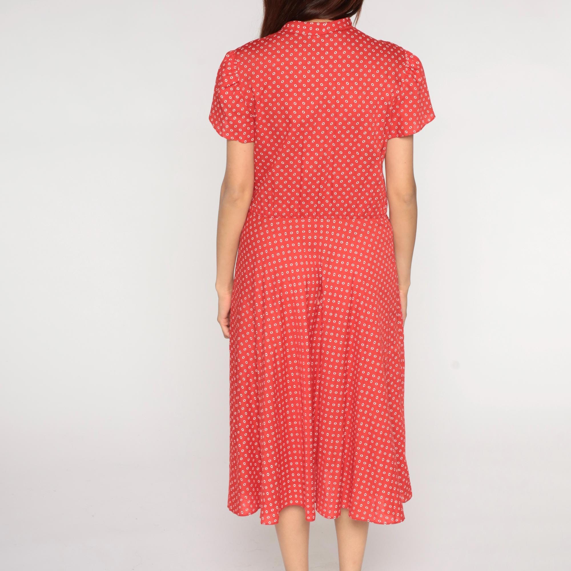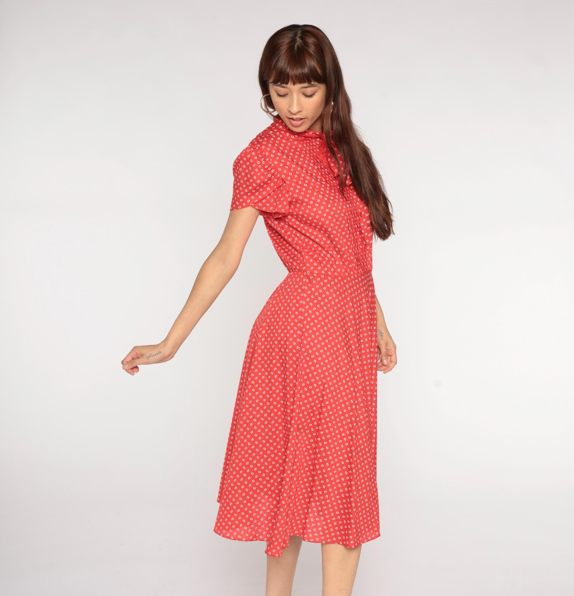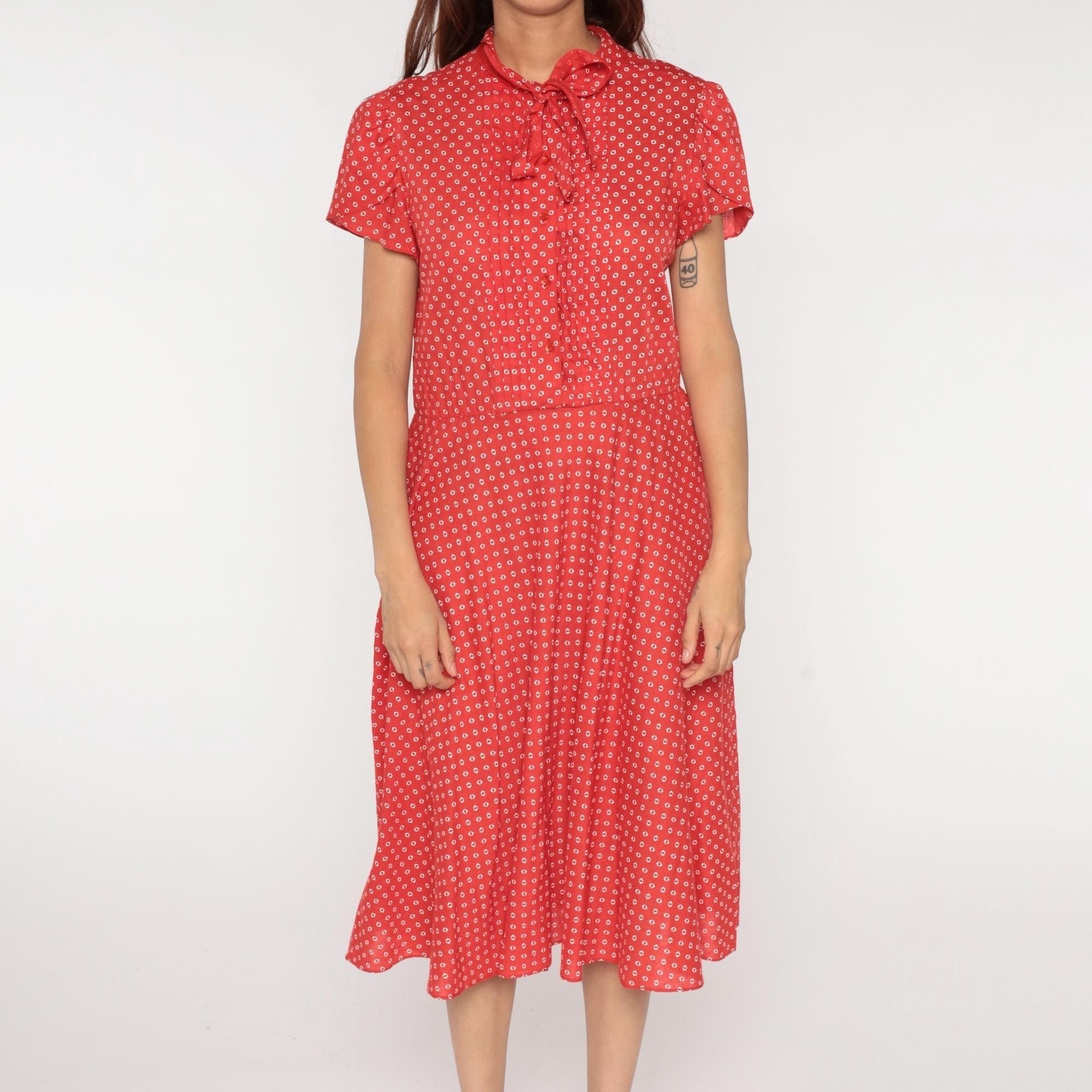 1970s Robbie Bee dress features a vibrant red base with allover white geometric diamond print. The dress has a classic pussy bow tie at the neckline that can be styled in a bow or left loose. Short sleeves with clean hemmed edges. The bodice has a fitted waist that releases into an A-line midi skirt with gentle flare. Back metal zipper closure.