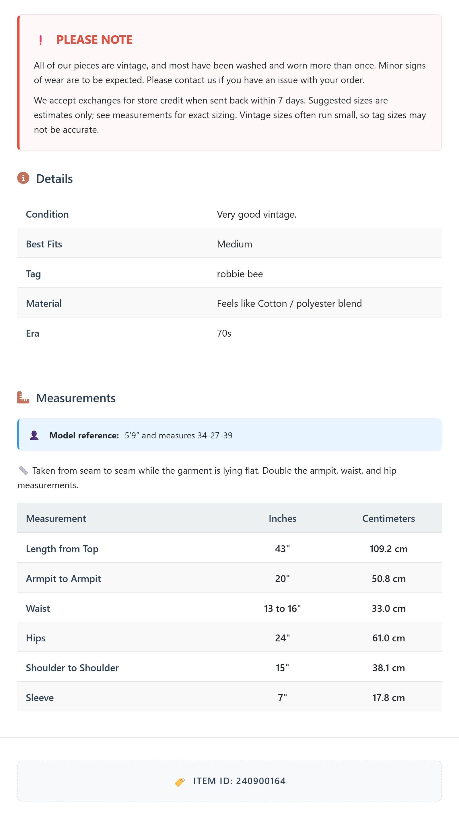 Measurements are taken laying flat and should be doubled where applicable. The "best fits" size is just an estimate, and vintage sizing can vary from modern sizing. Please use measurements to ensure proper fit. The best thing to do is measure a similar item of your own, and compare. When an item has stretch, we will list the unstretched dimensions with the stretched measurement afterwards.