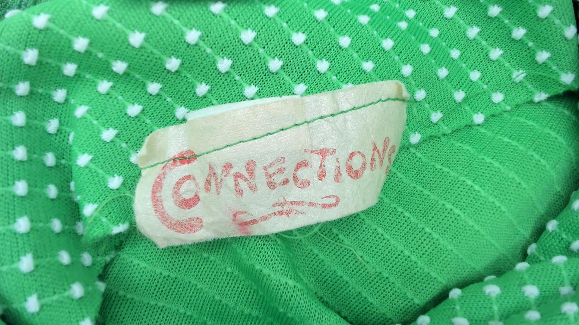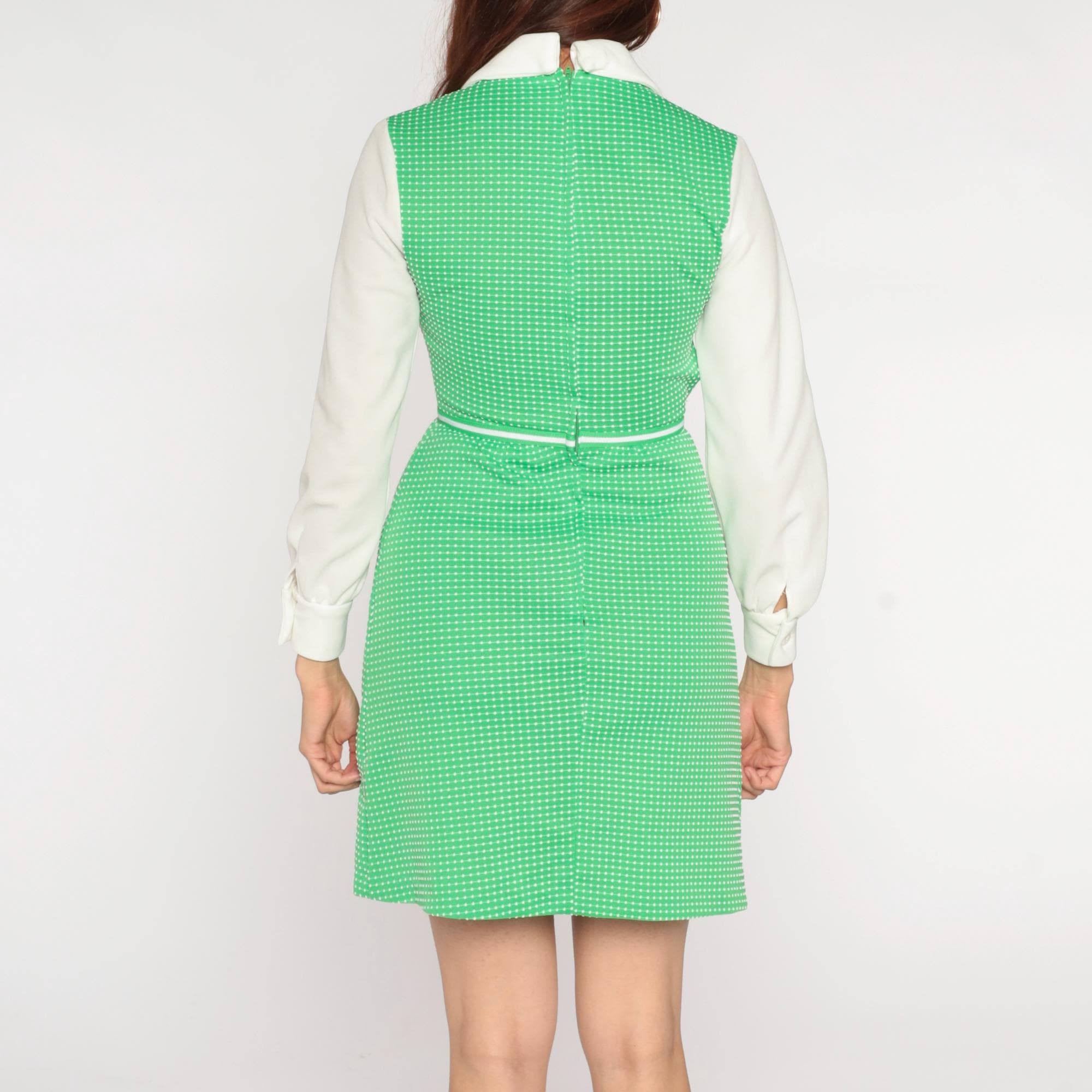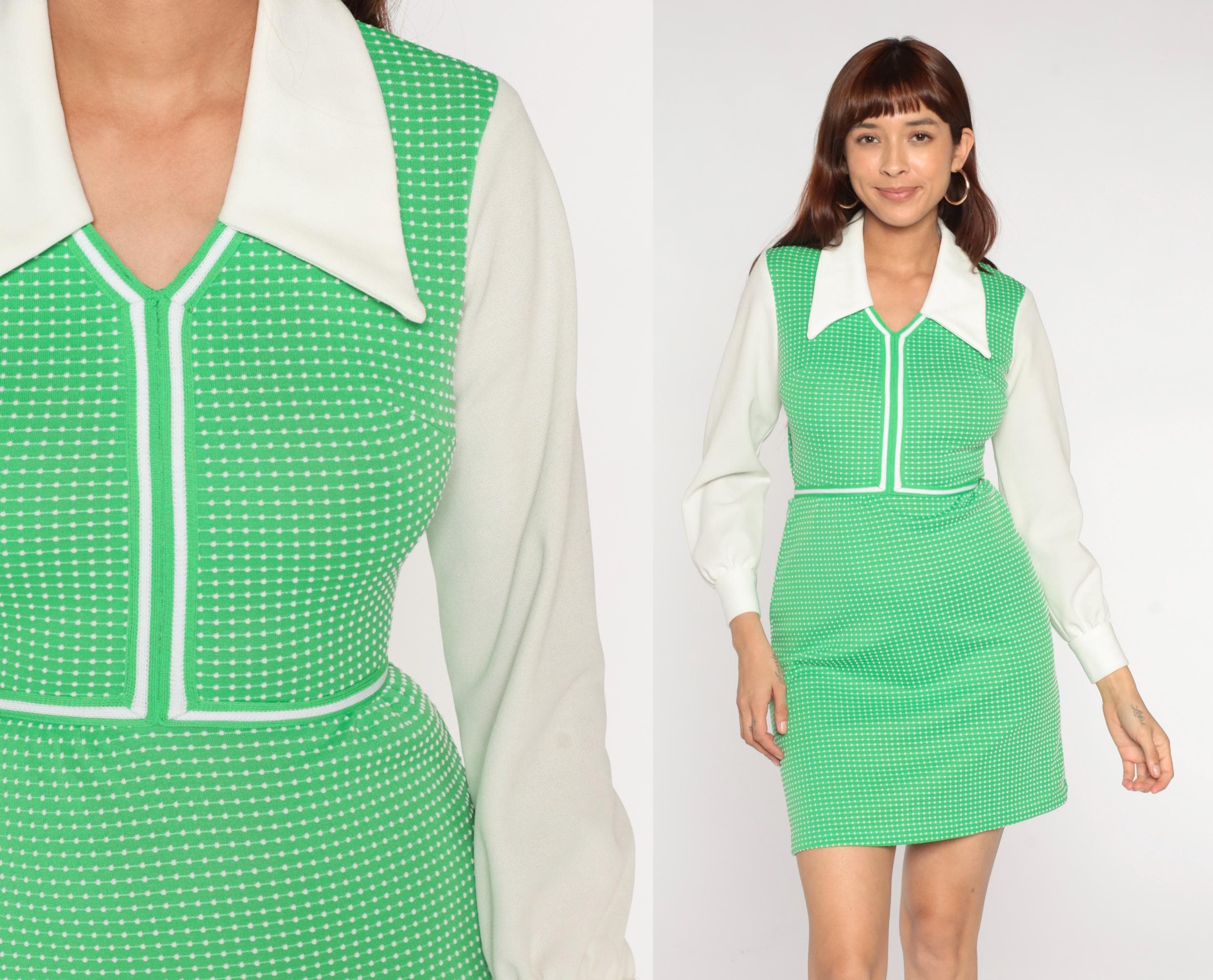 1970s Connections mini dress features bright kelly green polyester with allover white polka dot print. The dress has a dramatic oversized pointed collar in white that creates a striking contrast against the green bodice. Long sleeves with white button cuffs. White piping trim outlines the collar, front bodice panels, and waist seam. Back metal zipper closure.
